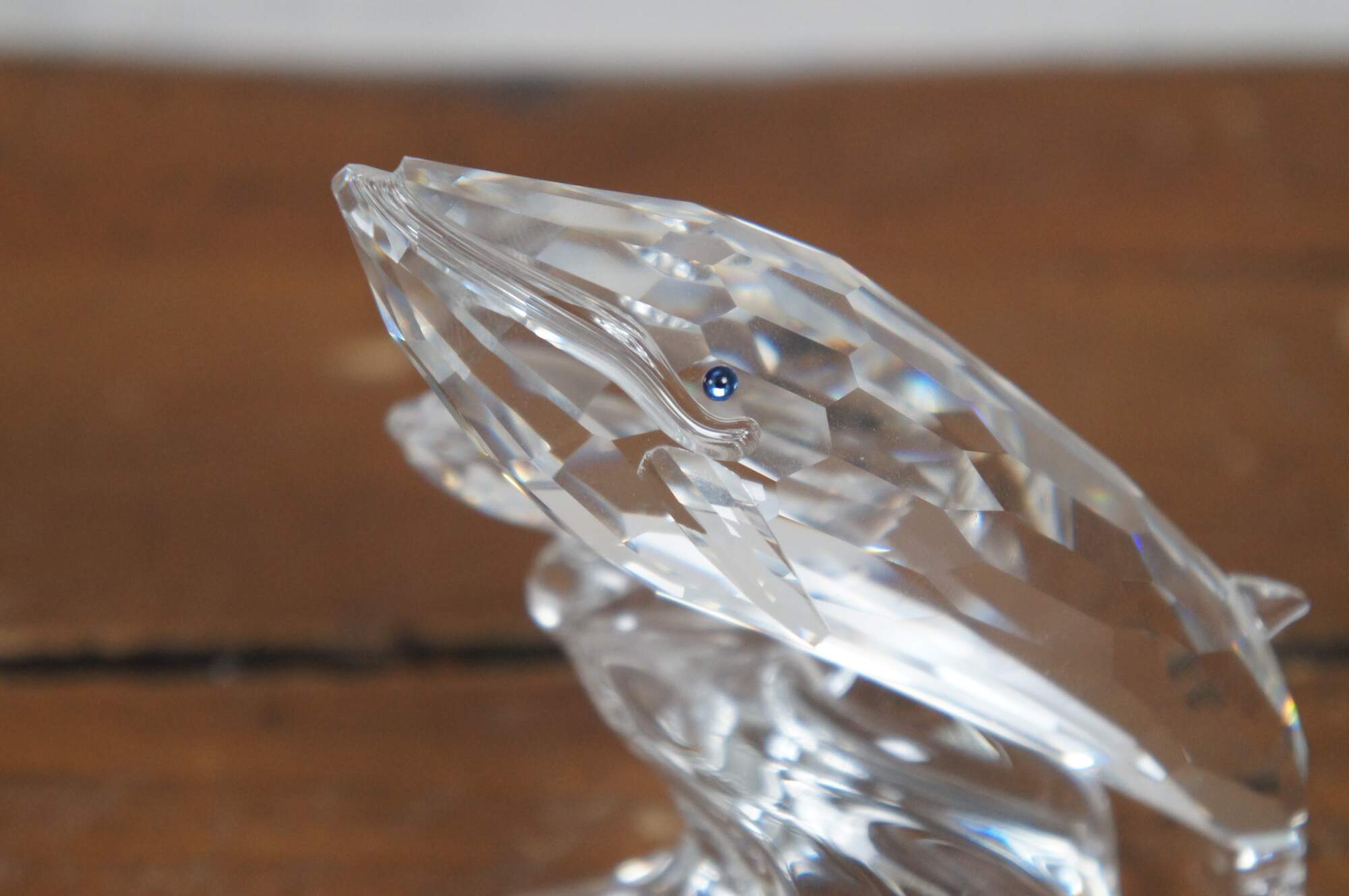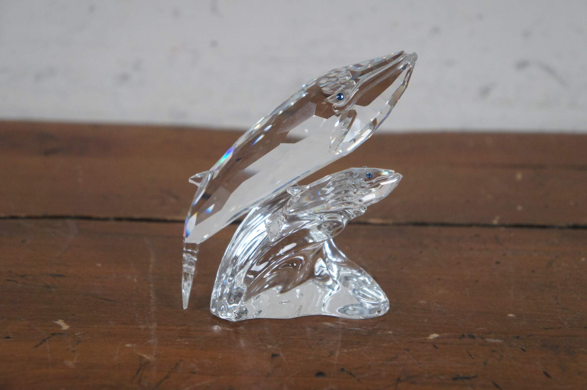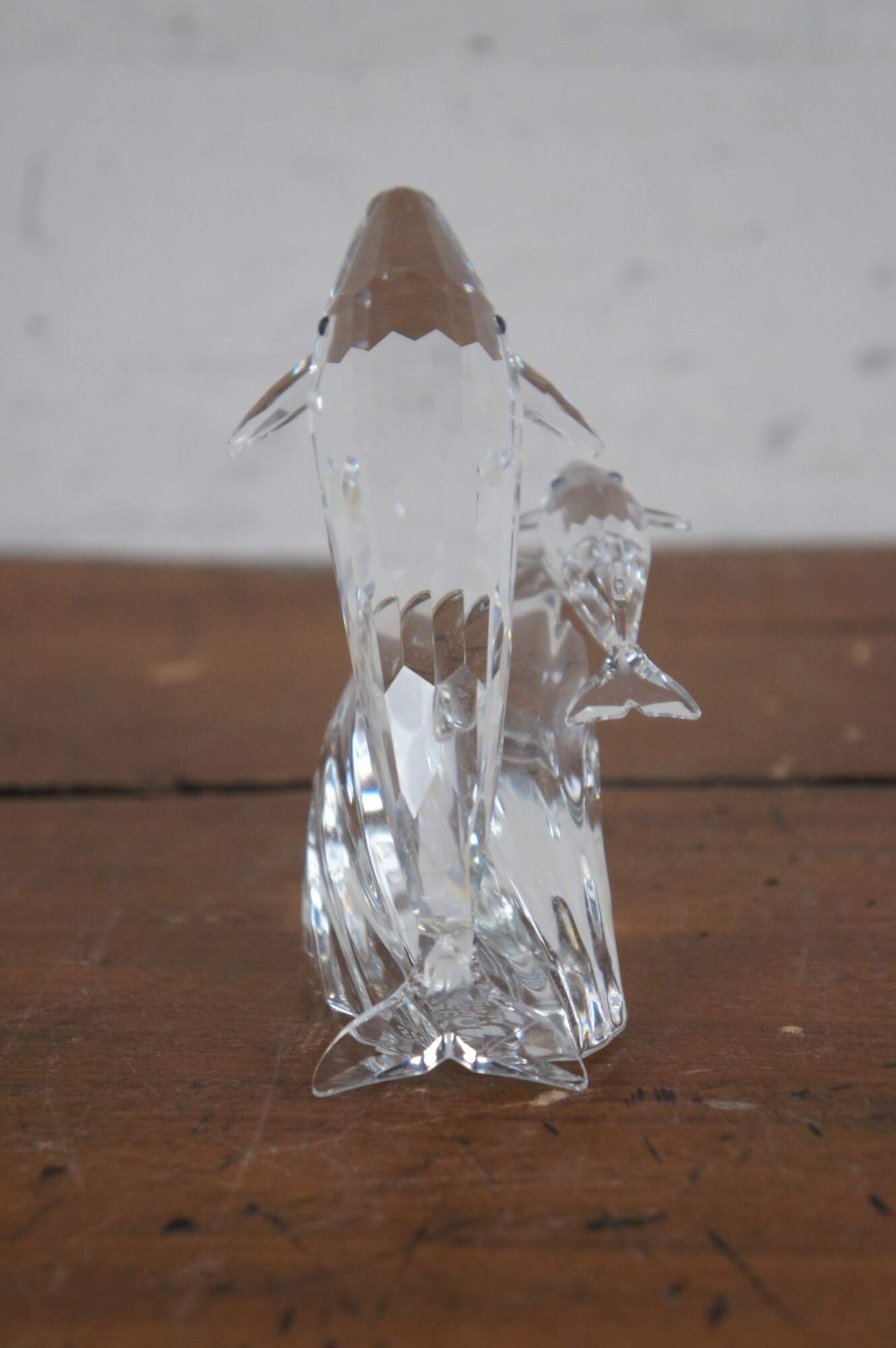 Swarovski Collectors Society 1992 Annual Edition, Care for Me - The Whales. Clear crystal figurine depicting an adult / mother and baby blue whale with blue eyes, perched on a wave. Includes original packaging. Made in Austria.