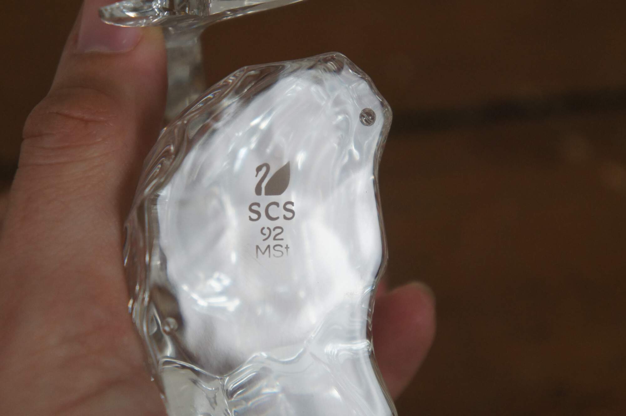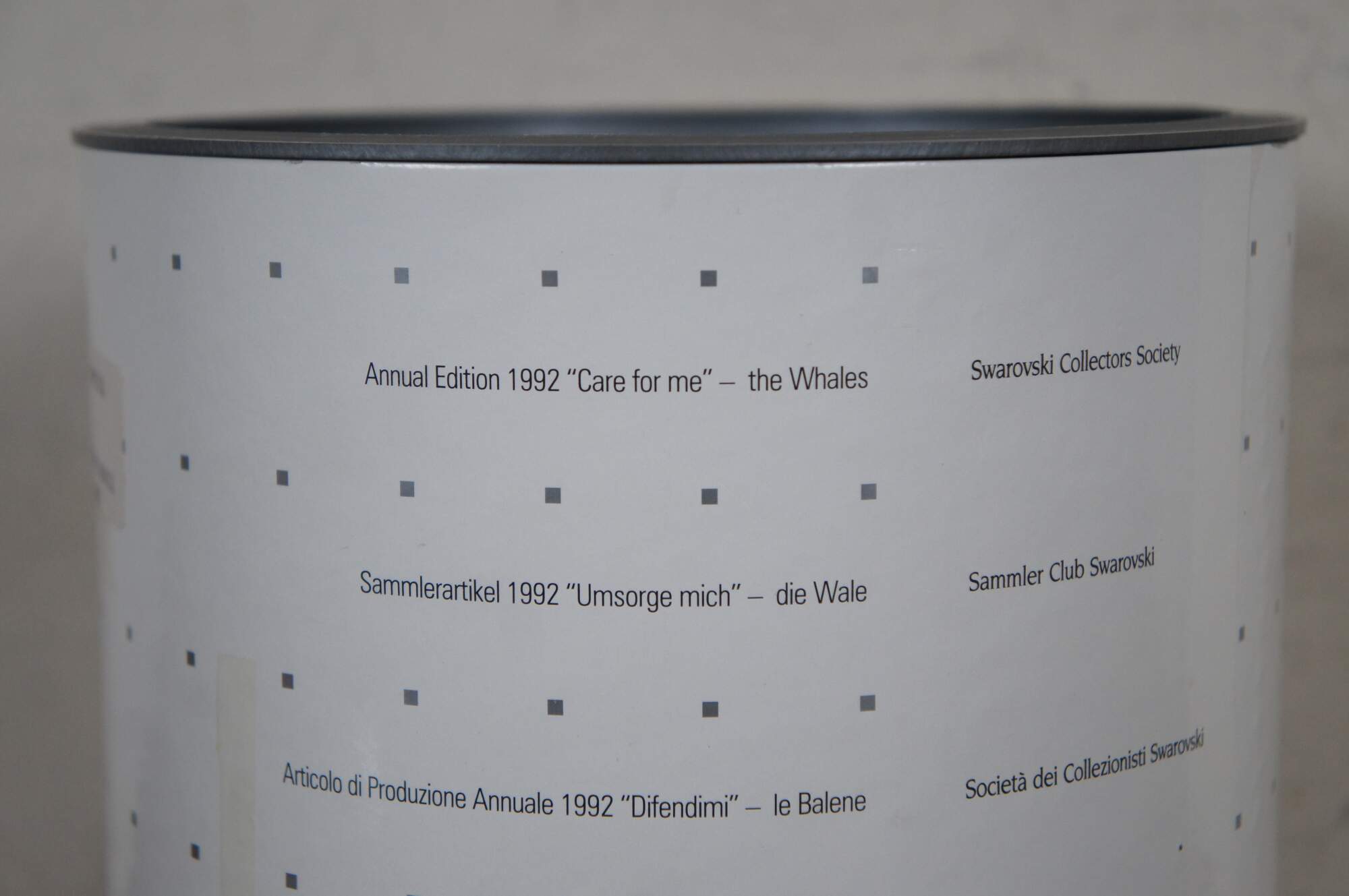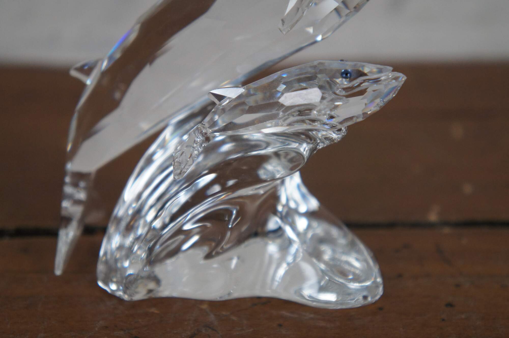 Swarovski Collectors Society 1992 Annual Edition, Care for Me - The Whales. Clear crystal figurine depicting an adult / mother and baby blue whale with blue eyes, perched on a wave. Includes original packaging. Made in Austria.