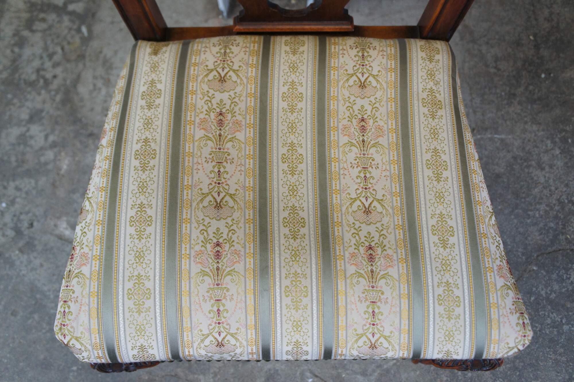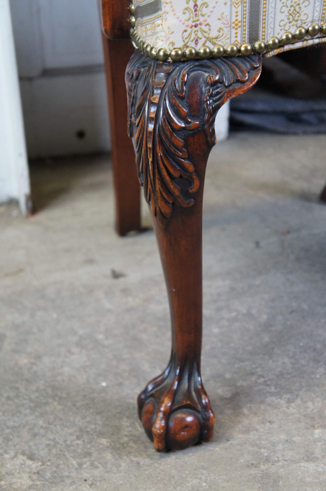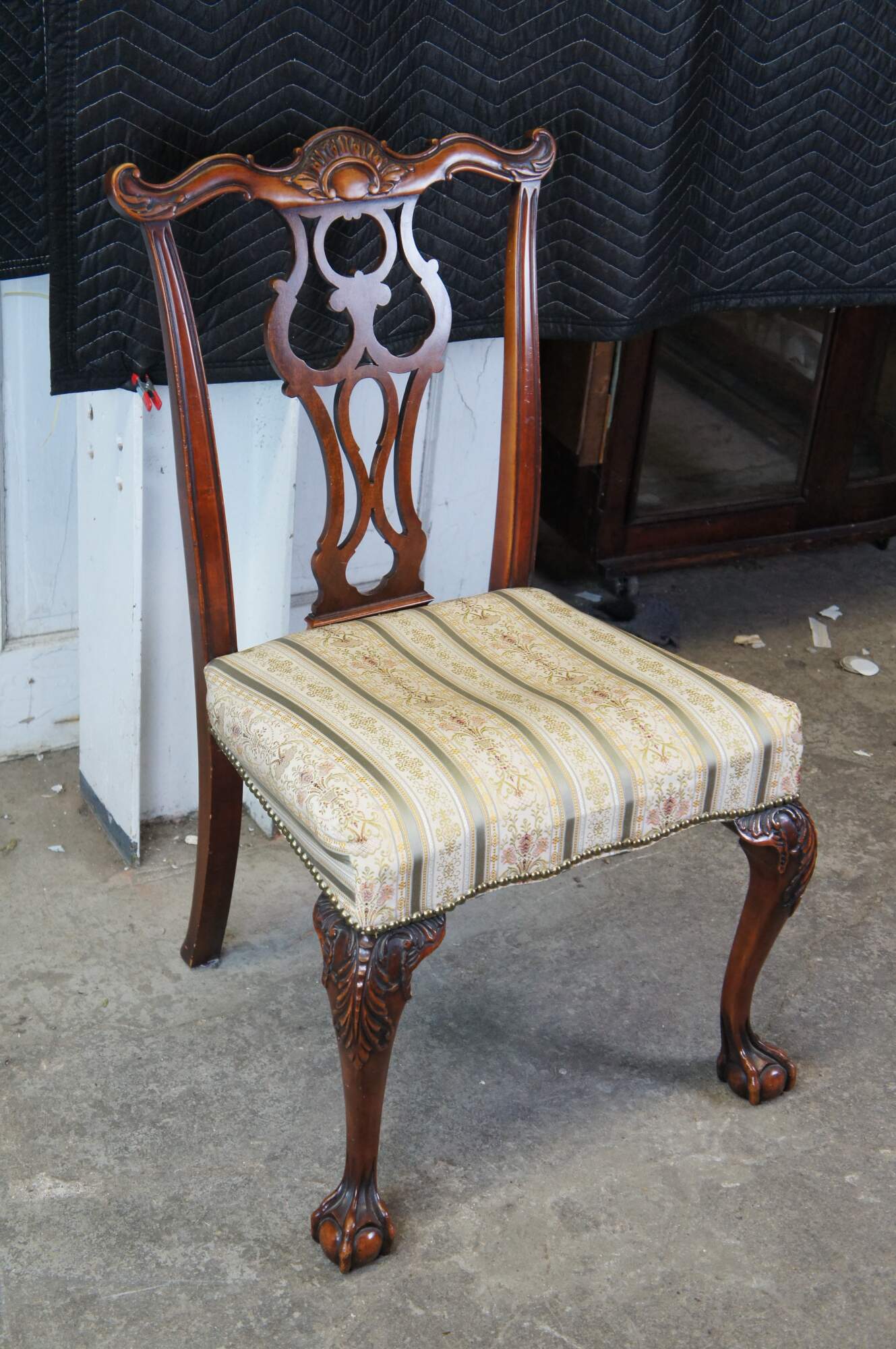 6 early 20th Century English Chippendale / Georgian style dining chairs by Romweber Industries. Circa 1920s. Made from mahaogany with serpentine scalloped crest rail, pierced back splat, floral upholstered seat with nailhead trim and cabriole legs with acanthus carved knees leading to ball and claw feet.
