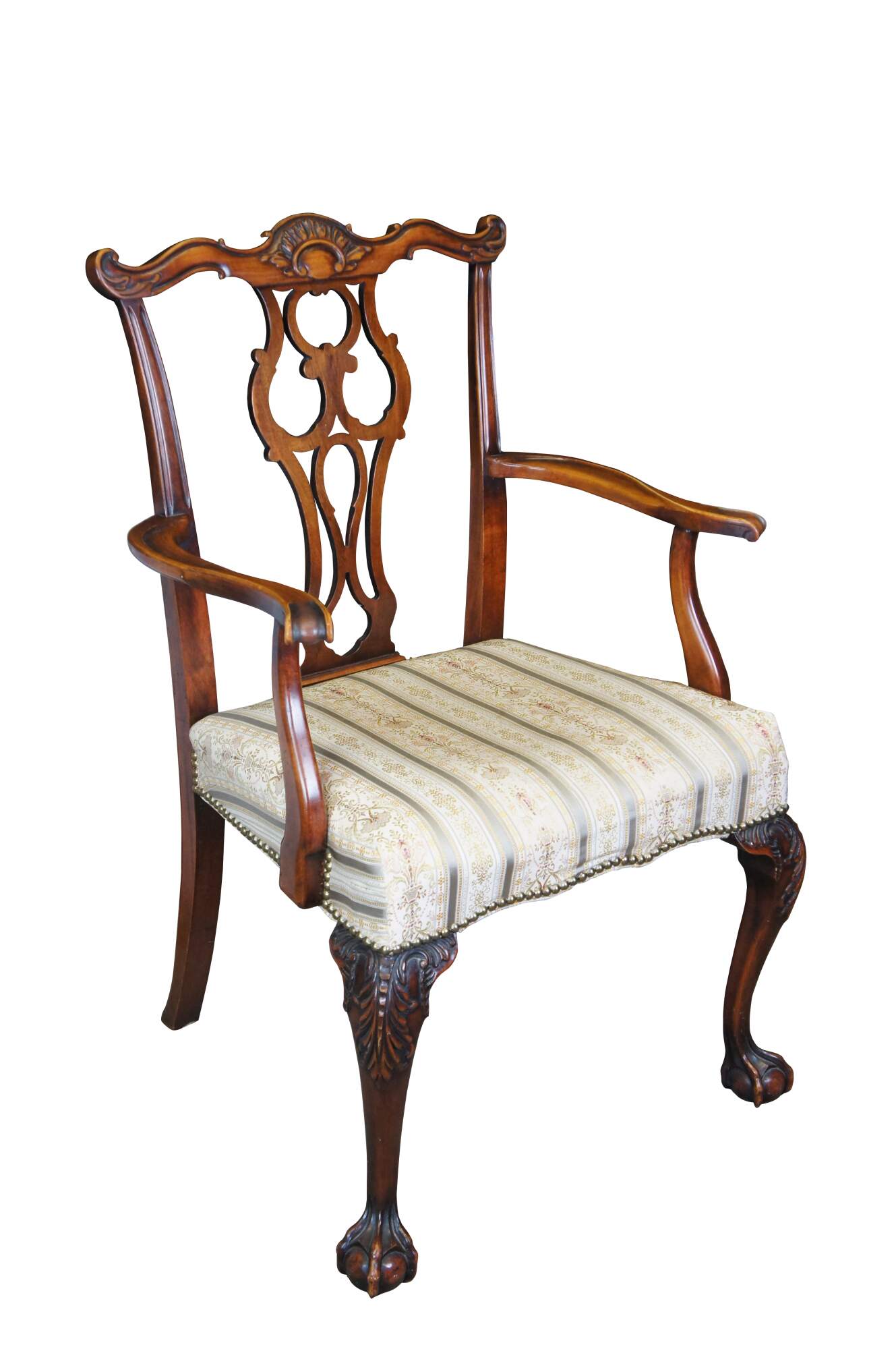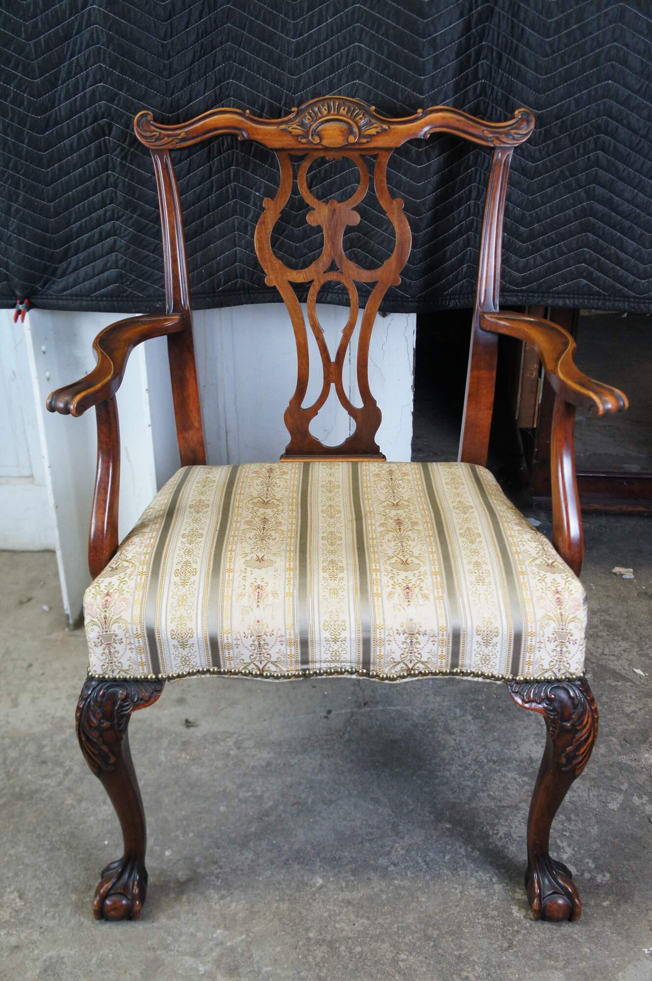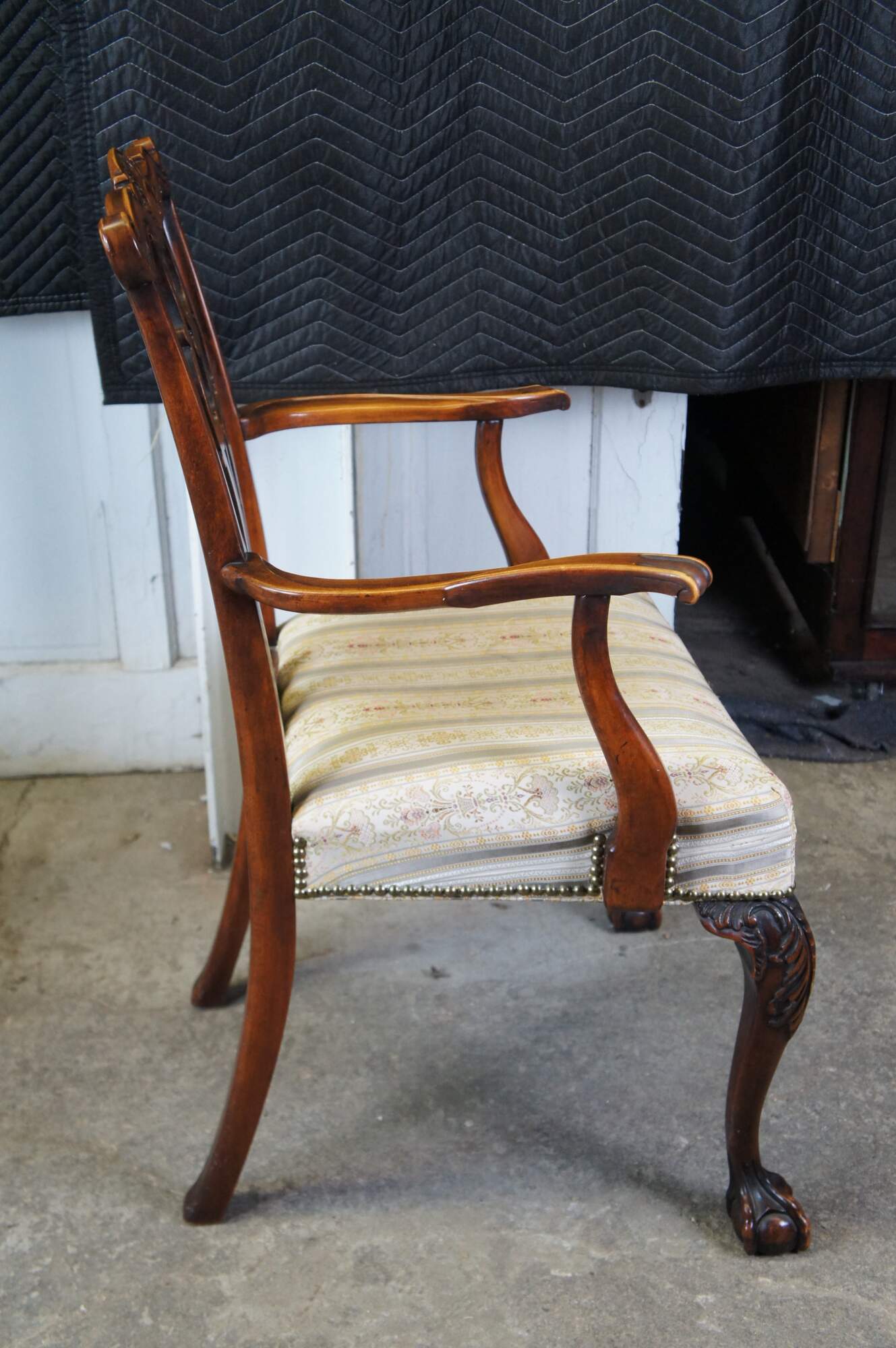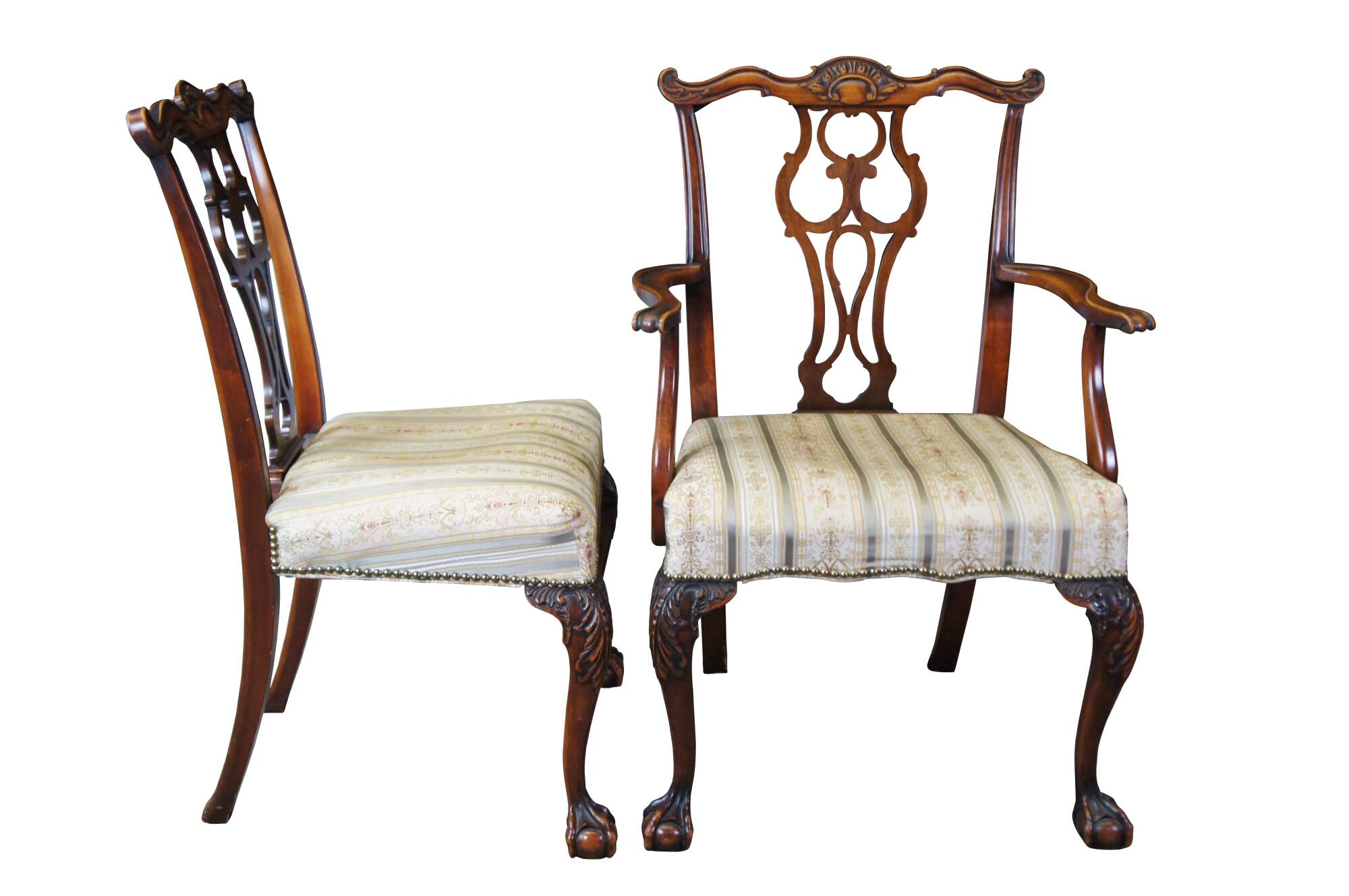 6 early 20th Century English Chippendale / Georgian style dining chairs by Romweber Industries. Circa 1920s. Made from mahaogany with serpentine scalloped crest rail, pierced back splat, floral upholstered seat with nailhead trim and cabriole legs with acanthus carved knees leading to ball and claw feet.