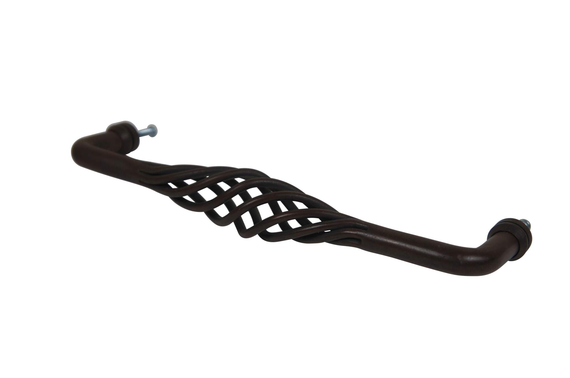 14 Available - Hole Centers 10" - Large twisted metal, birdcage style cabinet / appliance pull, finished in deep brown / dark bronze.