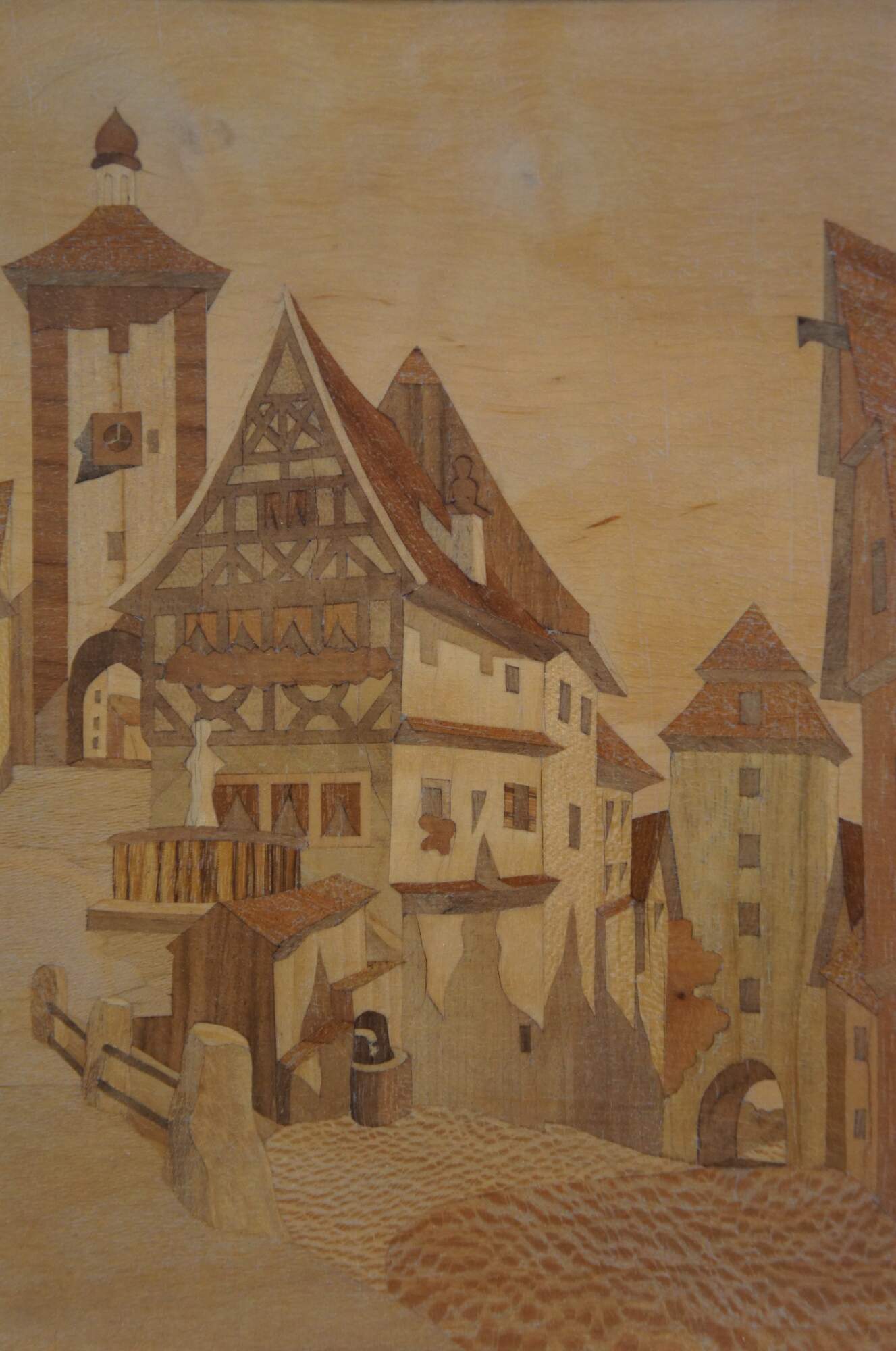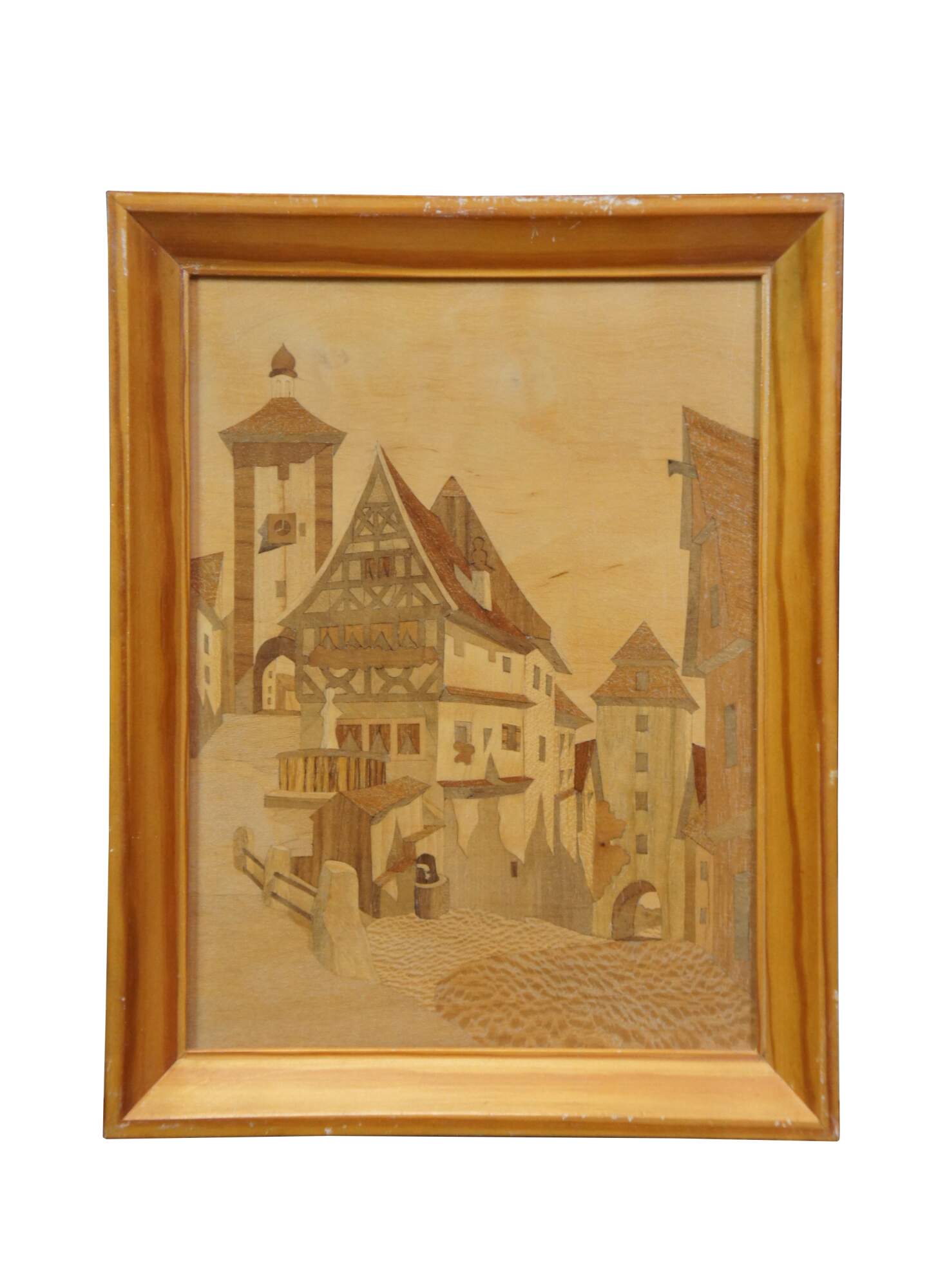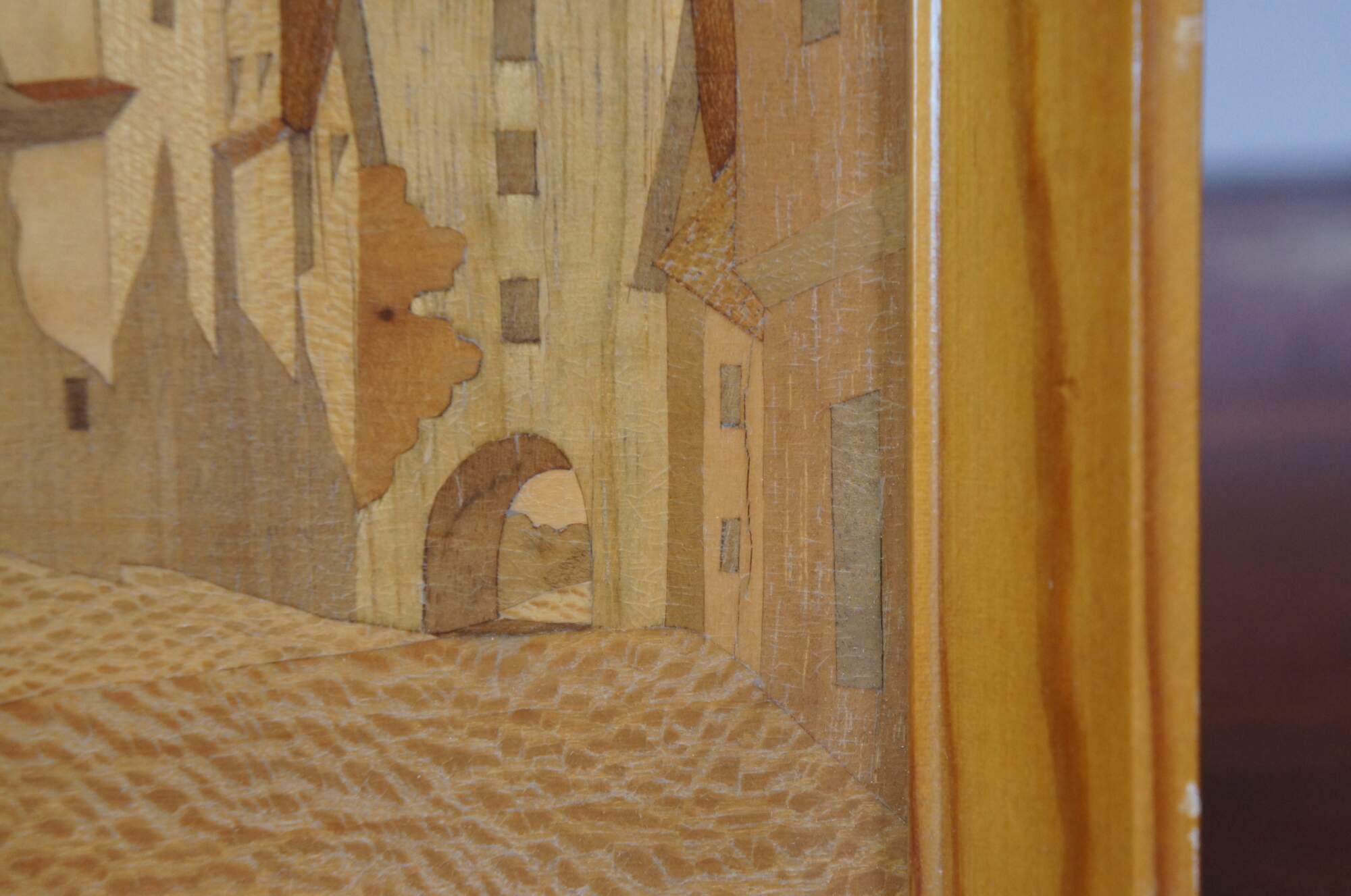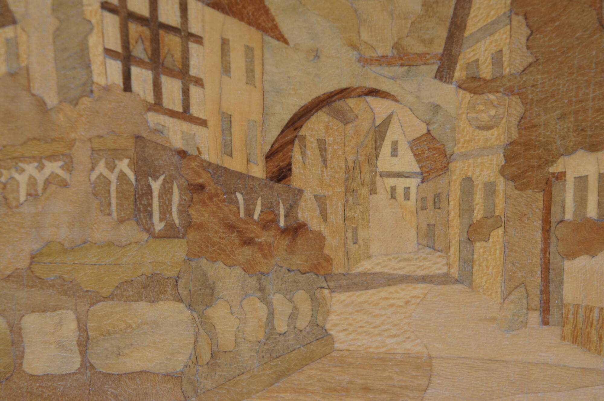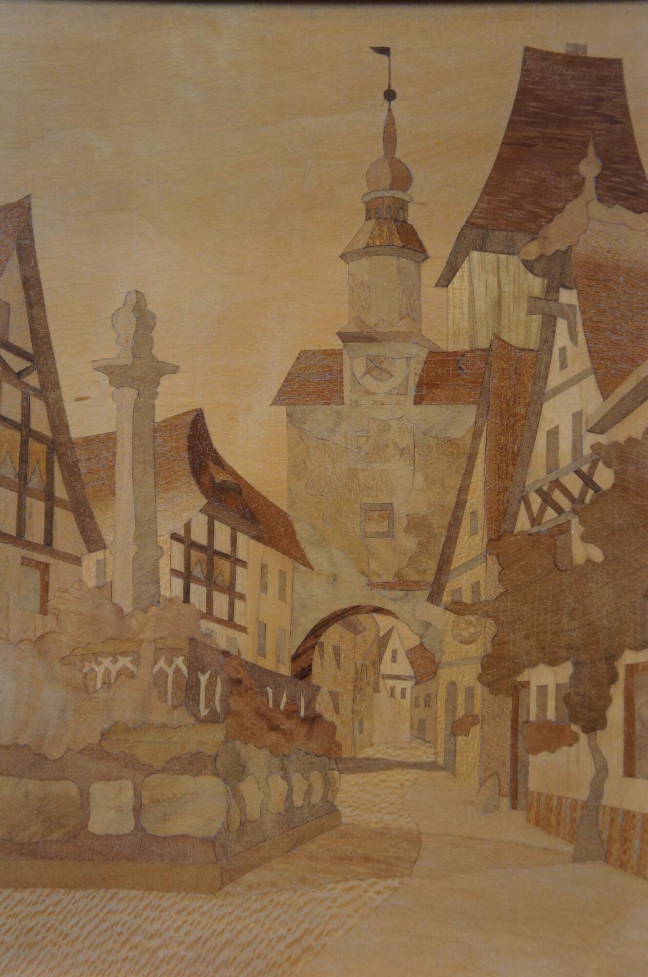 Pair of mid 20th century wooden inlay / marquetry cityscapes by Schild Intarsia, depicting a pair of picturesque German / European city streets. Beveled wood frame.