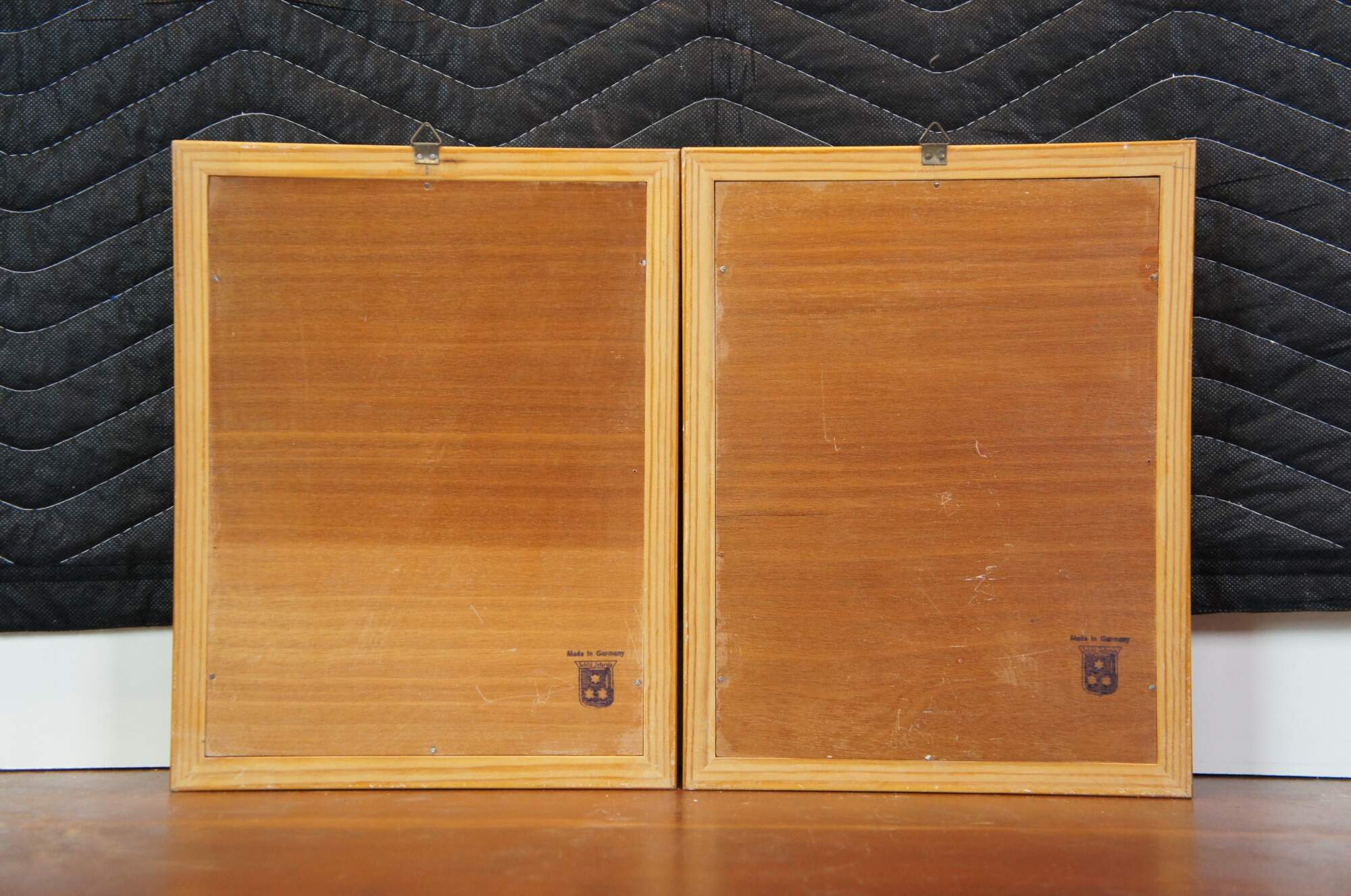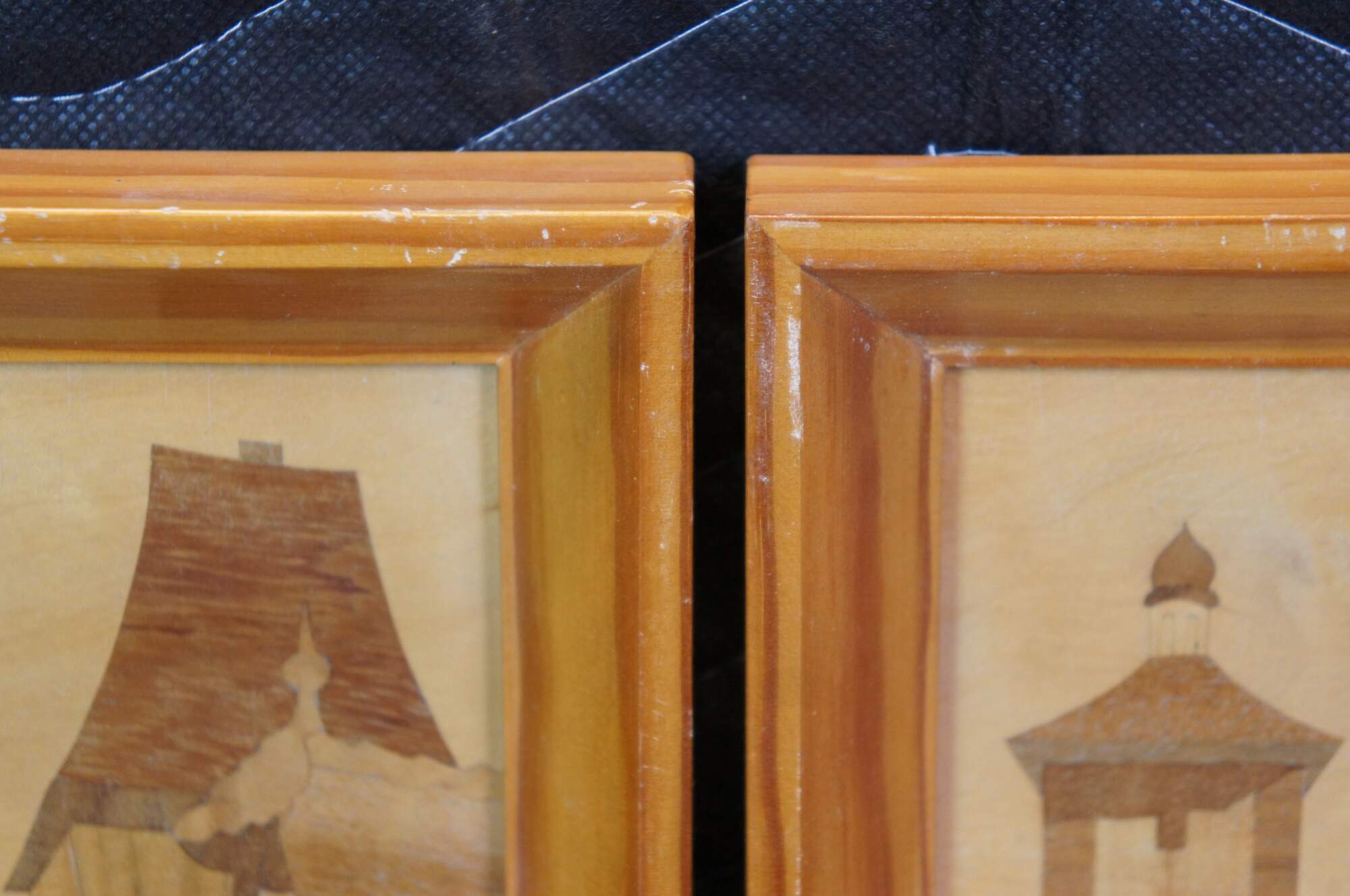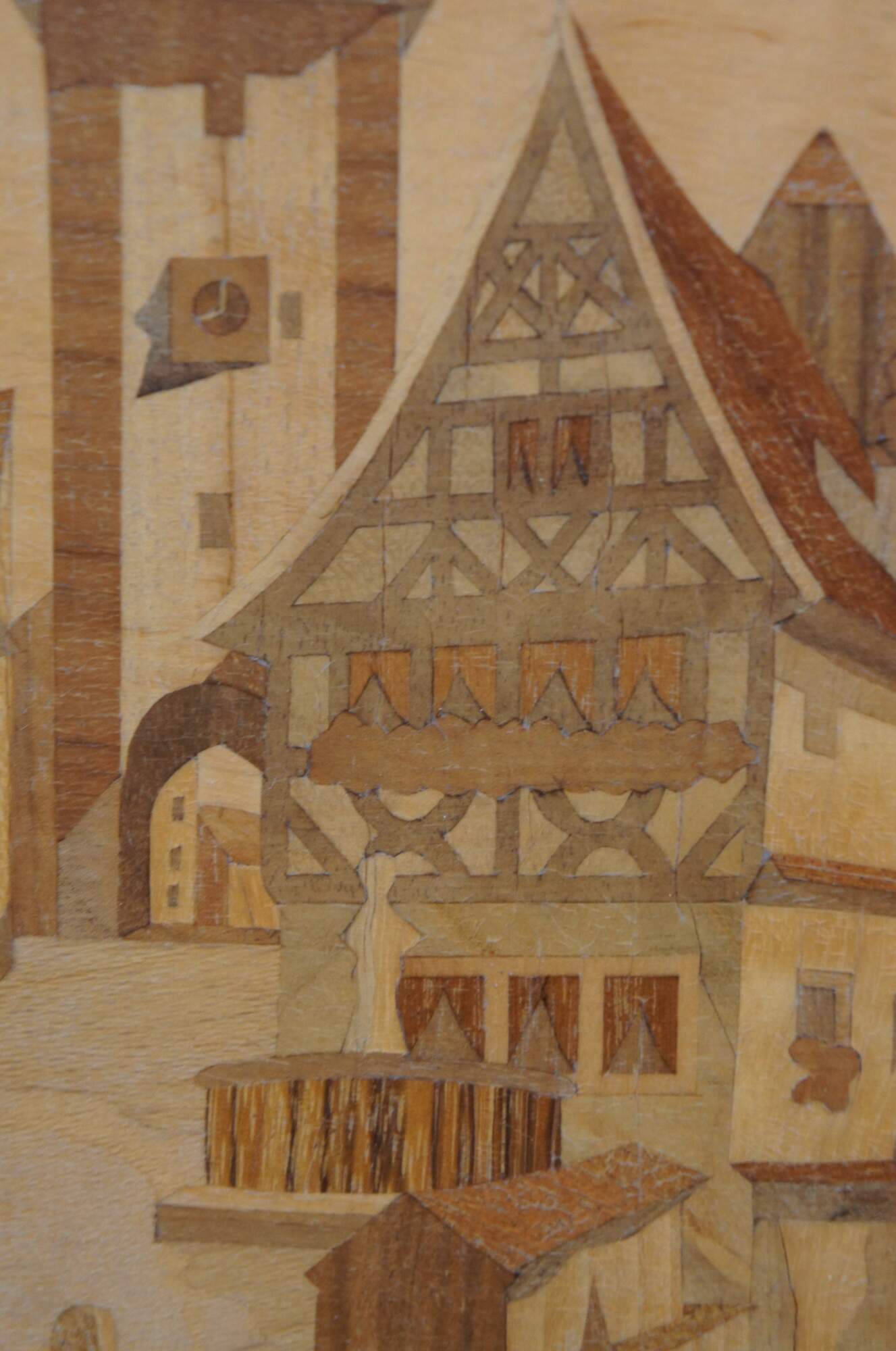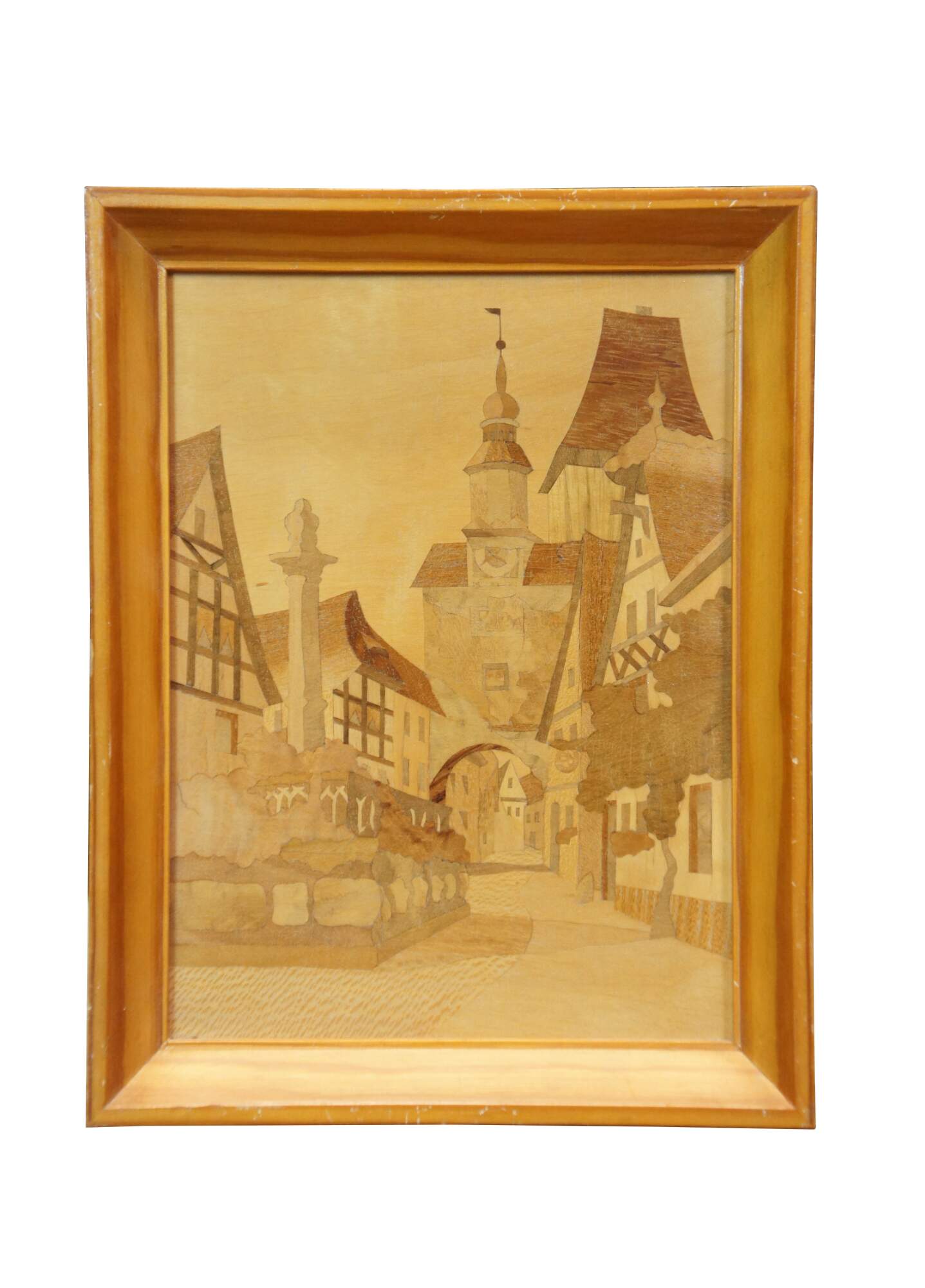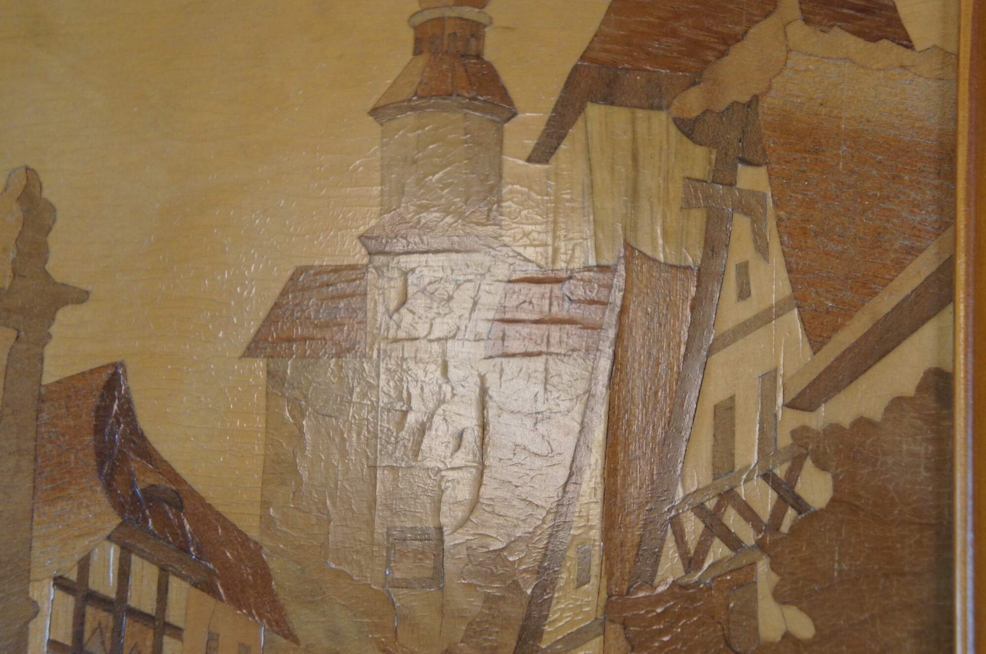Pair of mid 20th century wooden inlay / marquetry cityscapes by Schild Intarsia, depicting a pair of picturesque German / European city streets. Beveled wood frame.