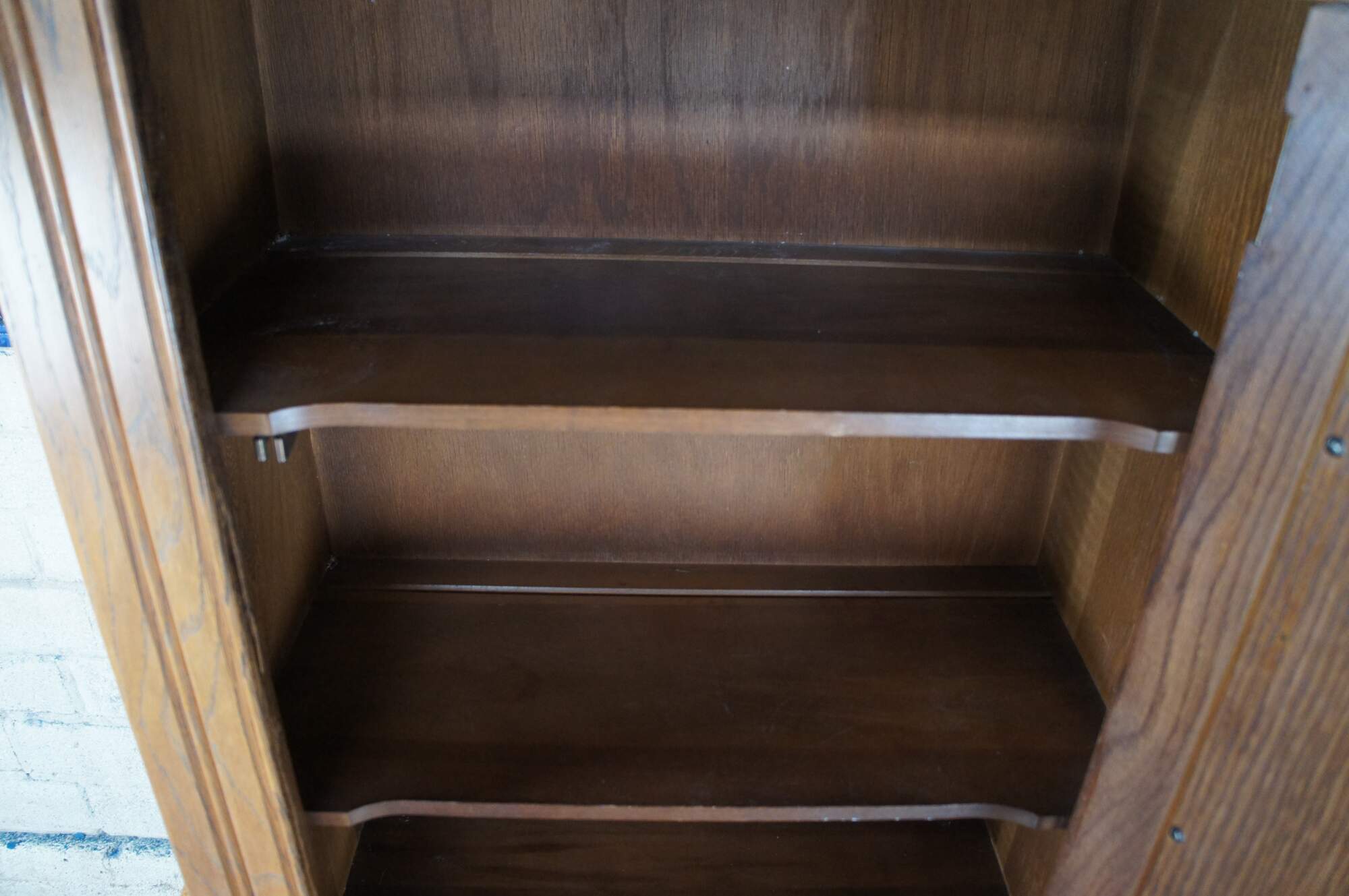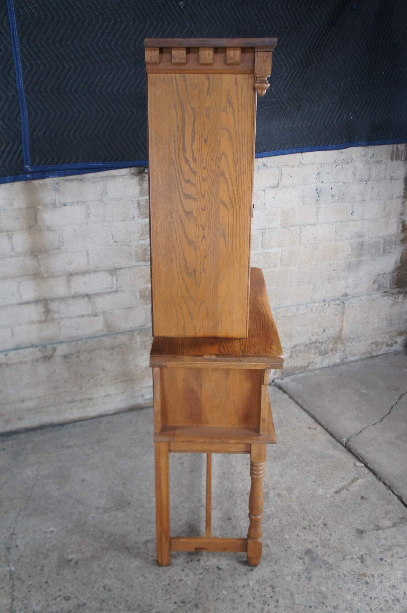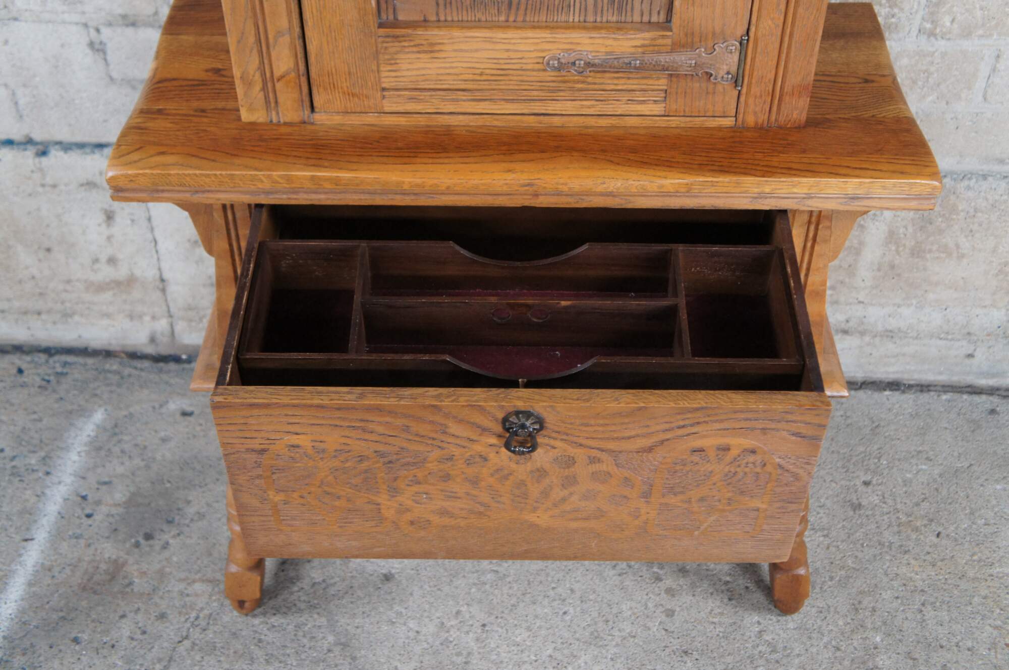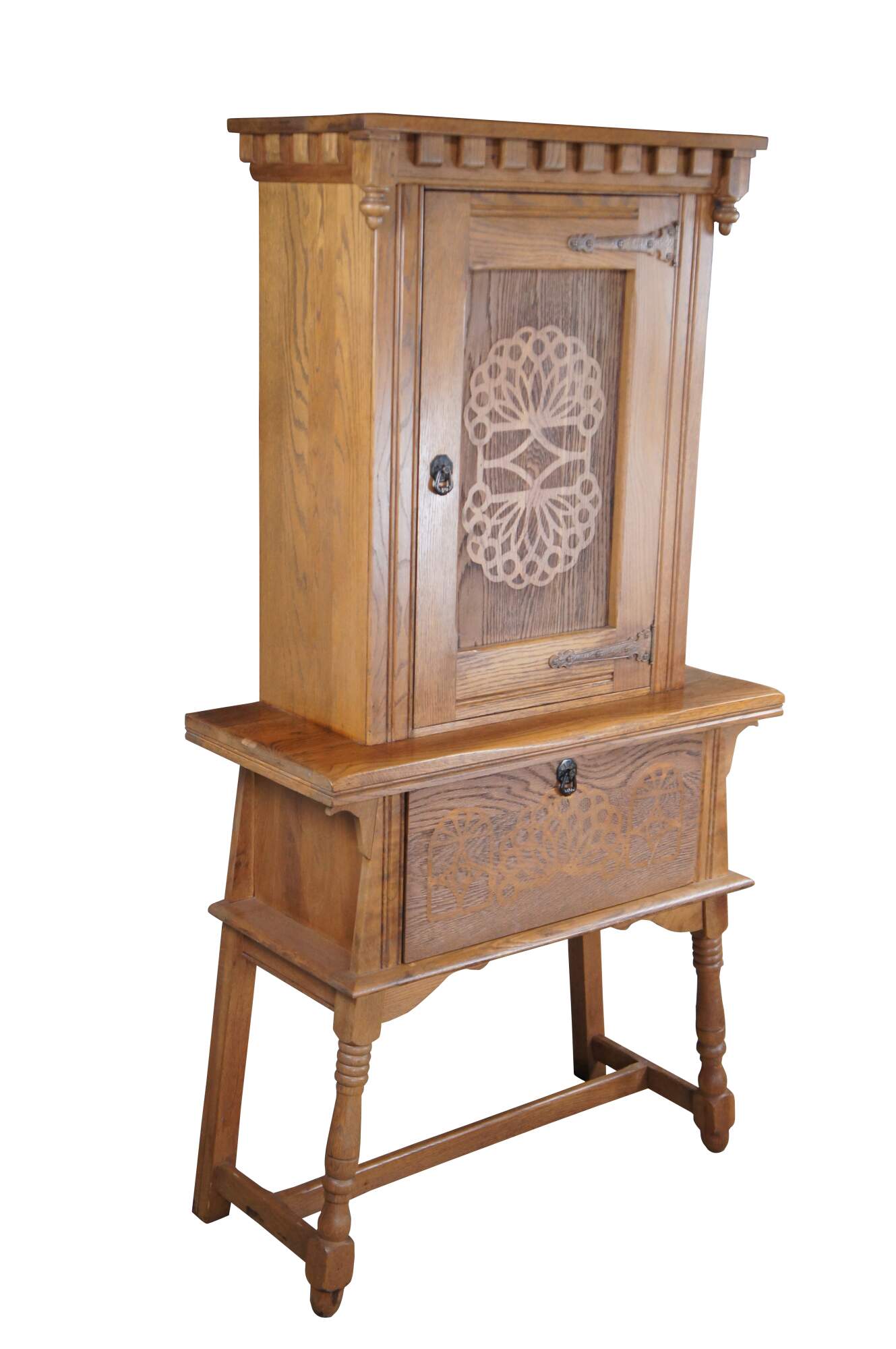 Antique Kuchins Furniture arts & crafts china cabinet / cupboard / dry bar / hutch. Made of oak featuring carved paneled door with long hammered copper hinges that opens to shelves with plate grooves, one large drawer with removable sliding silverware divider, Gothic inspired sawtooth crown with downturned acorn style finials, fluted accents and turned legs connected by H stretcher.