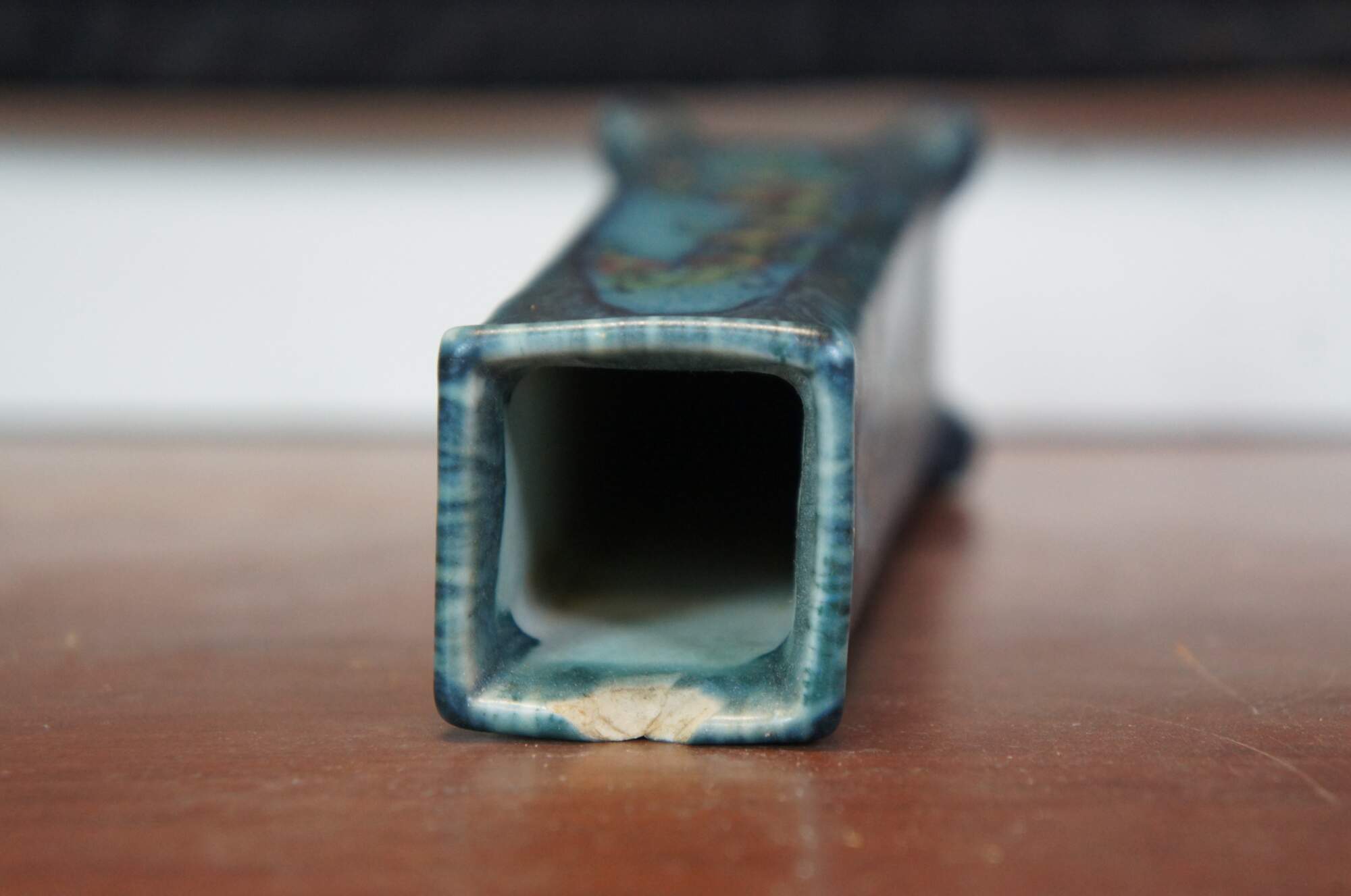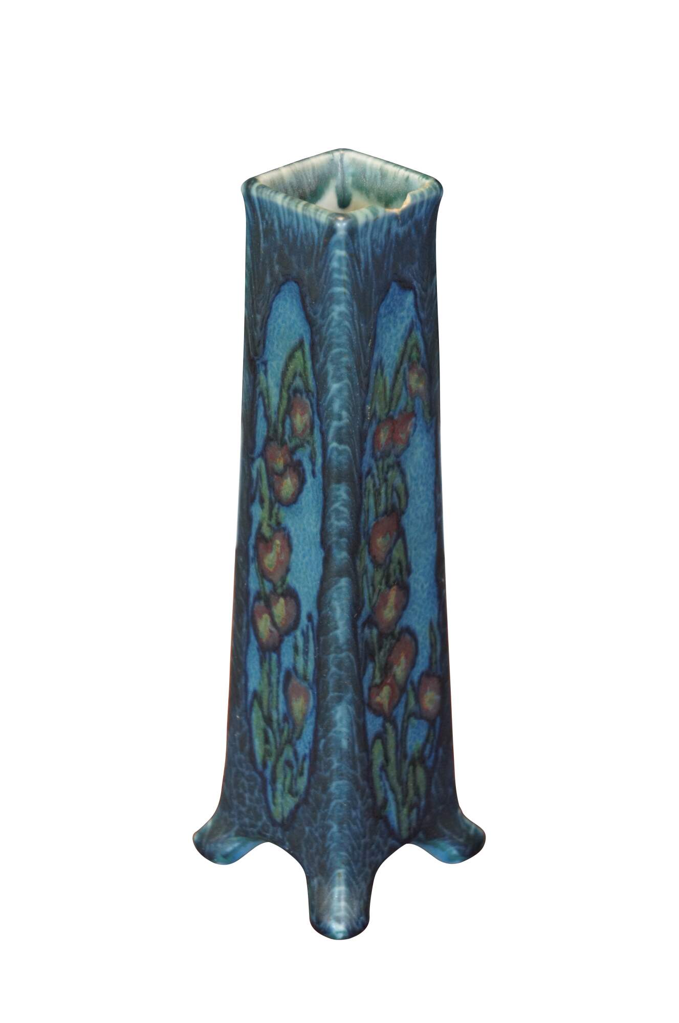 Antique 1923 Rookwood Pottery flower vase designed by Vera Tischler. shape number 2015 - slightly tapered, footed rectangular form with art nouveau decoration, consisting of a stalk of red and yellow flowers on a swirled two-tone blue background under a matte "vellum" glaze. Incised and initialed on base.