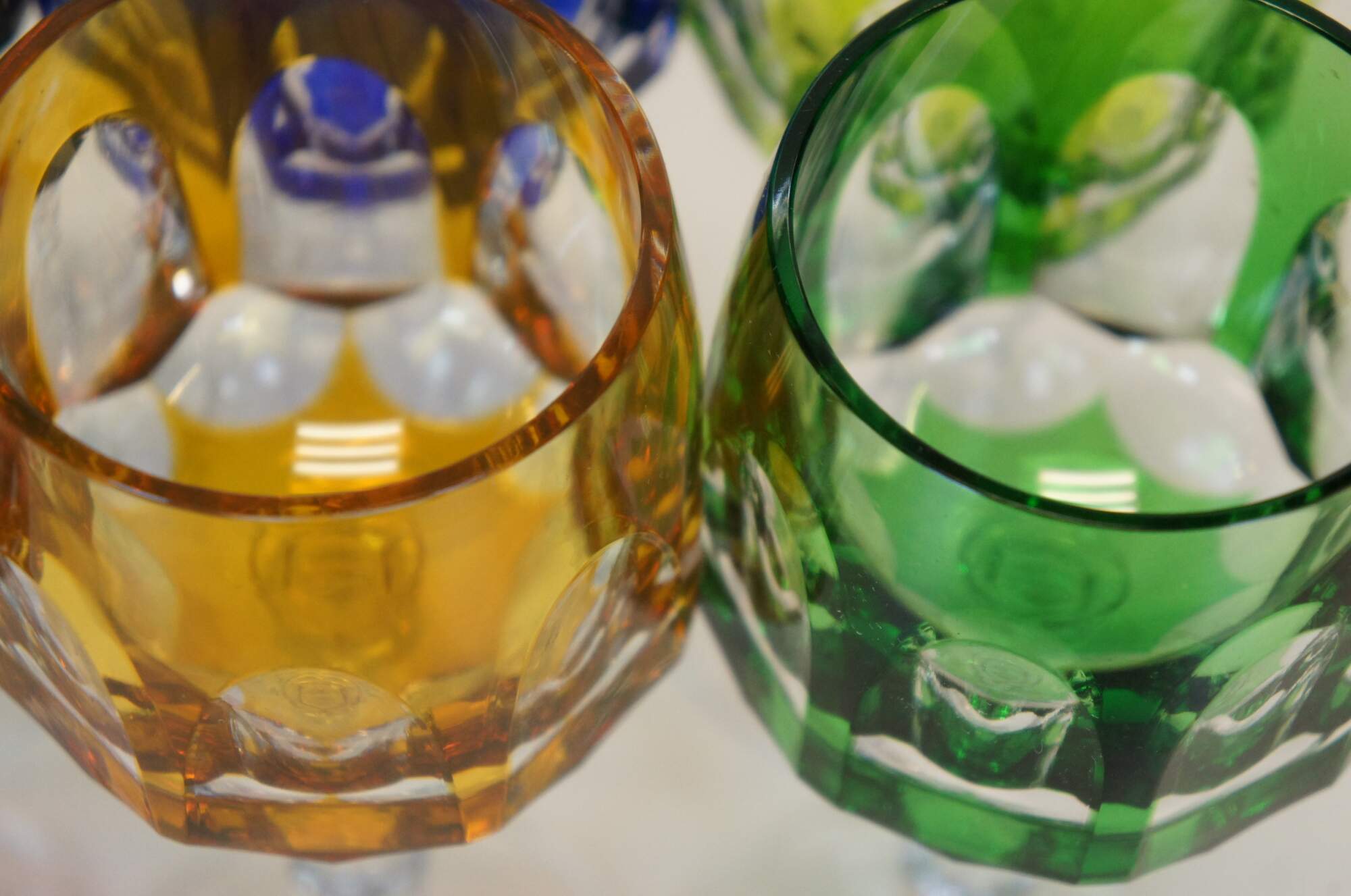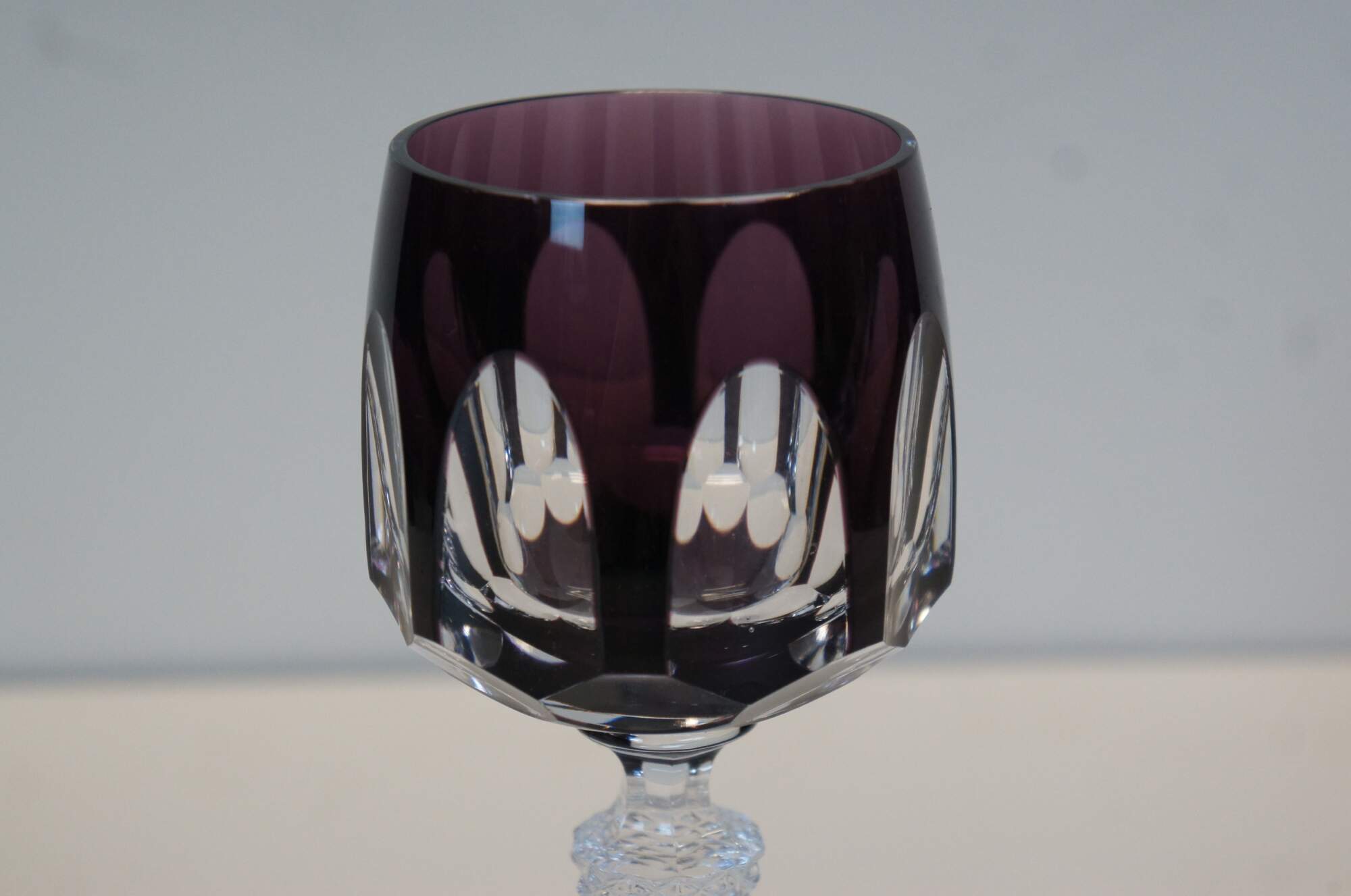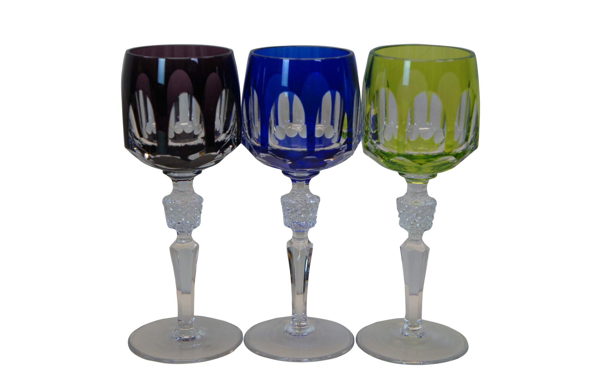 Set of 6 vintage Boheian cut to clear wine goblet glasses - thumbprint style multi-color cups with clear facted stems.