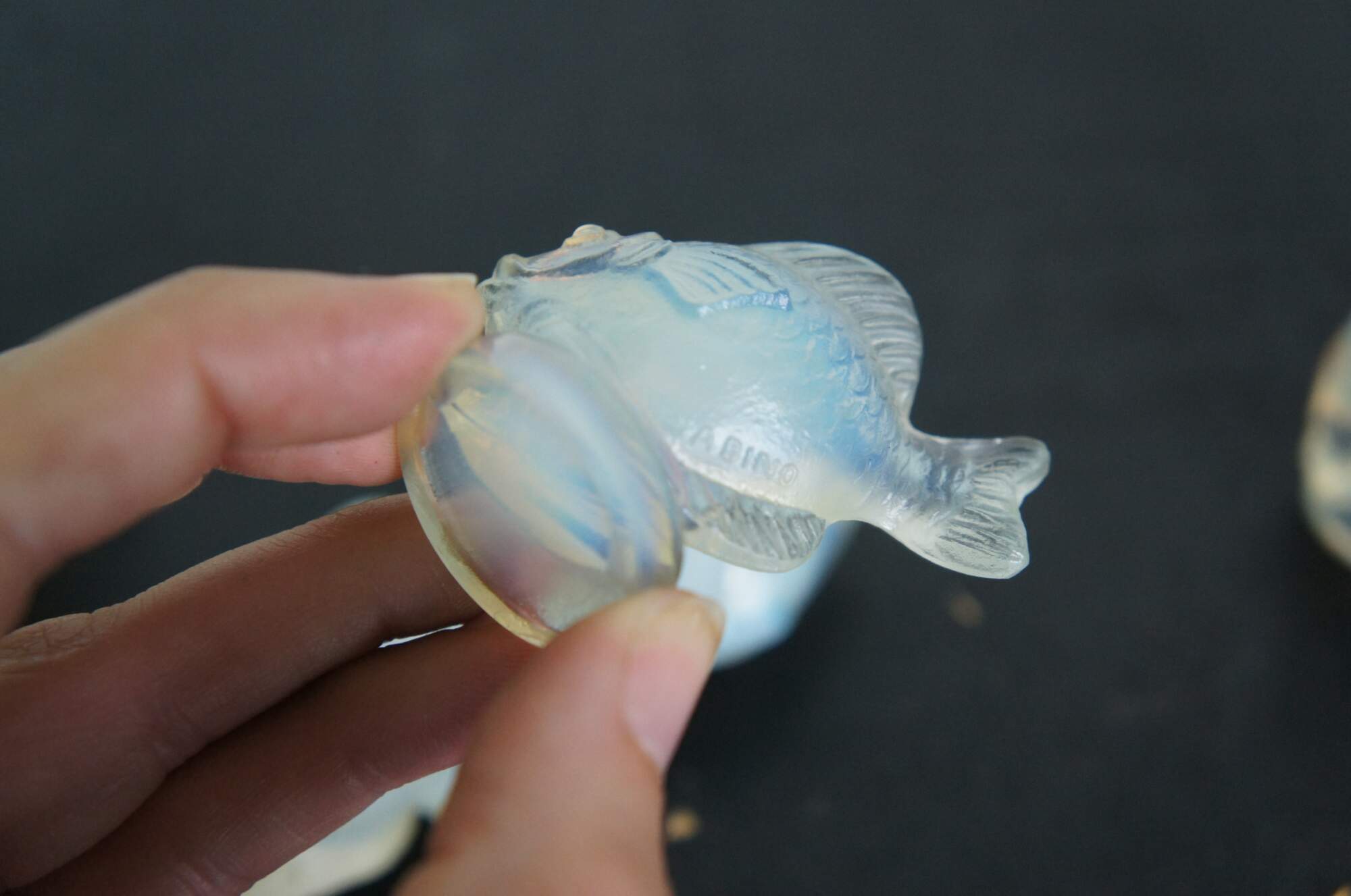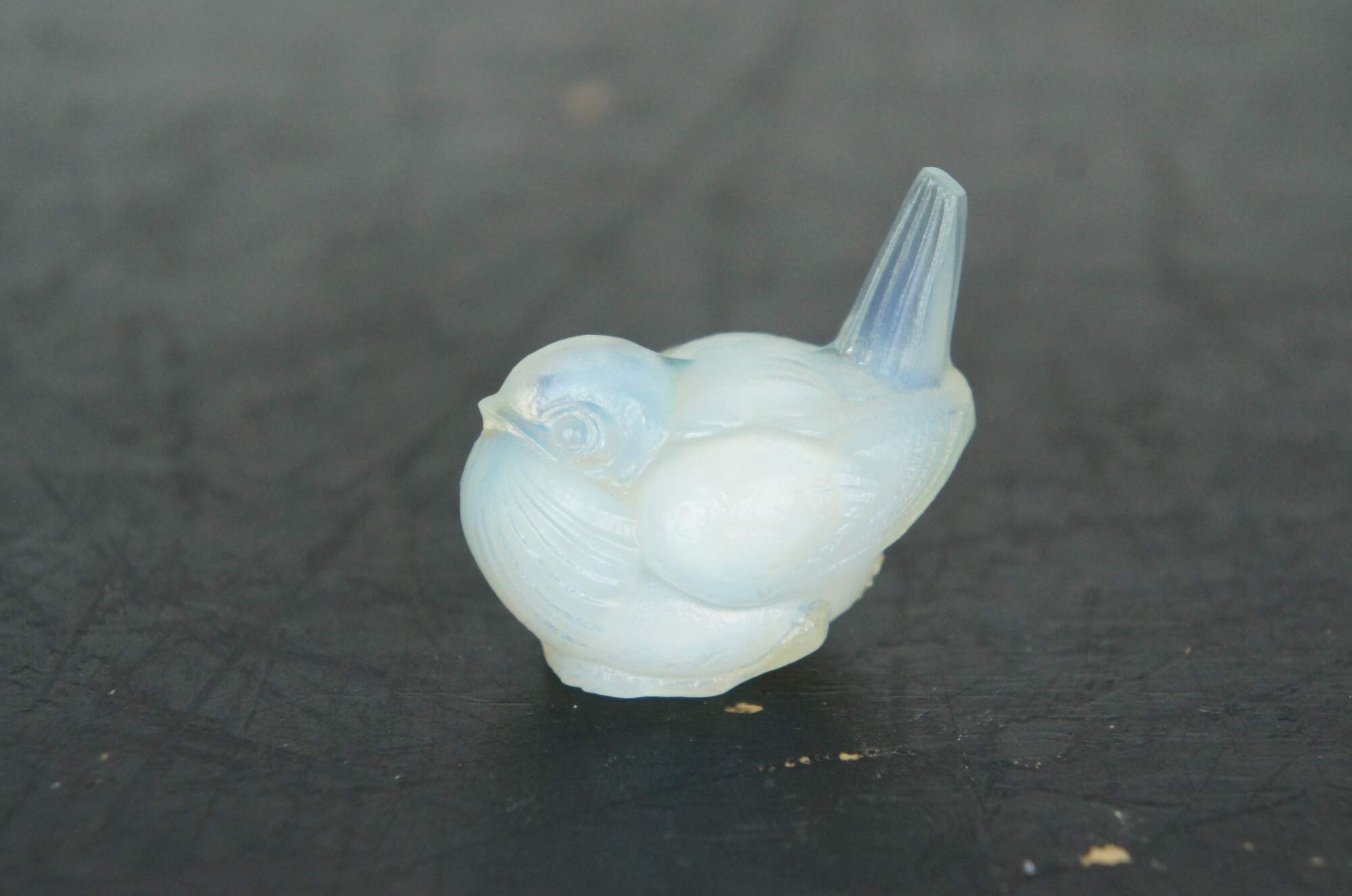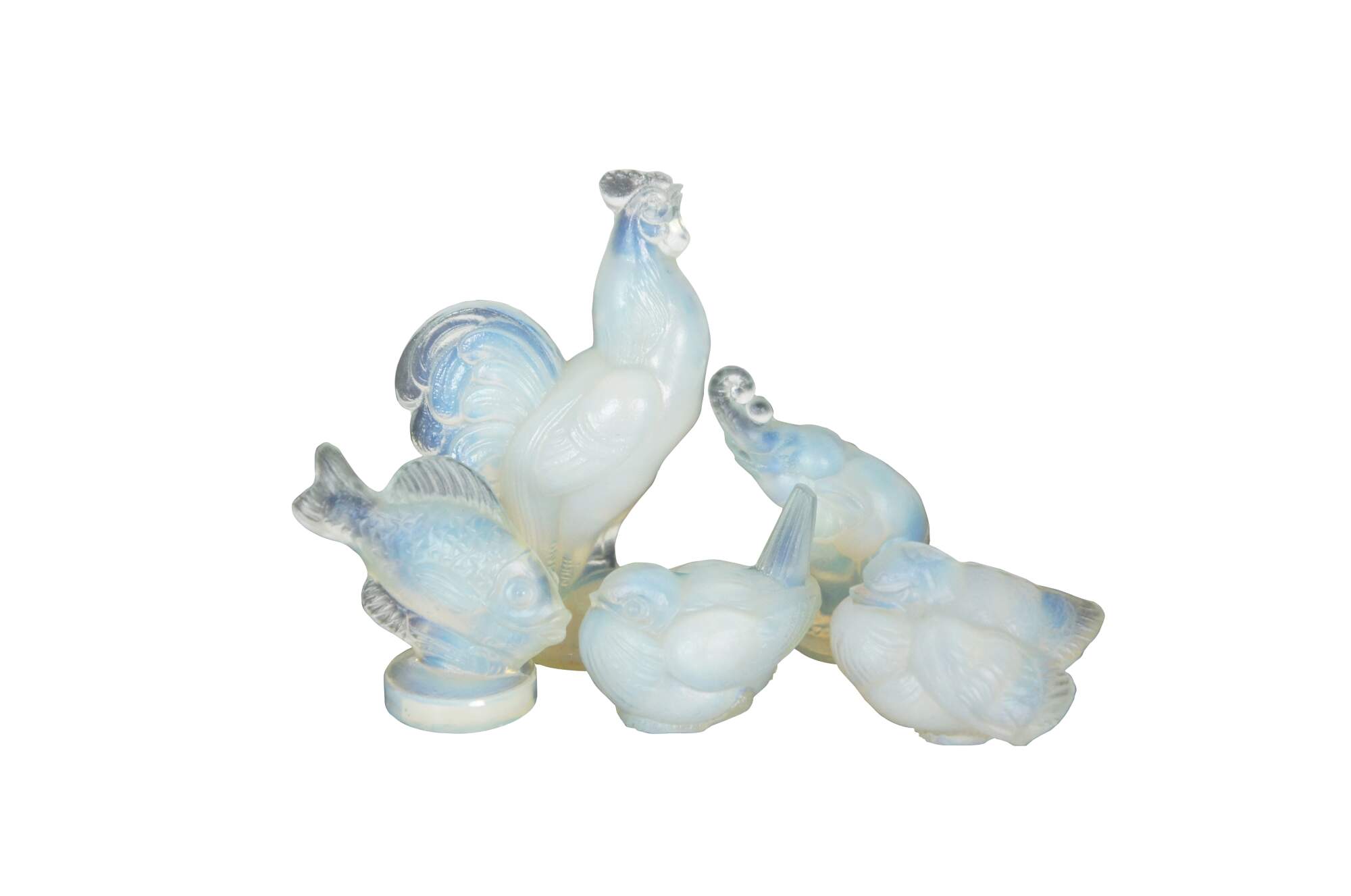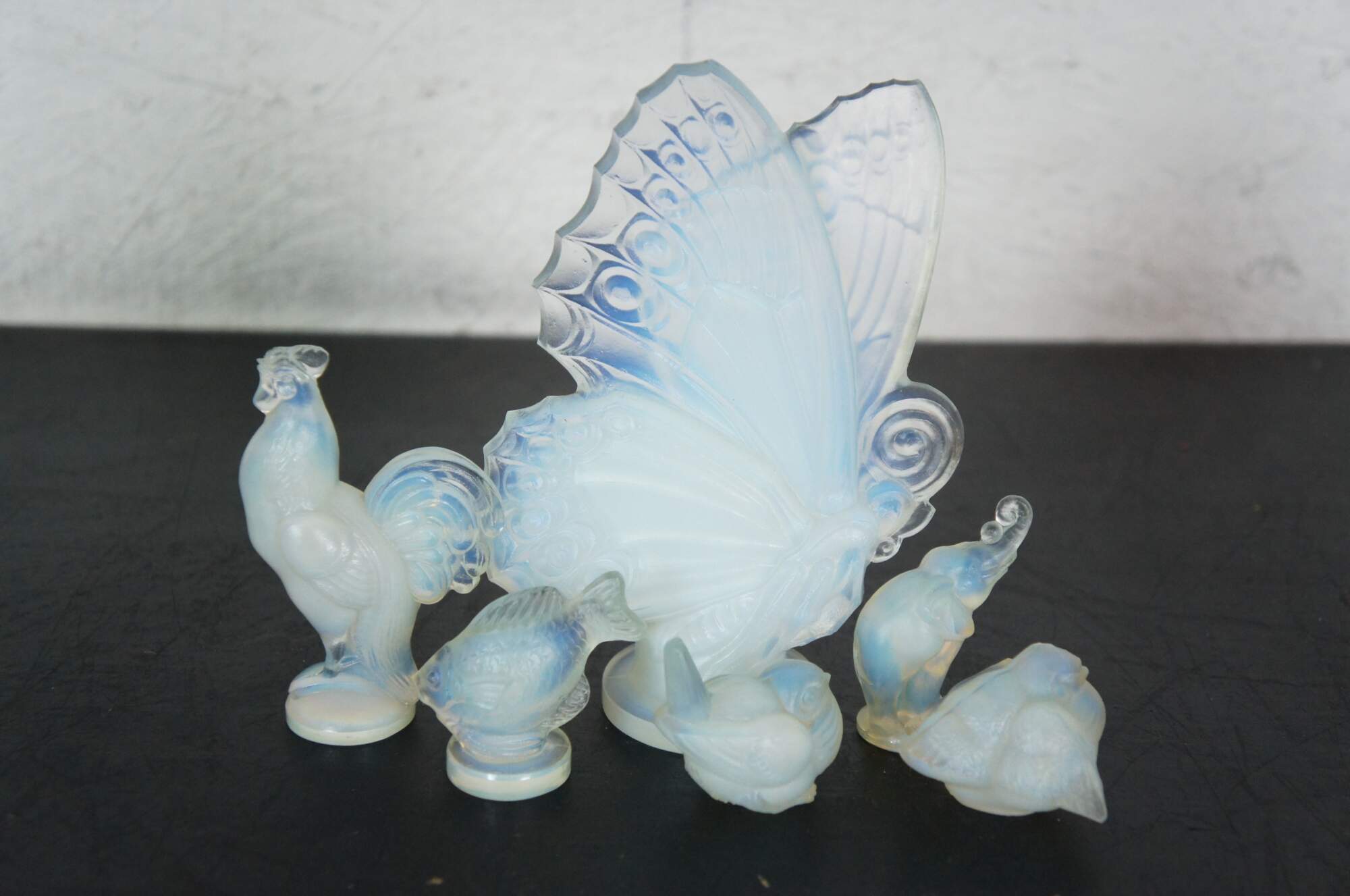 Six French Antique art Deco 1930s white opalescent art glass figurines by Sabino. Includes butterfly with closed wings b33, rooster Coq 8586, elephant, fish barbarin 8566 , and two sparrow birds Moineau Sautillant 8544 (Jumping Sparrow) and Moineau Frileux 8543 (Chilly Sparrow). Signed on bases; branded along side. Paris France.