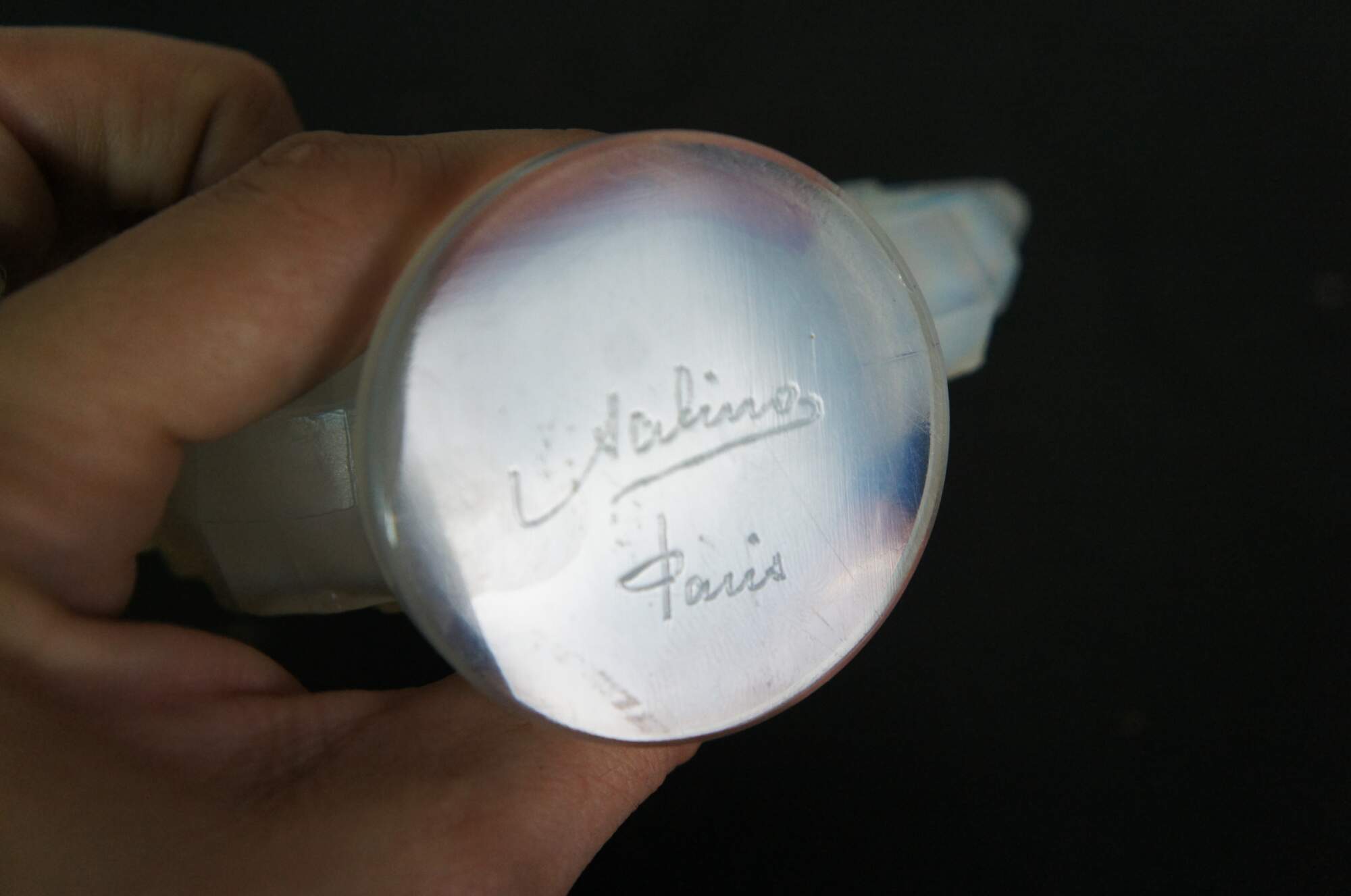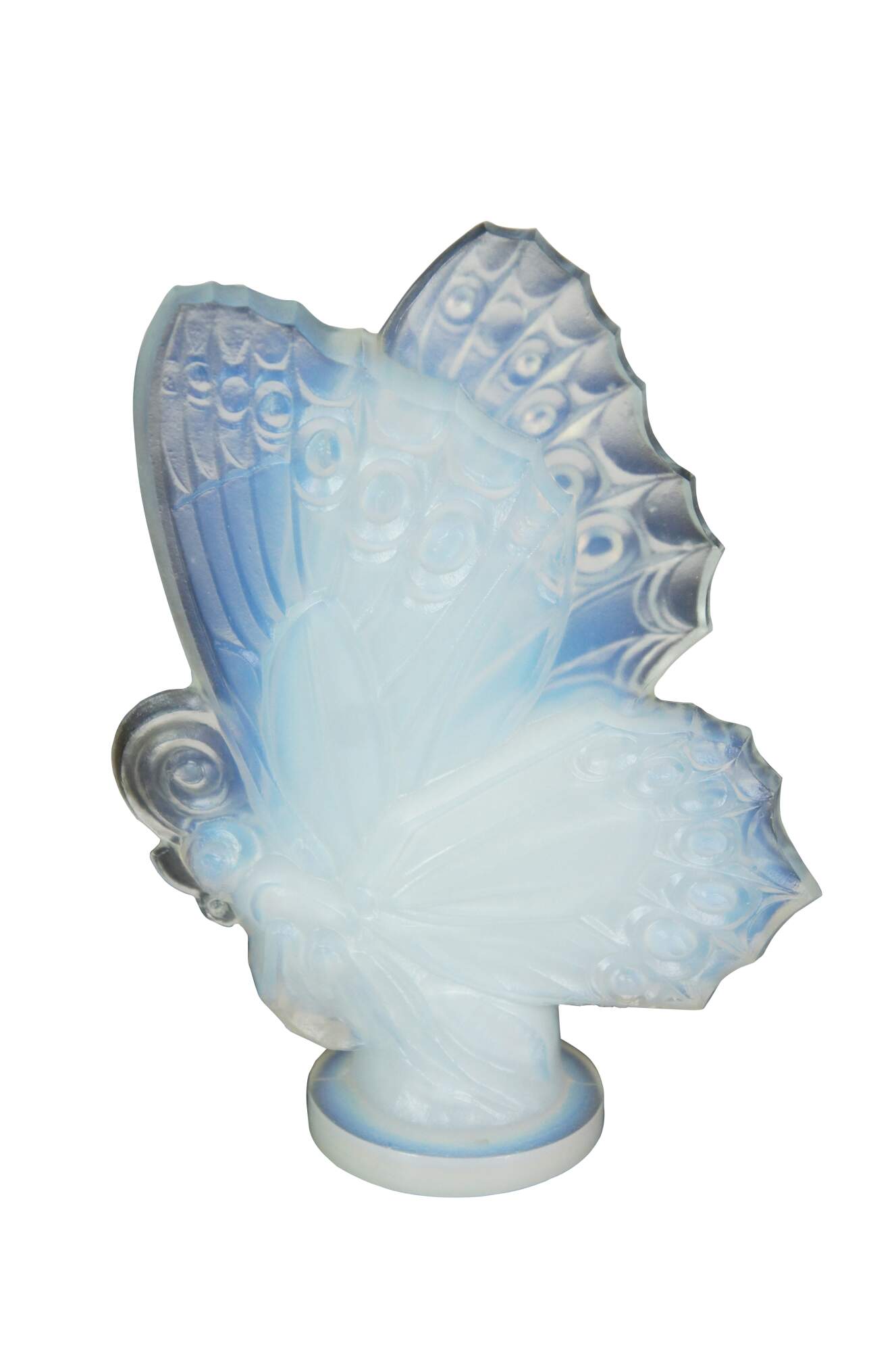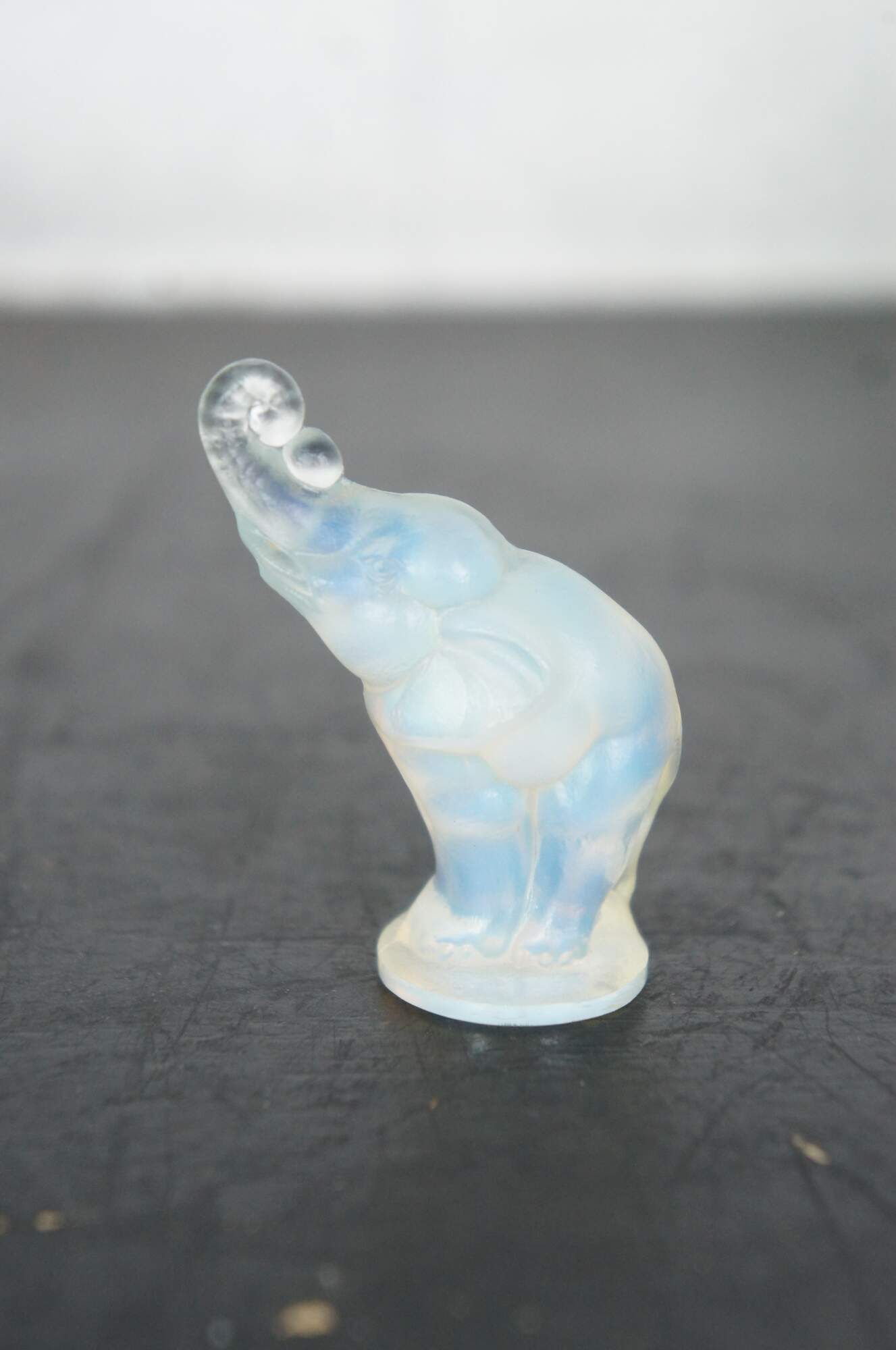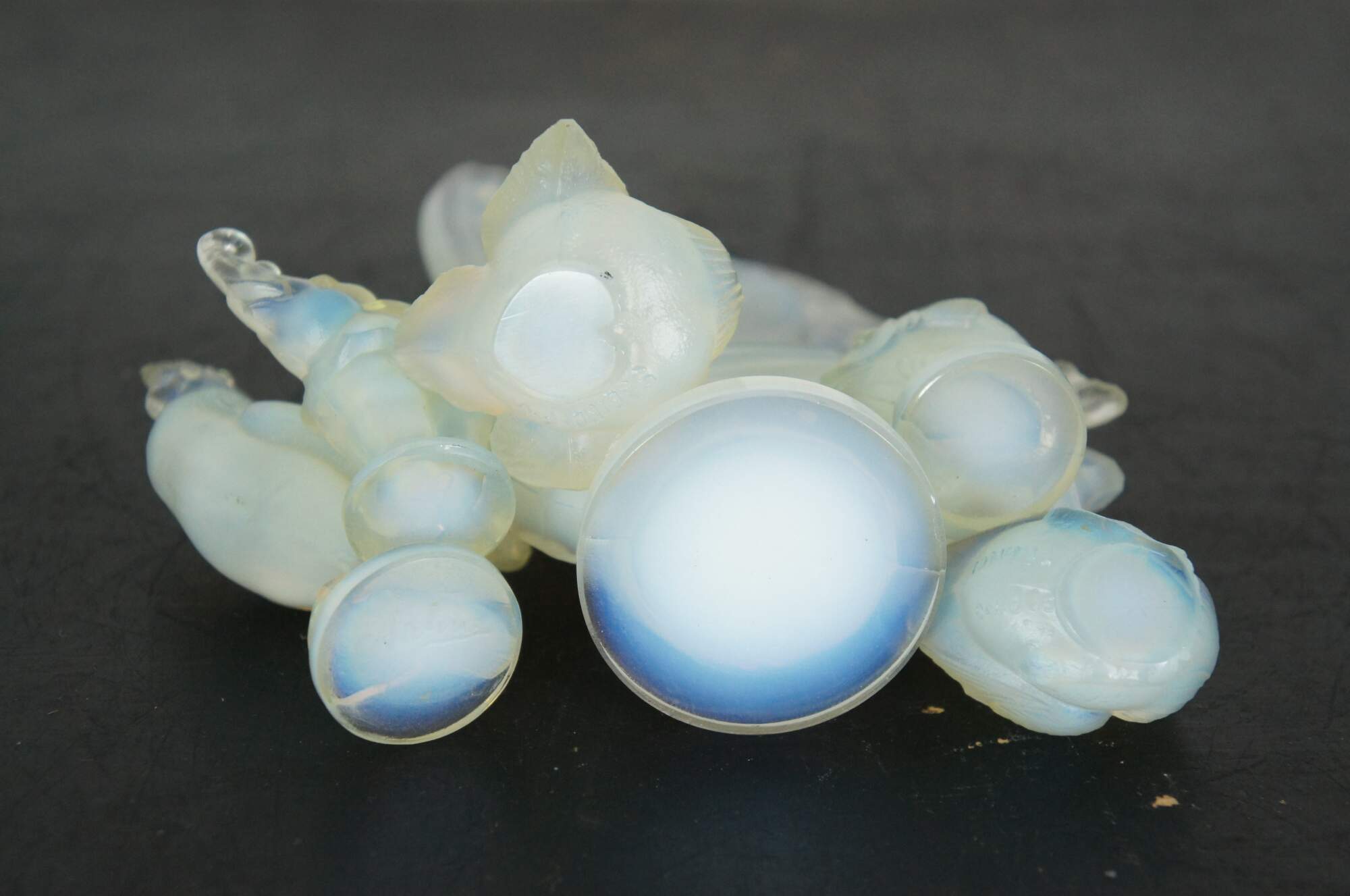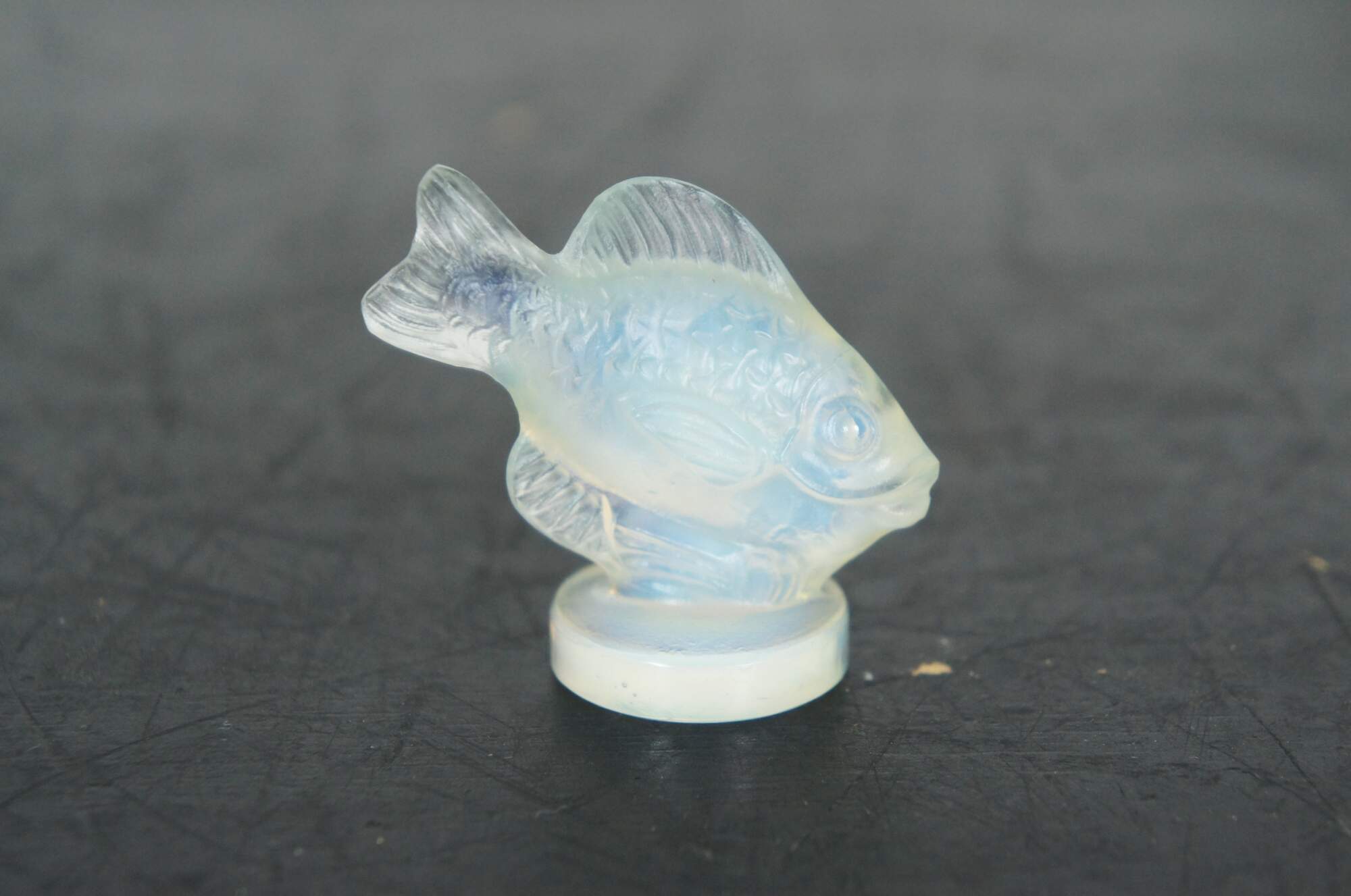 Six French Antique art Deco 1930s white opalescent art glass figurines by Sabino. Includes butterfly with closed wings b33, rooster Coq 8586, elephant, fish barbarin 8566 , and two sparrow birds Moineau Sautillant 8544 (Jumping Sparrow) and Moineau Frileux 8543 (Chilly Sparrow). Signed on bases; branded along side. Paris France.