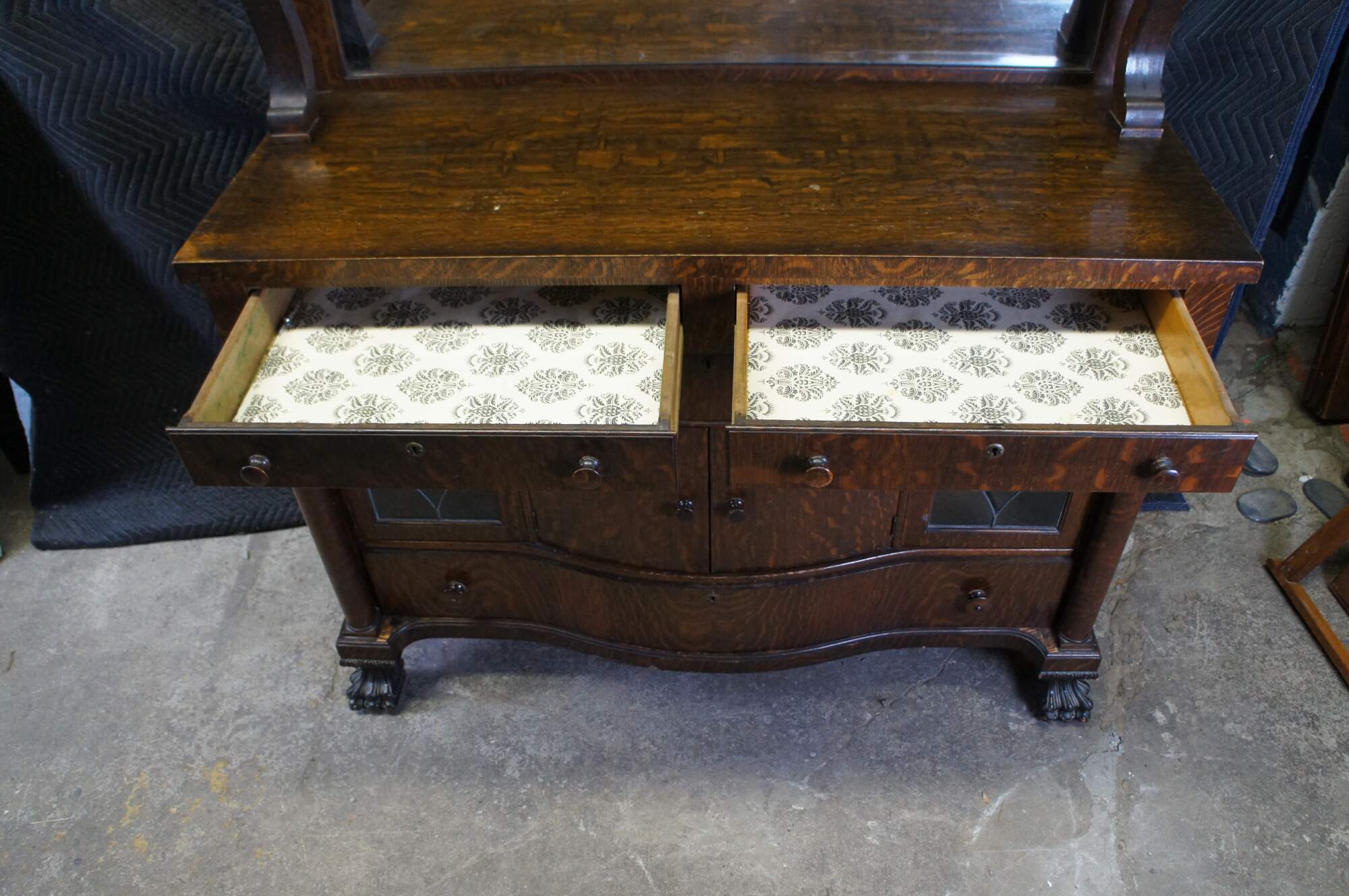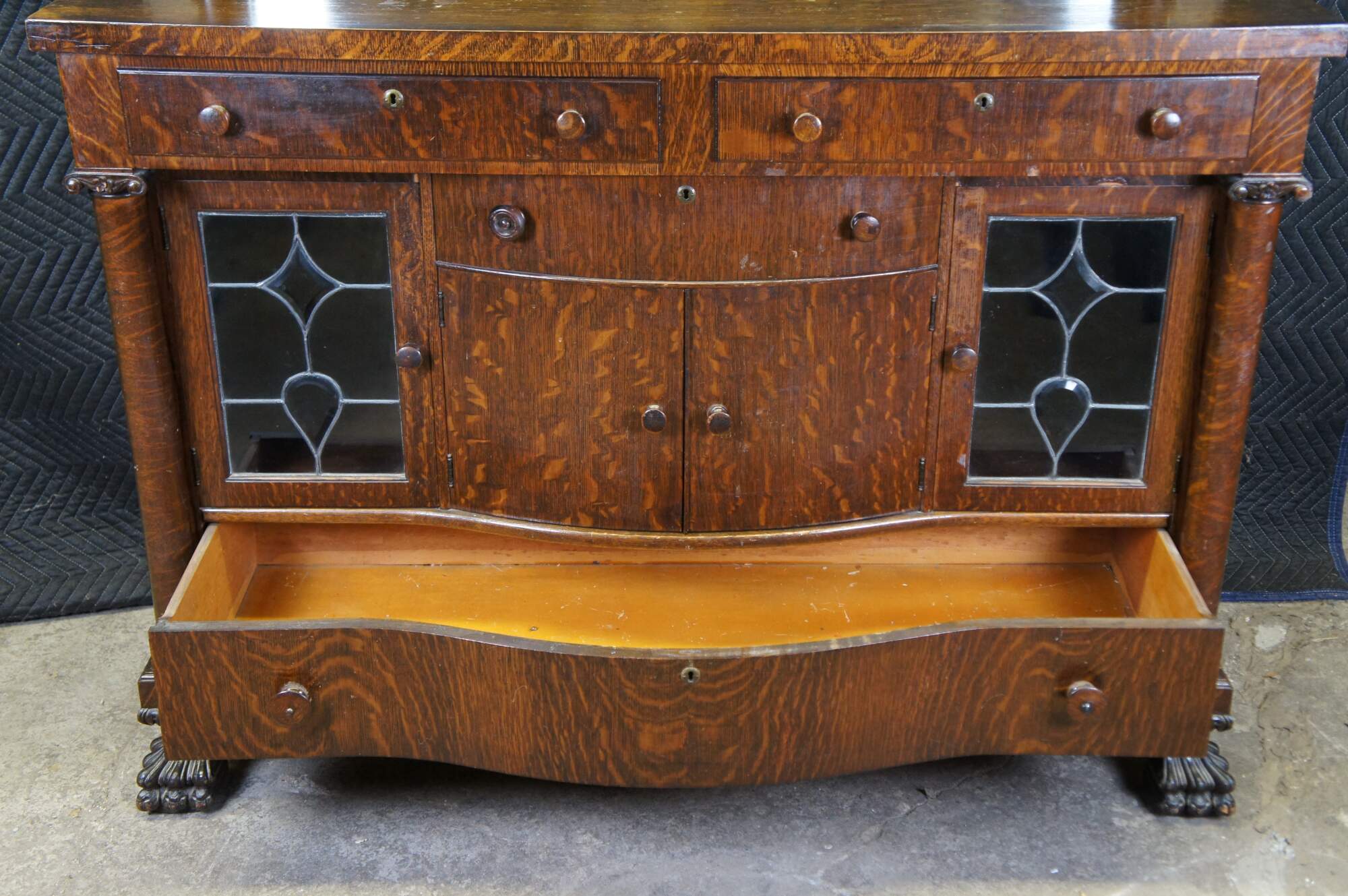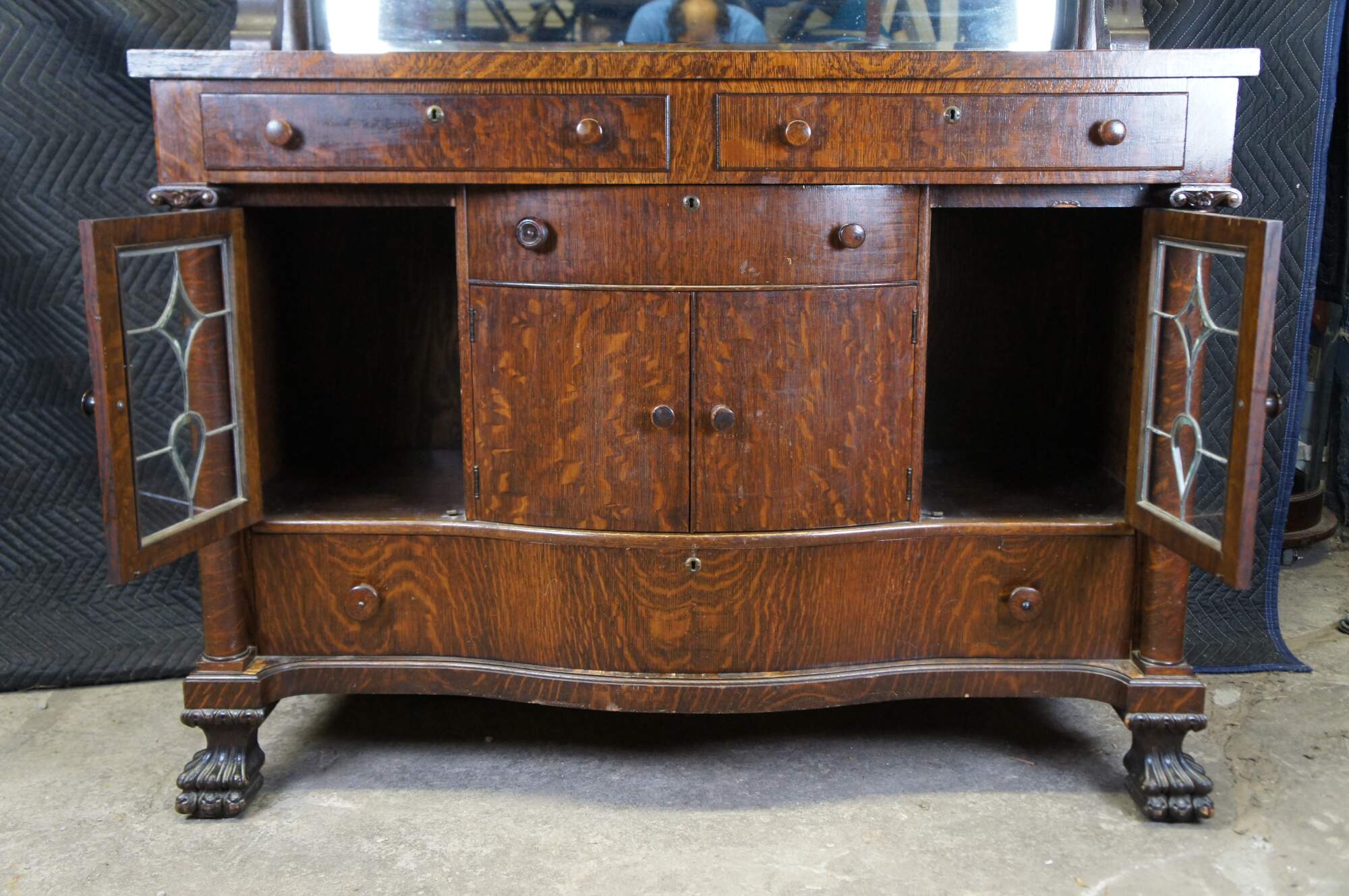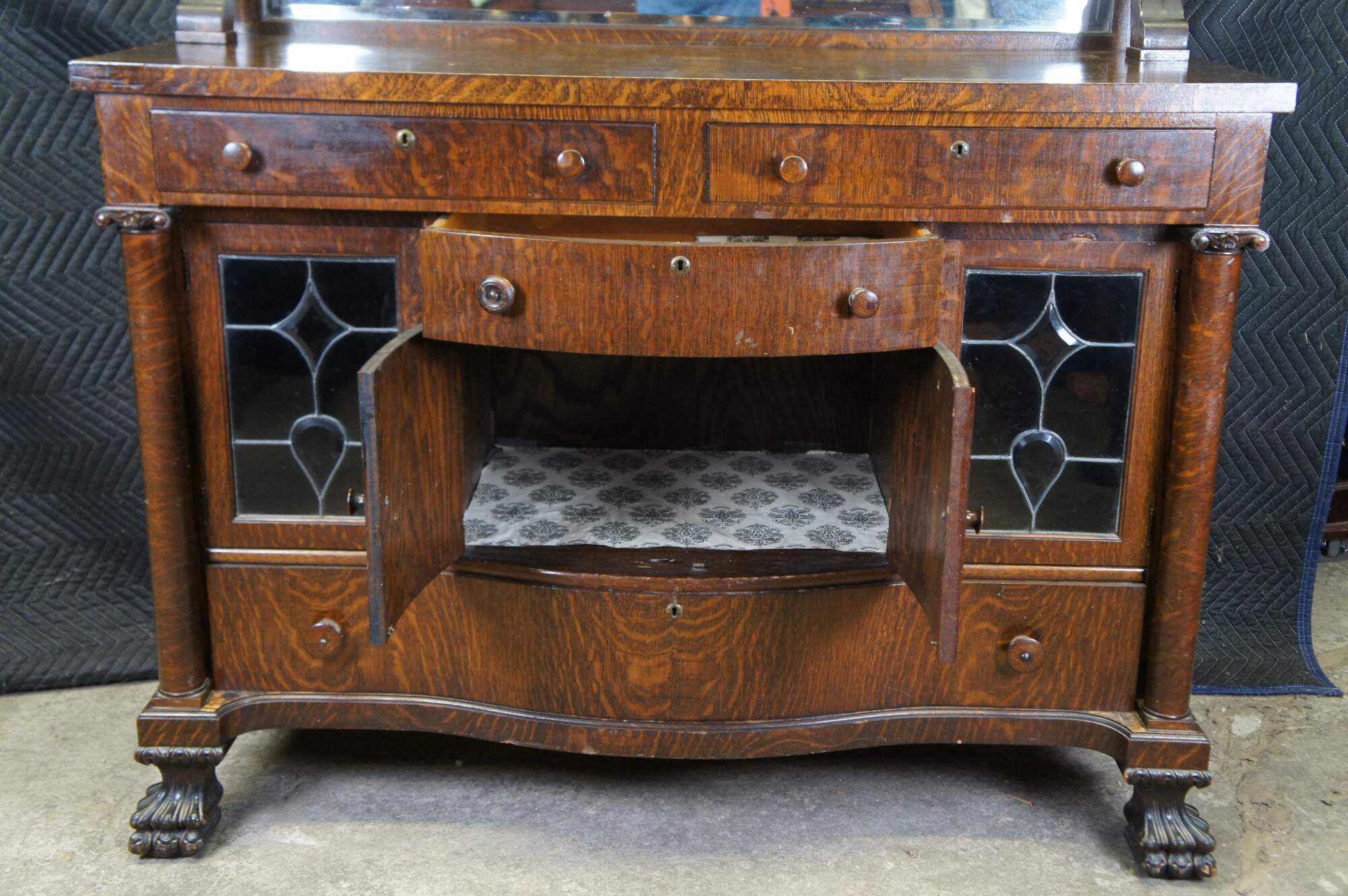 Antique Victorian parlor buffet / sideboard / bar back / dry server cabinet. Made of quartersawn oak featuring Mission and Empire styling with a beveled mirror backsplash over rectangular top suppoted by lower demilune cabinet with leaded glass doors, mulitple drawers and corninthian columns over carved lion claw feet.