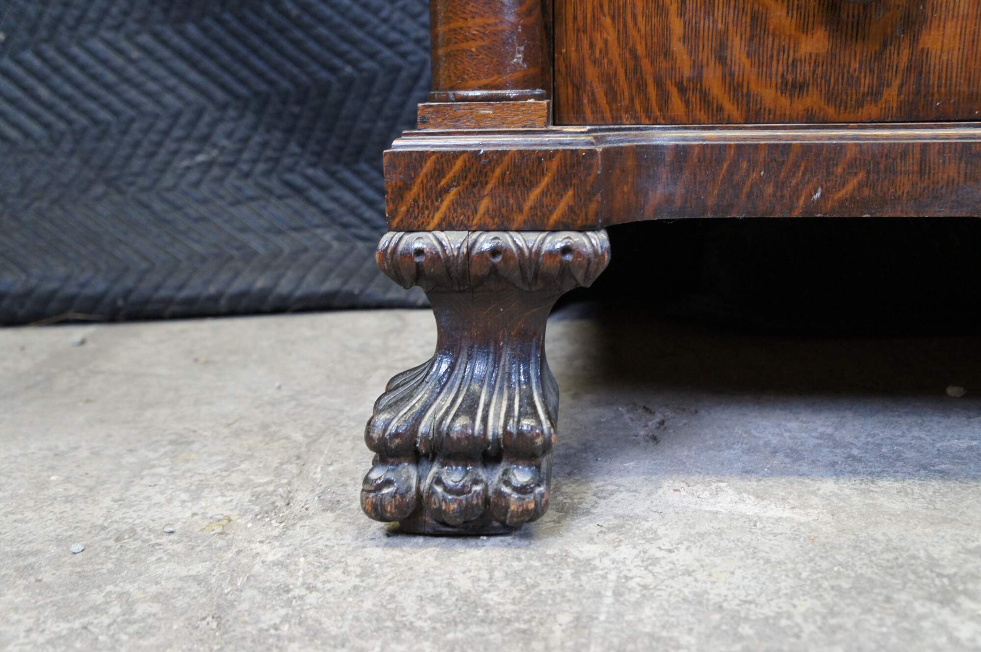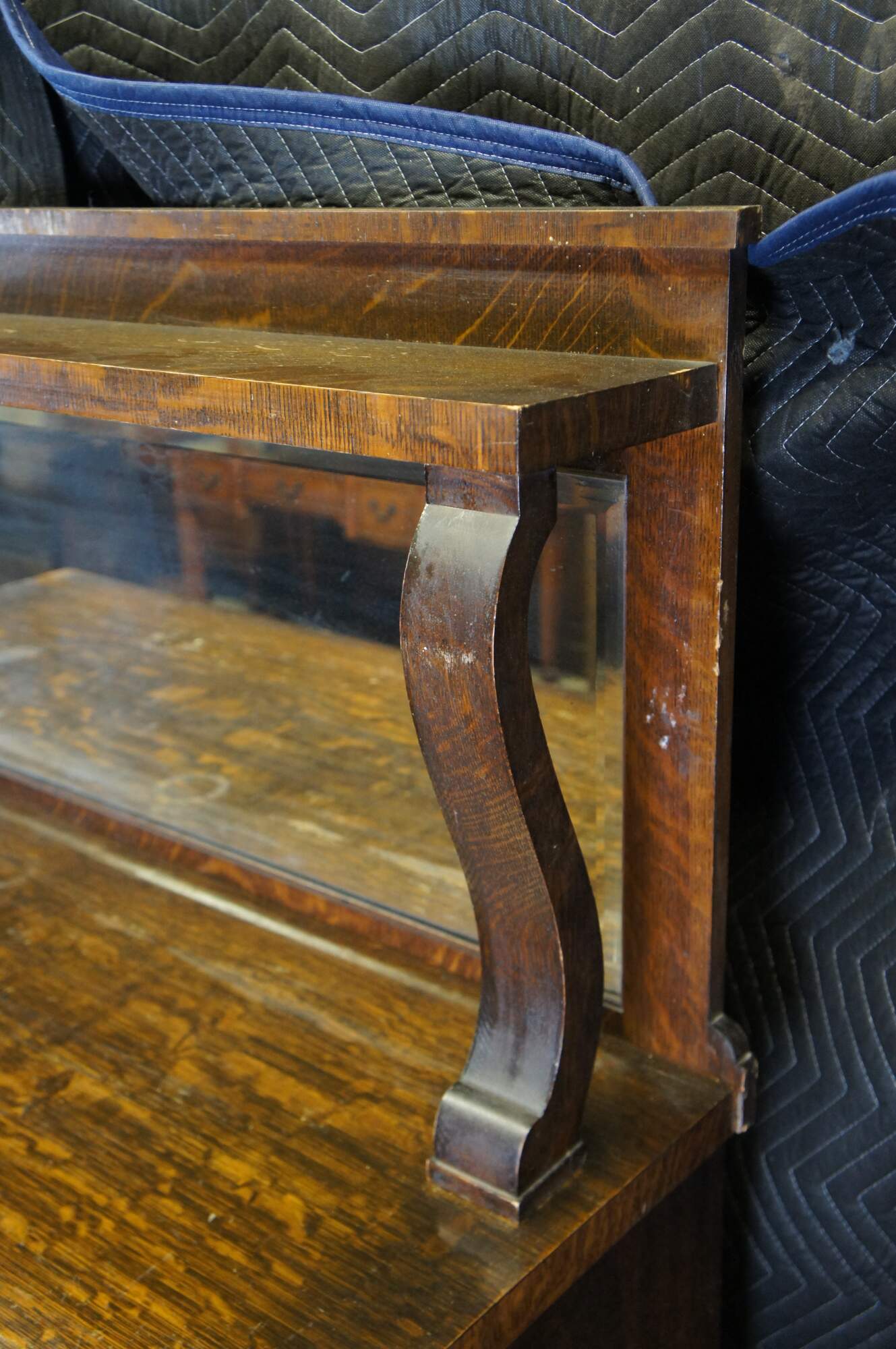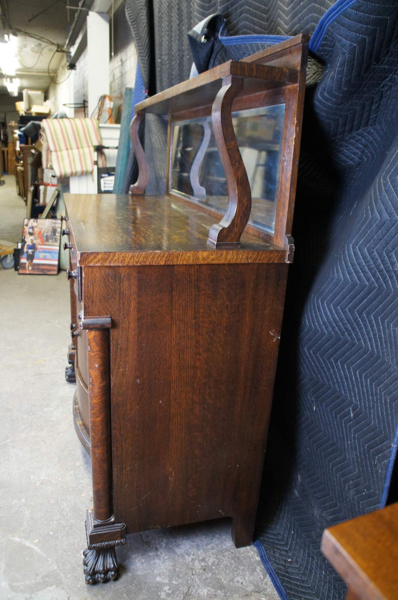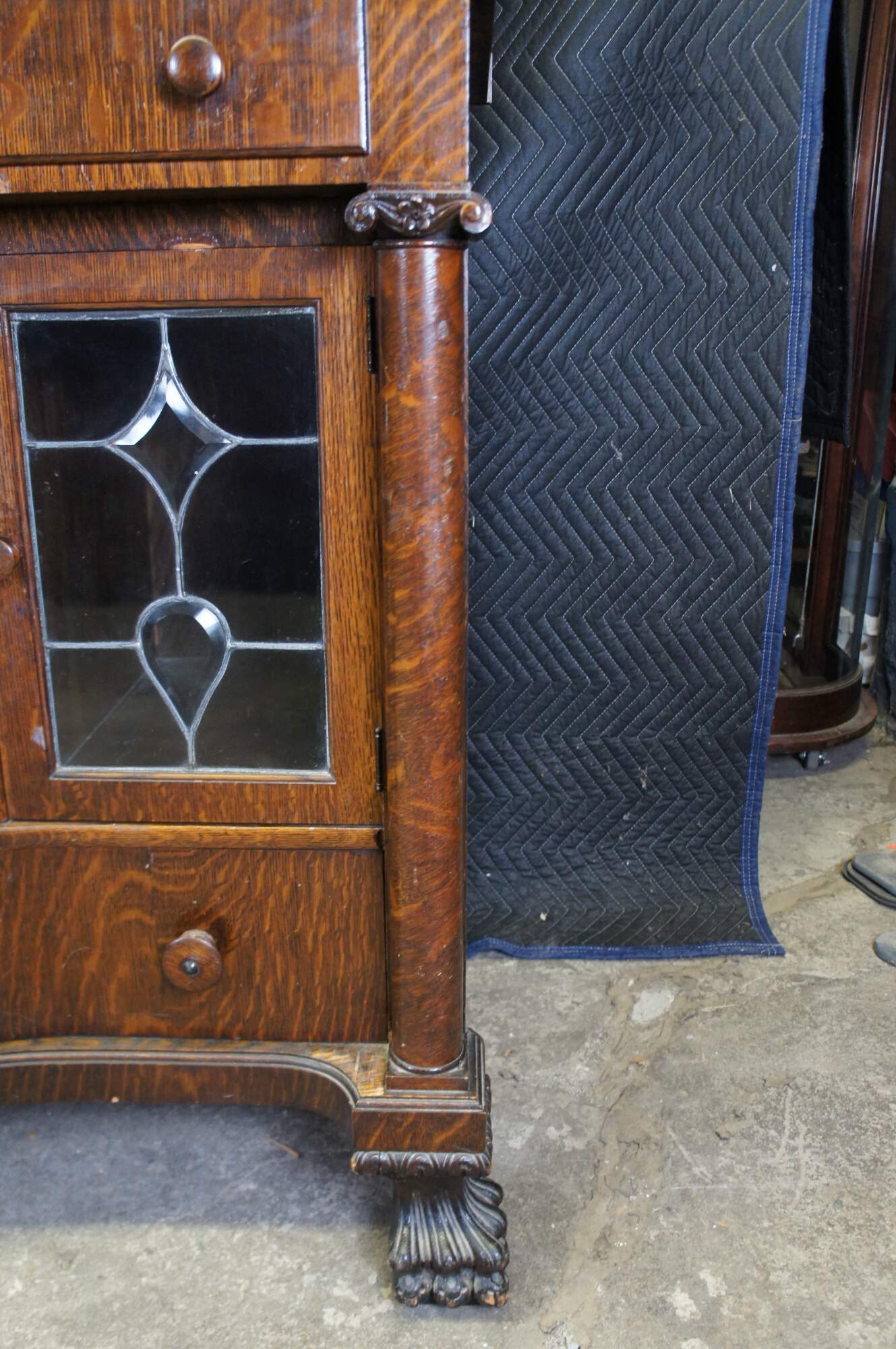 Antique Victorian parlor buffet / sideboard / bar back / dry server cabinet. Made of quartersawn oak featuring Mission and Empire styling with a beveled mirror backsplash over rectangular top suppoted by lower demilune cabinet with leaded glass doors, mulitple drawers and corninthian columns over carved lion claw feet.