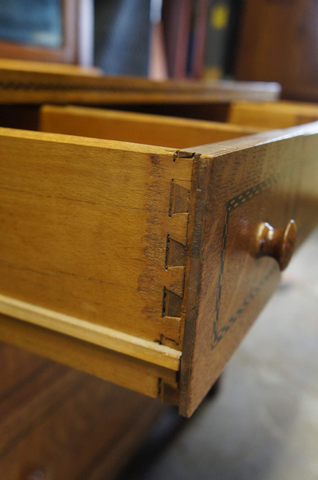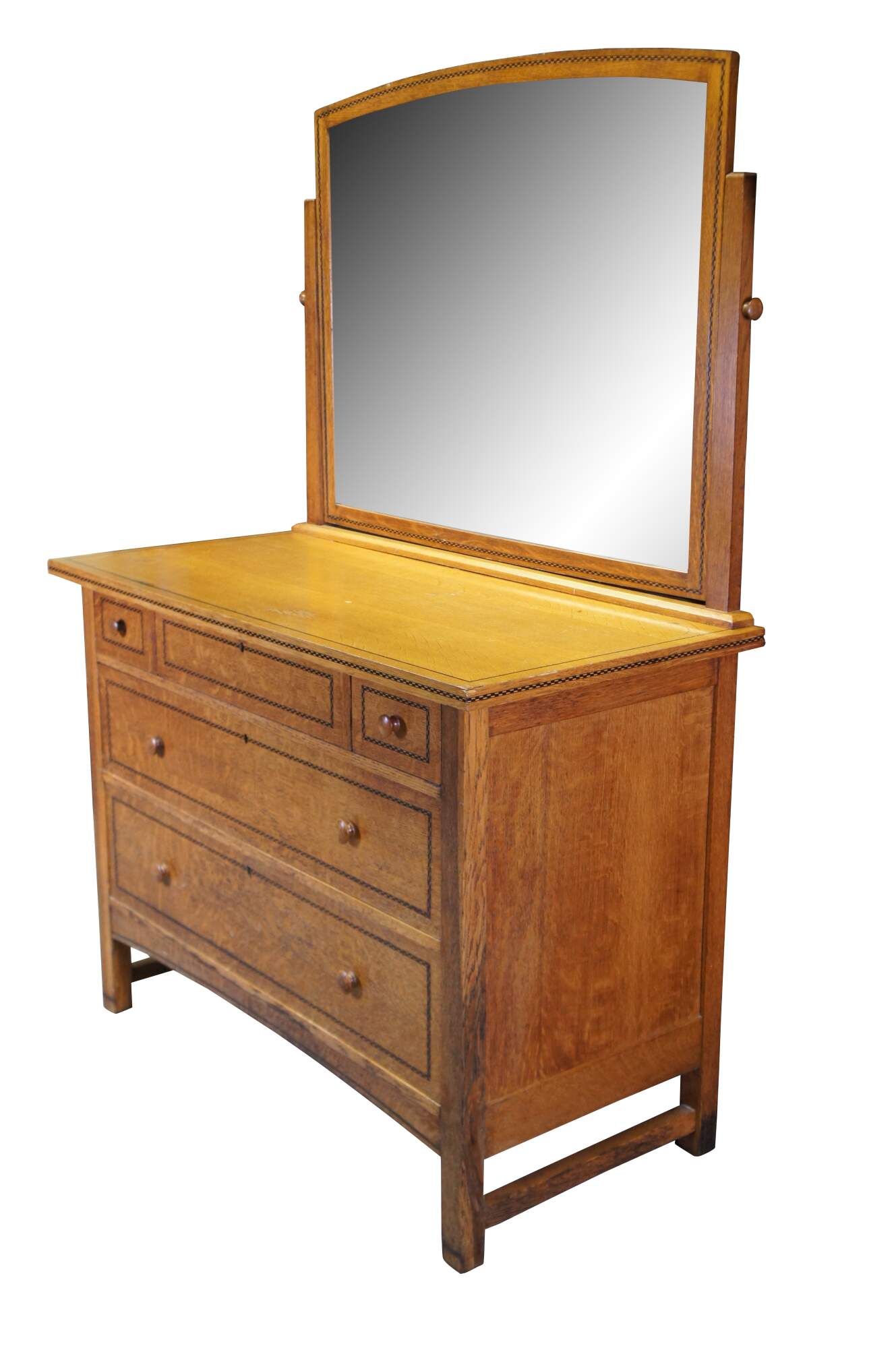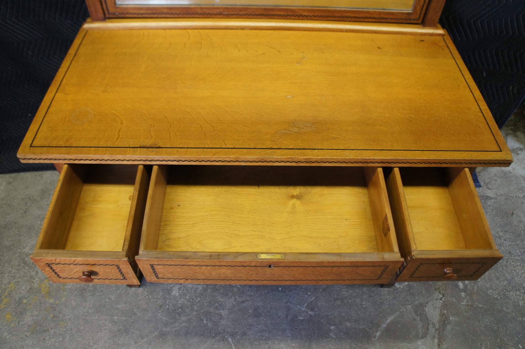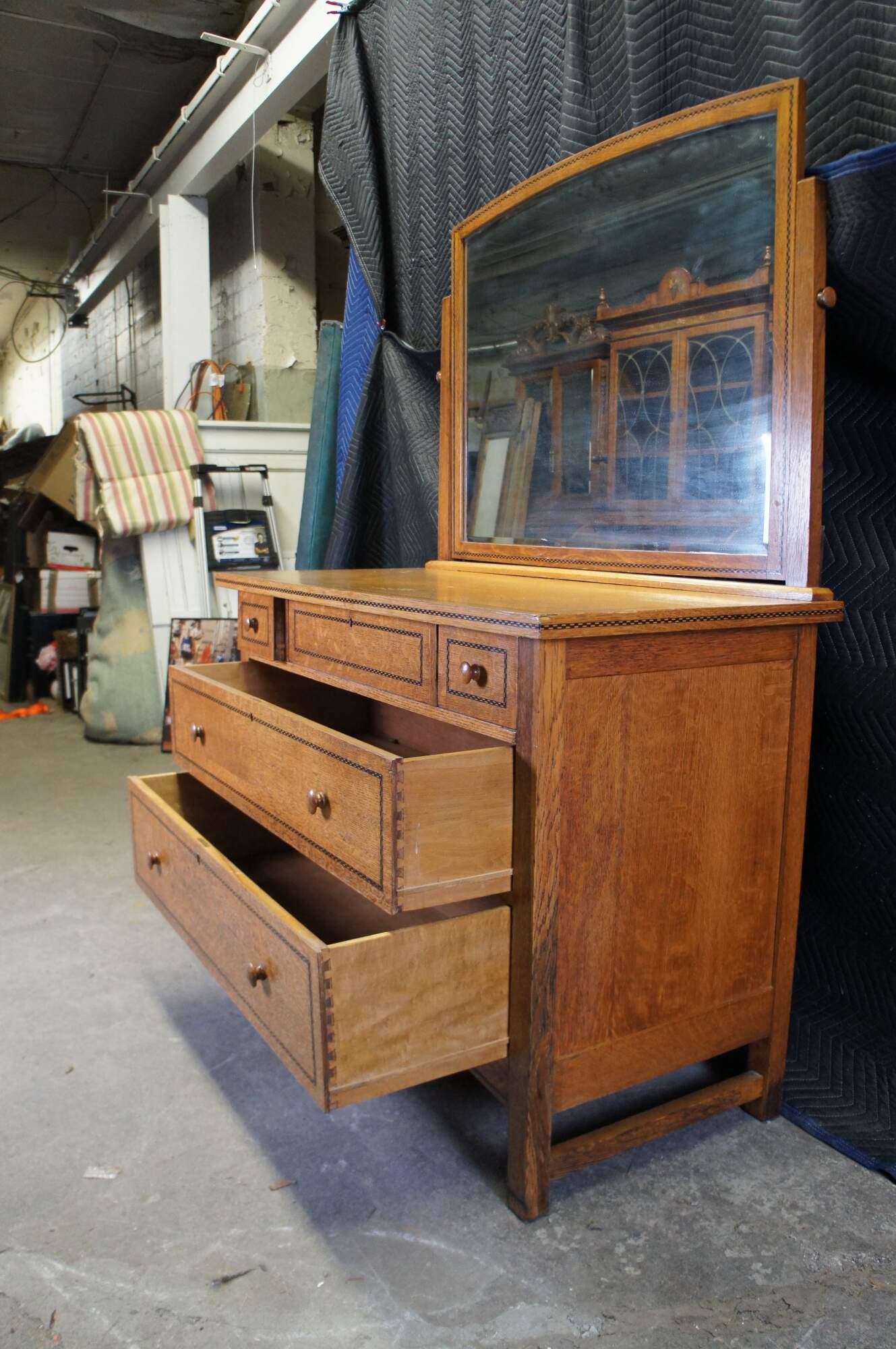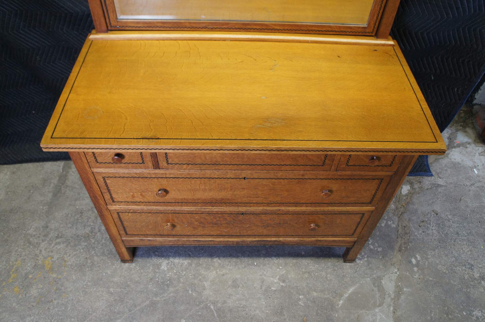 Antique Northern Furniture Company Victorian Era vanity dresser / chest. Made of quartersawn oak featuring a dome top vanity mirror over five drawers, all inlaid with a parquetry checkerboard design. Great for use in the bedroom, or remove as a standalone console / hall chest. (mirror is removable)