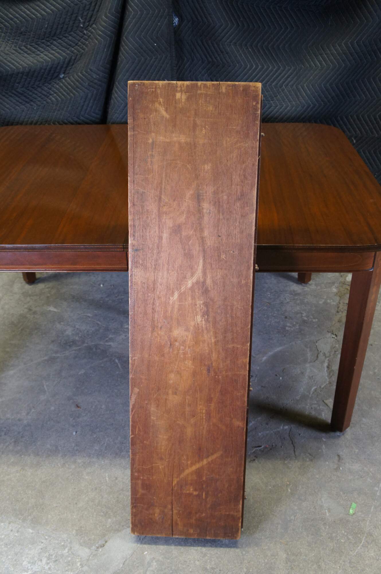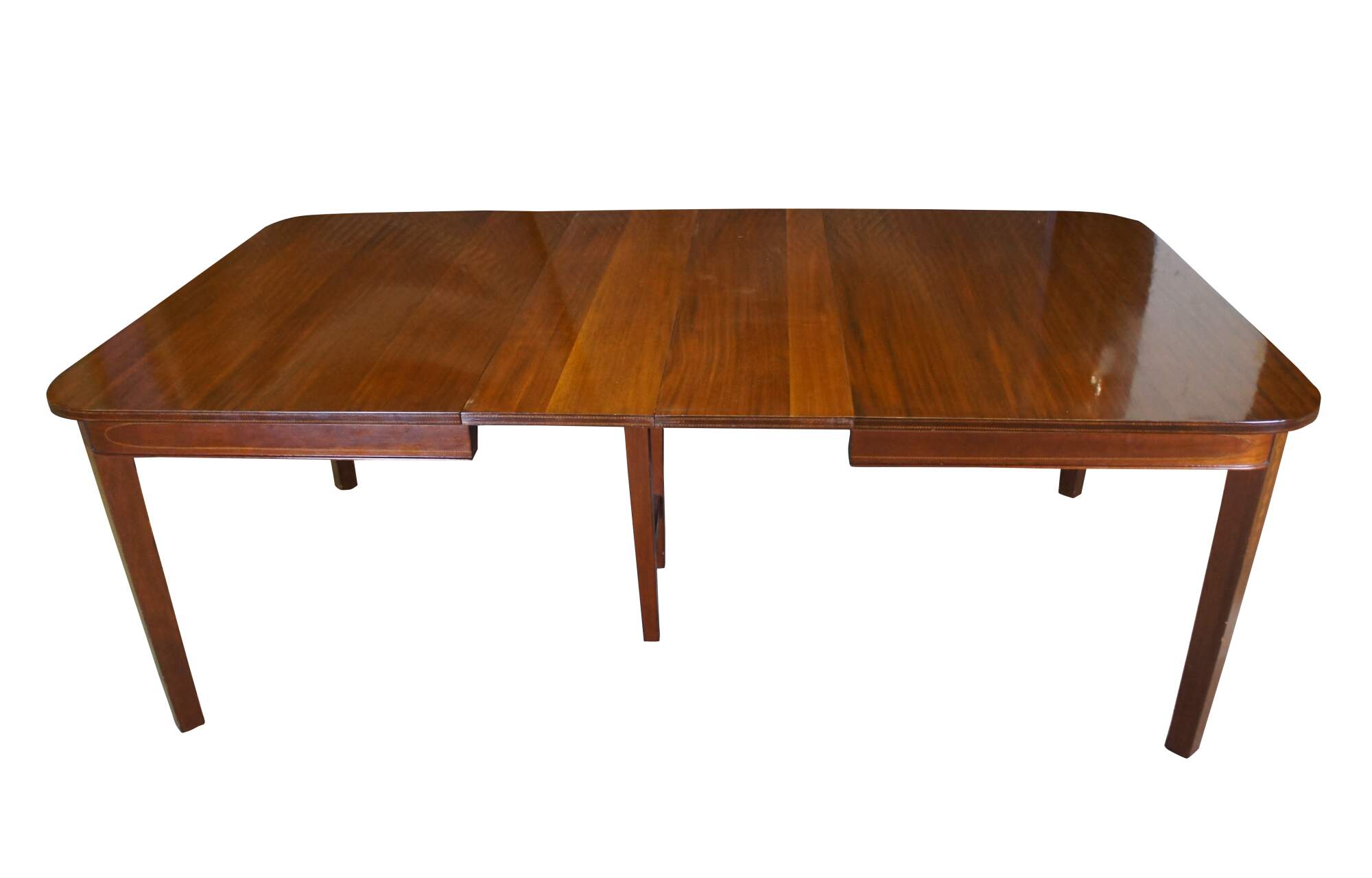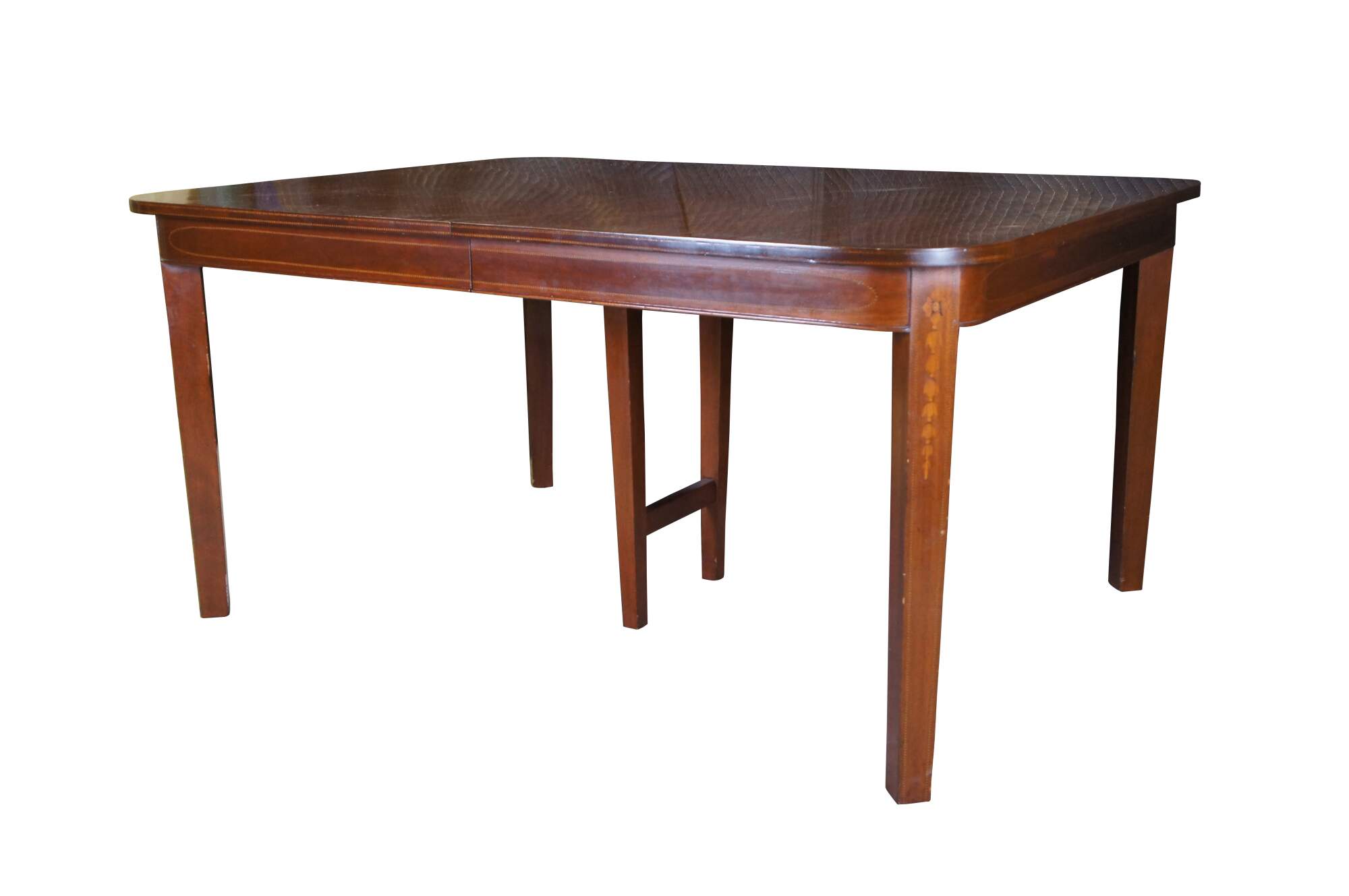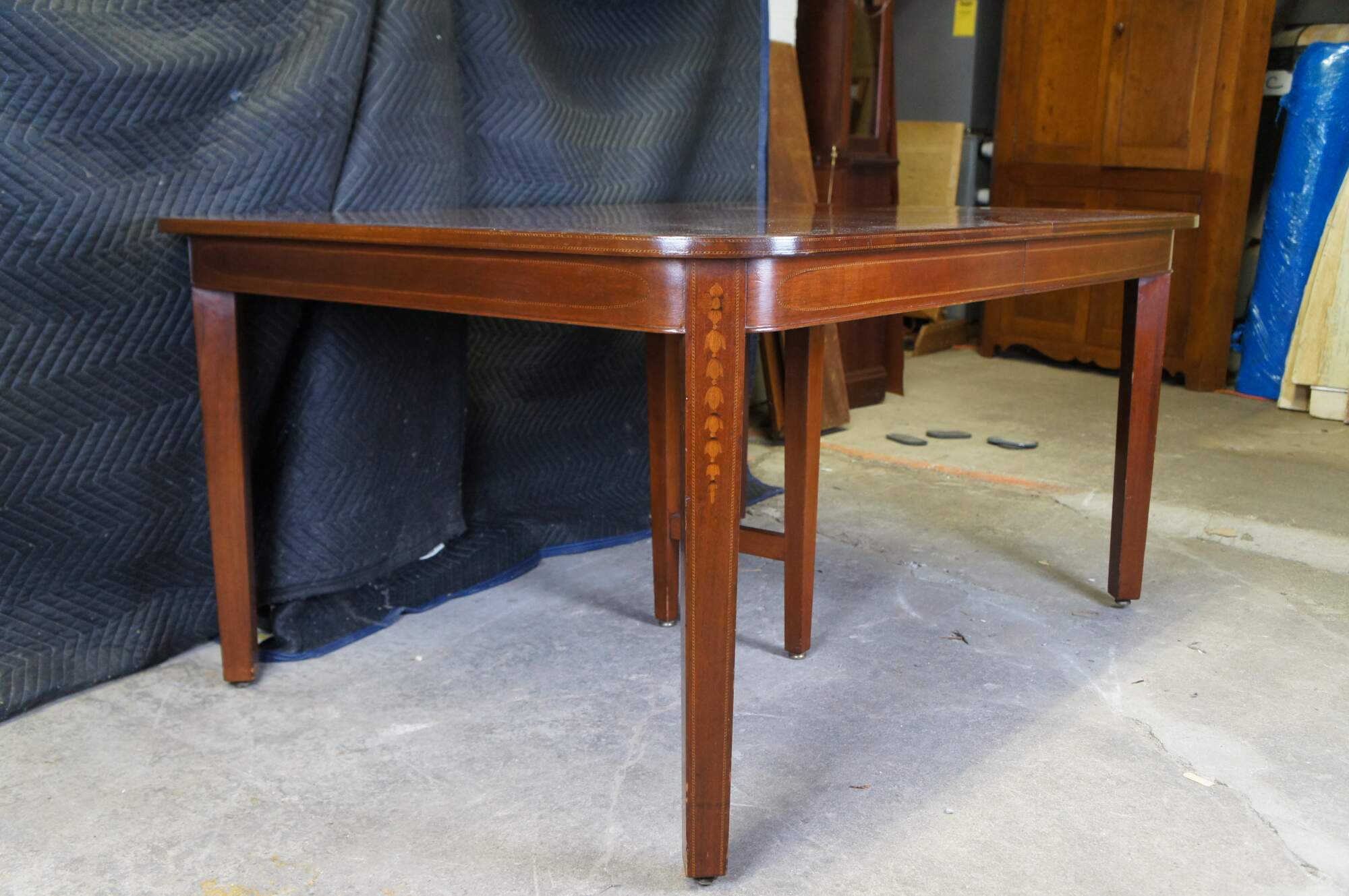 Antique mahogany dining table featuring Sheraton styling with rectangular form, rounded corners, two extending leaves, and decorated with inlaid tulip flowers in an ascending pattern along the legs and striping banding on the table edge and apron. The table is supported by square tapered legs and features a removable center leg that adds extra support when the leaves are in place.
