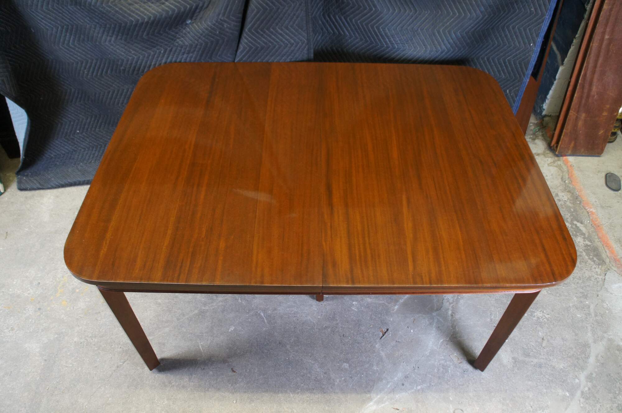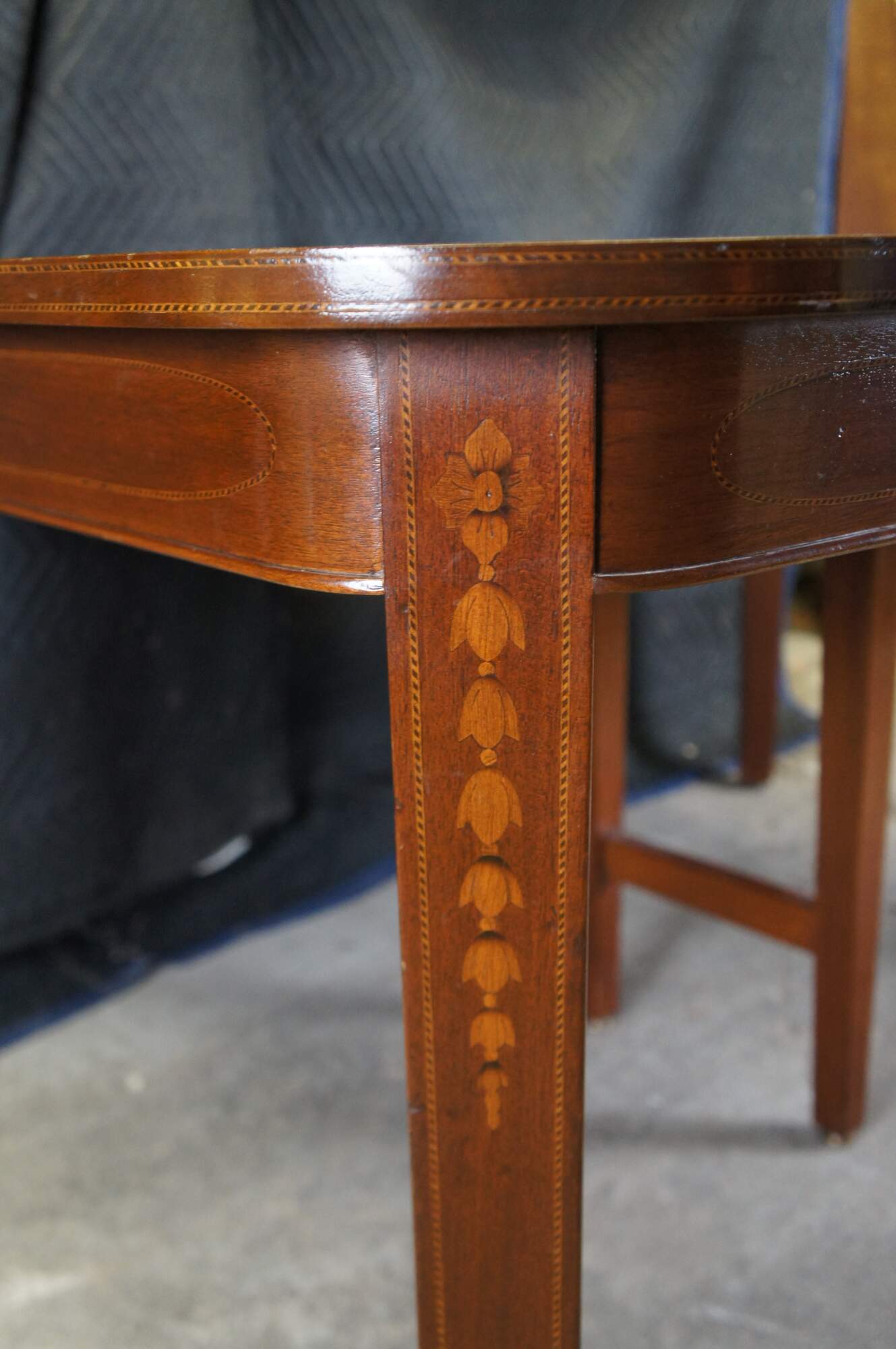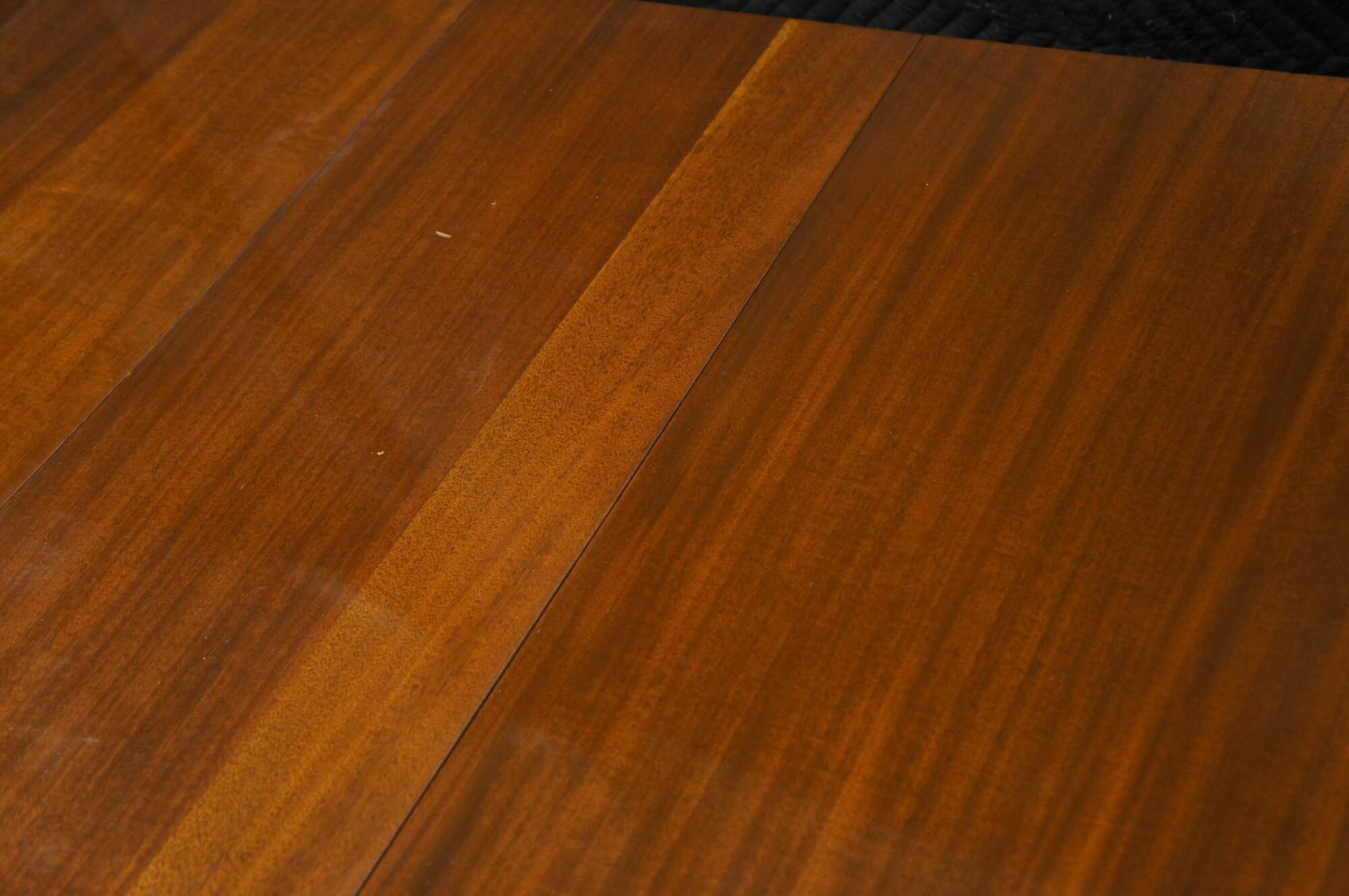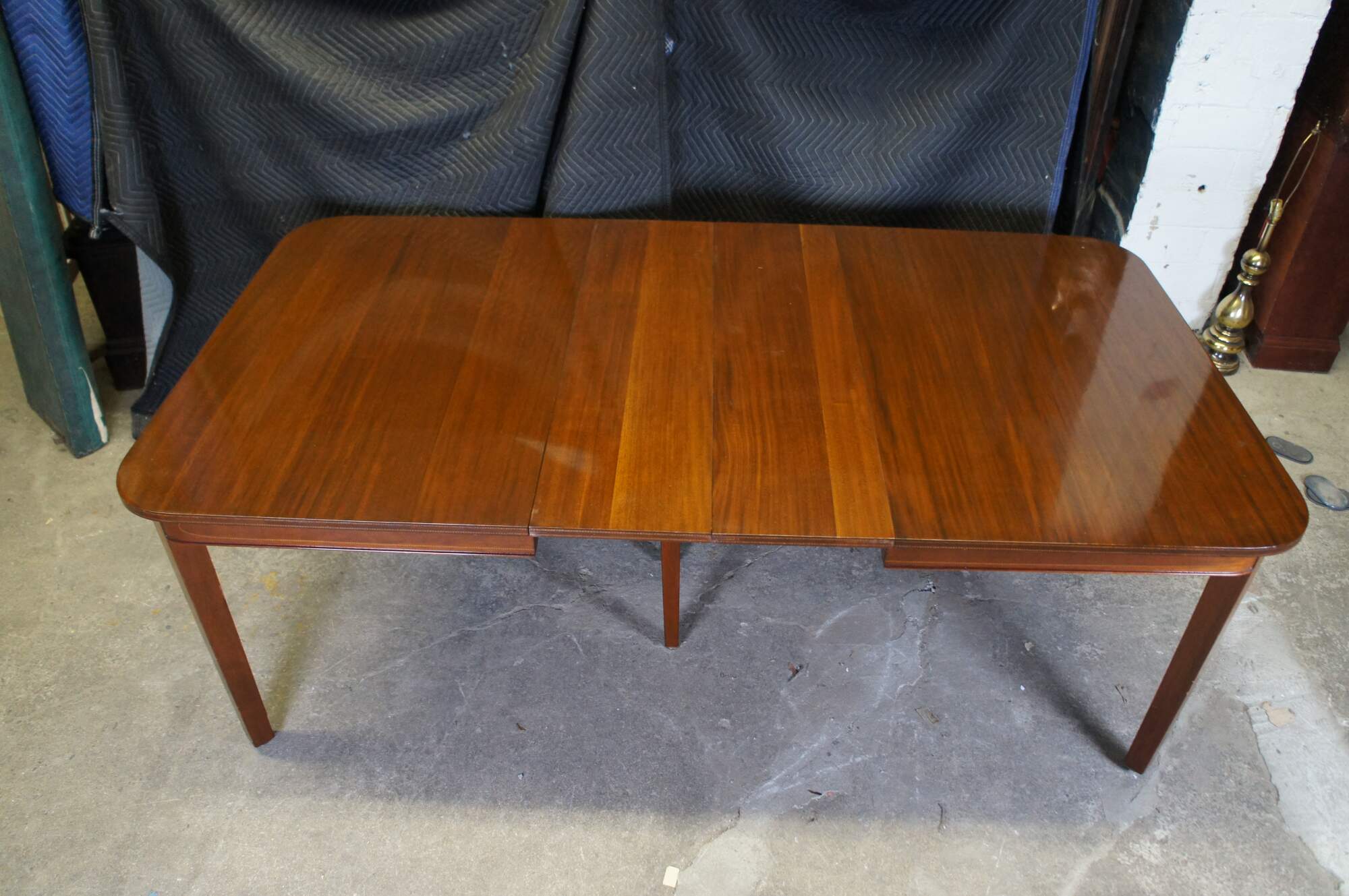 Antique mahogany dining table featuring Sheraton styling with rectangular form, rounded corners, two extending leaves, and decorated with inlaid tulip flowers in an ascending pattern along the legs and striping banding on the table edge and apron. The table is supported by square tapered legs and features a removable center leg that adds extra support when the leaves are in place.