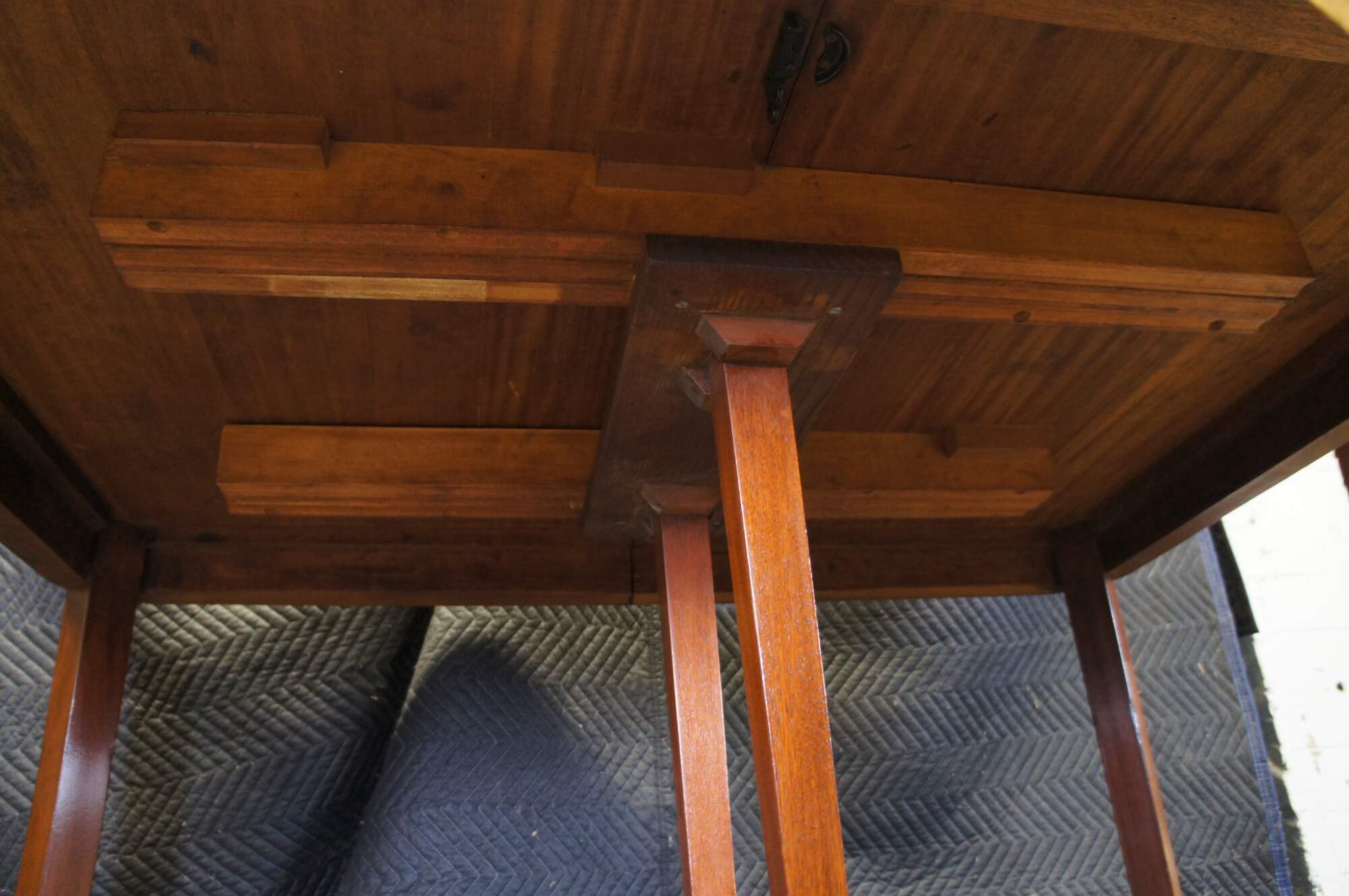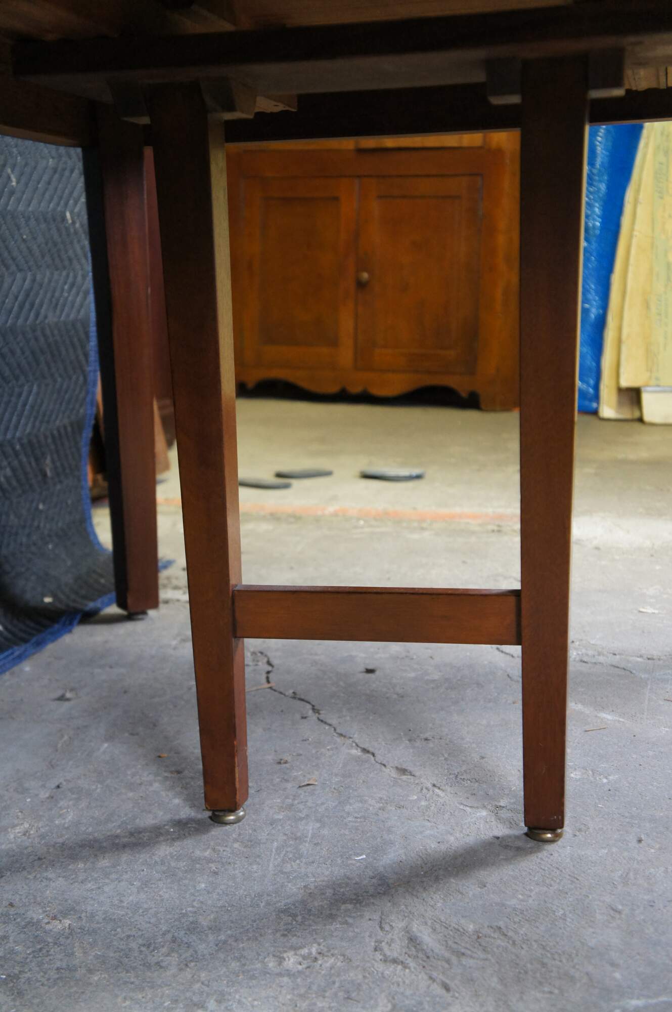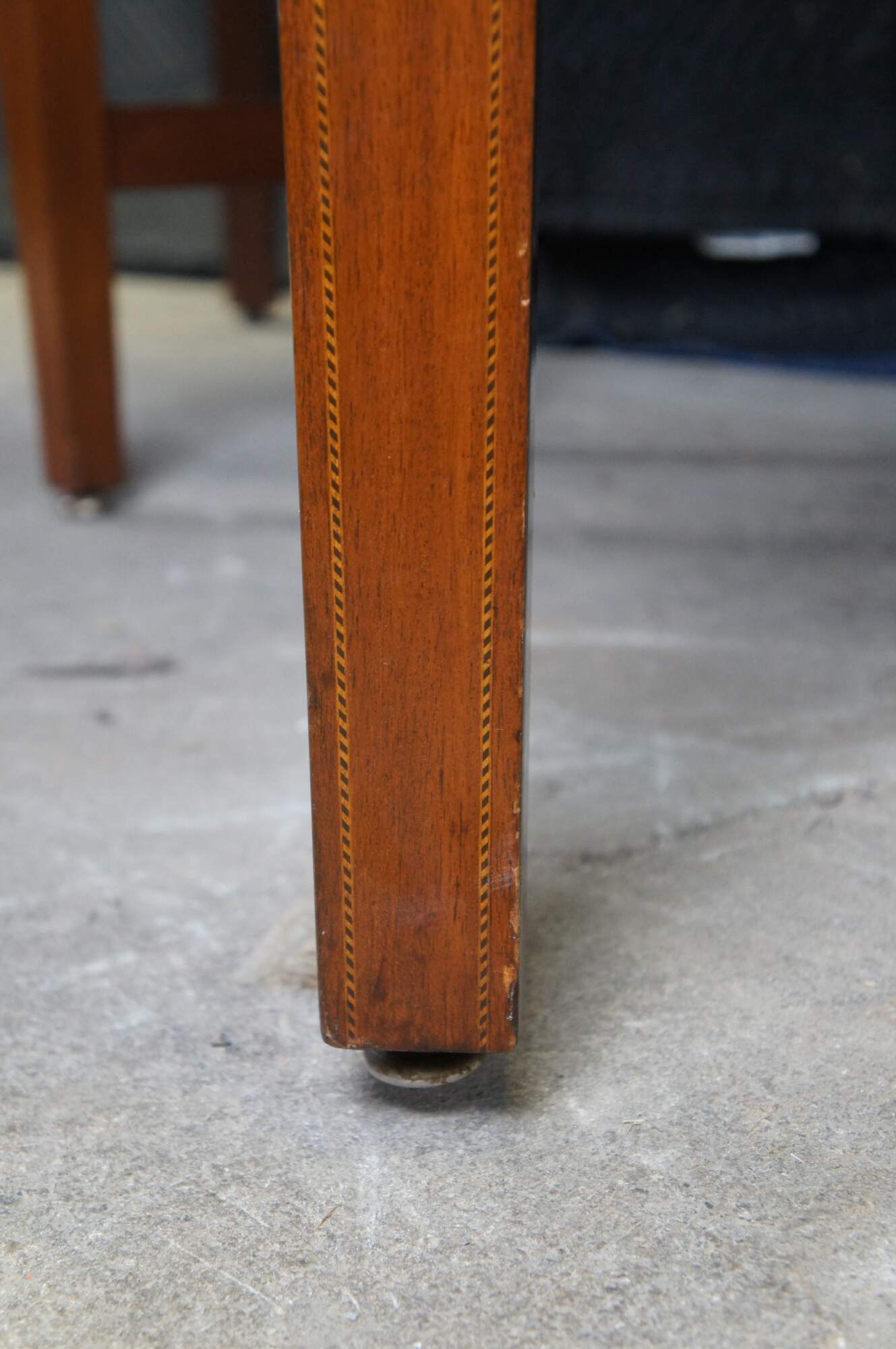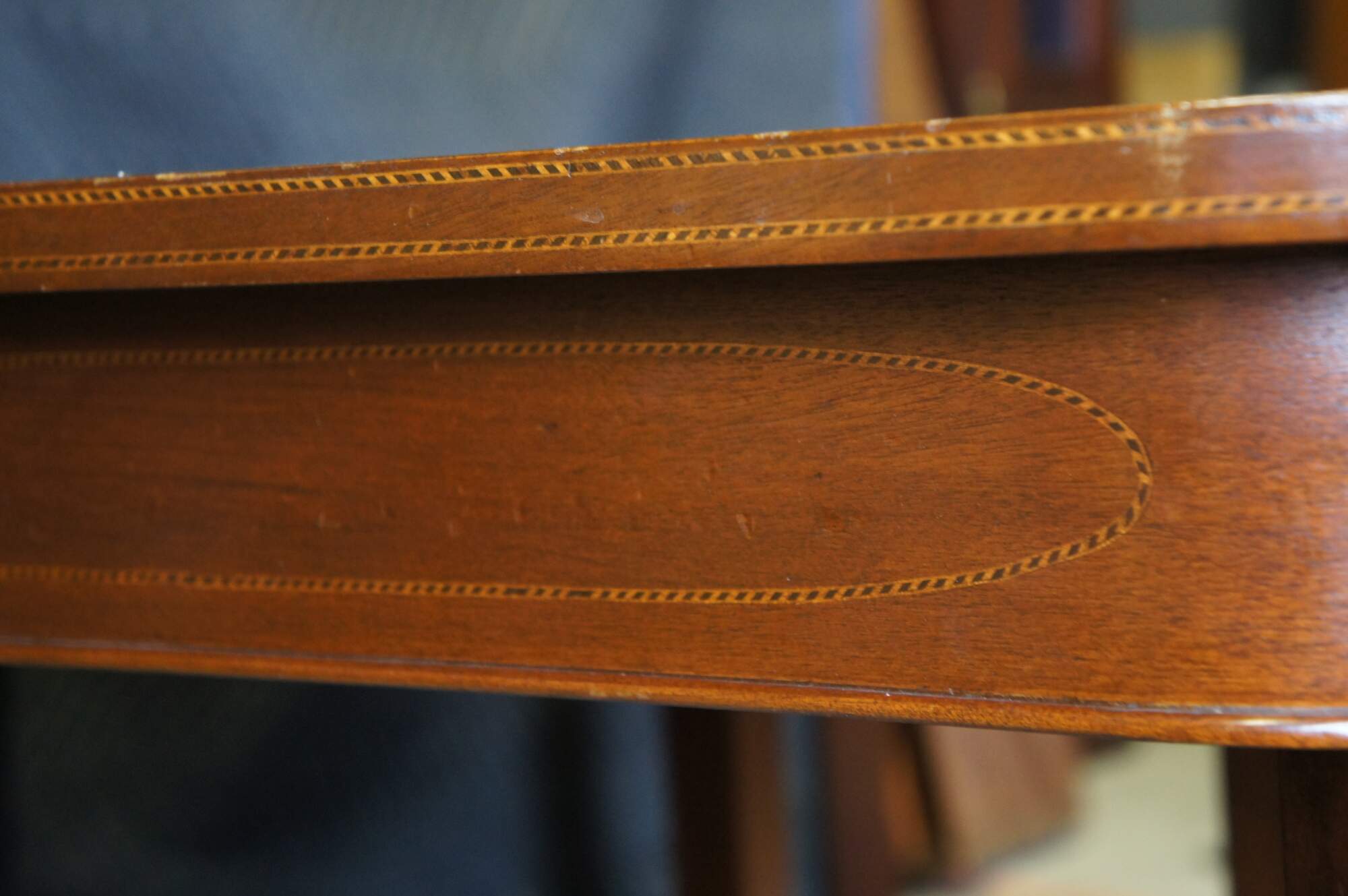 Antique mahogany dining table featuring Sheraton styling with rectangular form, rounded corners, two extending leaves, and decorated with inlaid tulip flowers in an ascending pattern along the legs and striping banding on the table edge and apron. The table is supported by square tapered legs and features a removable center leg that adds extra support when the leaves are in place.