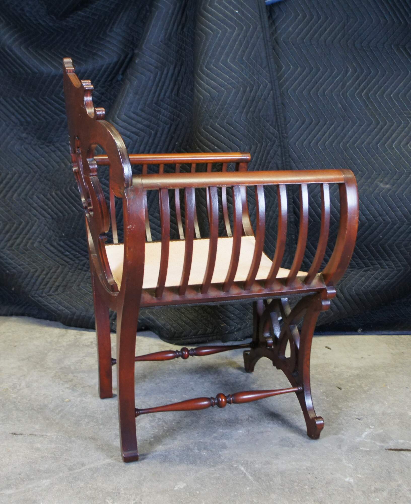 Antique Spanish Revival mahogany curule / savarinola style / throne / saddle seat arm chair featuring a pierced and slatted design with acanthus accents.