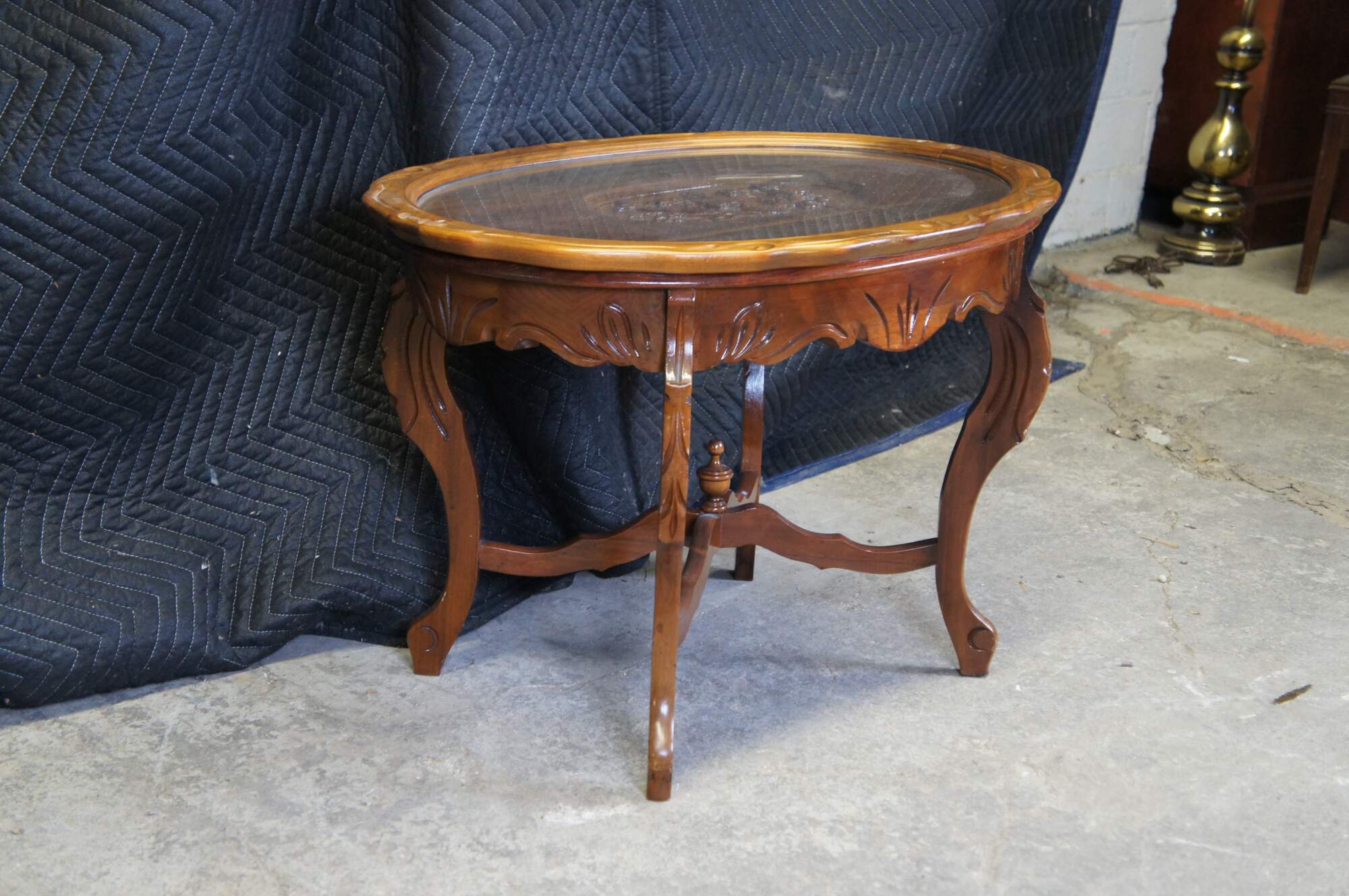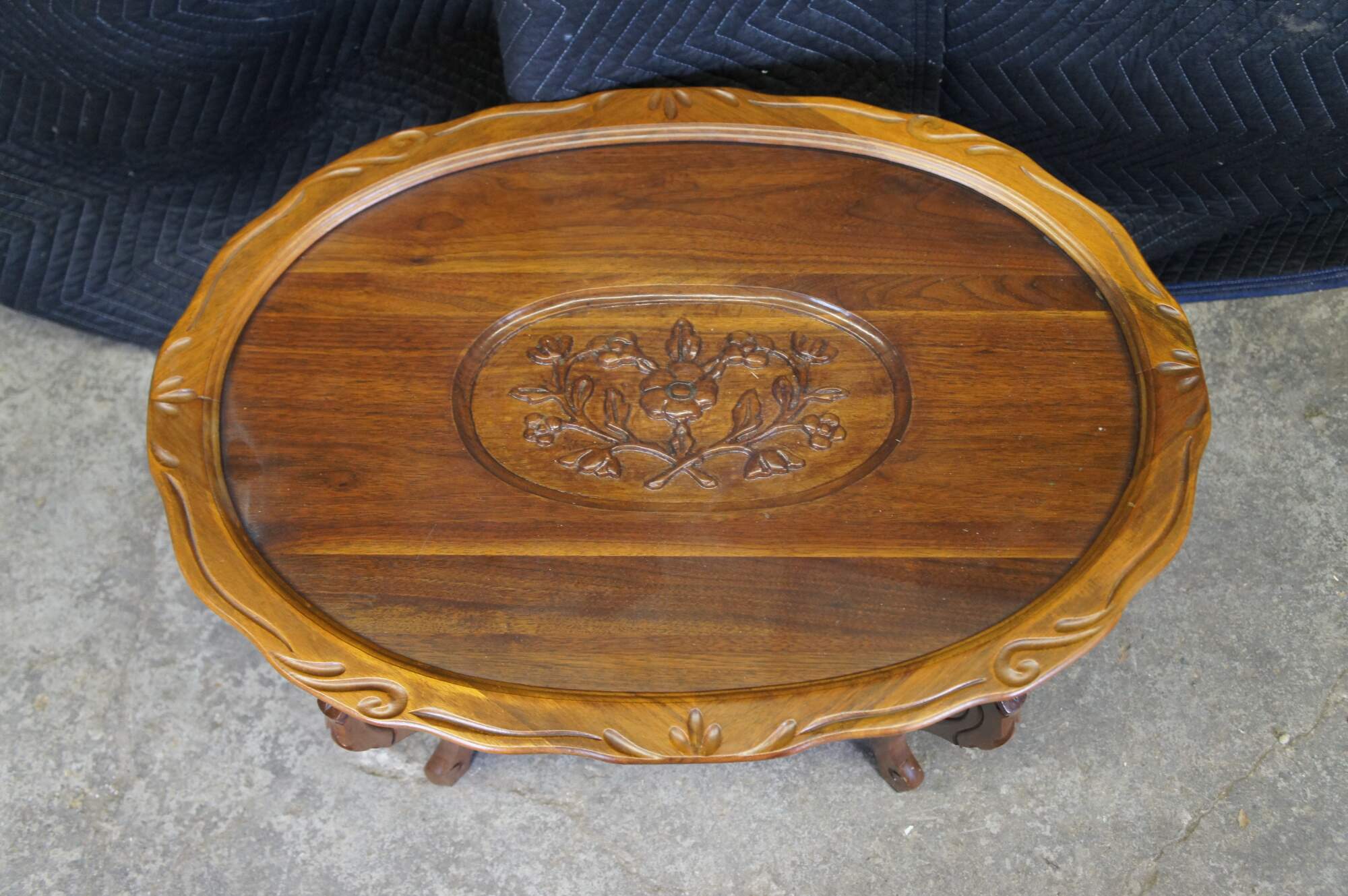 Antique American walnut carved tea coffee cocktail table featuring a scalloped oval butler tray that sits over a high relief carved floral design. The table is supported by carved and scrolled legs connected by X stretcher with trophy finial.
