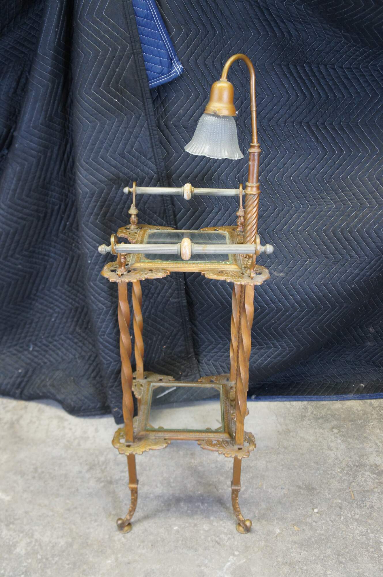 Antique Art Nouveau style parlor floor lamp / telephone / plant stand / side table featuring a two tier design with barley twisted columns supporting a Tiffany style lamp that illuminates through the two glass shelves. Ornate handles adorn the upper surface along with stone inserts and finial accents.