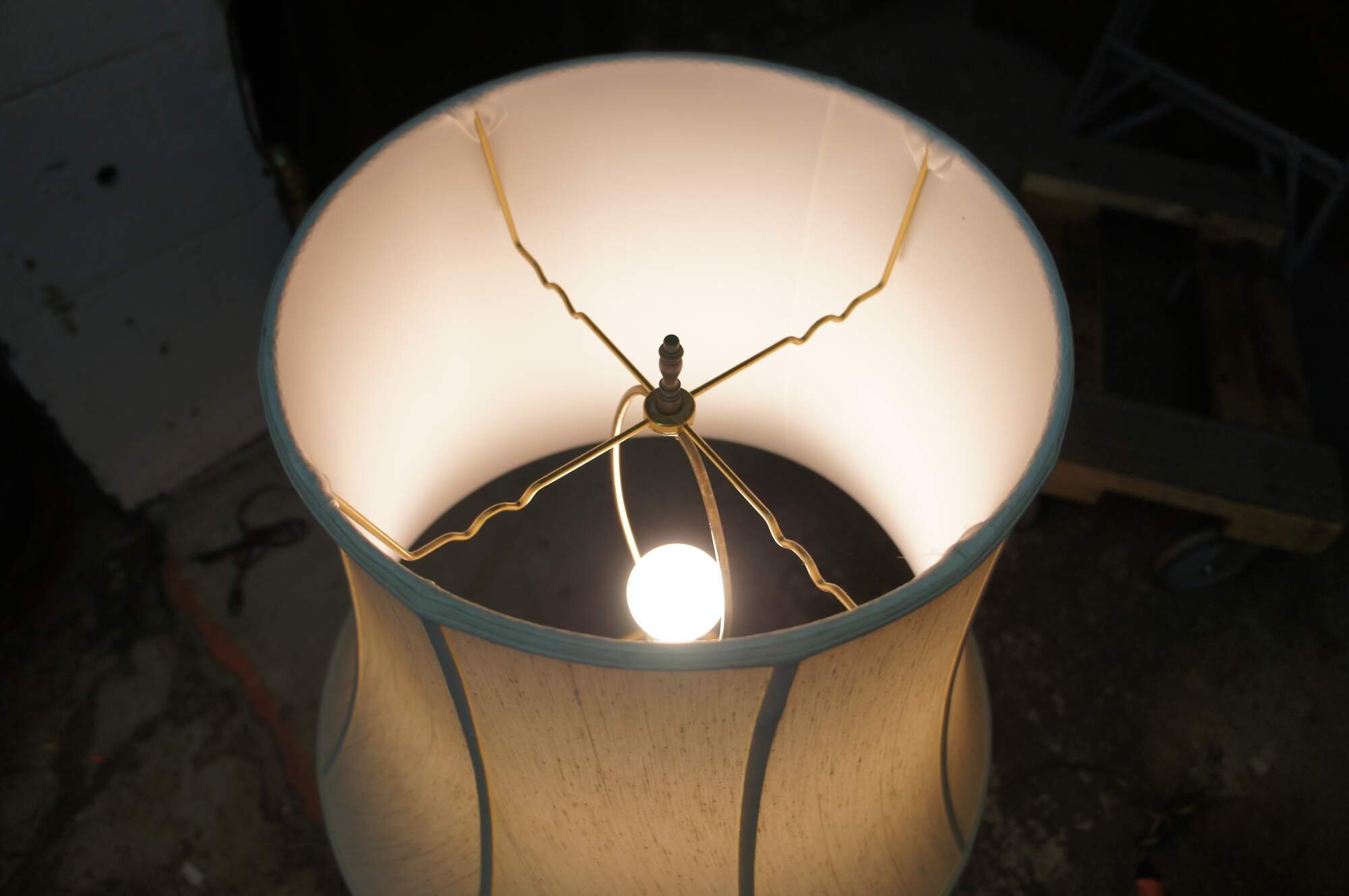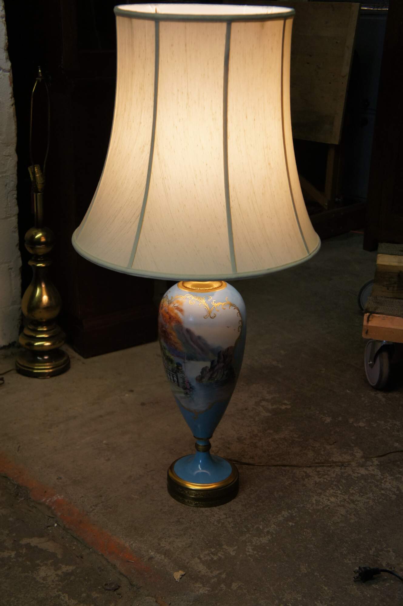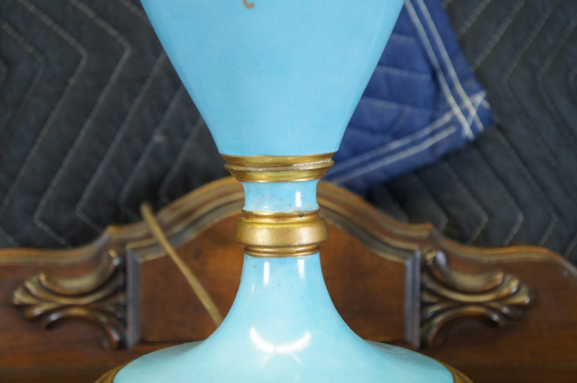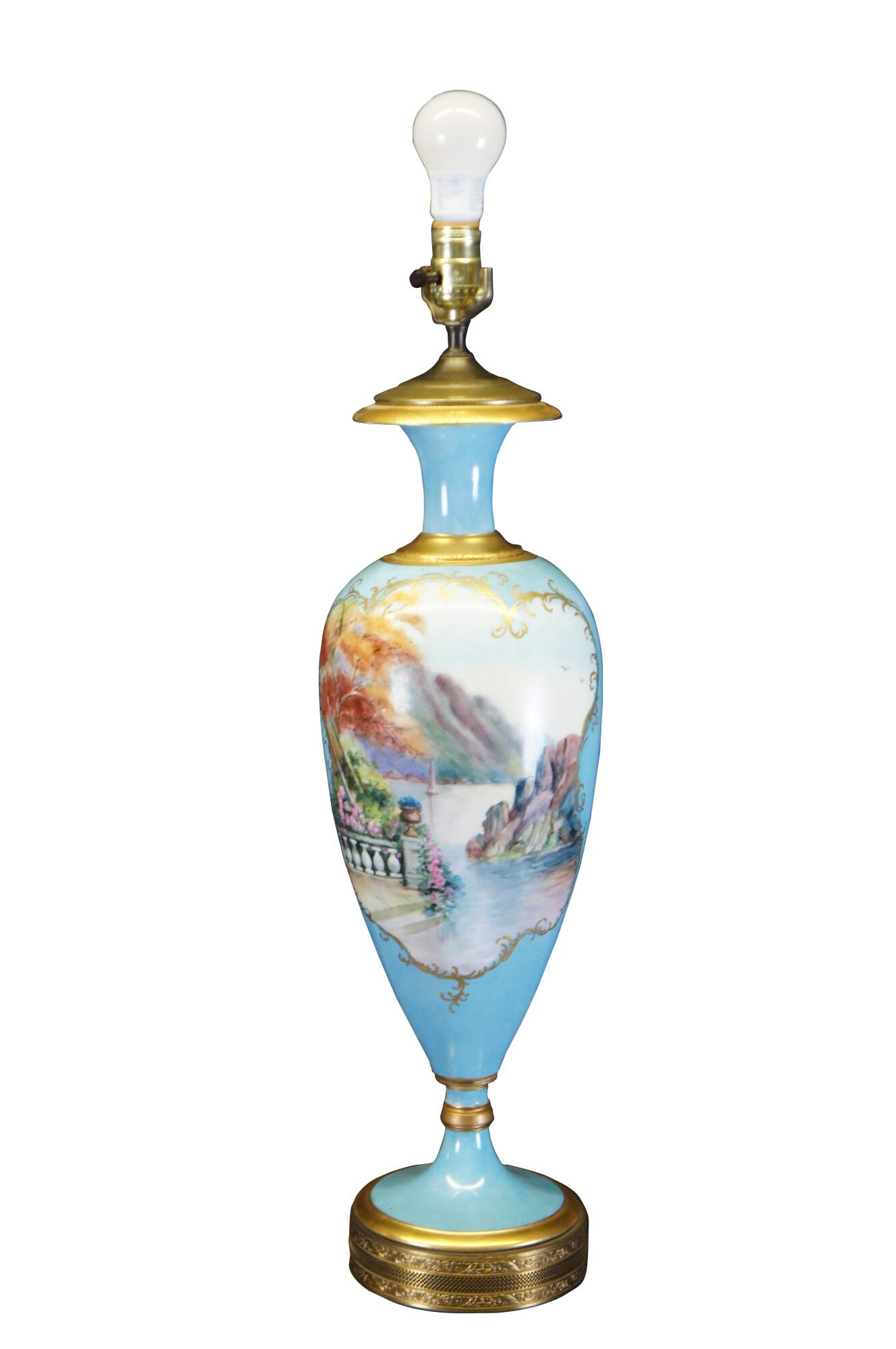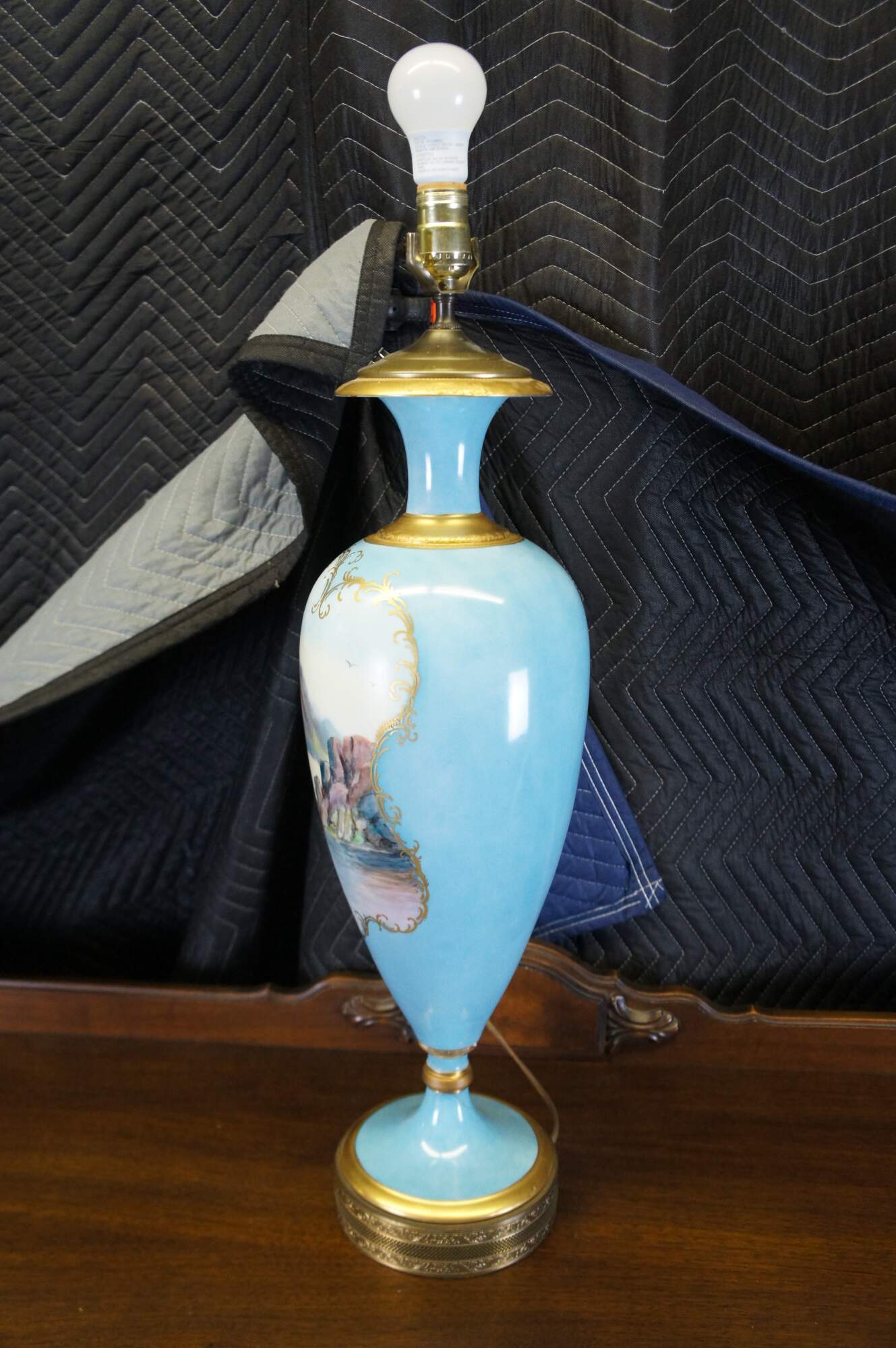 A very large antique French Sevres style turquoise trophy vase urn lamp. Made of porcelain featuring a Neoclassical motif with reticulated gilt brass base and painted garden / veranda view of a cliffside bay.
