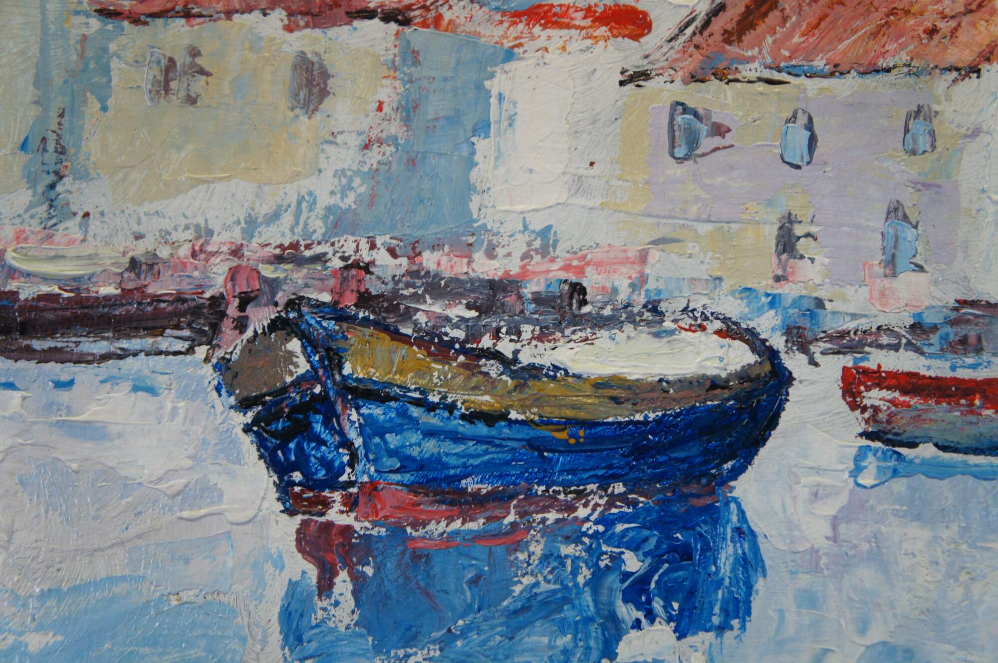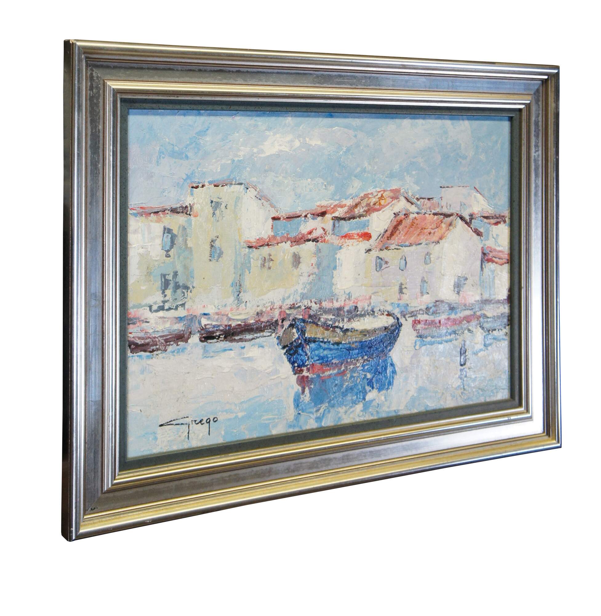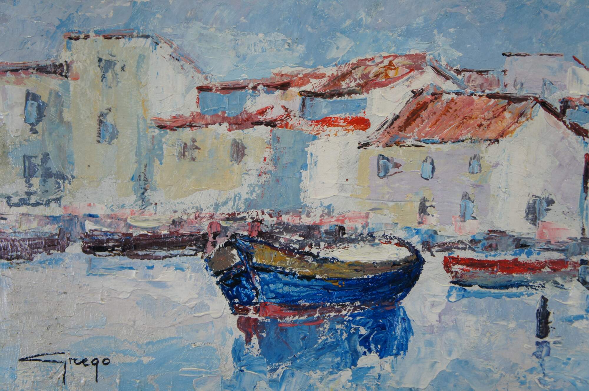 Vintage Impressionist nautical maritime seascape / cityscape oil painting on canvas by Grego. It features a port view of sailboats against a Mediterranean harbor .