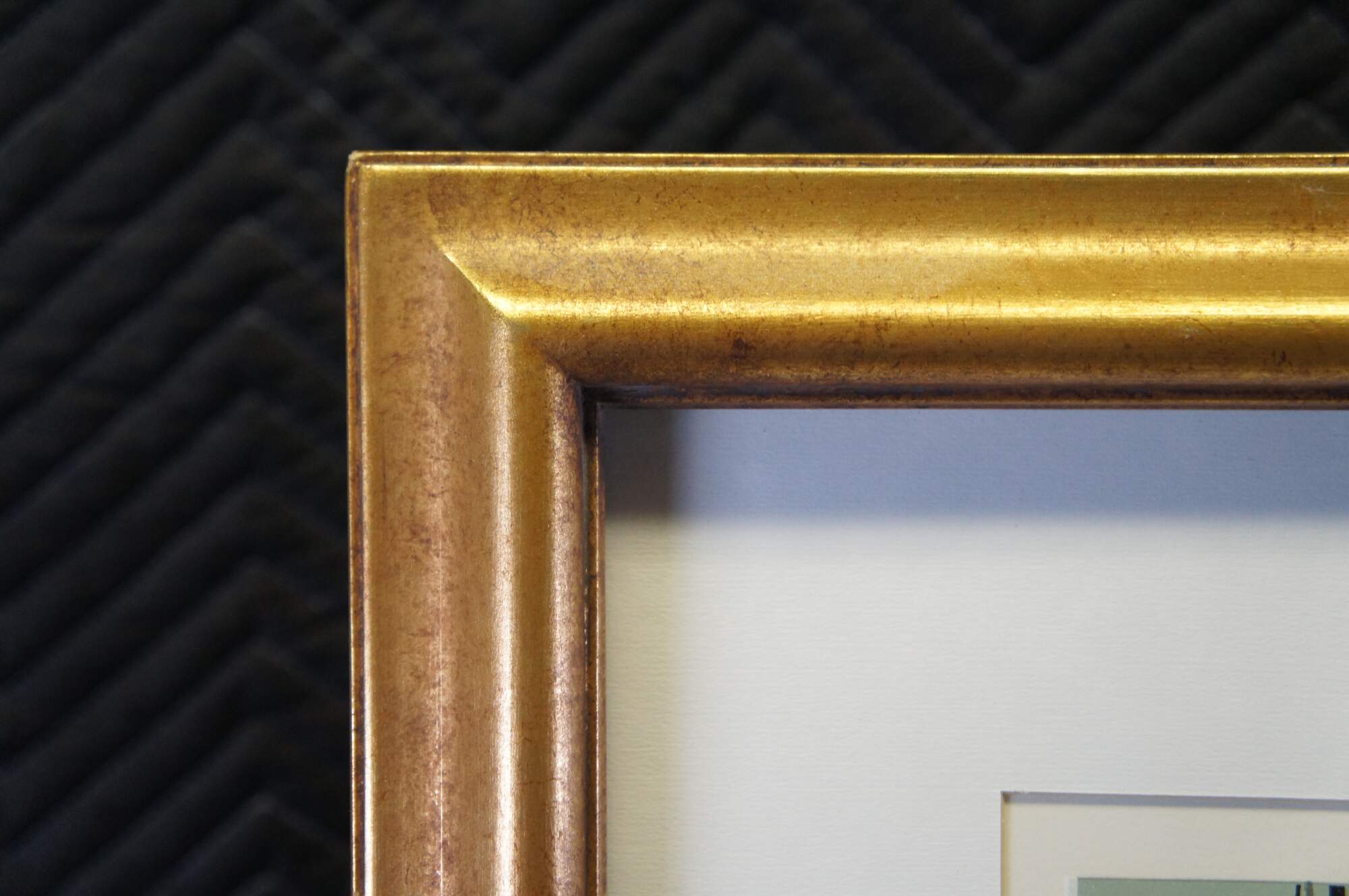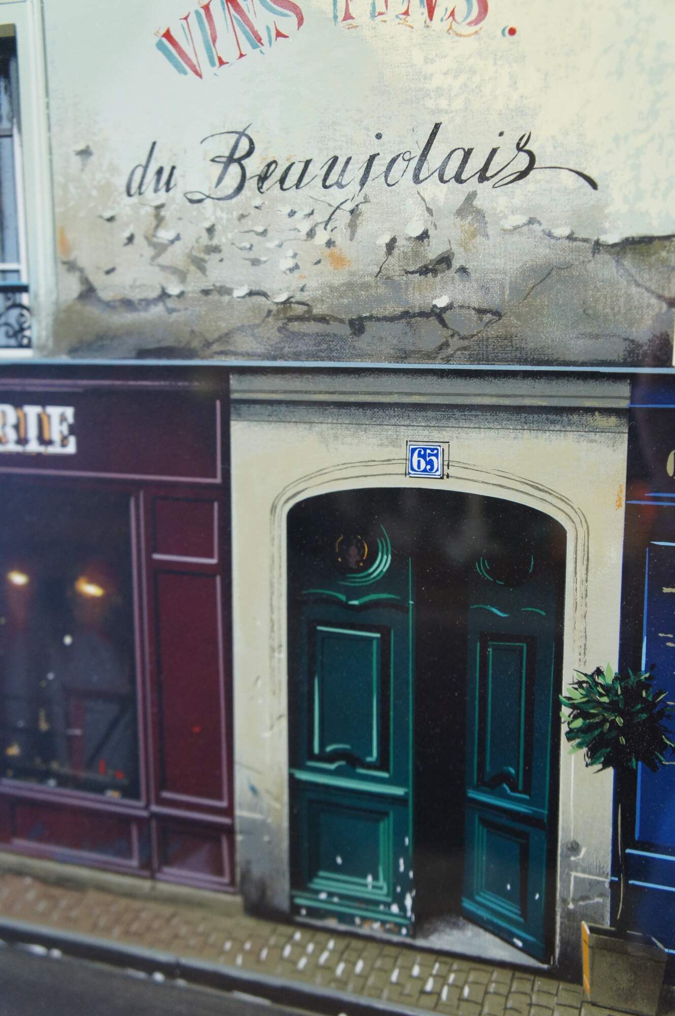 Vintage Thomas Pradzynski Twilight on Rue de Madiran serigraph print, circa 1992. It features a cityscape / streetscape view of the Rue de Madiran in Paris France. Vins Fins du Beaujolais, Boulangerie, Salon de Che. Museum framed in gold.