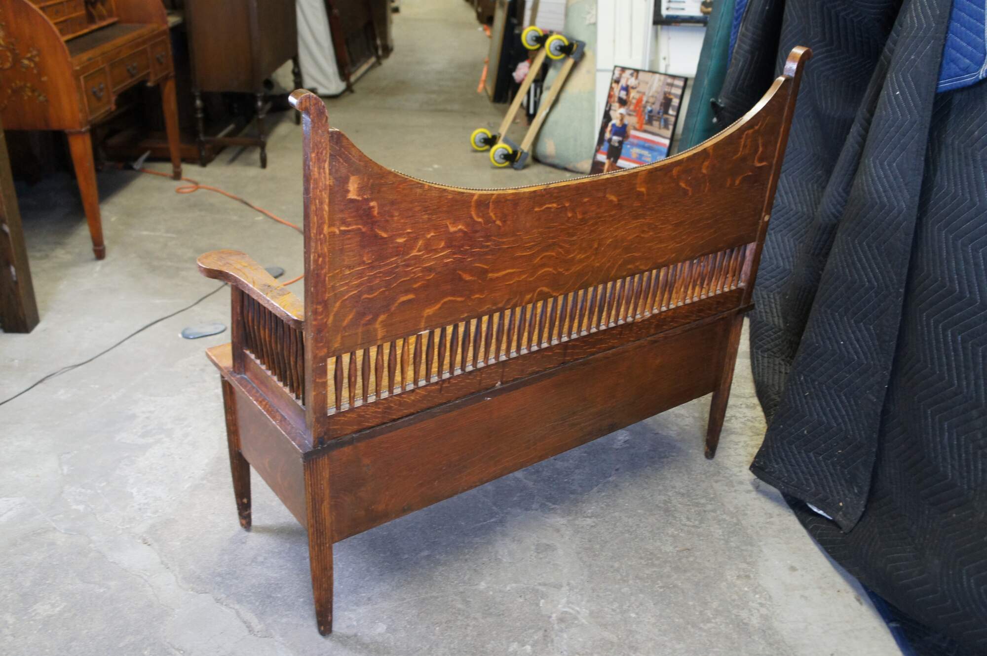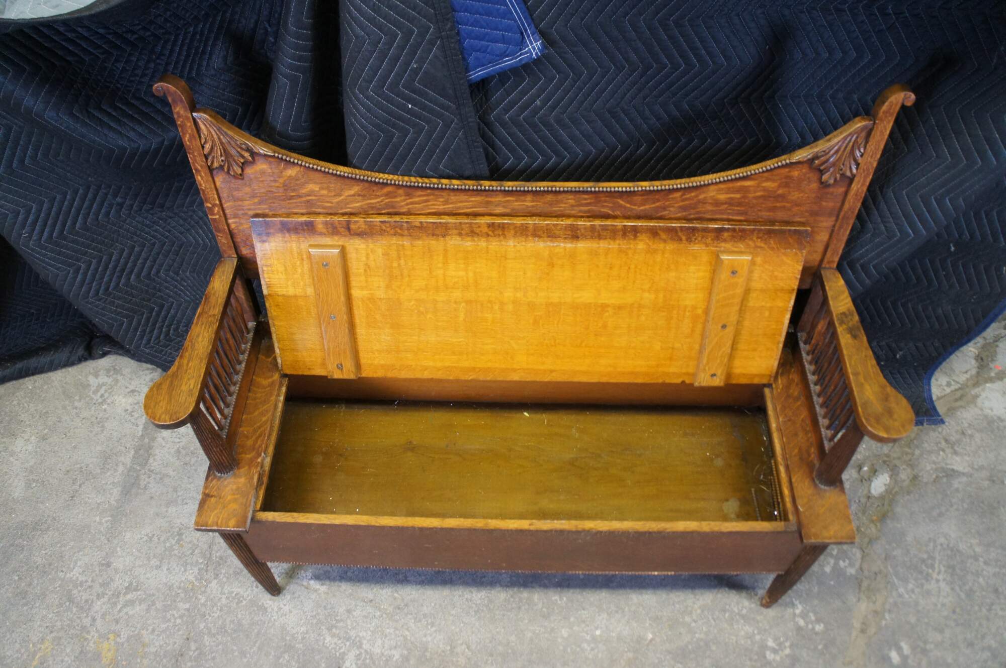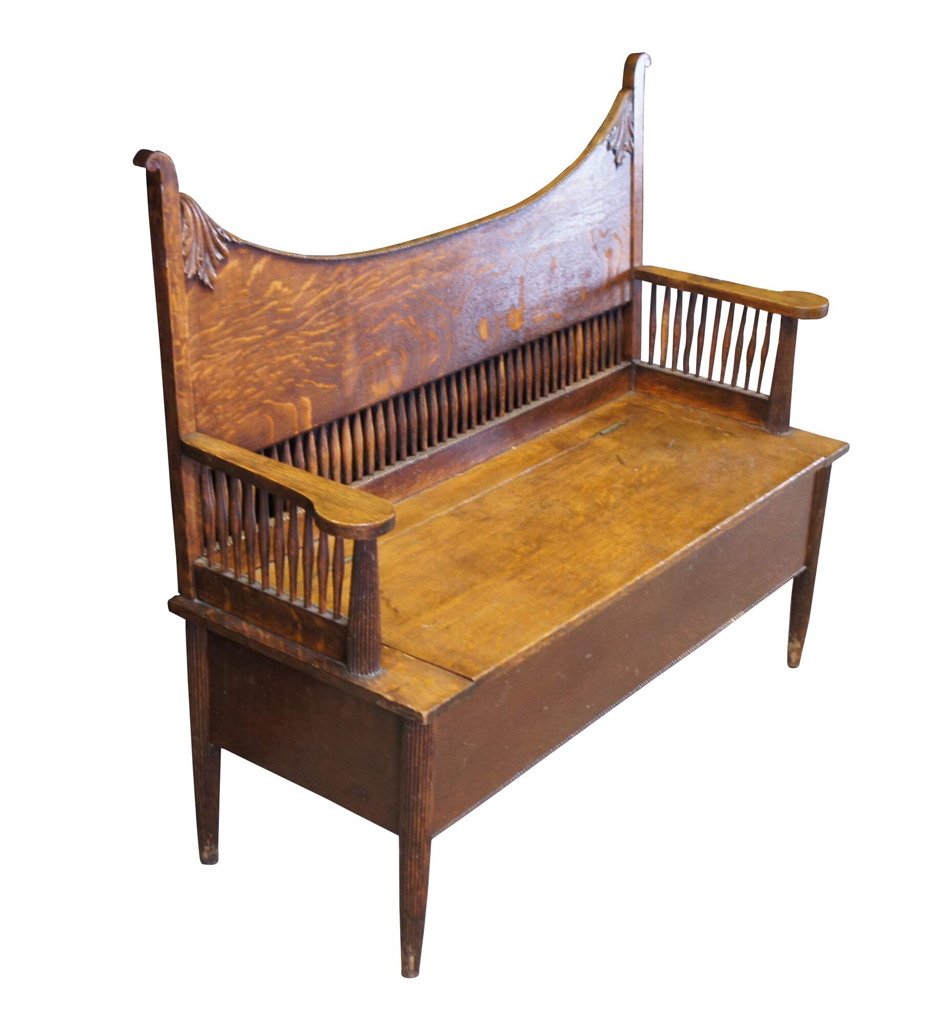 Antique quartersawn oak storage trunk / hall bench / settee featuring mission styling with downswept and slatted design accented with turned spindels, fluted supports, beaded trim and acanthus accents.
