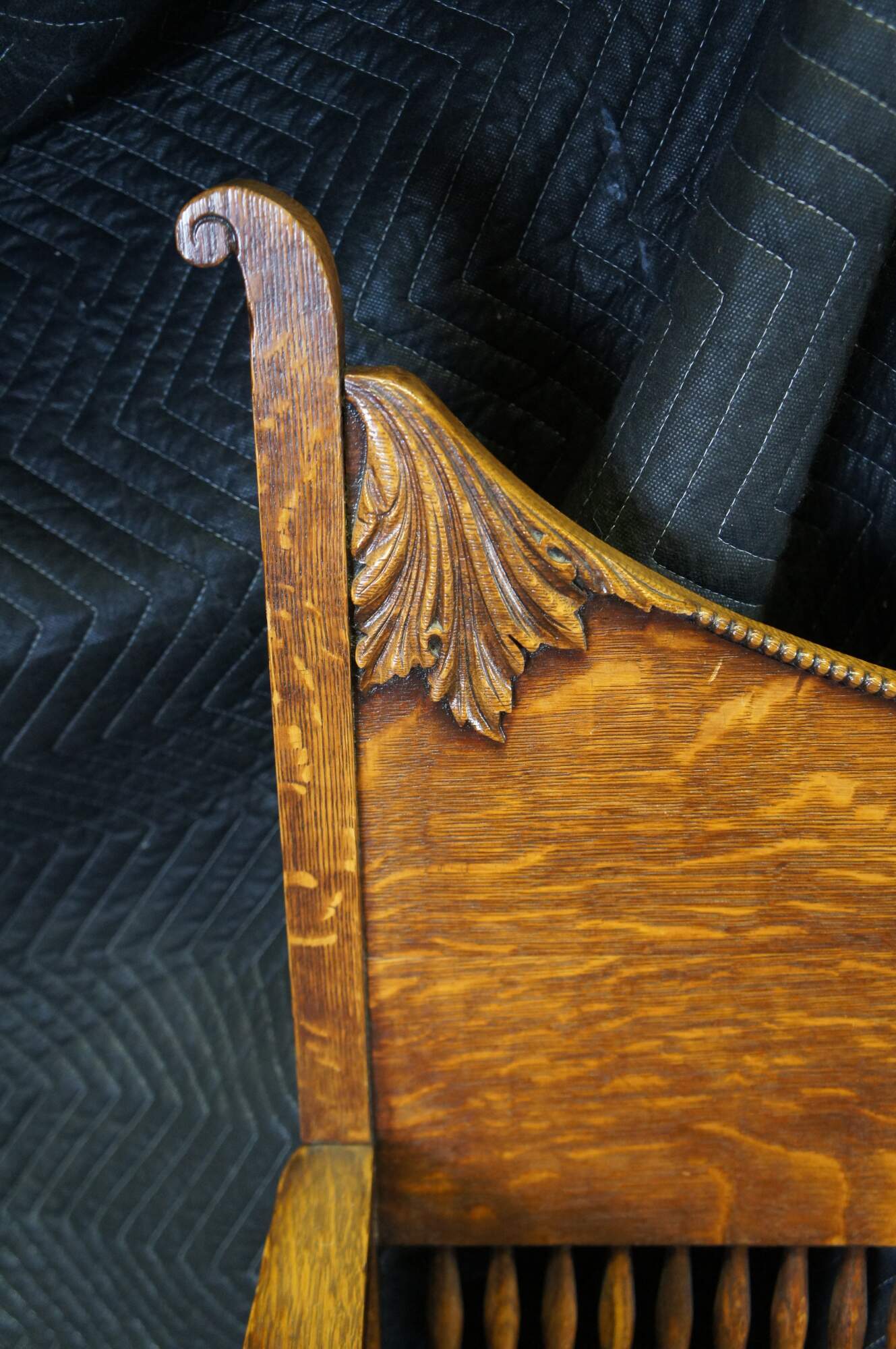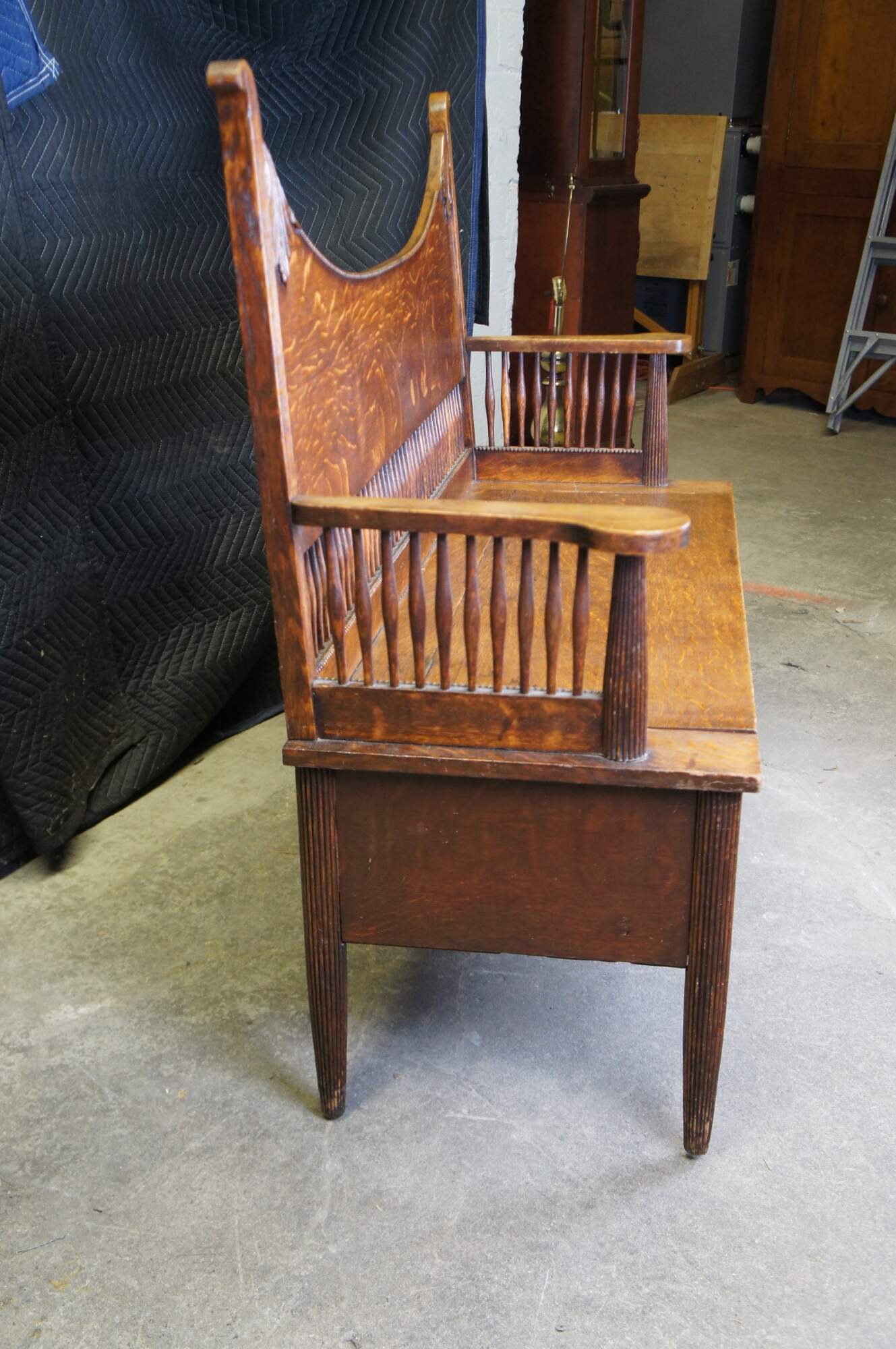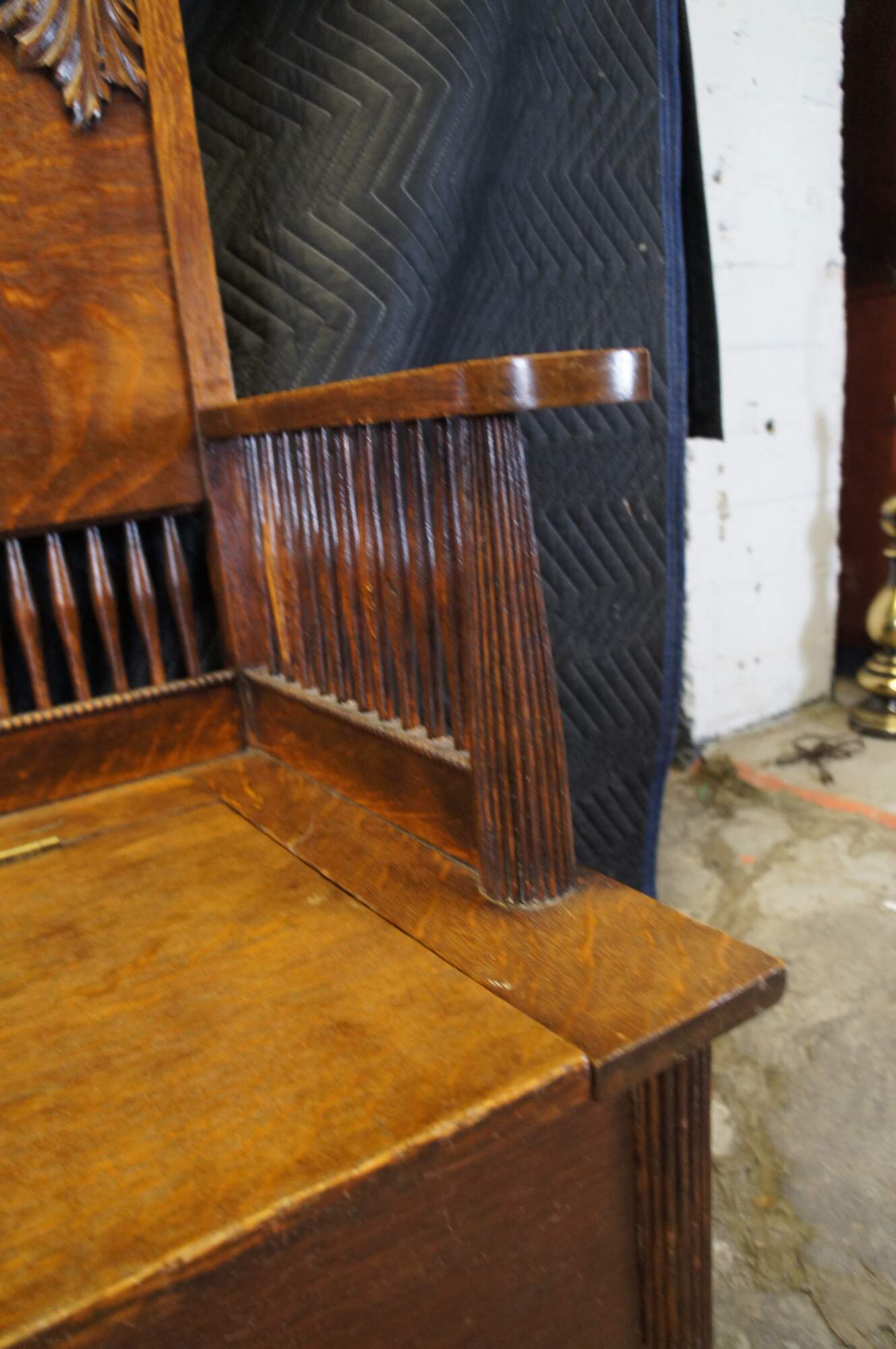 Antique quartersawn oak storage trunk / hall bench / settee featuring mission styling with downswept and slatted design accented with turned spindels, fluted supports, beaded trim and acanthus accents.