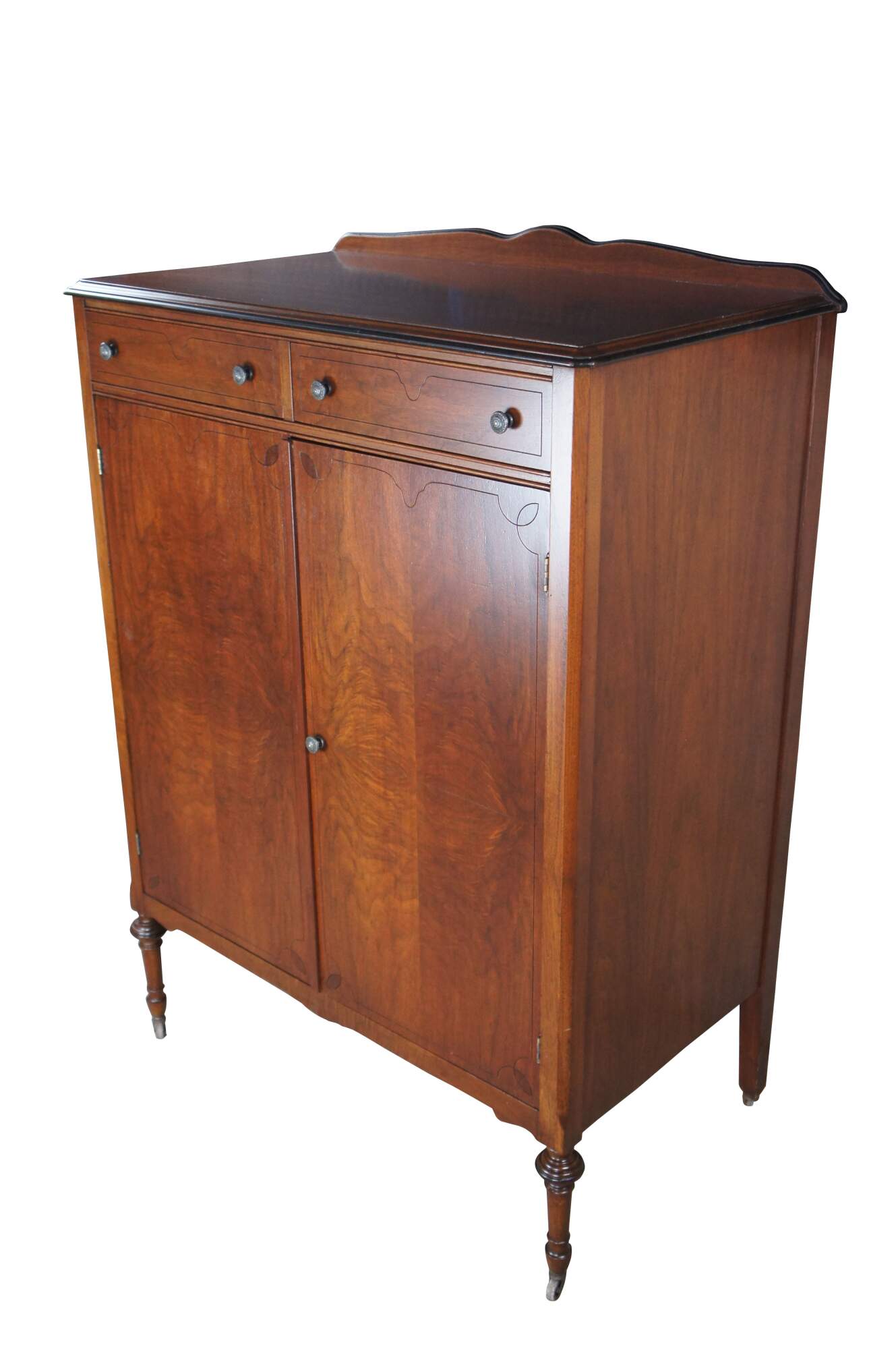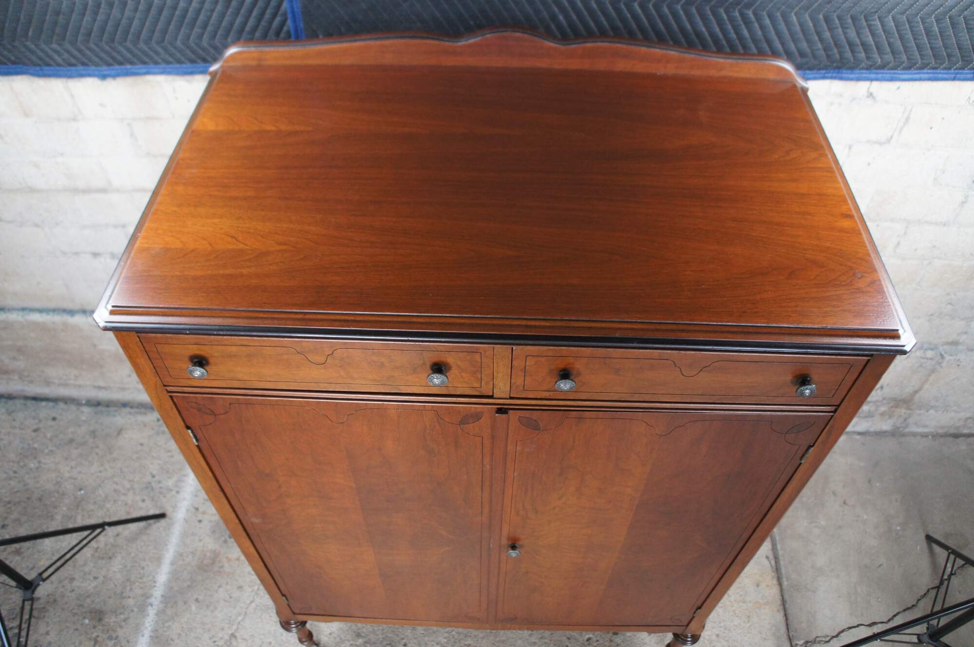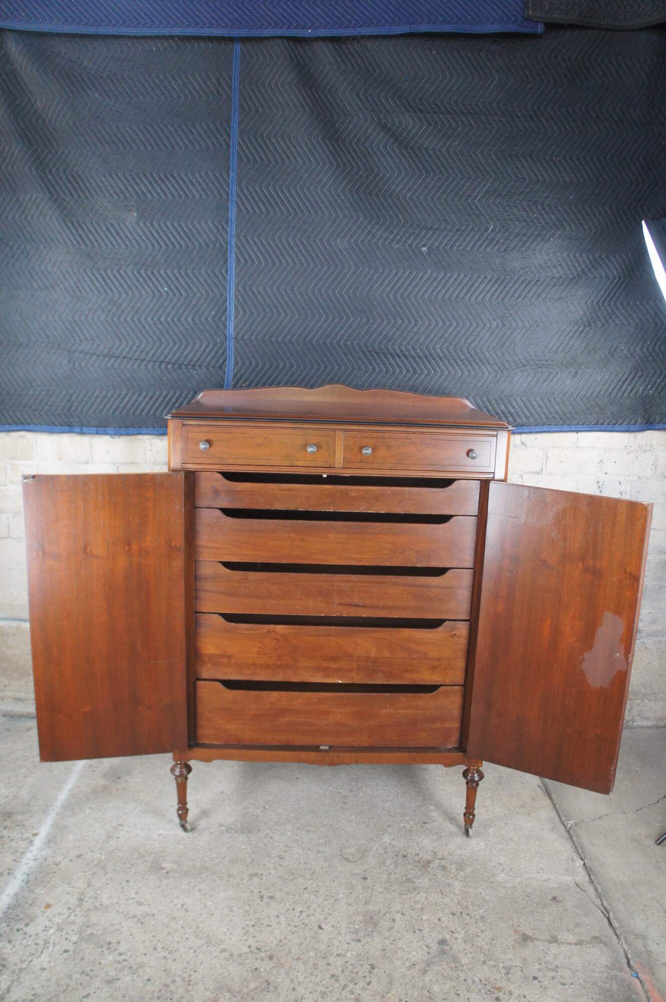 Rockford Furniture Art Deco Tallboy cheset of drawers, circa 1930s. Features a walnut frame with matchbook burled veneer along the front doors. The chest has two smaller dovetailed drawers along the top and opens to 5 graduated interior drawers. The chest features a backsplash and turned legs leading to removable casters.