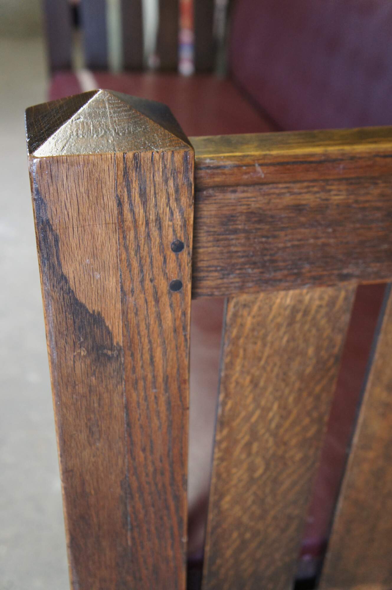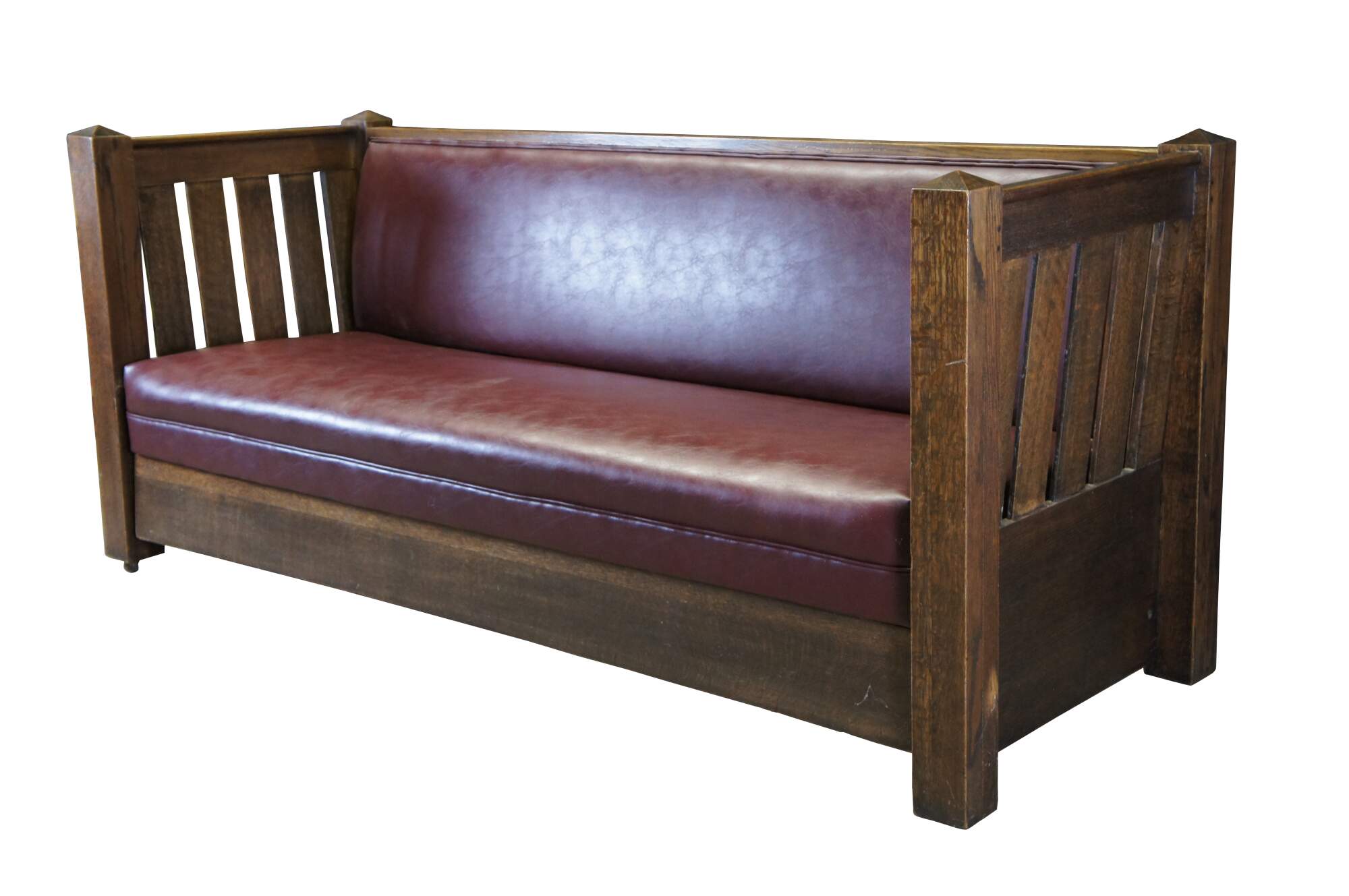 Antique Kroehler unifold Davenport sofa / couch / bed. Made of quartersawn oak featuring traditional Mission styling with vinyl upholstery and folding frame for use as a bed or couch. Made in Chicago.
