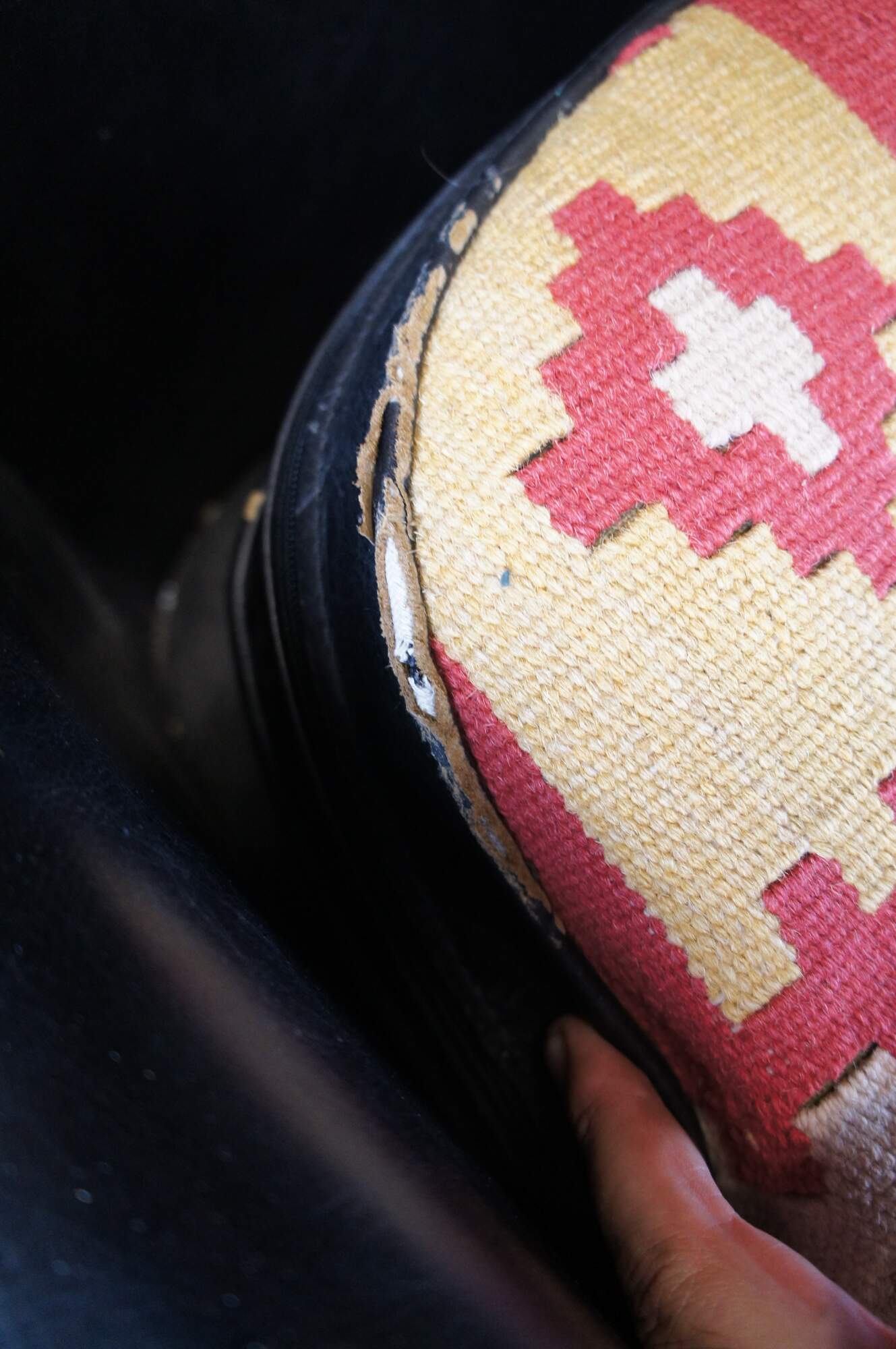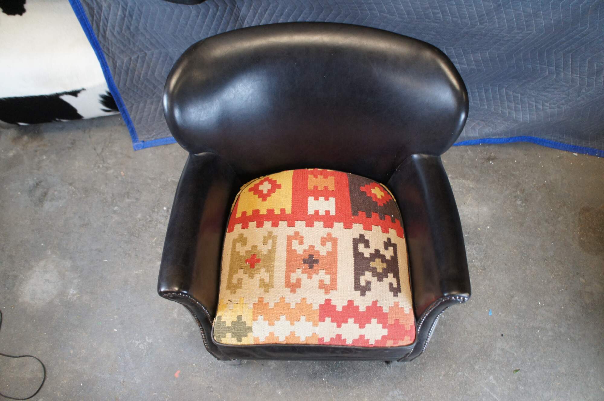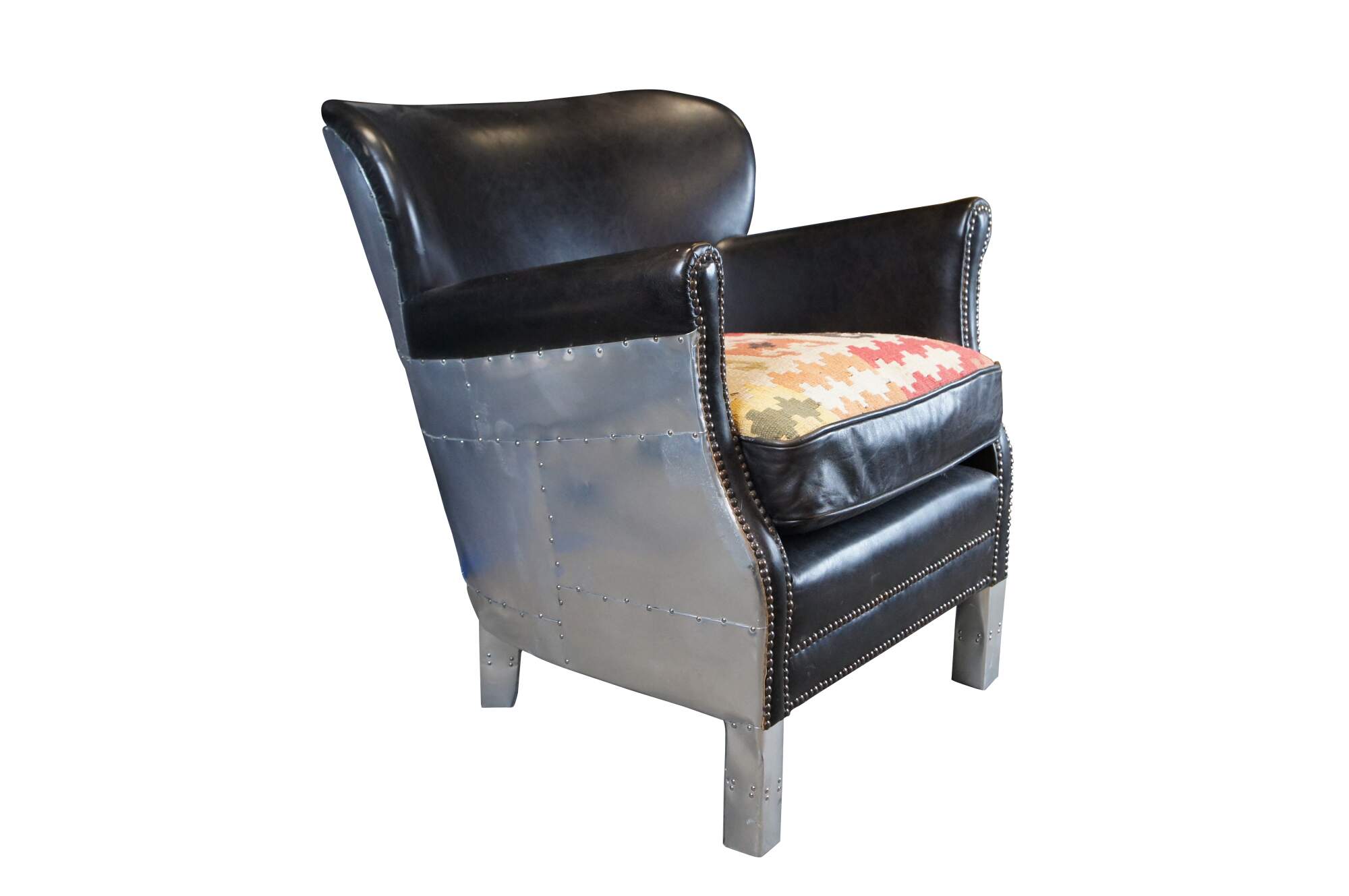 The Professor chair offers amazing comfort due to its clever contouring. The smaller proportions work perfectly in any entry hall or bedroom. The Professor Spitfire contrasts luxuriously soft hand-finished leather with the ruggedness of riveted aluminium panels, inspired by the World War II Spitfire fighter plane. The seat cushion of the Professor Spitfire chair is upholstered in vibrant woven Kilim on the reverse side.