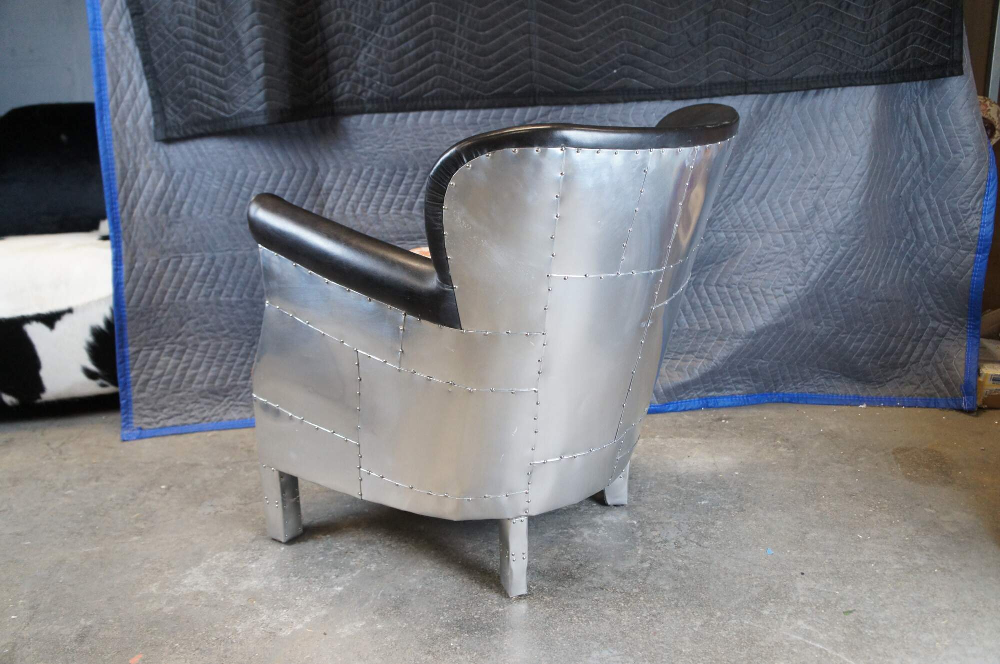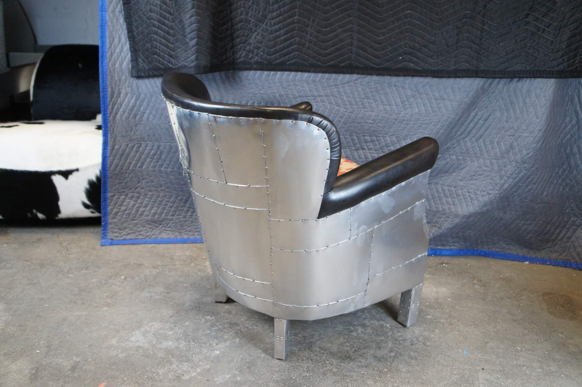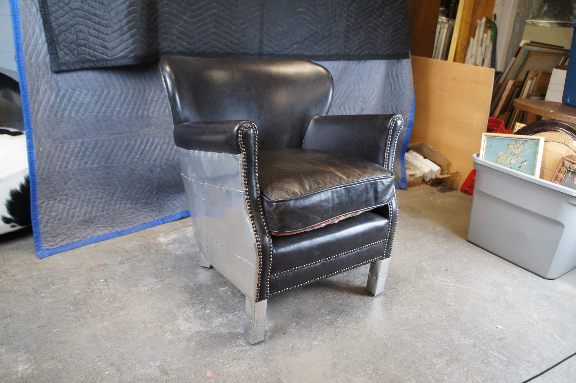 Vintage Southwestern aviator wingback arm chair featuring aluminum paneling, black leather upholstery, and nailhead trim.