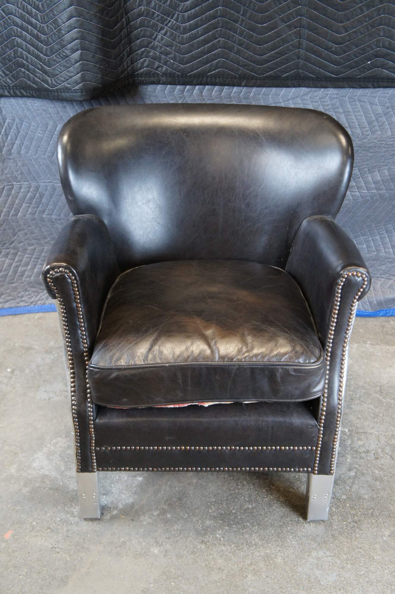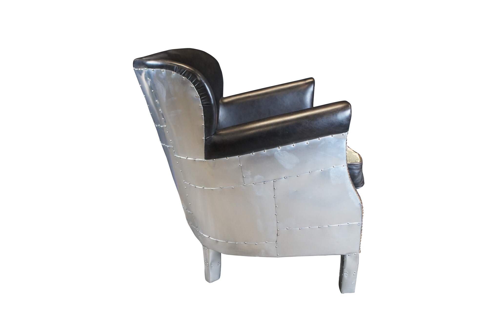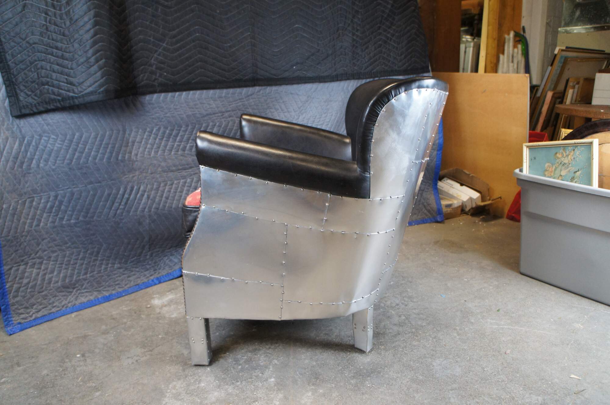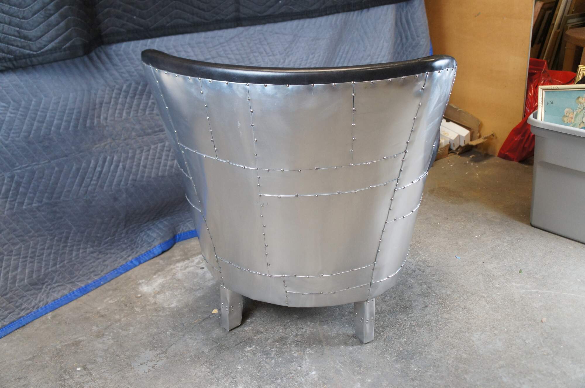 Vintage Southwestern aviator wingback arm chair featuring aluminum paneling, black leather upholstery, and nailhead trim.