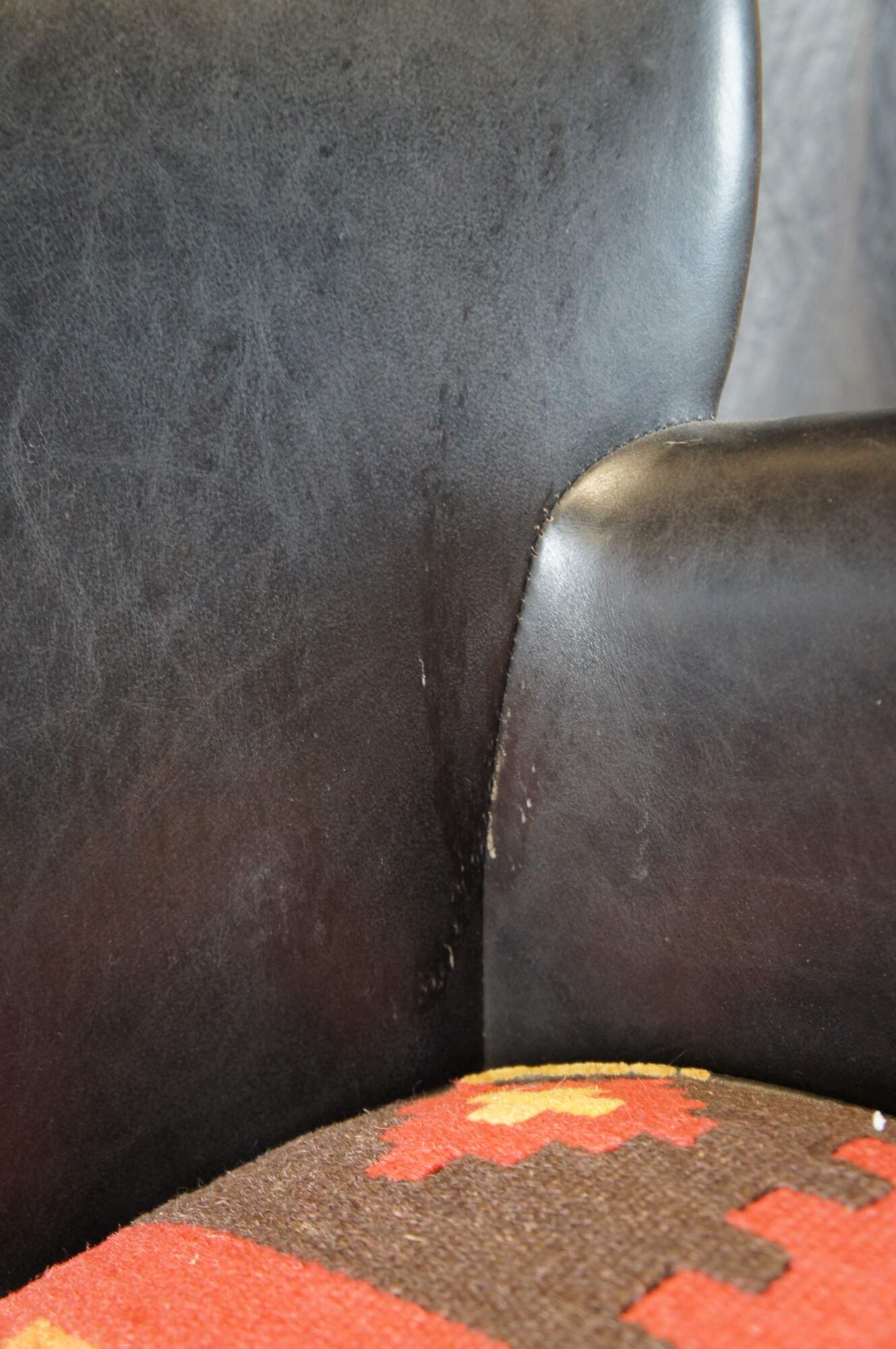 Good vintage condition, wear and distressing from age and use, scuffing, creasing, cushion edge wear.