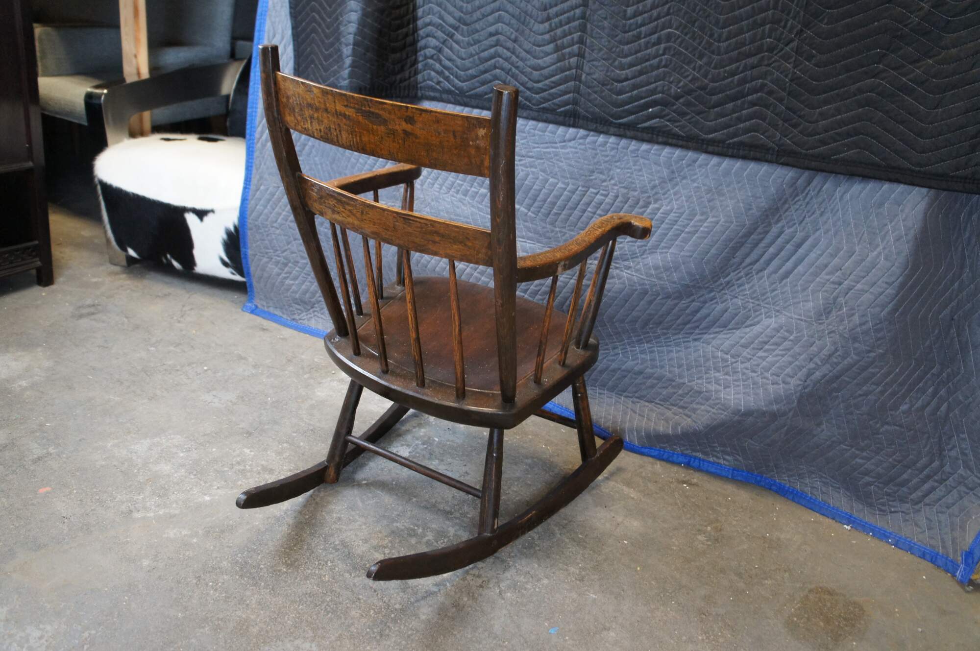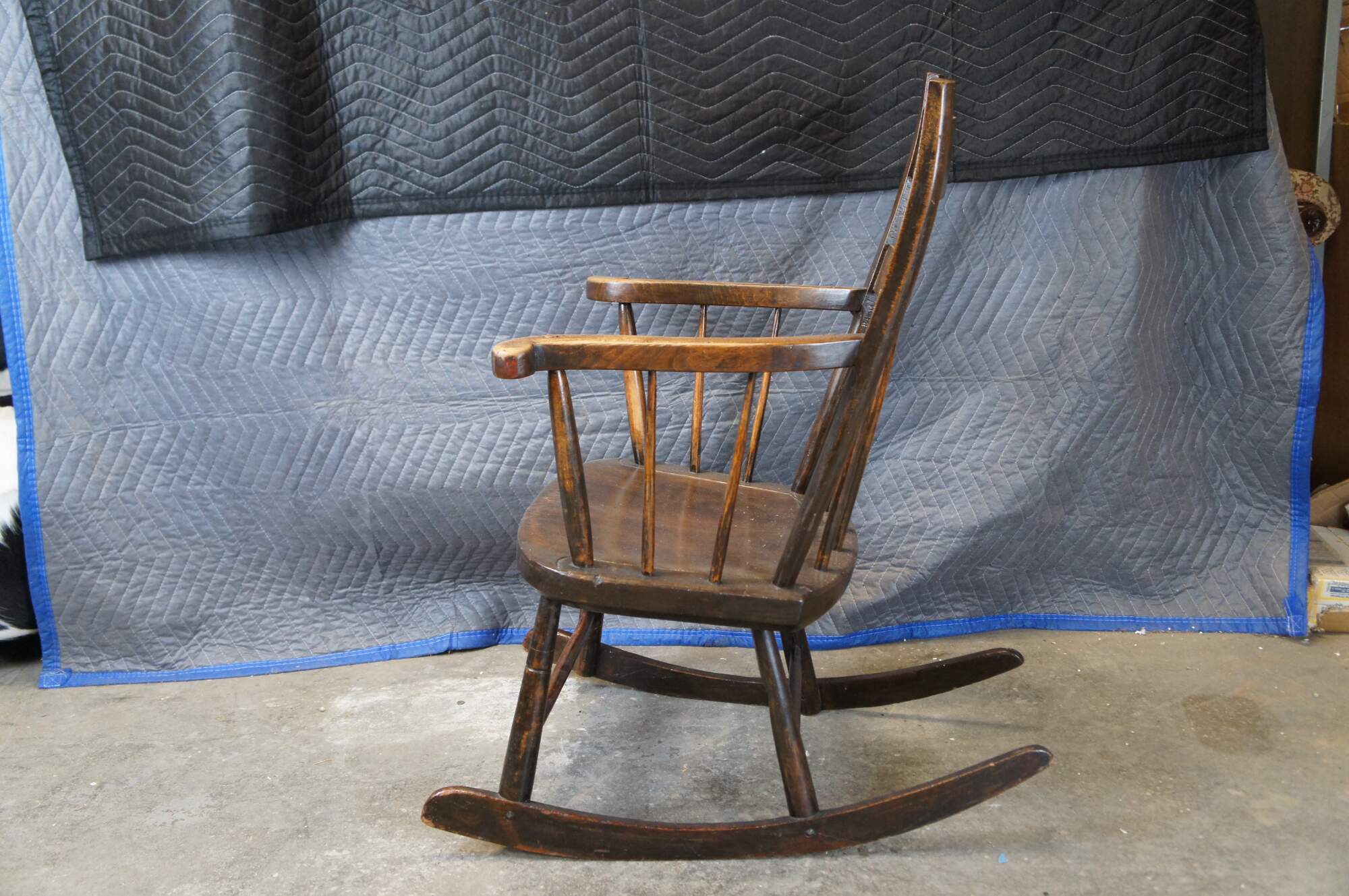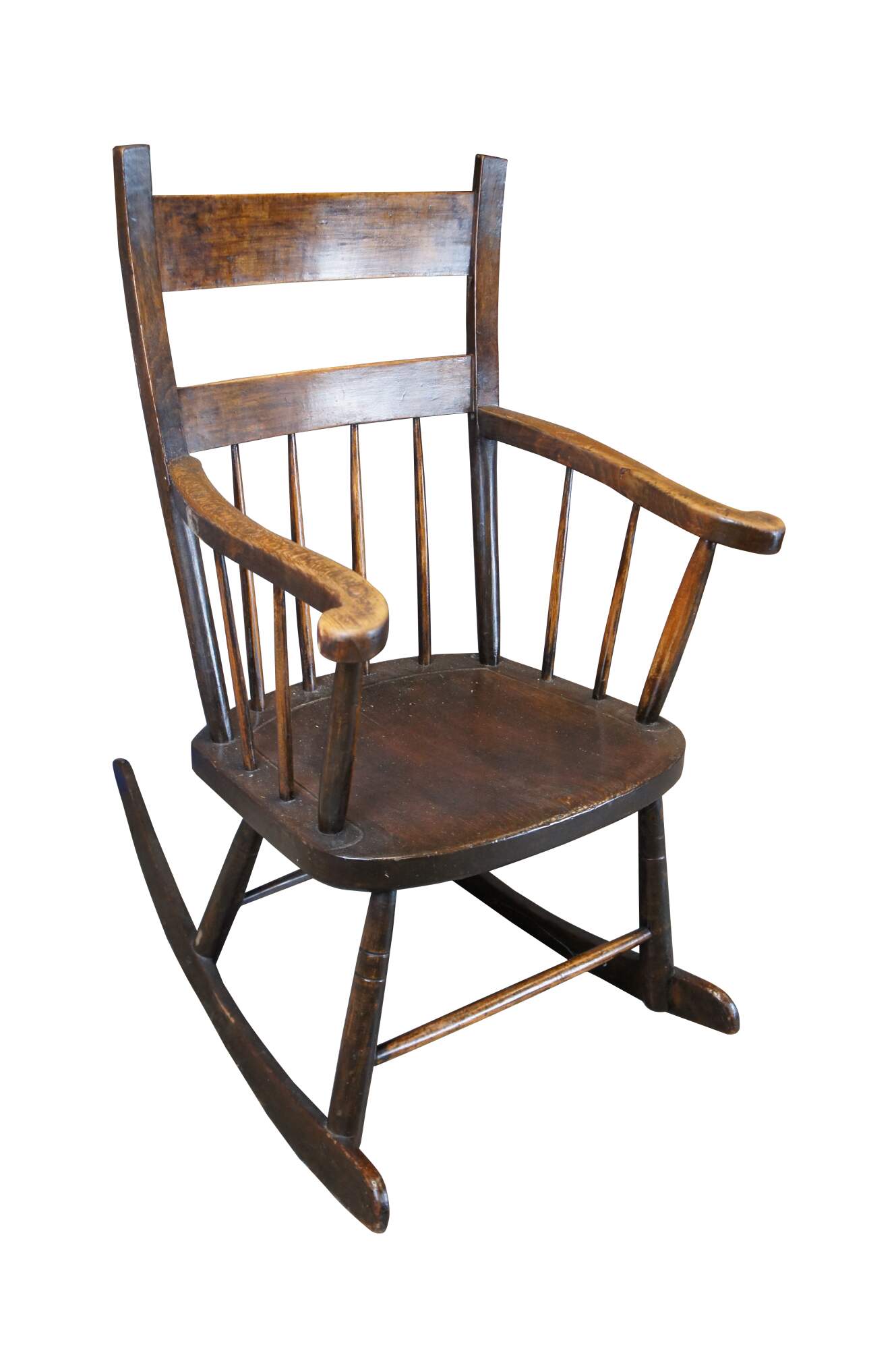 Early 20th Century American Country Farmhouse Rocking Chair. Made from oak with a ladder form, splindles and serpentine flared arms.