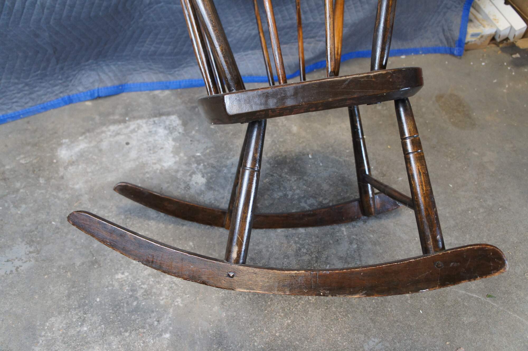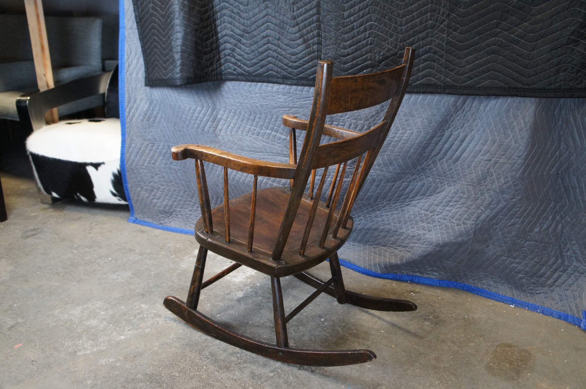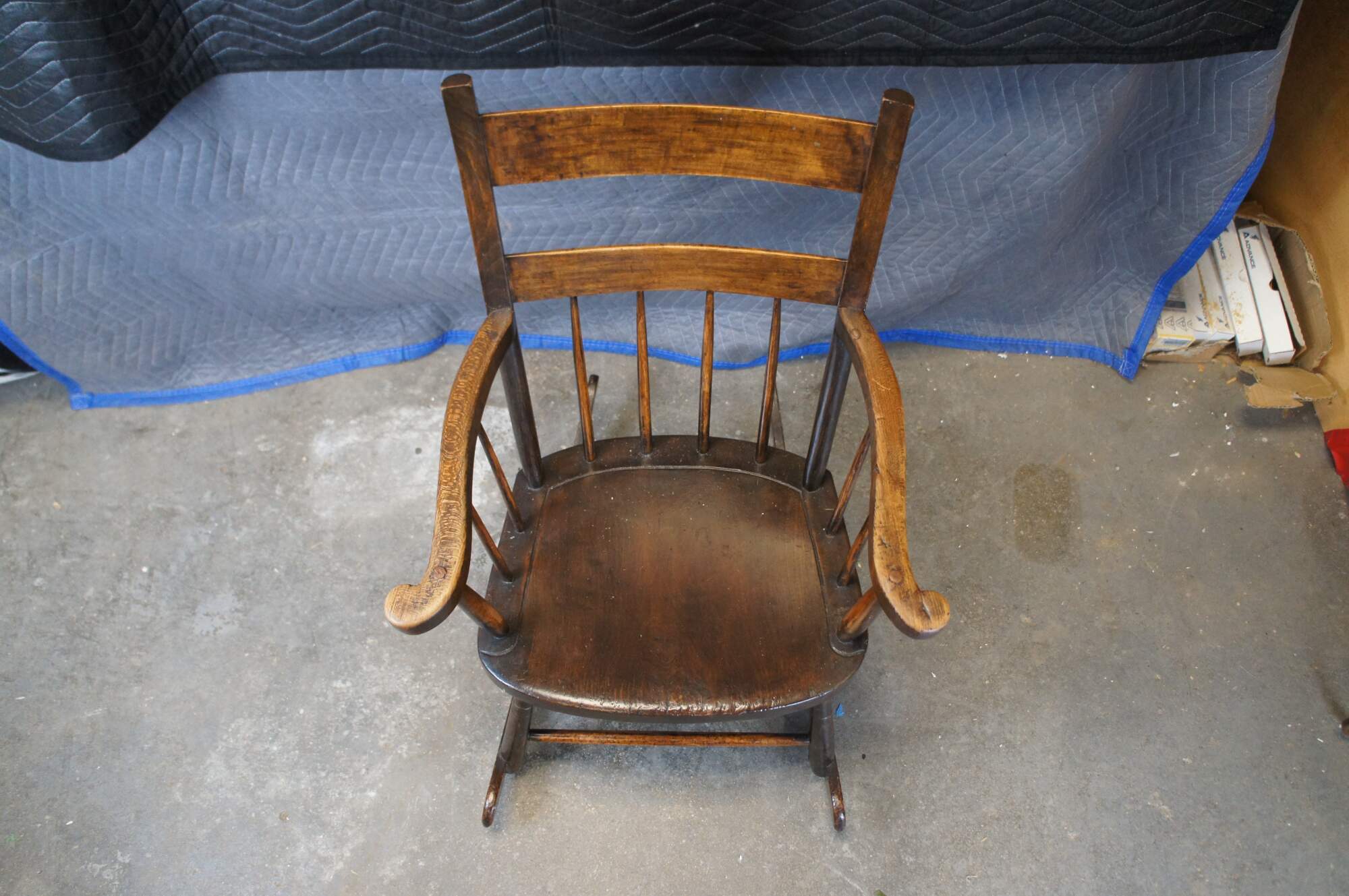 Early 20th Century American Country Farmhouse Rocking Chair. Made from oak with a ladder form, splindles and serpentine flared arms.
