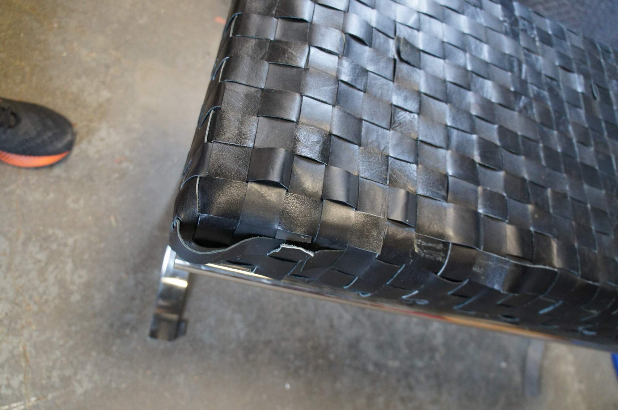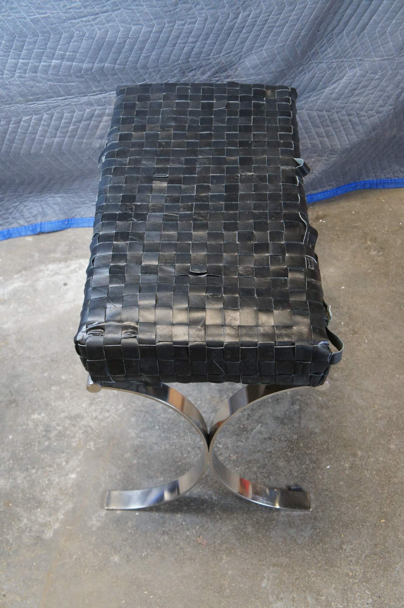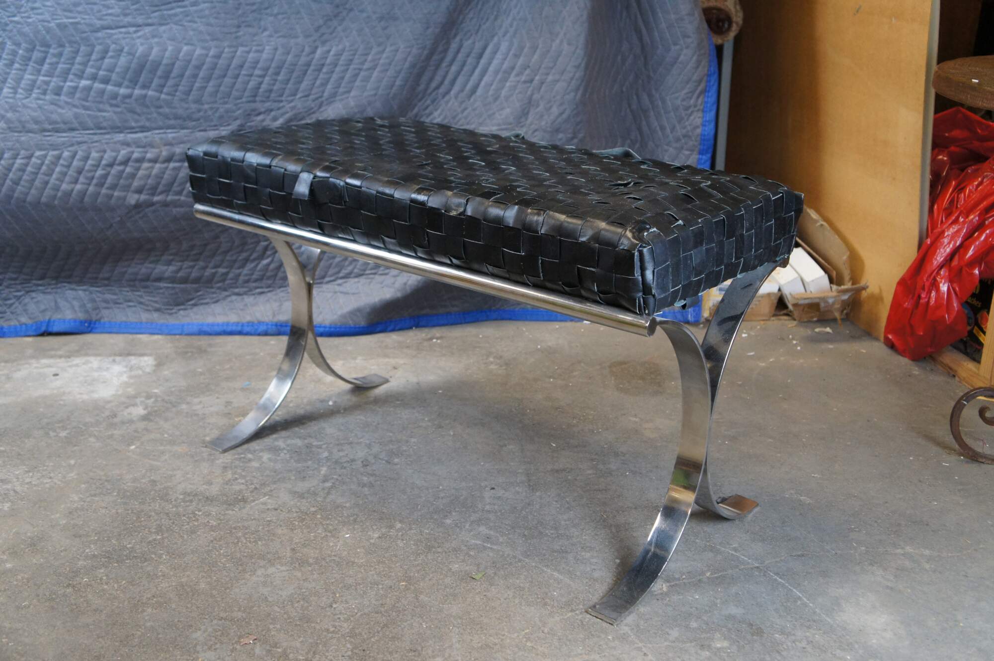 Vintage Barcelona bench / ottoman foot stool or rest featuring rectangular form with a modern tubular and flared chrome frame and woven black leather upholstery.
