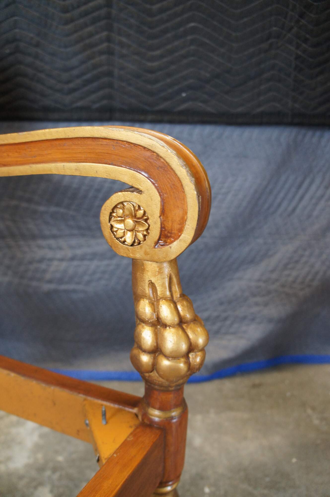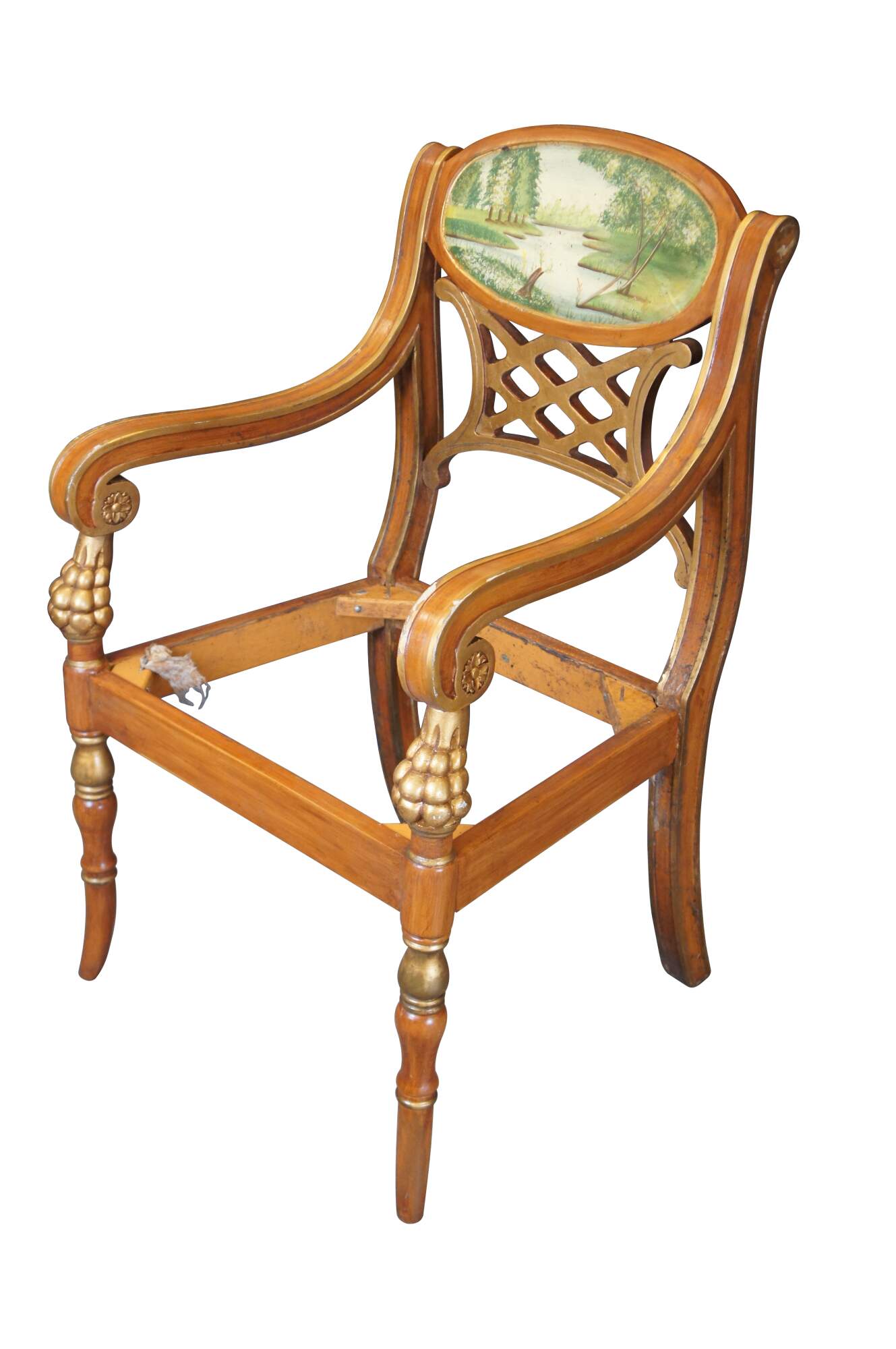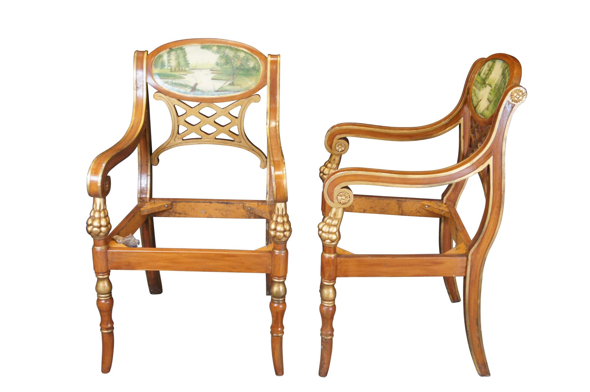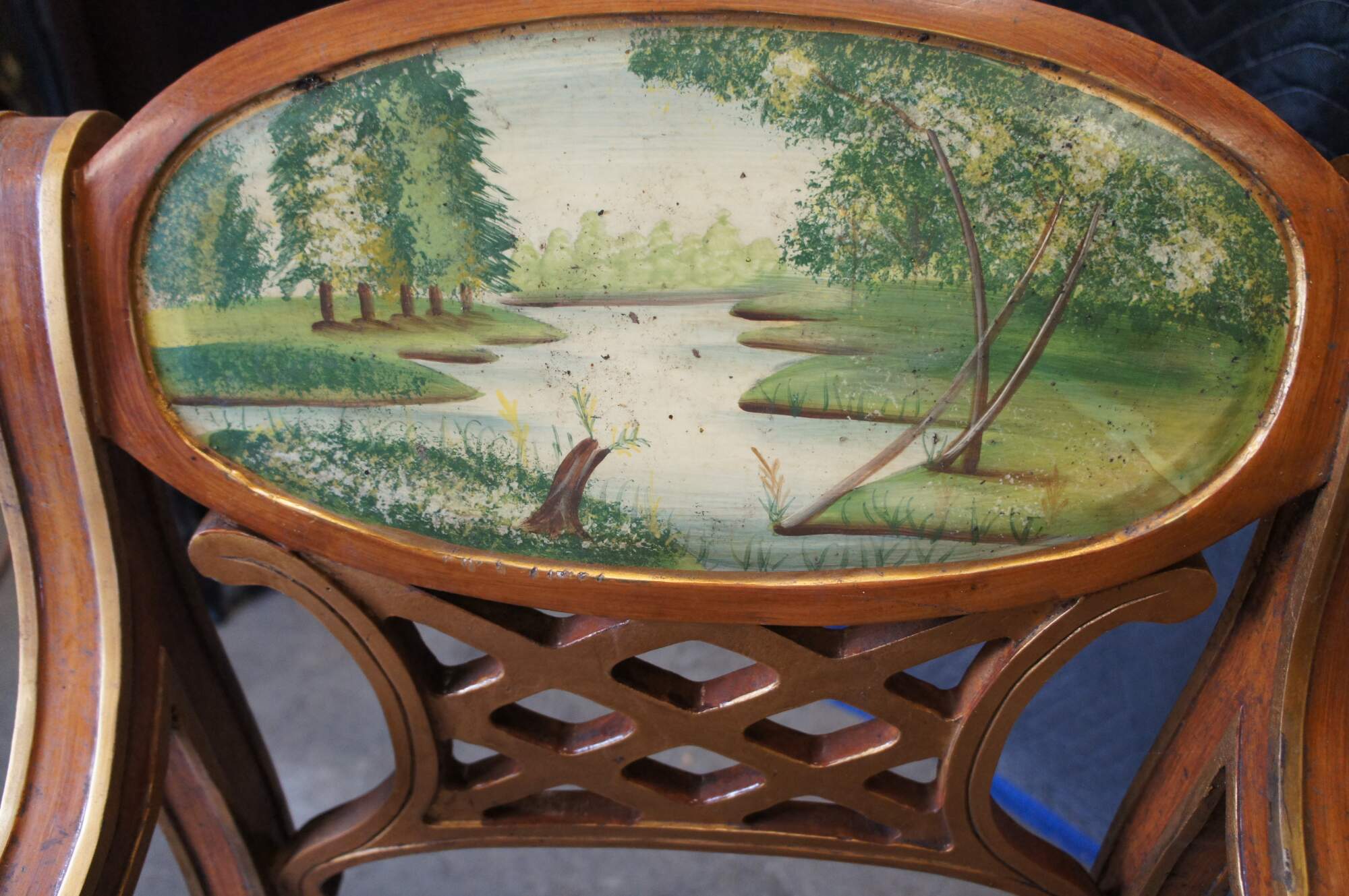 Pair of two vintage Italian Regency style arm chair frames featuring serpentine form with reticulated back, a hand painted river / lake / forest landscape with trees and water, and gold floral medallion accents.