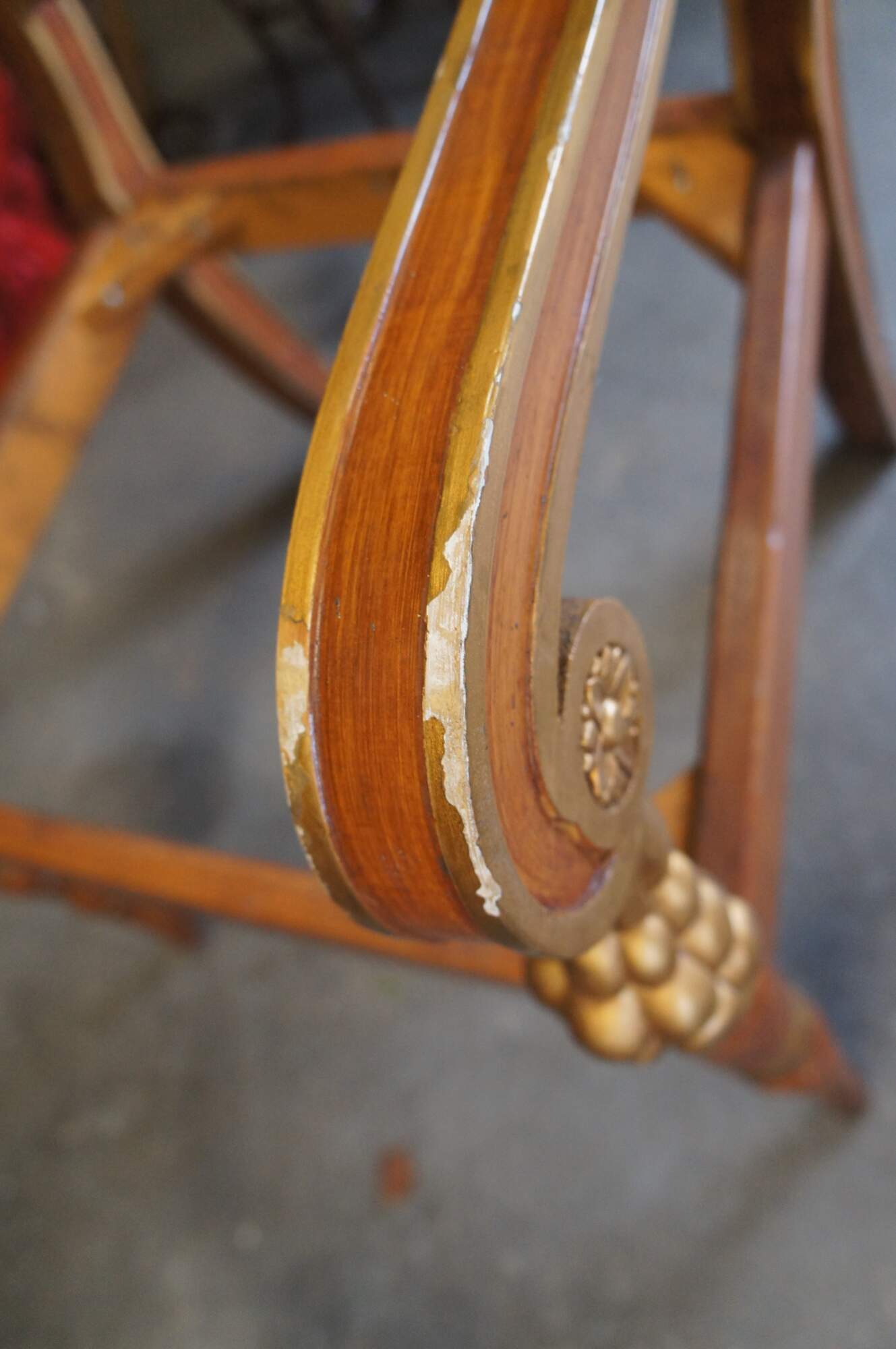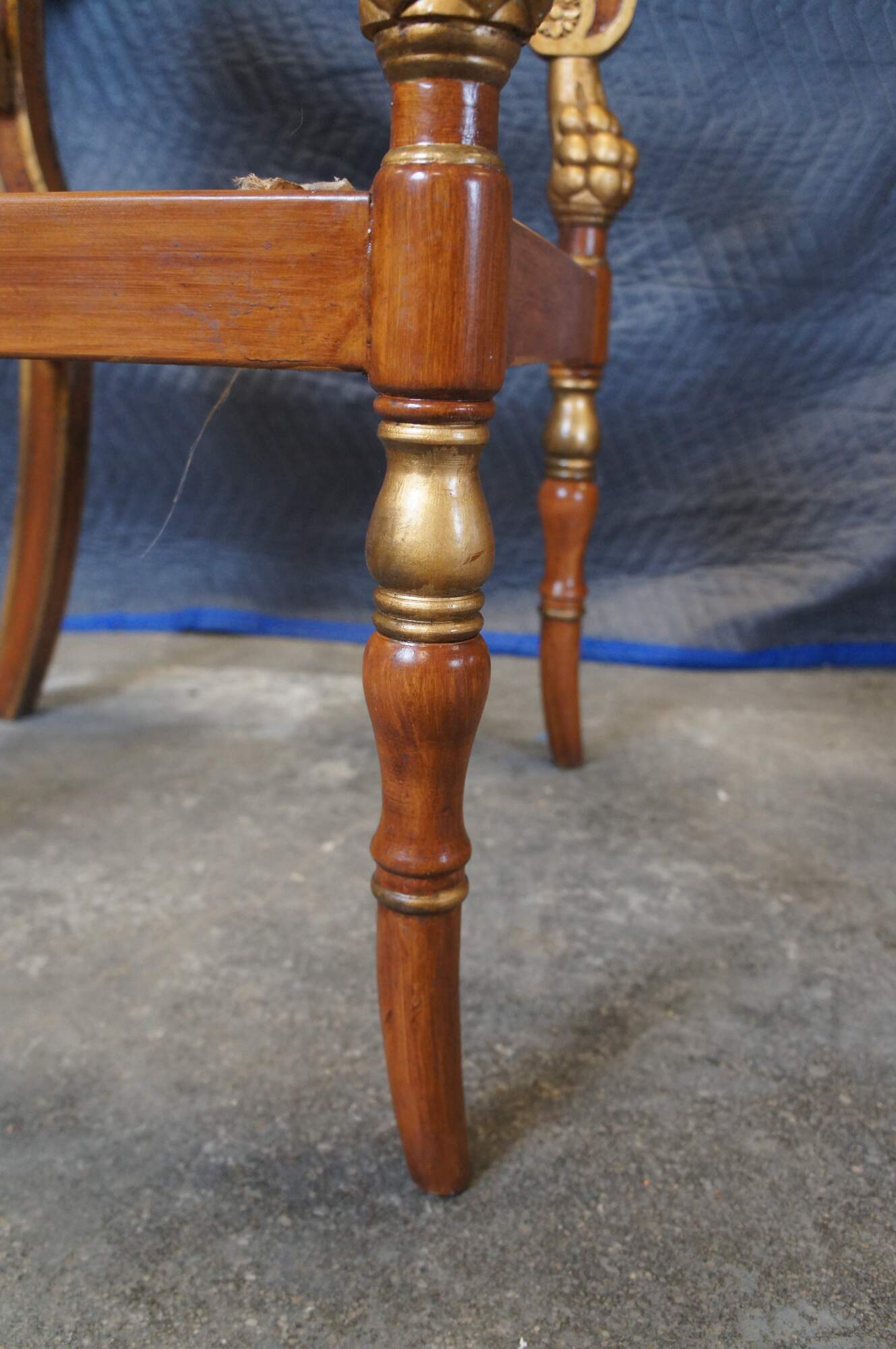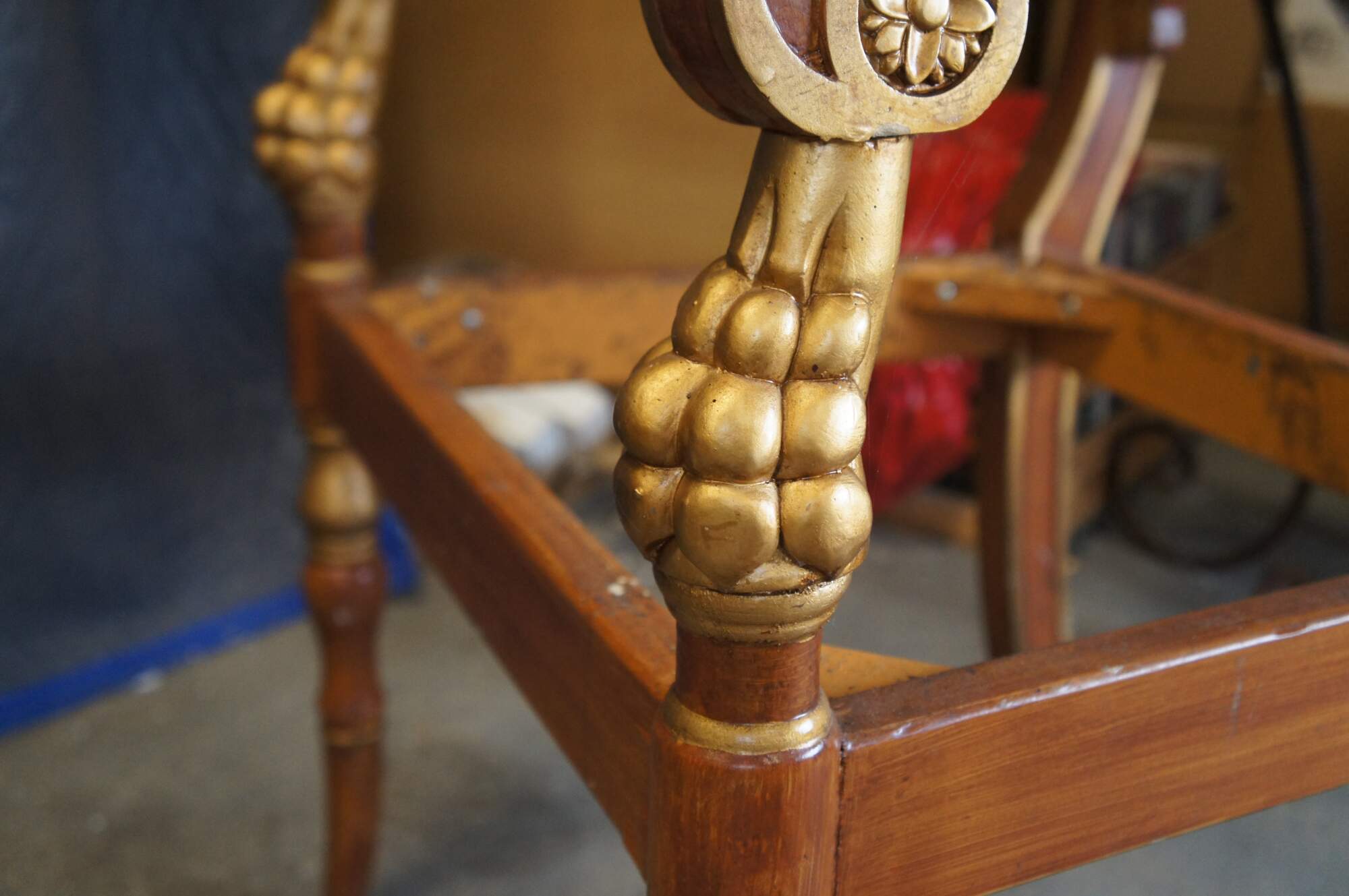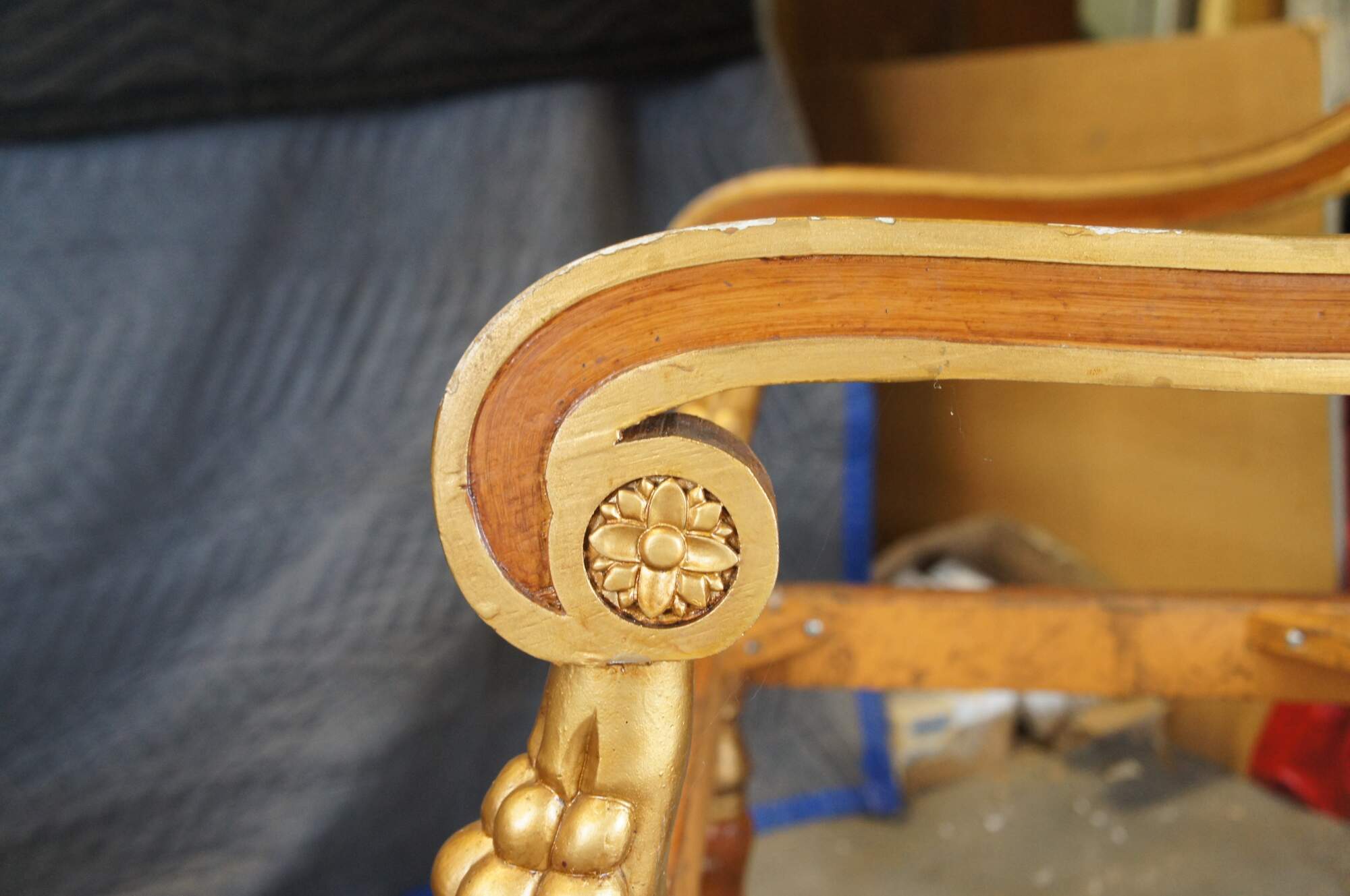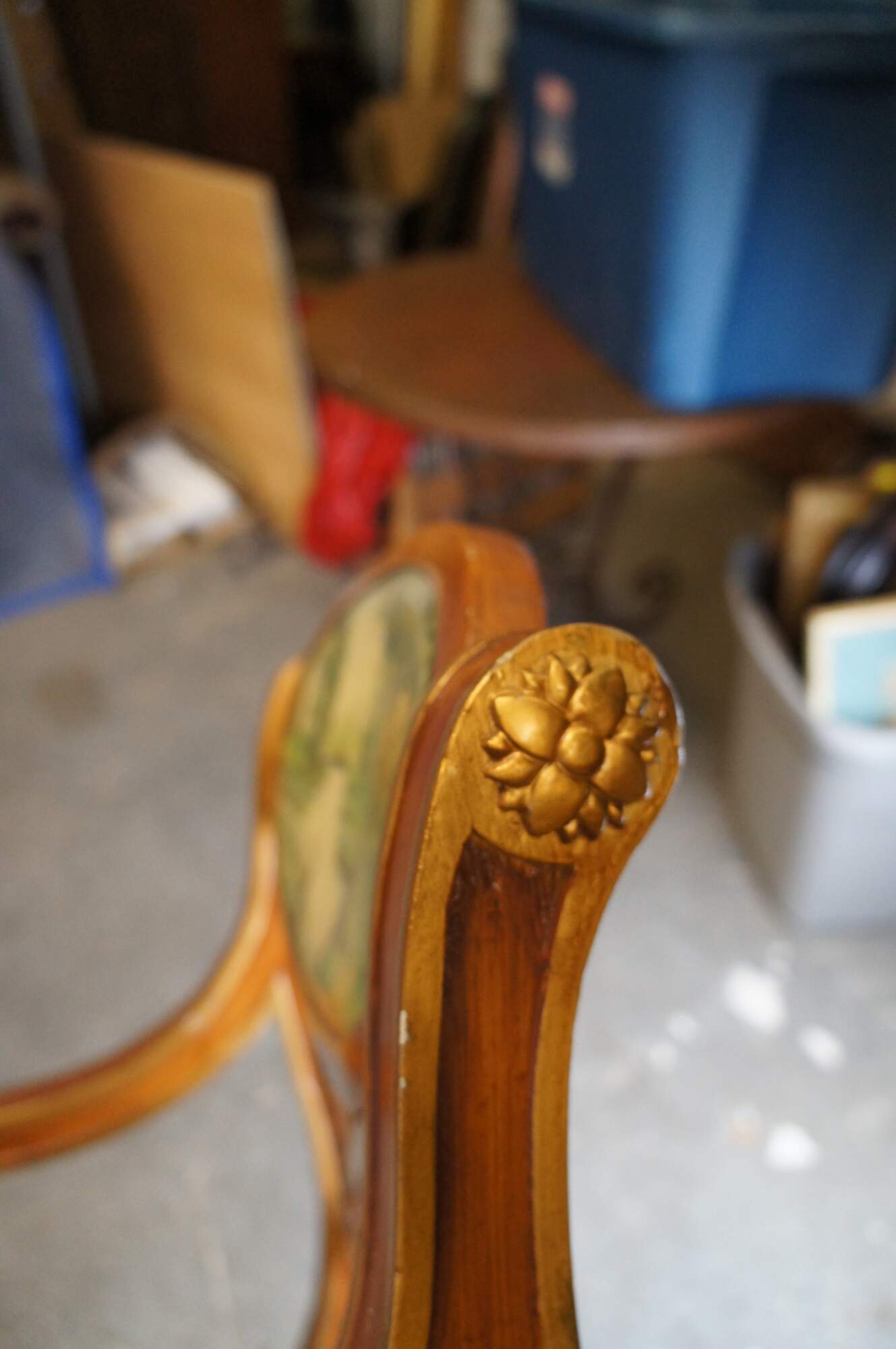 Pair of two vintage Italian Regency style arm chair frames featuring serpentine form with reticulated back, a hand painted river / lake / forest landscape with trees and water, and gold floral medallion accents.
