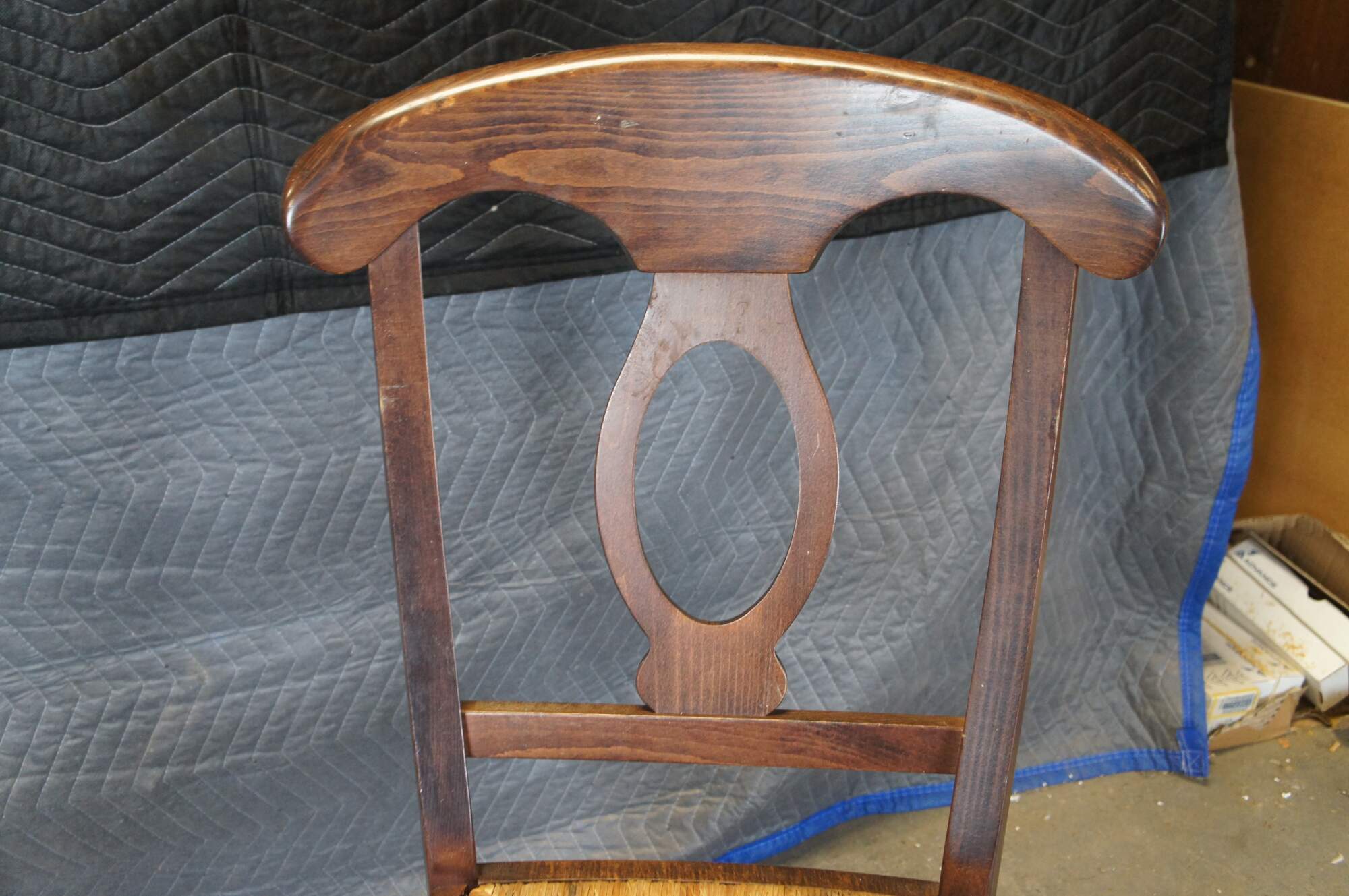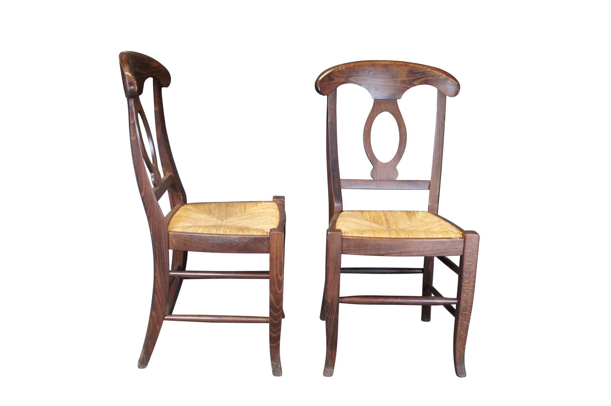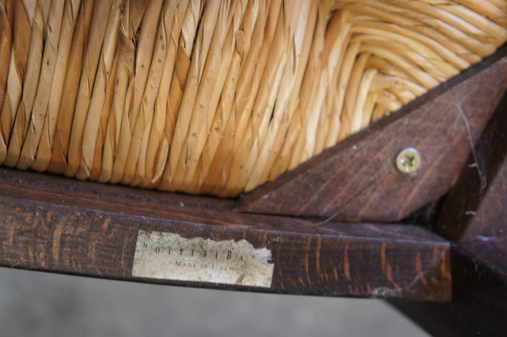 Pair of two vintage Pottery Barn Napoleon Harvest / Country / Farmhouse dining chairs. Made of oak featuring Tuscan styling with rush seat and oval splat back. Made in Italy.