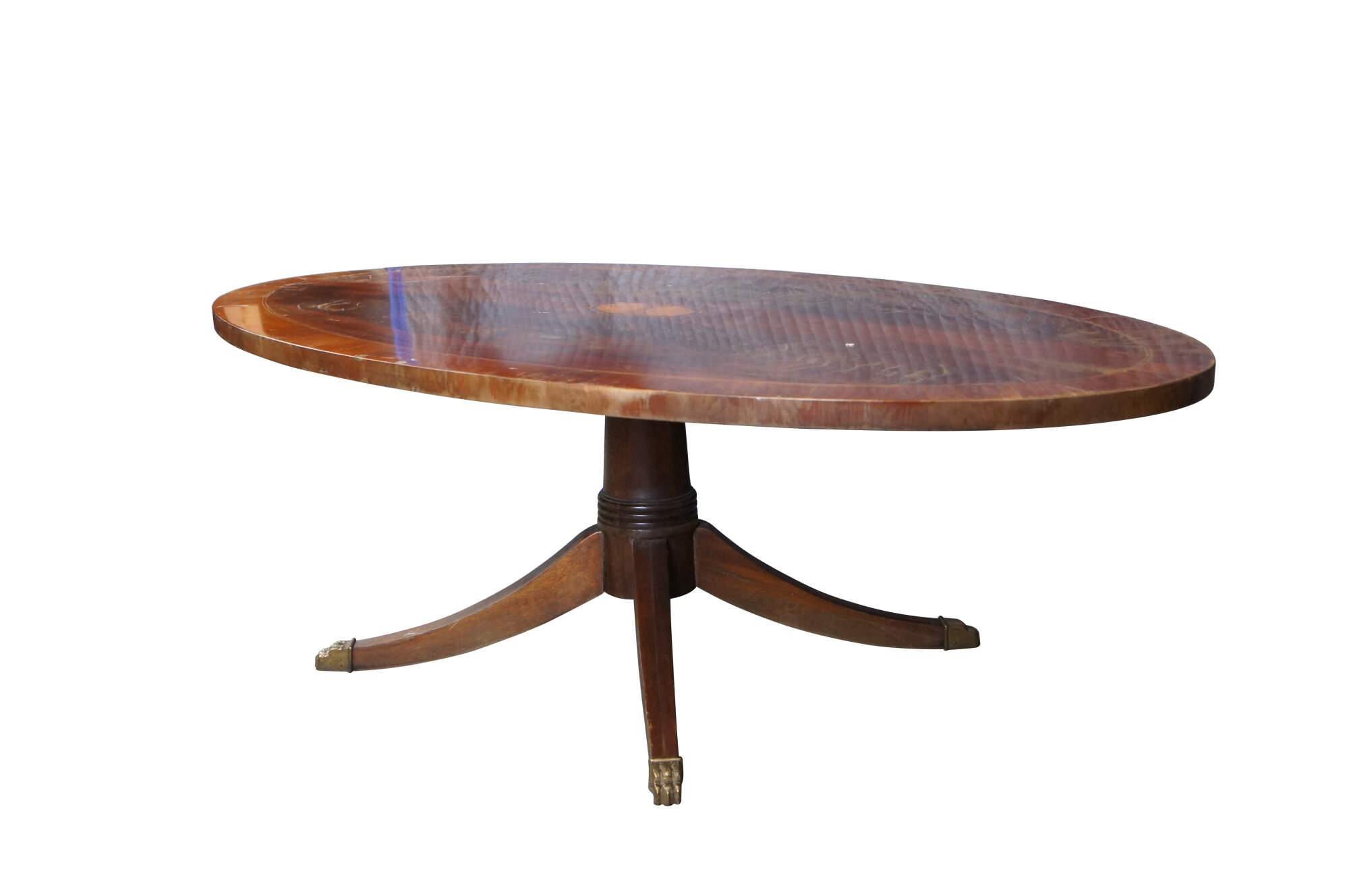 Vintage Hekman Furniture oval coffee or cocktail table featuring English Georgian styling with crotch mahogany top and inlaid satinwood over pedestal base with four moluded splay legs capped with brass claw feet. Circa 1987.