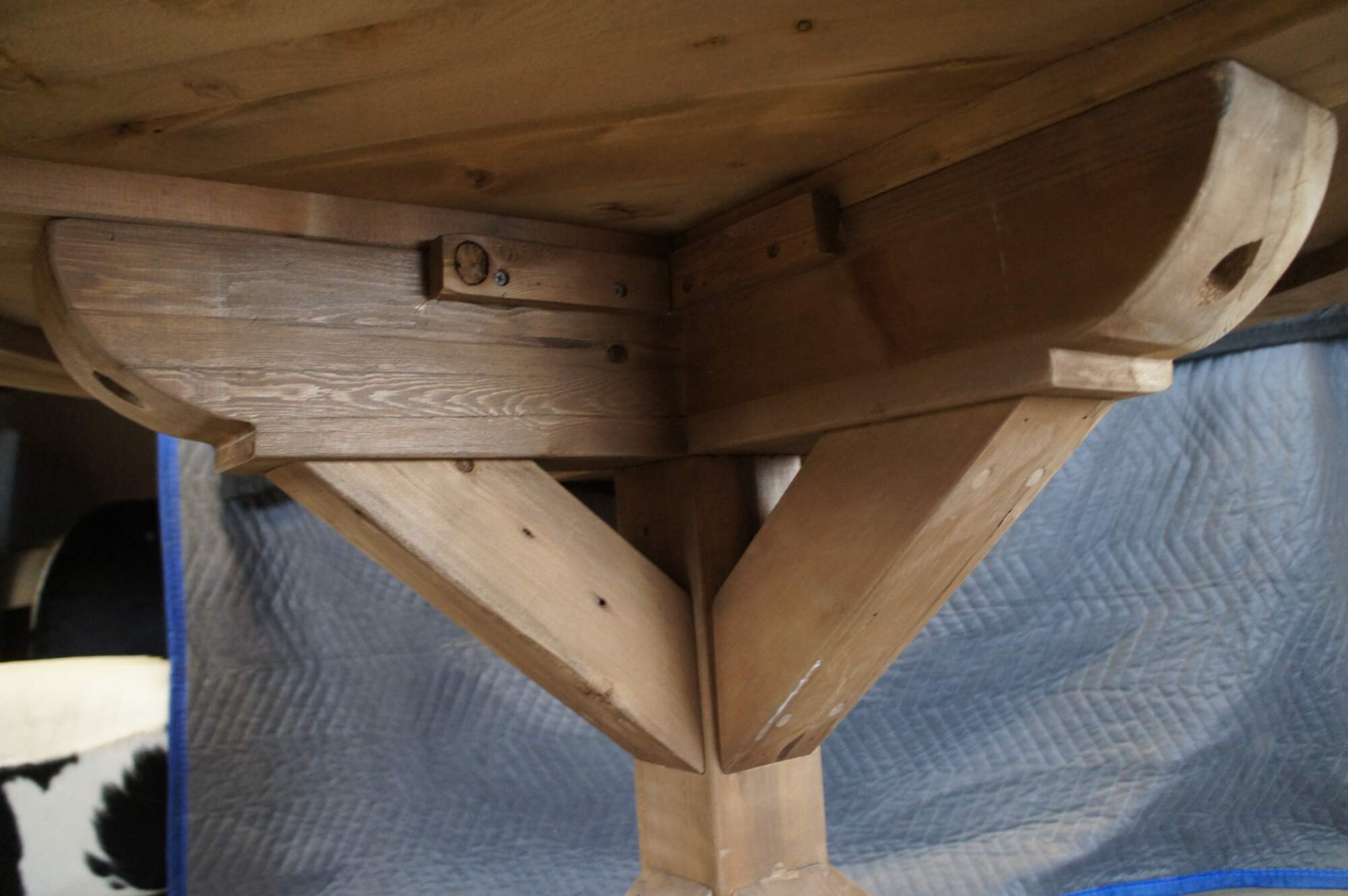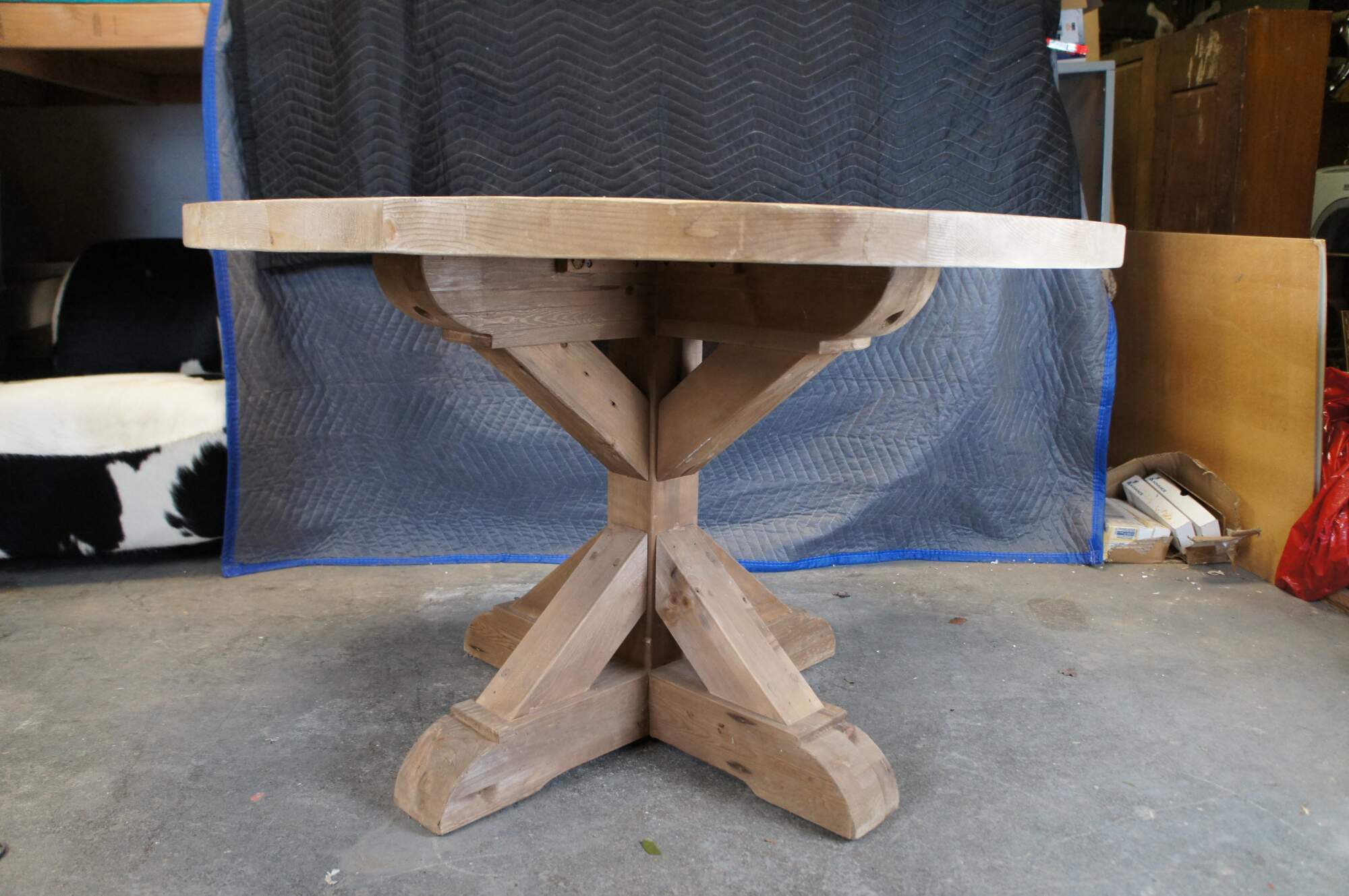 Vintage Restoration Hardware rustic pine farmhouse breakfast or dining table featuring round form with pedestal base.