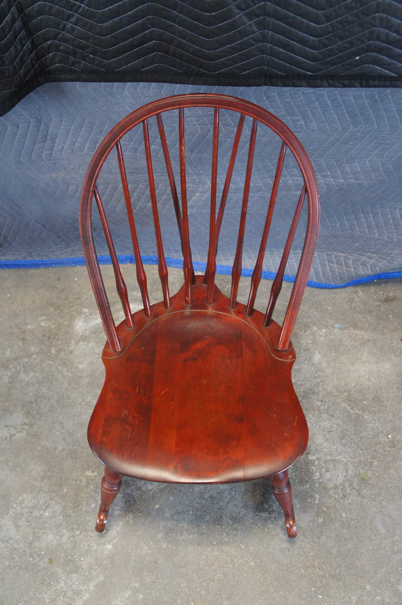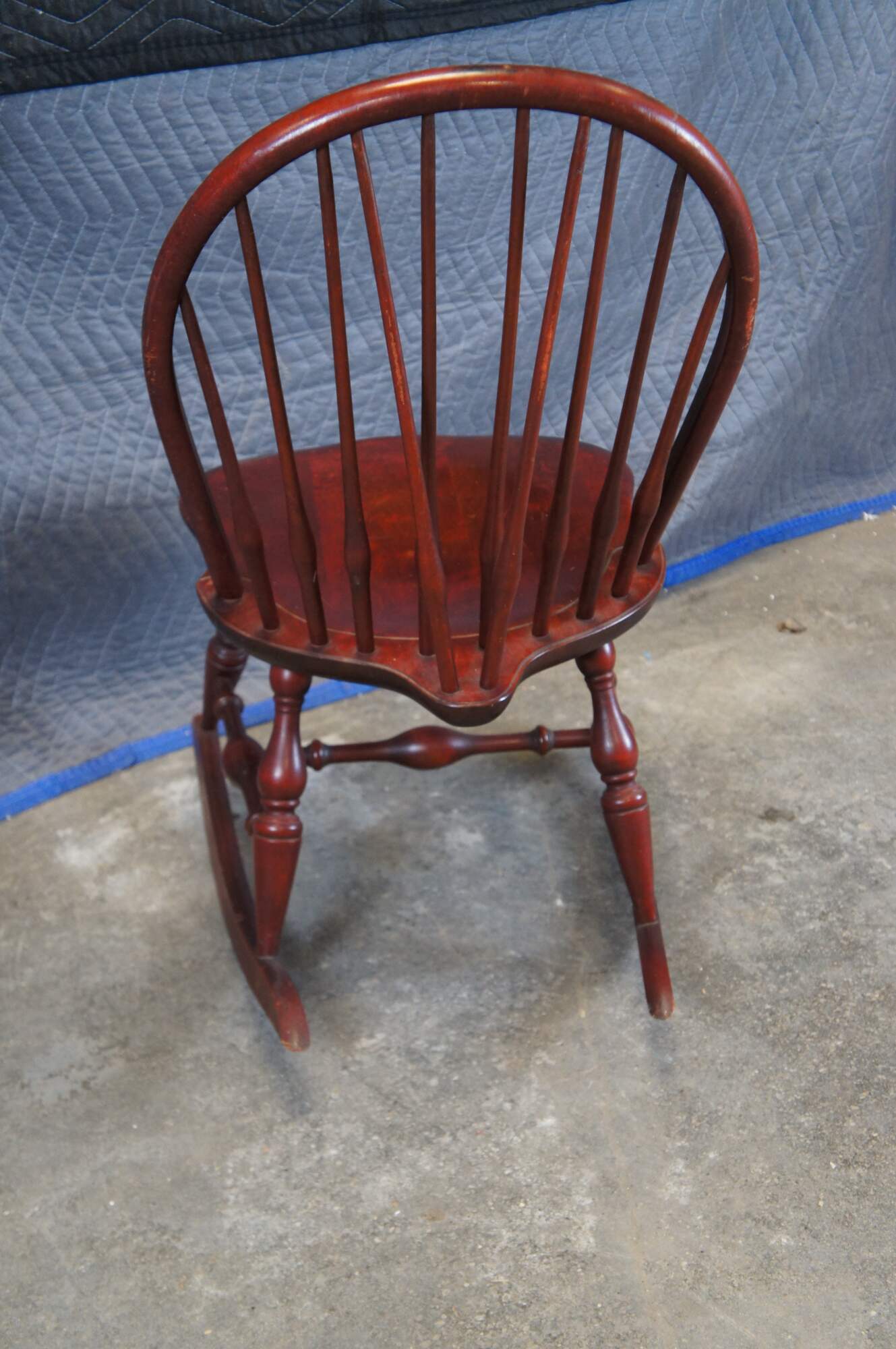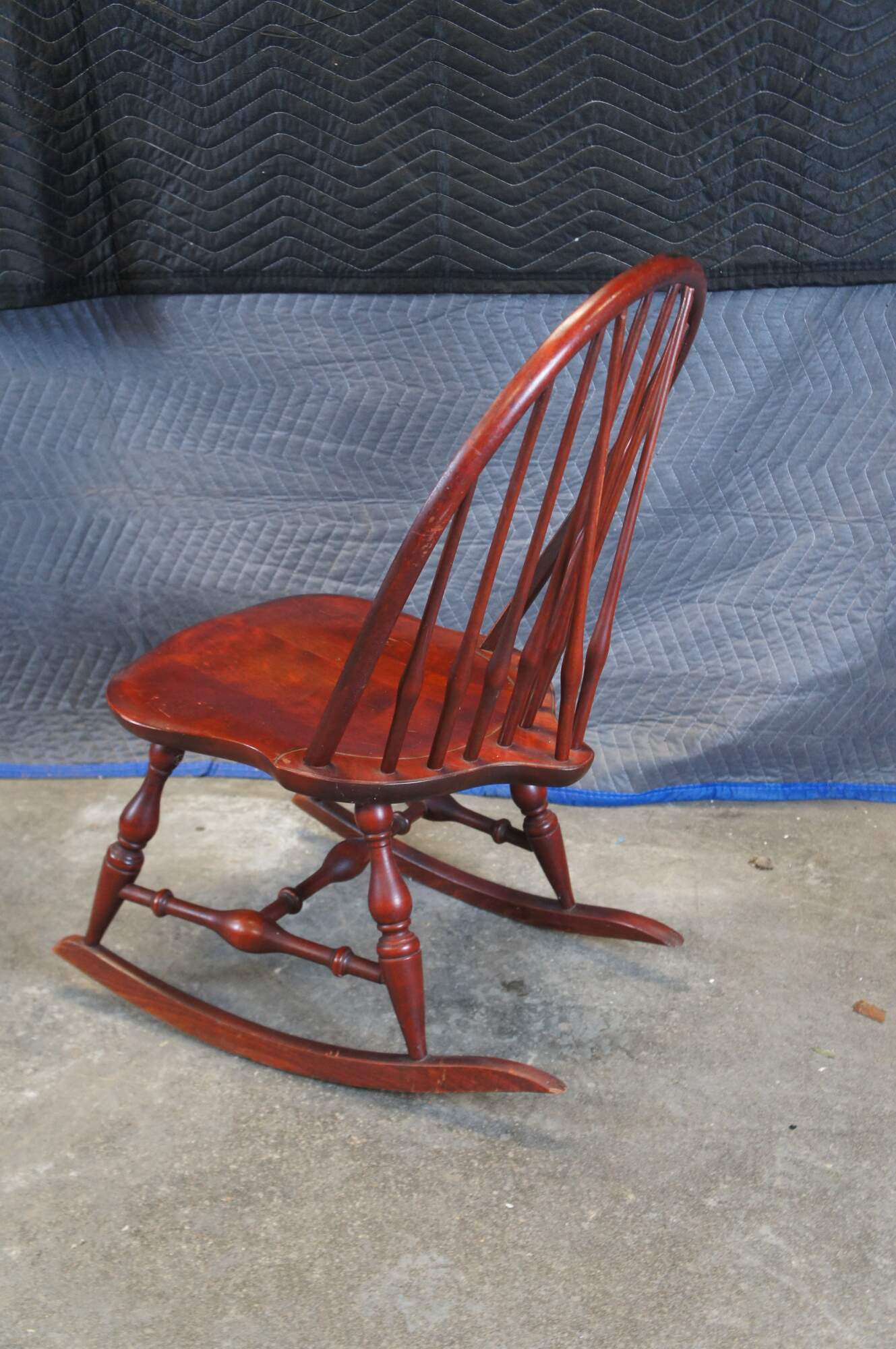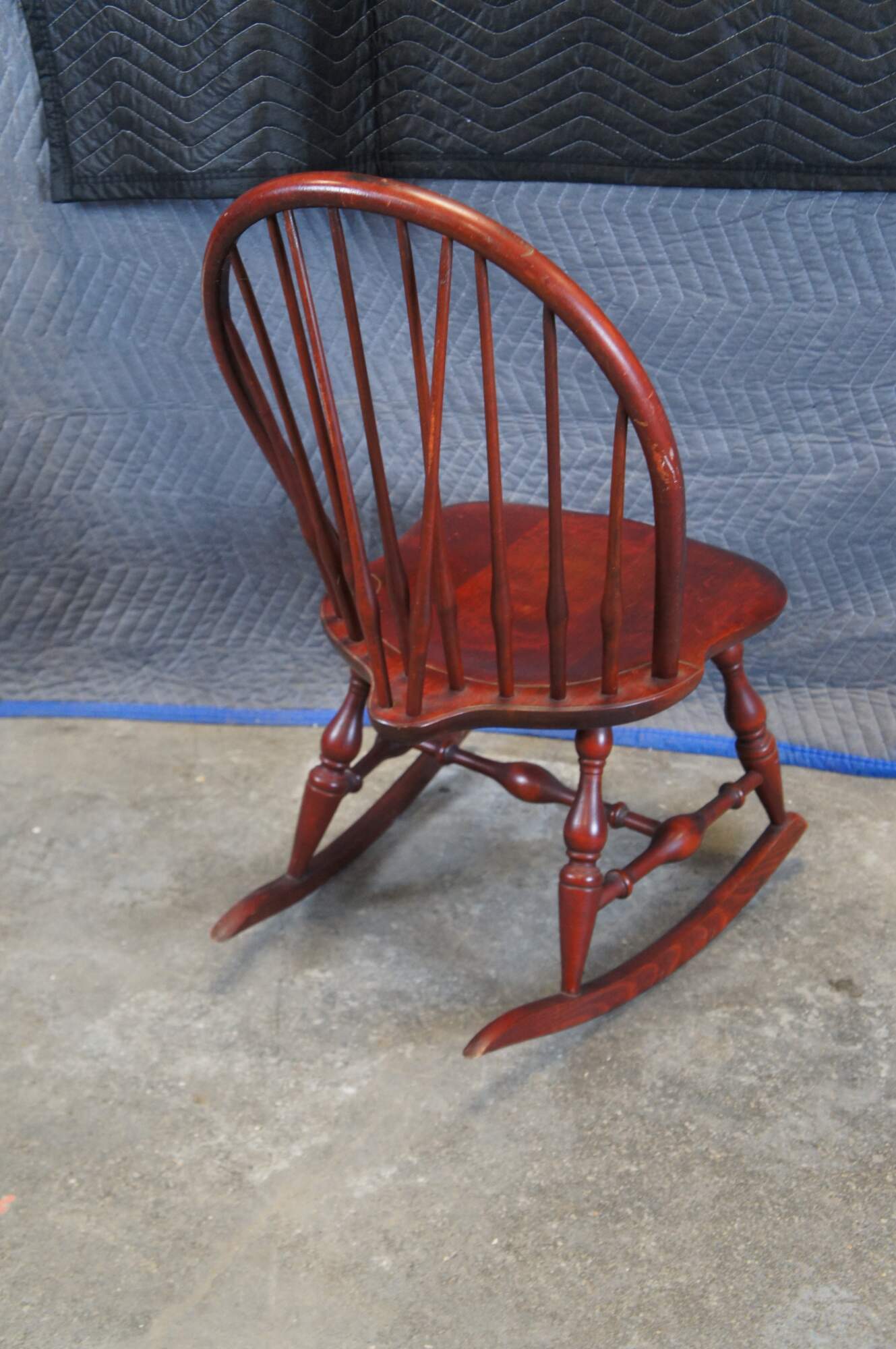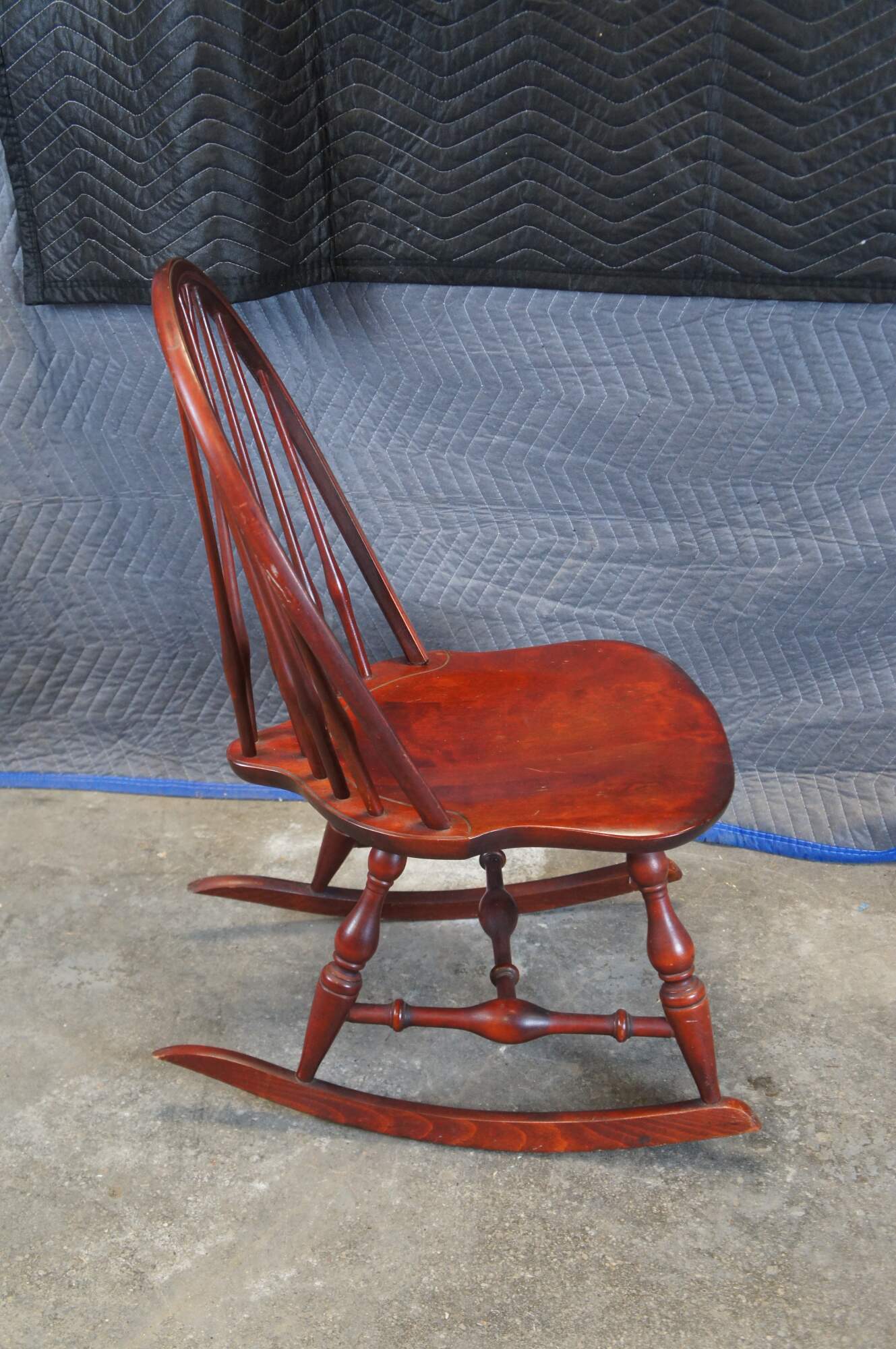 Vintage Nichols and Stone windsor rocking chair or rocker featuring a slatted bentwood bow back design with turned supports and H stretcher.