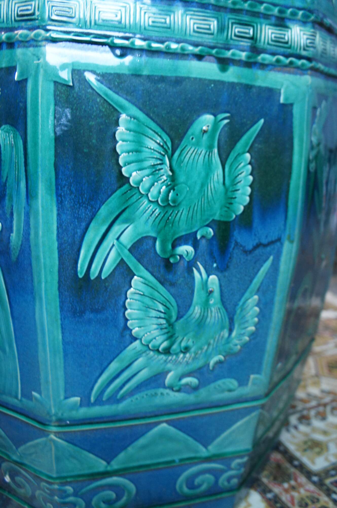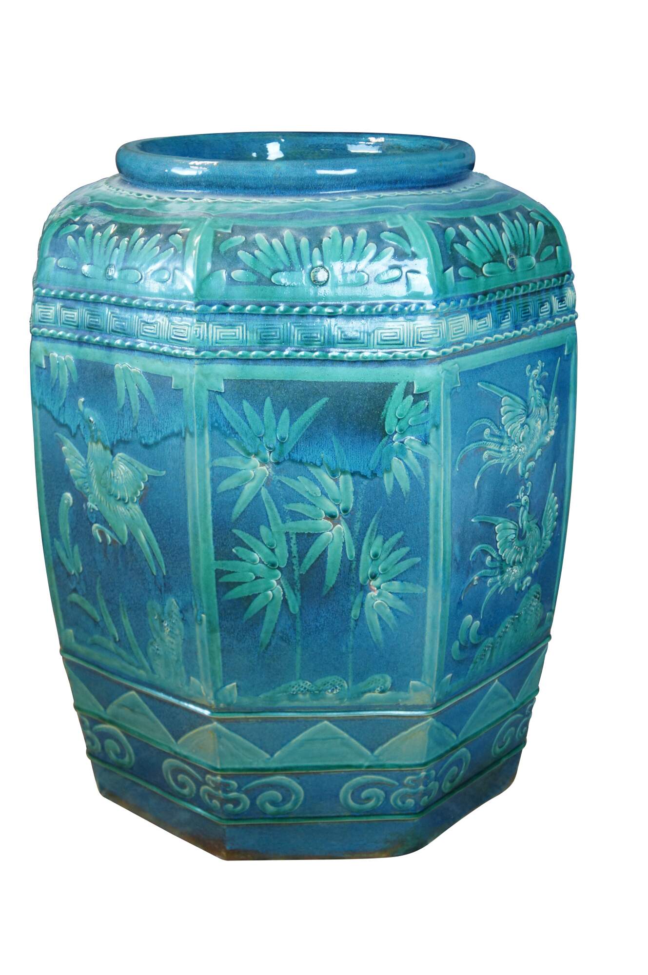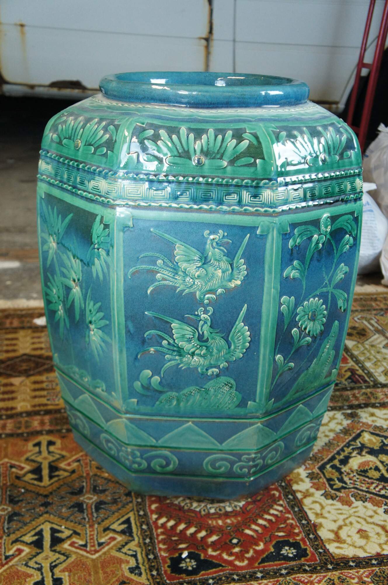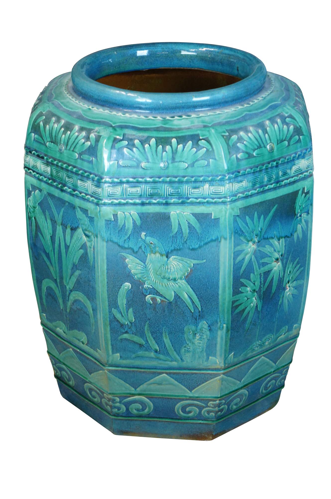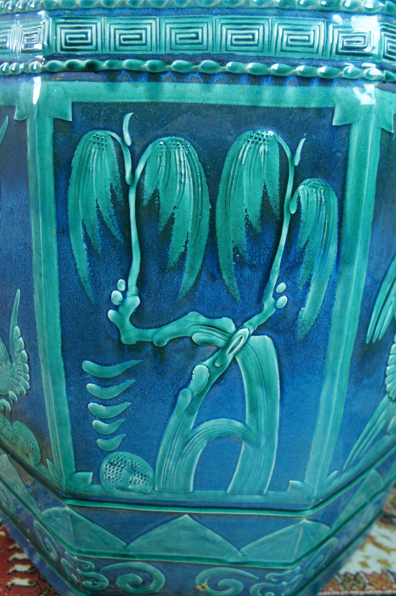 A very large and impressive Octagon shaped stoneware jardiniere floor vase / pottery urn featuring Chinese / Chinoiserie styling with a floral and bird motif. Each side panel is decorated with various flowers and birds / pheonix / swans and Greek key banding.