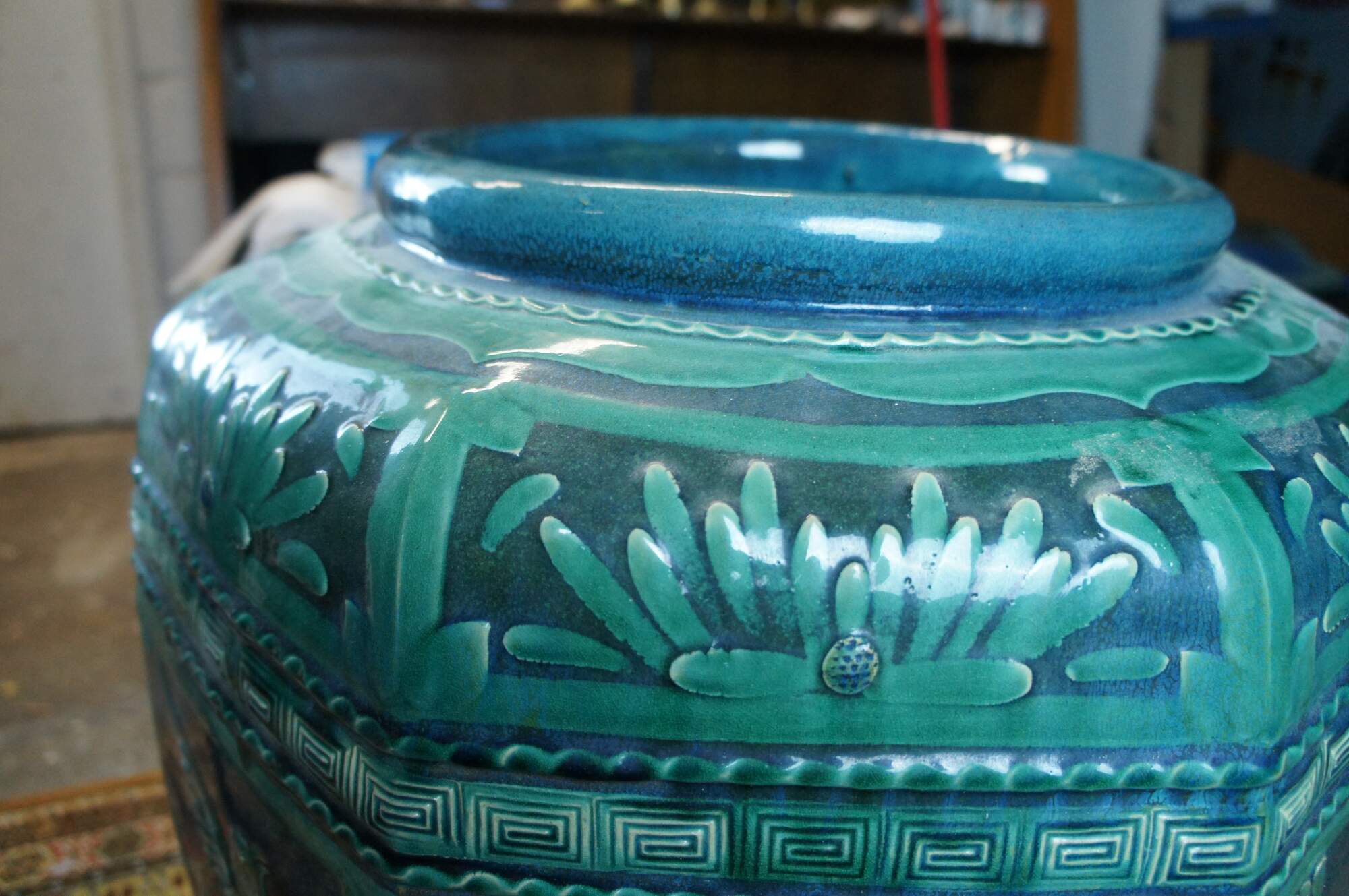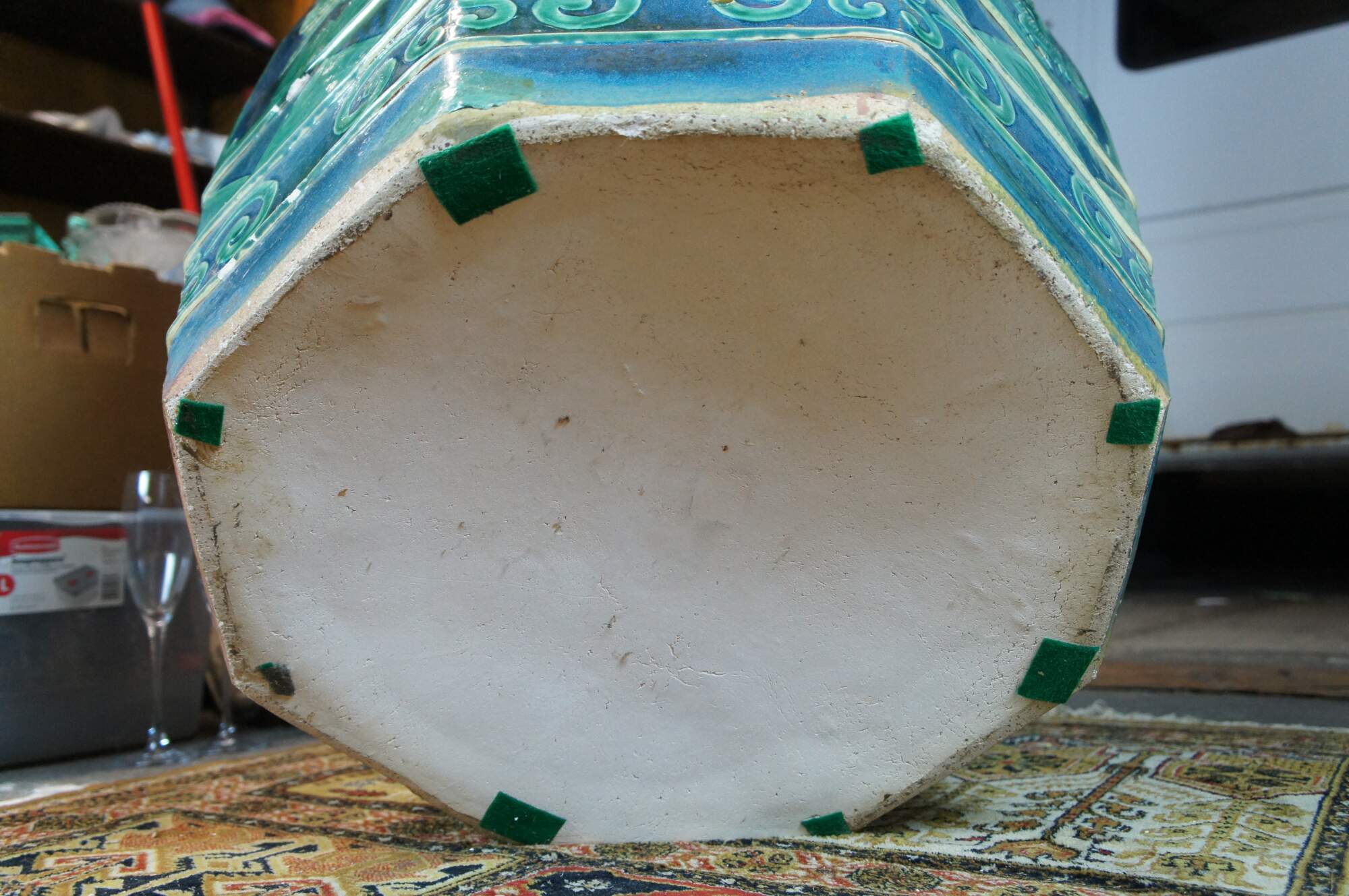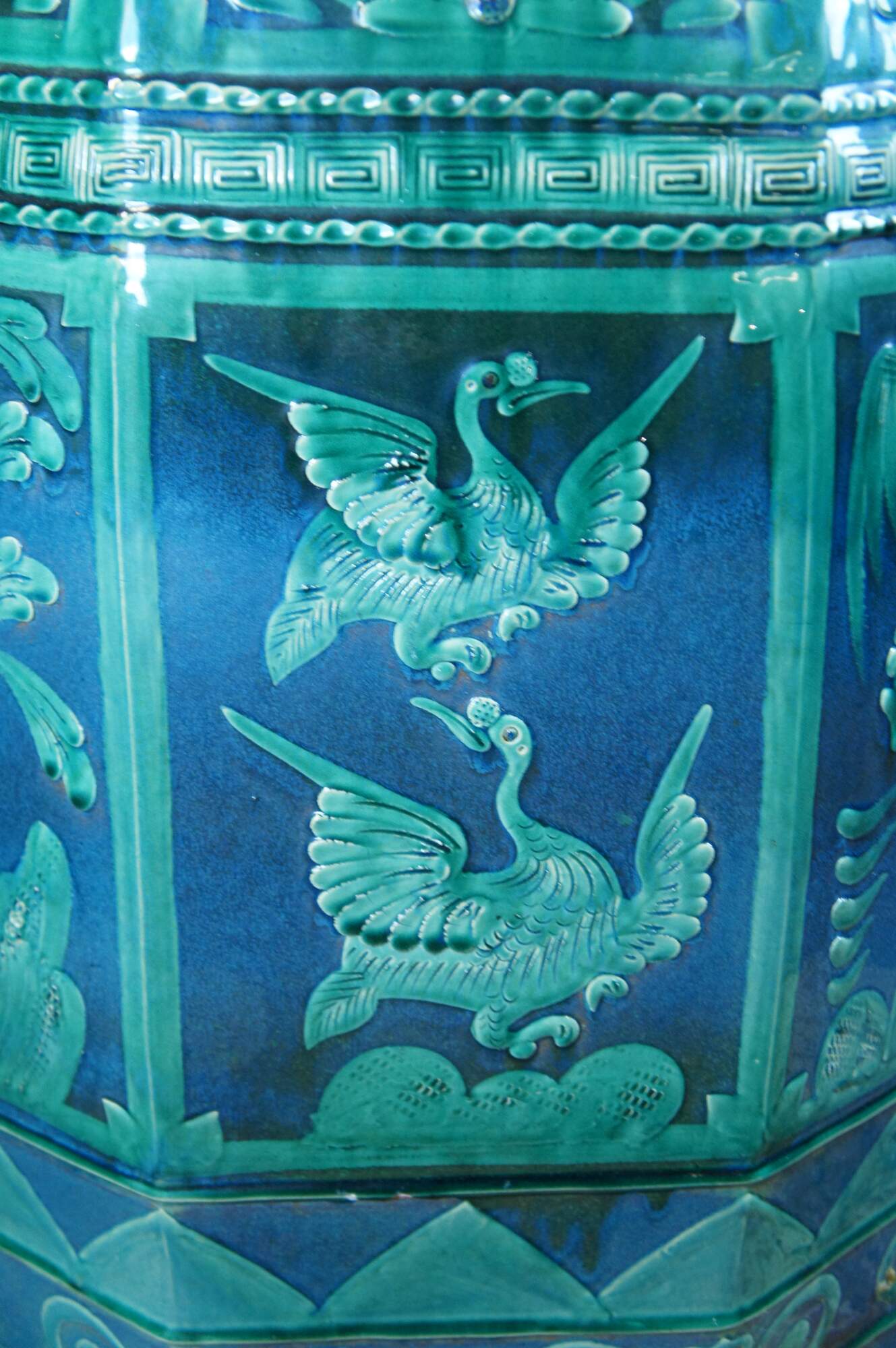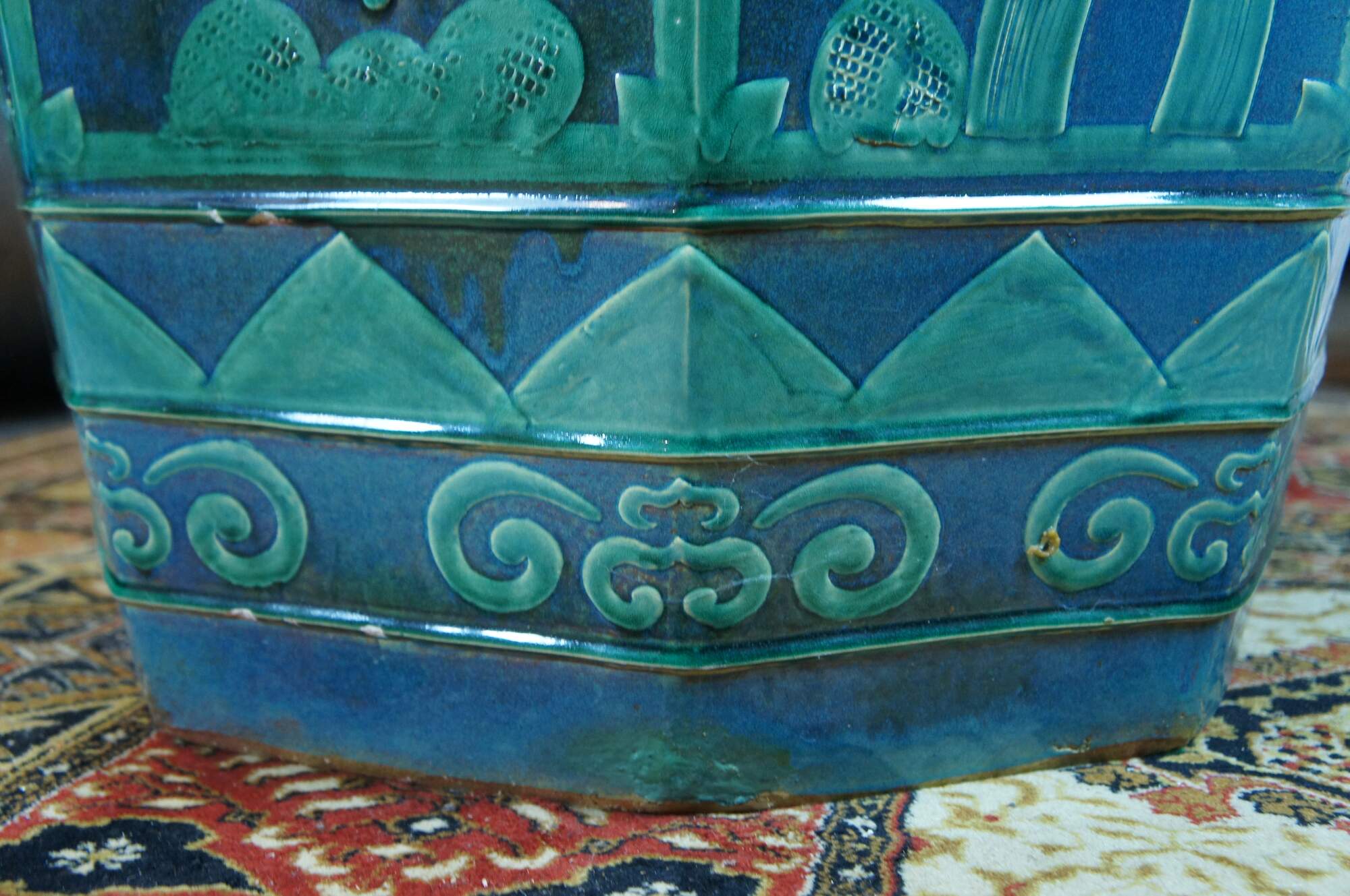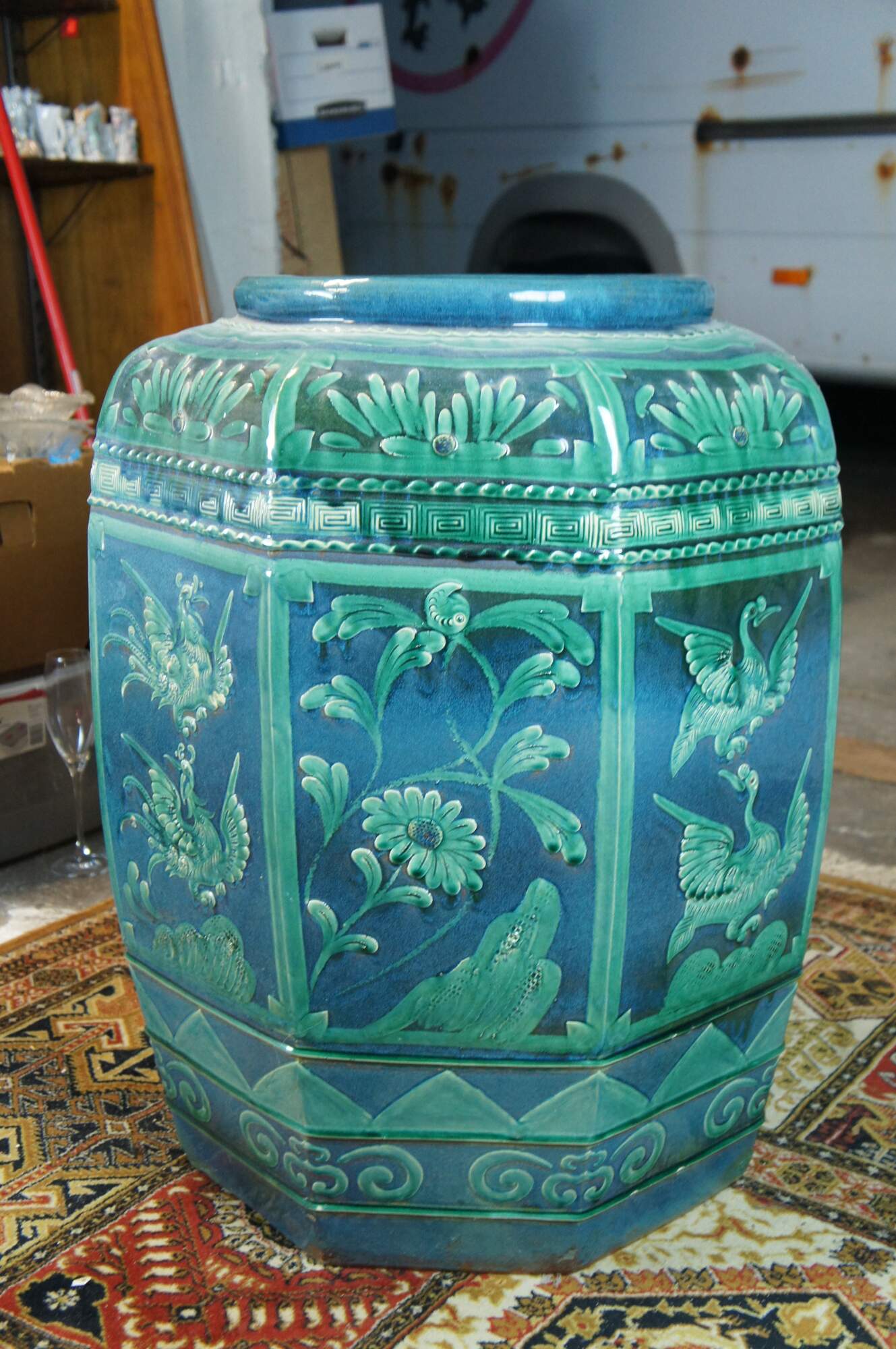 A very large and impressive Octagon shaped stoneware jardiniere floor vase / pottery urn featuring Chinese / Chinoiserie styling with a floral and bird motif. Each side panel is decorated with various flowers and birds / pheonix / swans and Greek key banding.