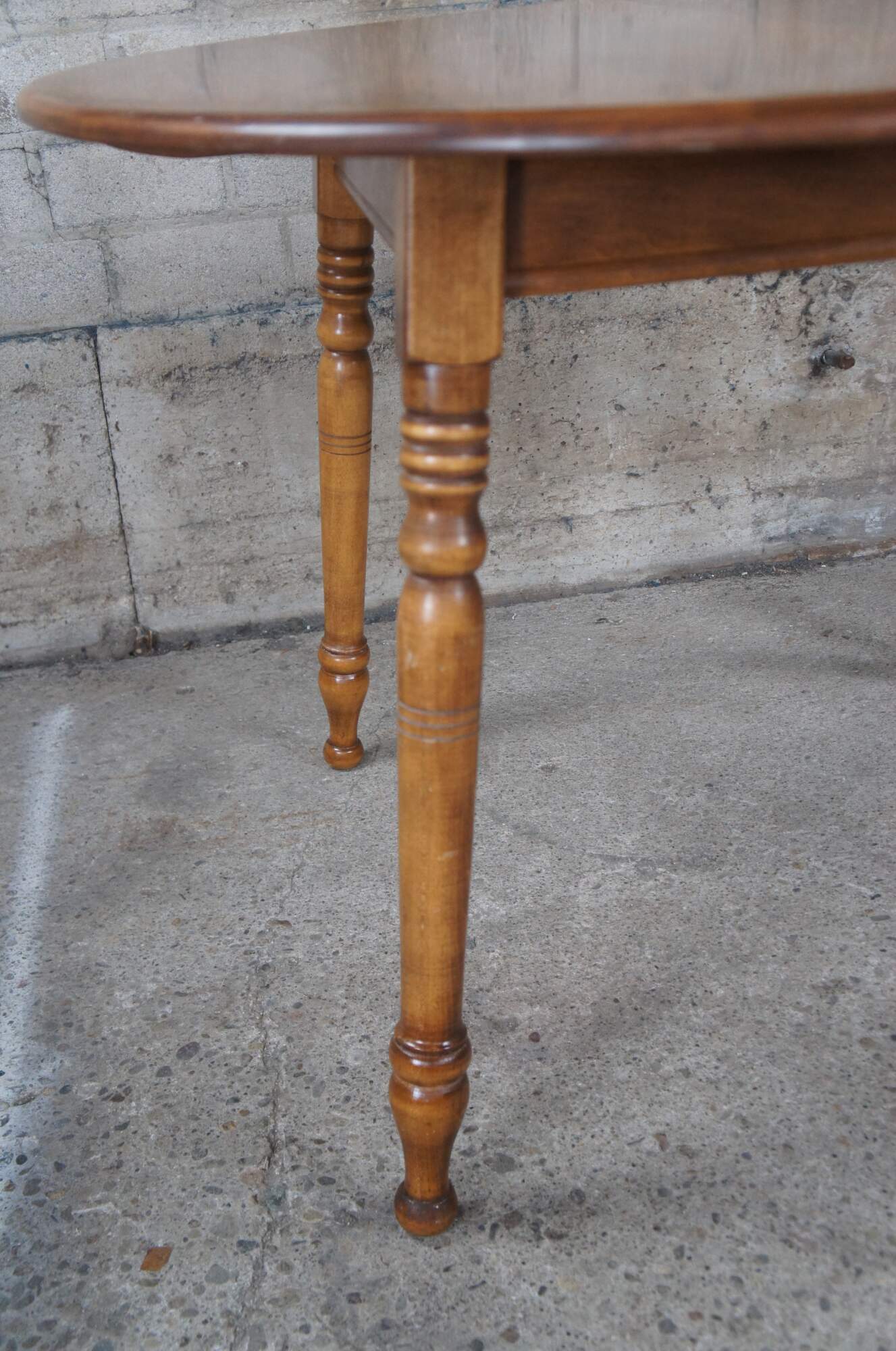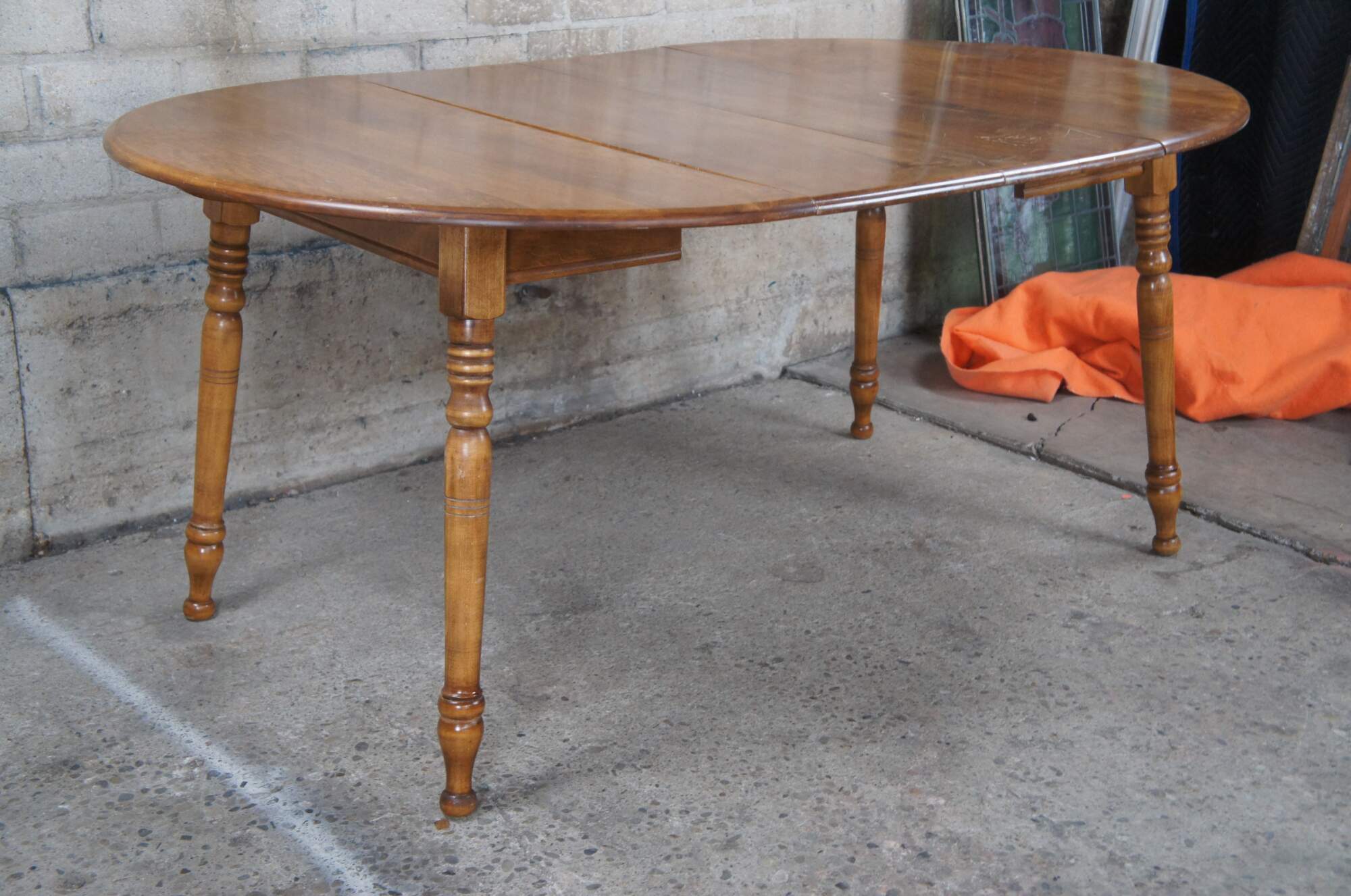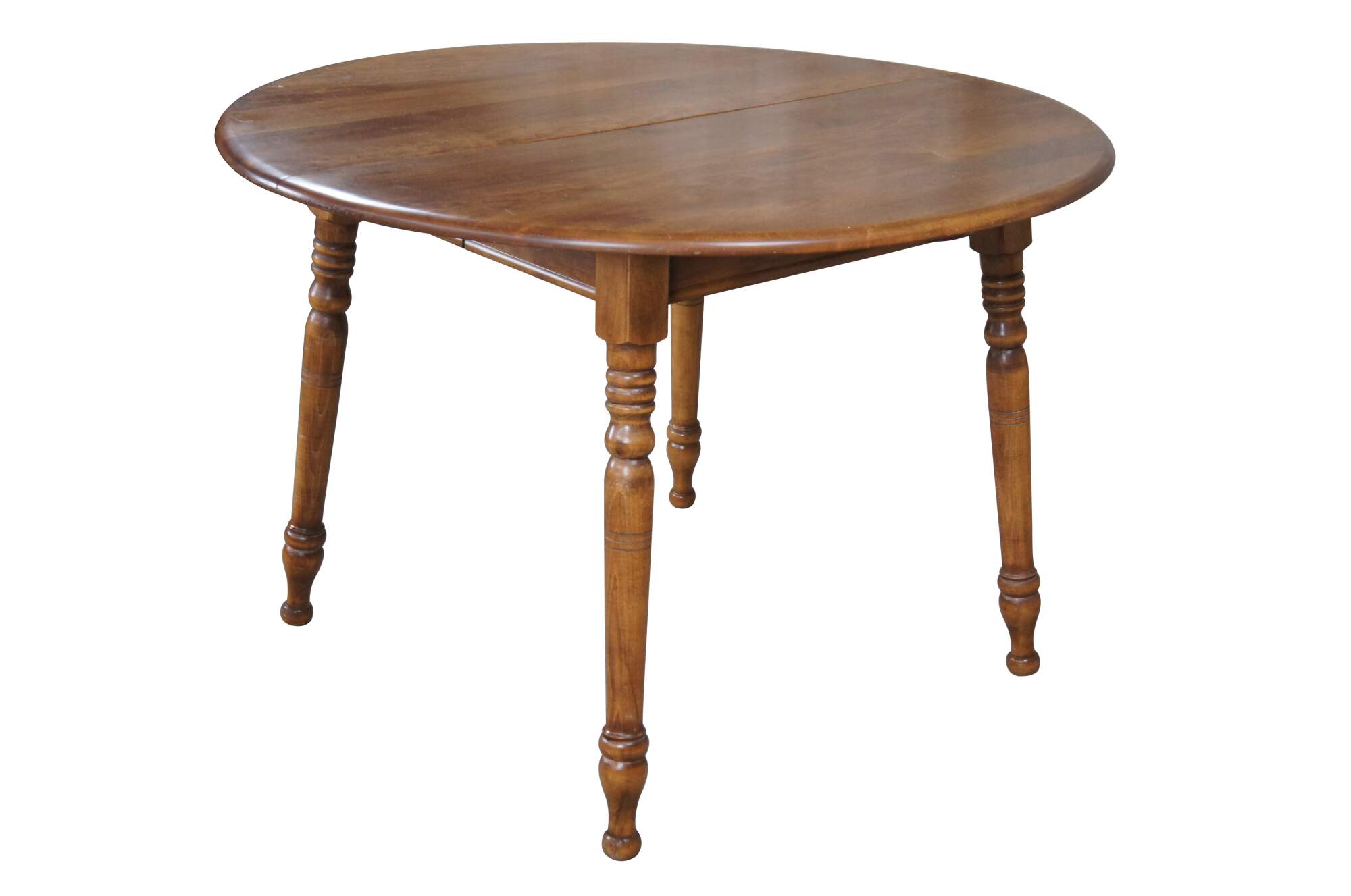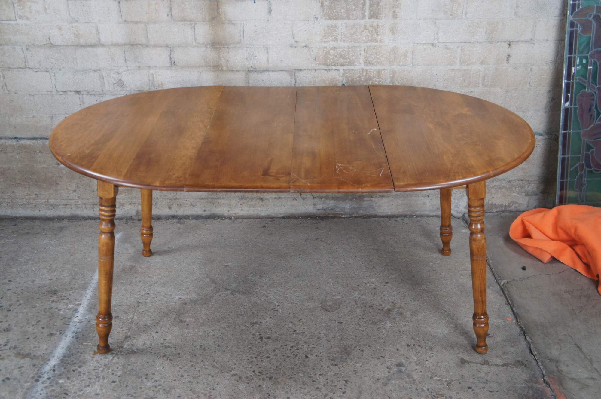 Early American-style round dining table, circa second half 20th century. Made from maple with turned legs leading to toupie feet. Features two leaves allowing for expansion up to 66". Great for a smaller dining room or breakfast nook.