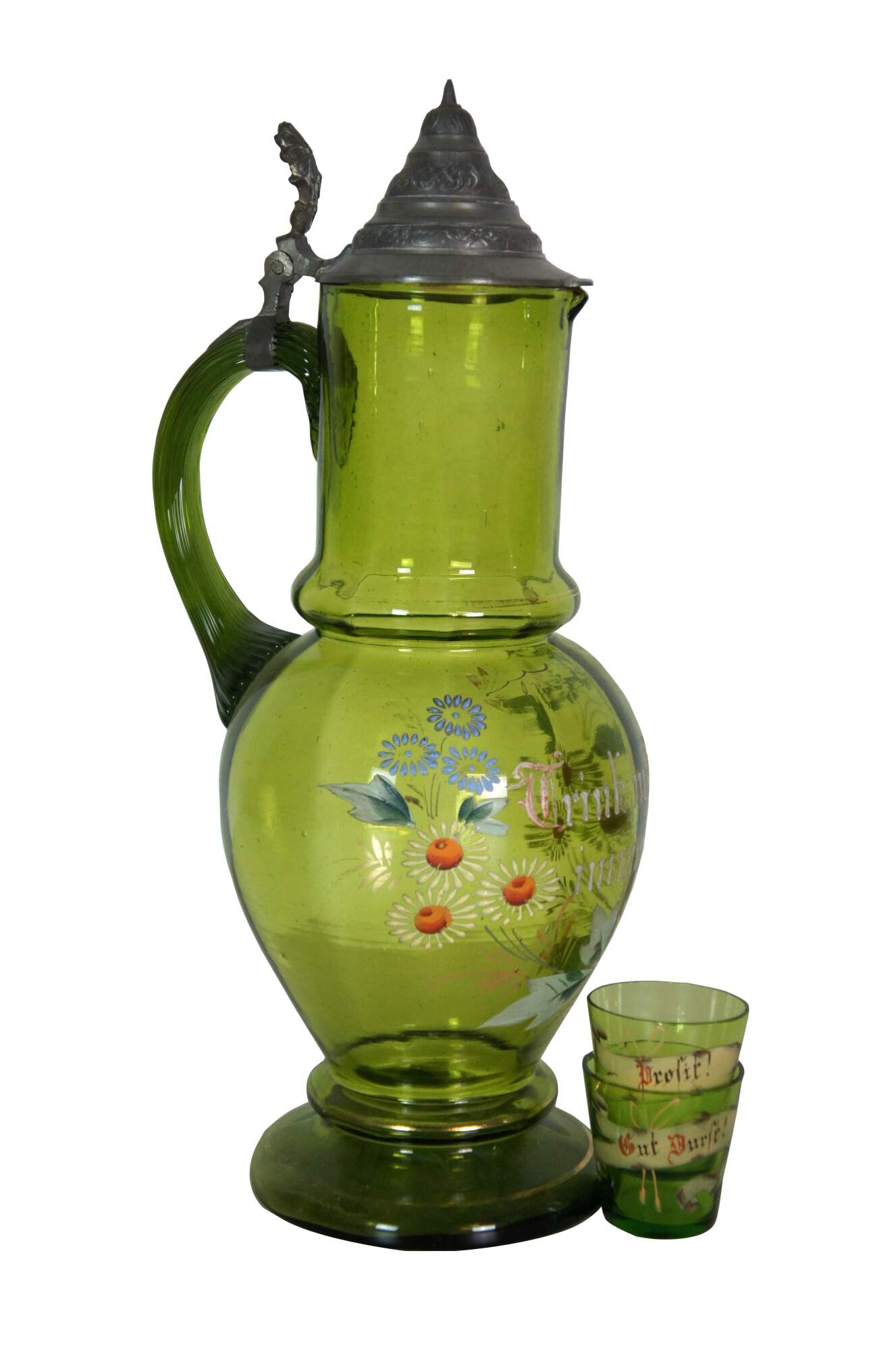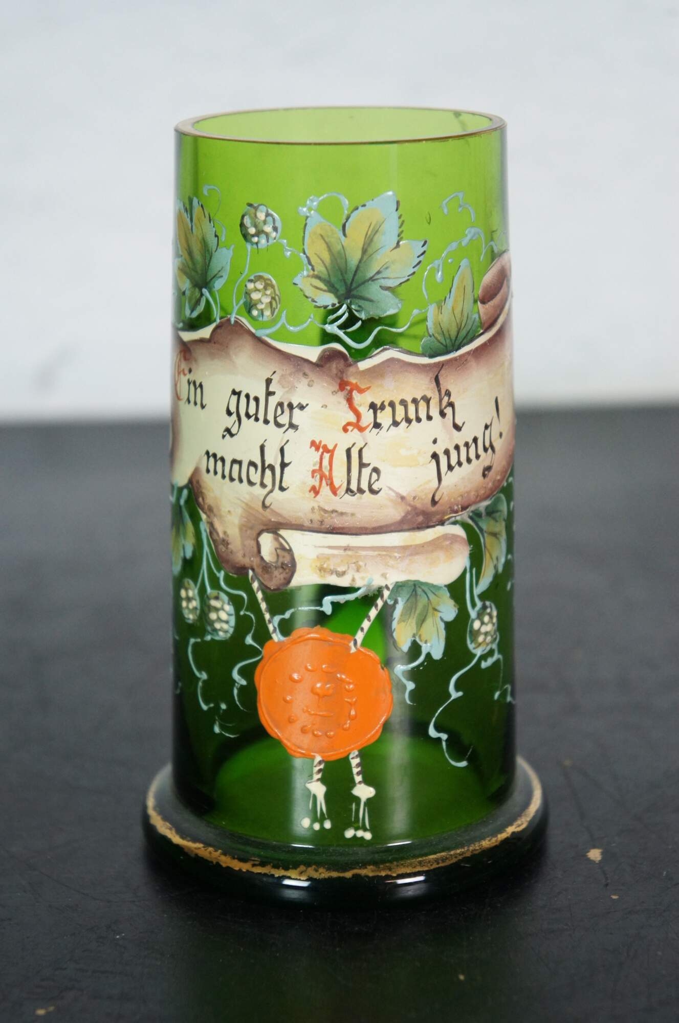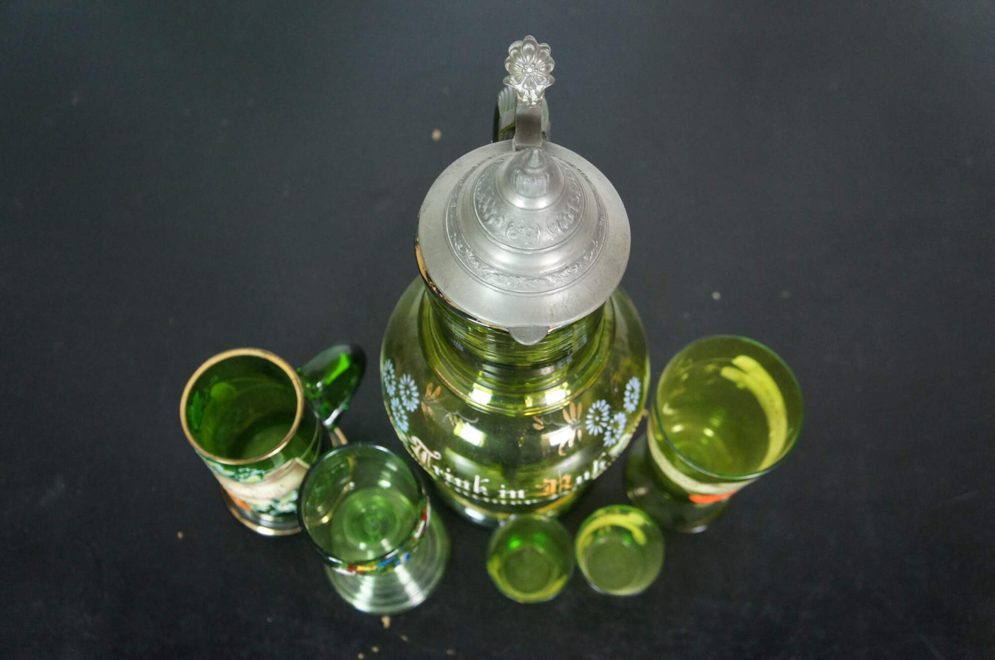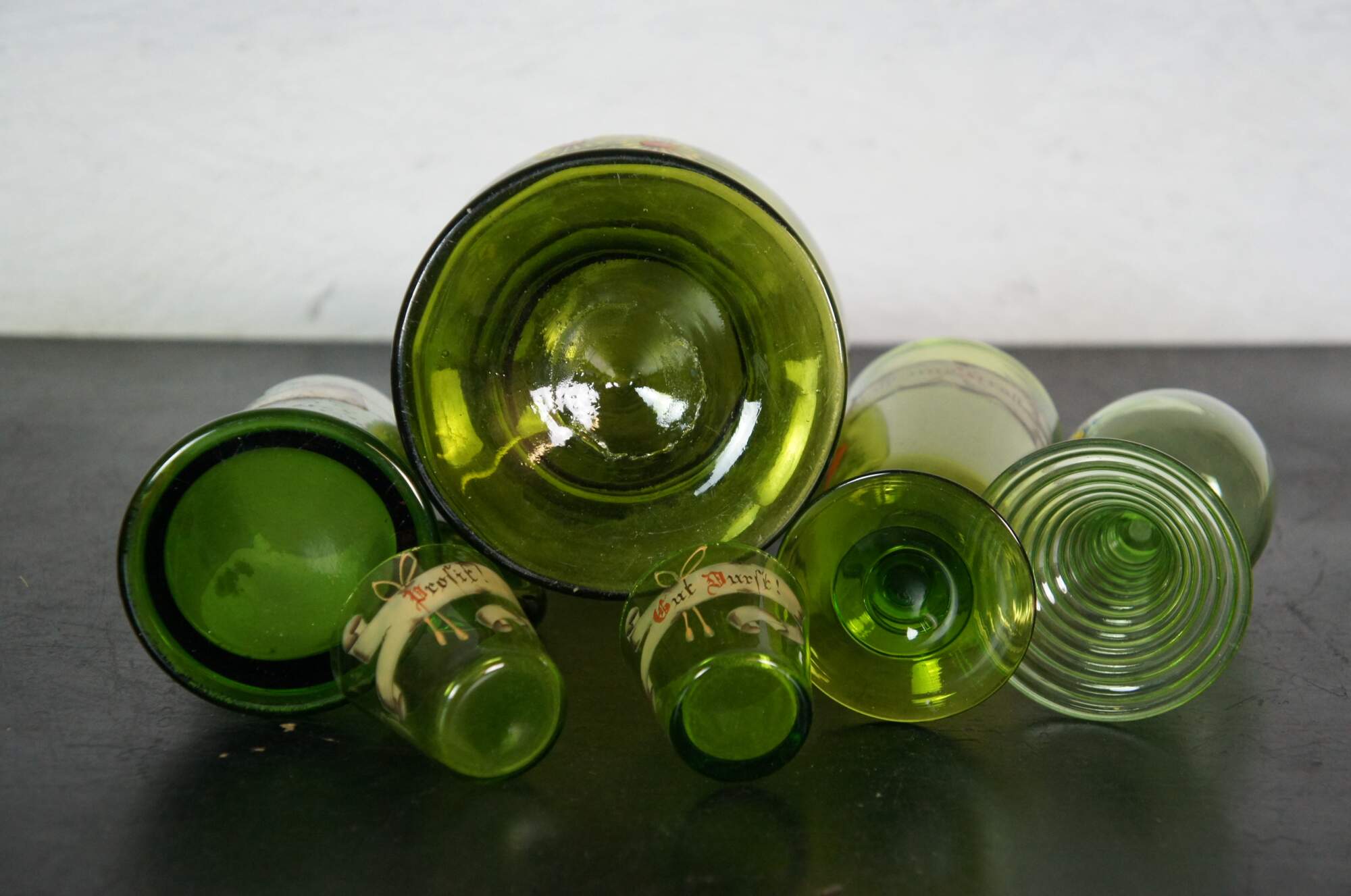 Set of late 19th - early 20th century Bohemian / German glassware - grass / olive green hand blown glass with hand painted enamel mottos and designs. Set includes metal lidded pitcher, stein, goblet with beehive base, tall goblet, and two schnapps / shot glasses. Two pieces sport red-orange seals.