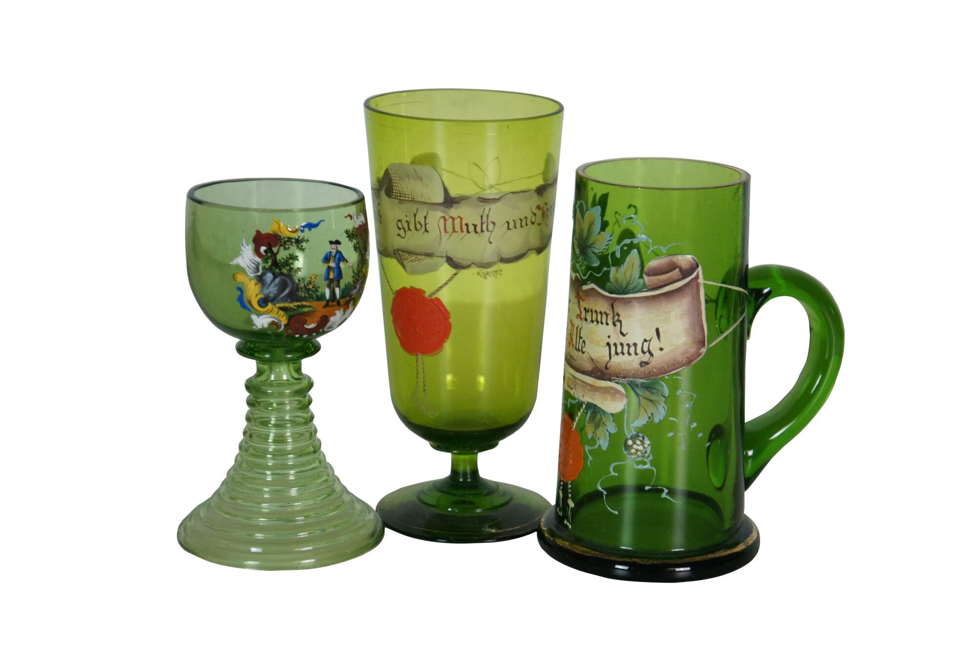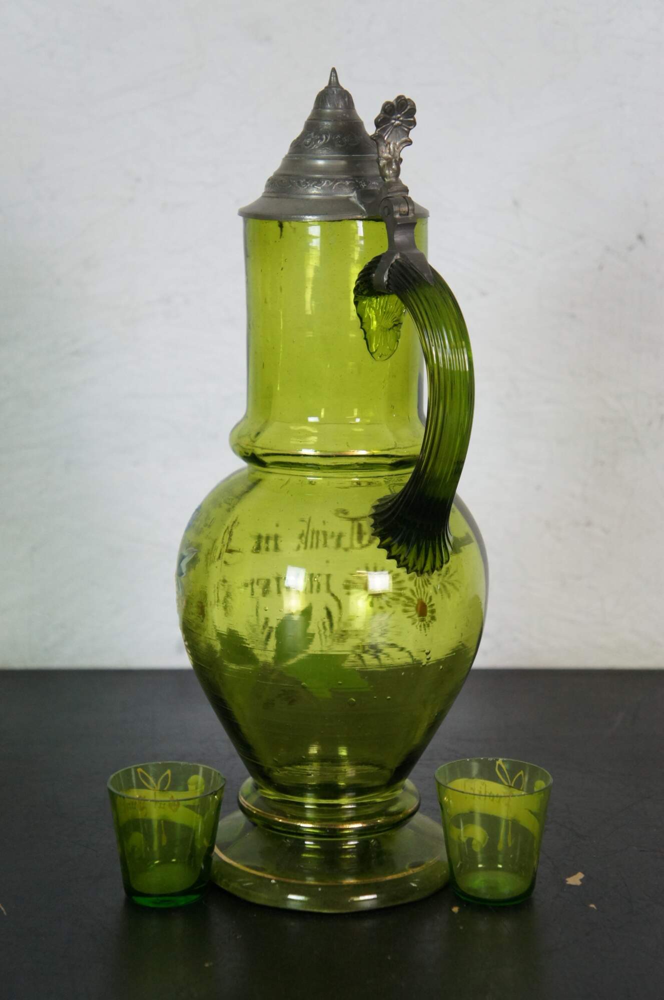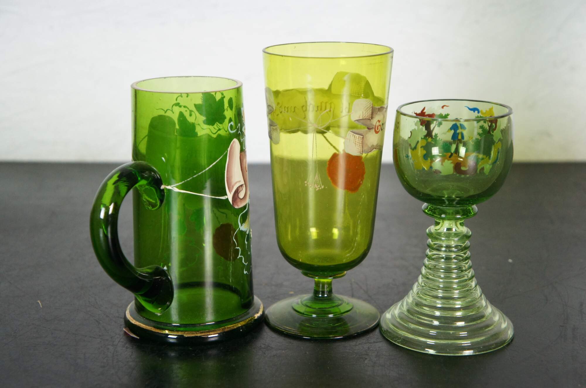 Set of late 19th - early 20th century Bohemian / German glassware - grass / olive green hand blown glass with hand painted enamel mottos and designs. Set includes metal lidded pitcher, stein, goblet with beehive base, tall goblet, and two schnapps / shot glasses. Two pieces sport red-orange seals.