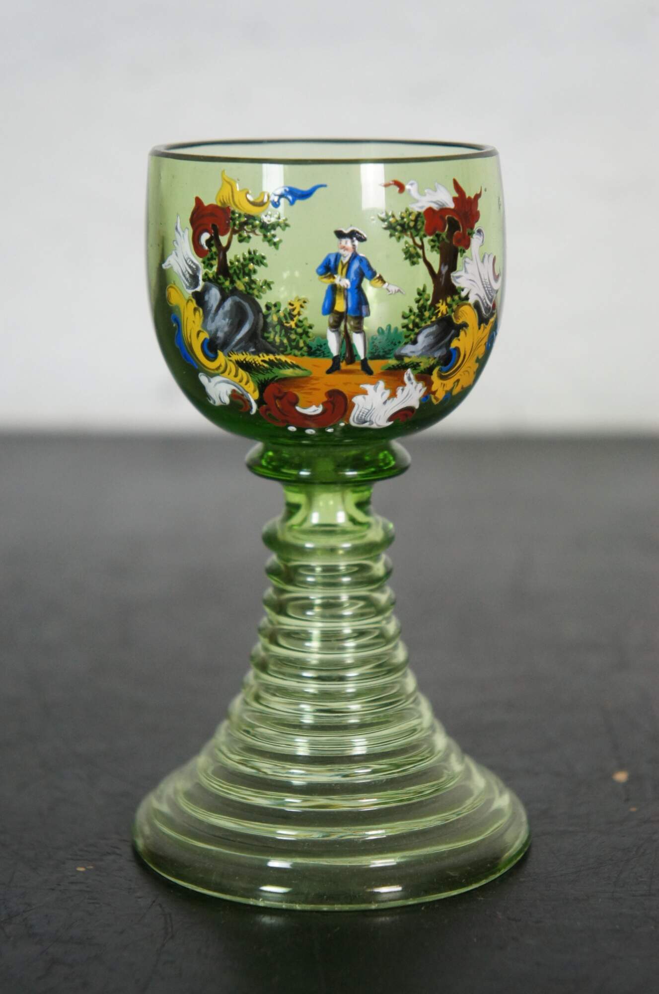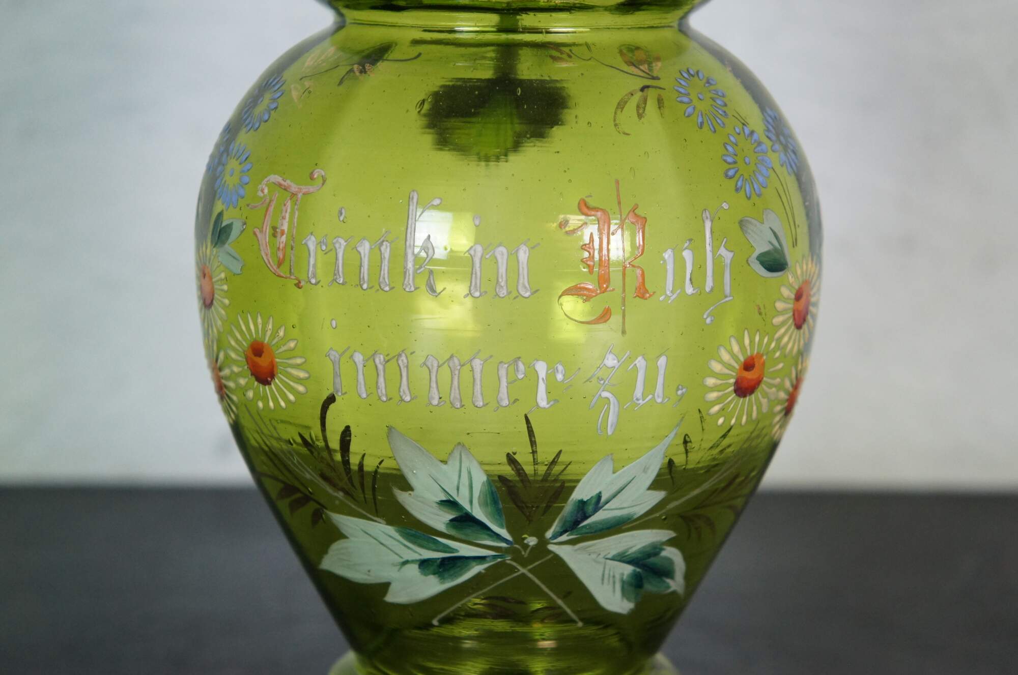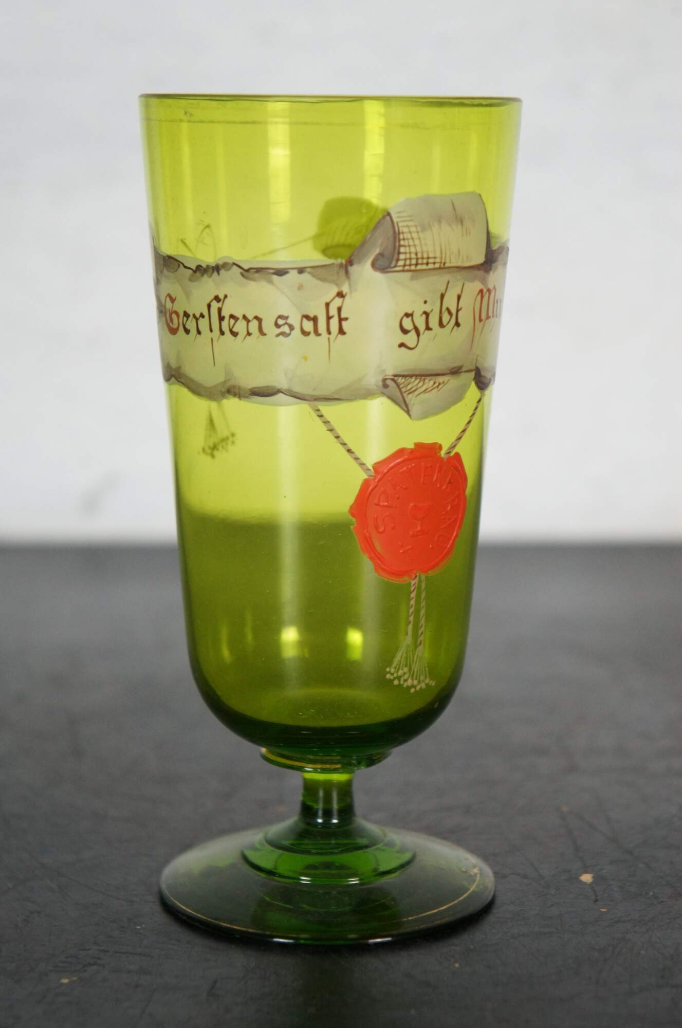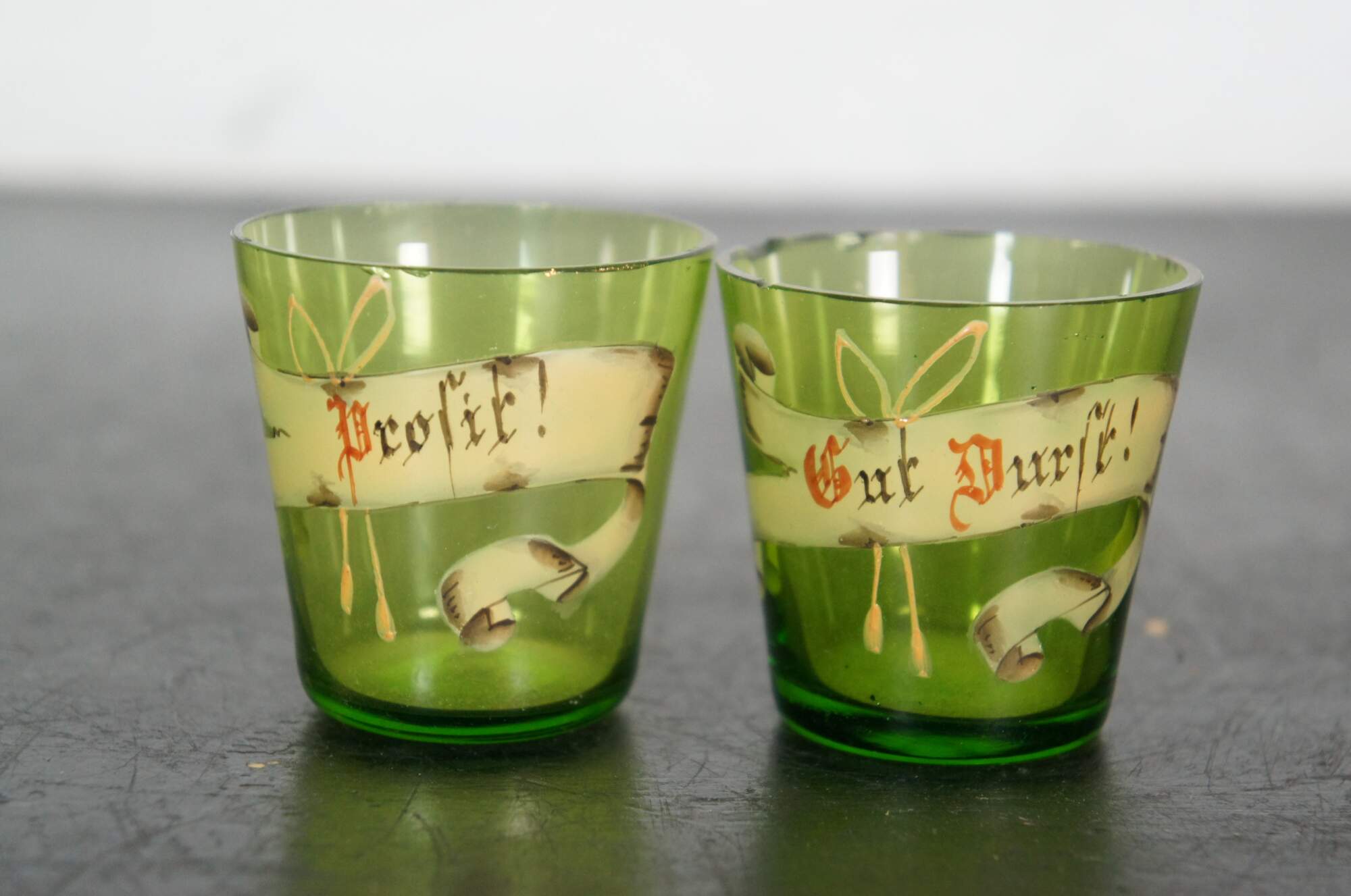 Set of late 19th - early 20th century Bohemian / German glassware - grass / olive green hand blown glass with hand painted enamel mottos and designs. Set includes metal lidded pitcher, stein, goblet with beehive base, tall goblet, and two schnapps / shot glasses. Two pieces sport red-orange seals.