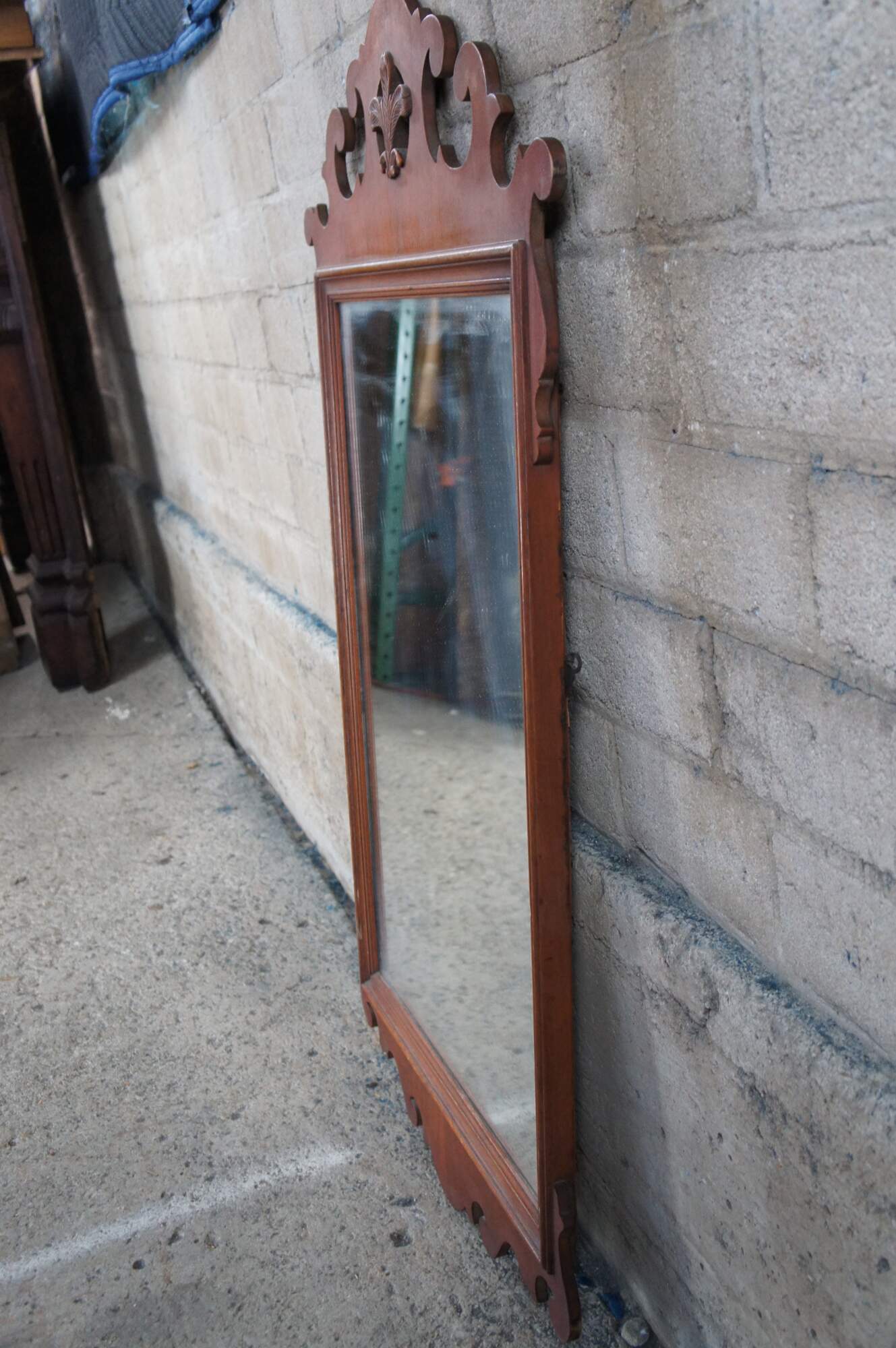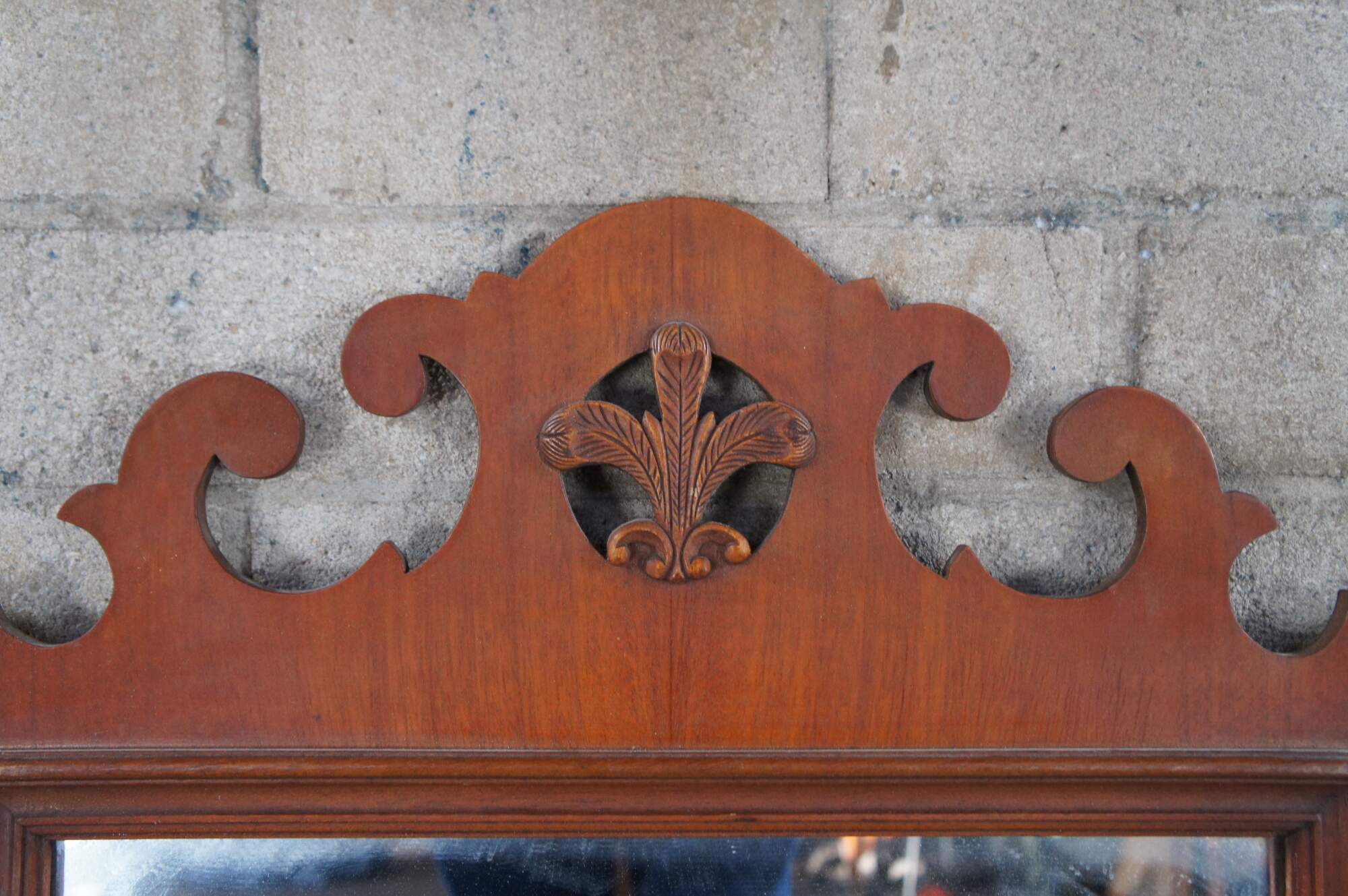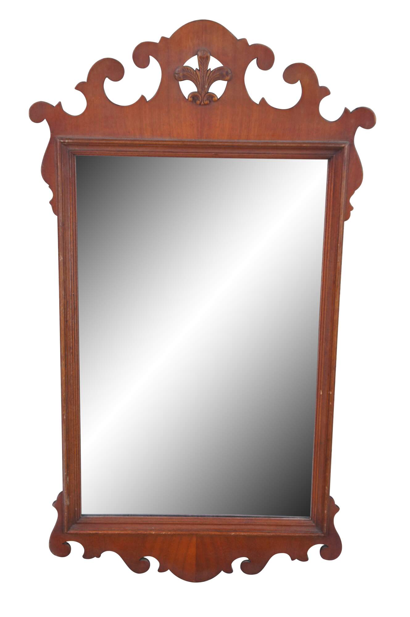 A lovely set of early 20th century Federal / Chippendale Style mirror. Features mahogany finished frames with carved and scrolled designs. At the center of each along the top is a pierced medallion with prince of wales feathers.