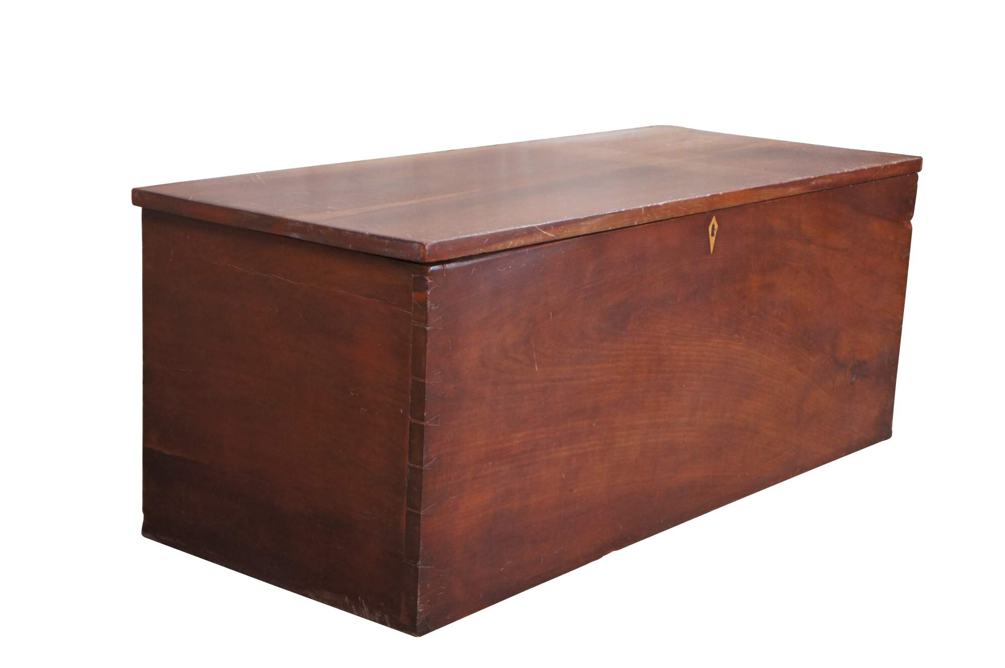 Antique early 19th century mahogany blanket chest / storage trunk or coffer featuring primitive hand dovetailing with inlaid fruitwood escutcheon.