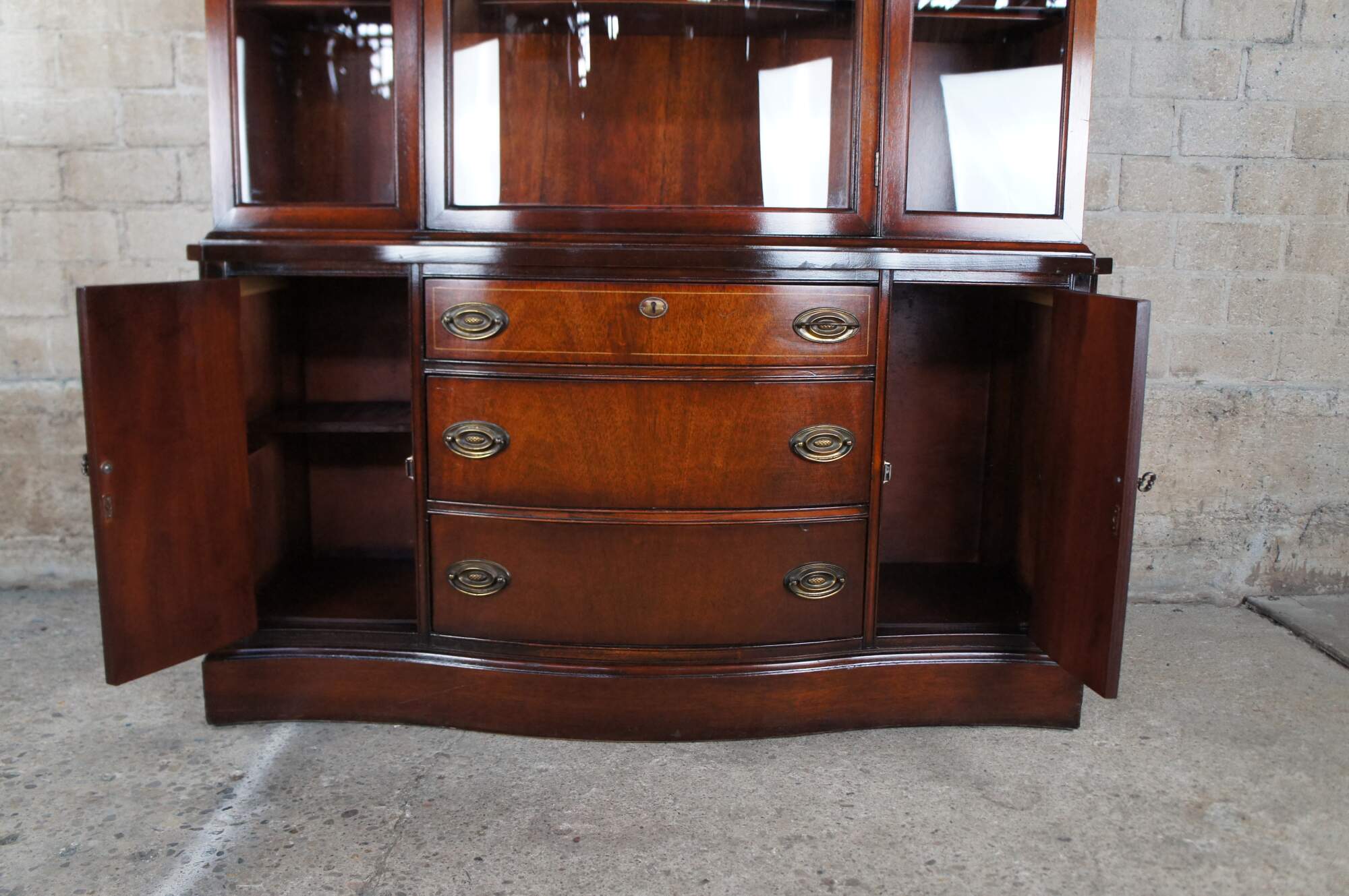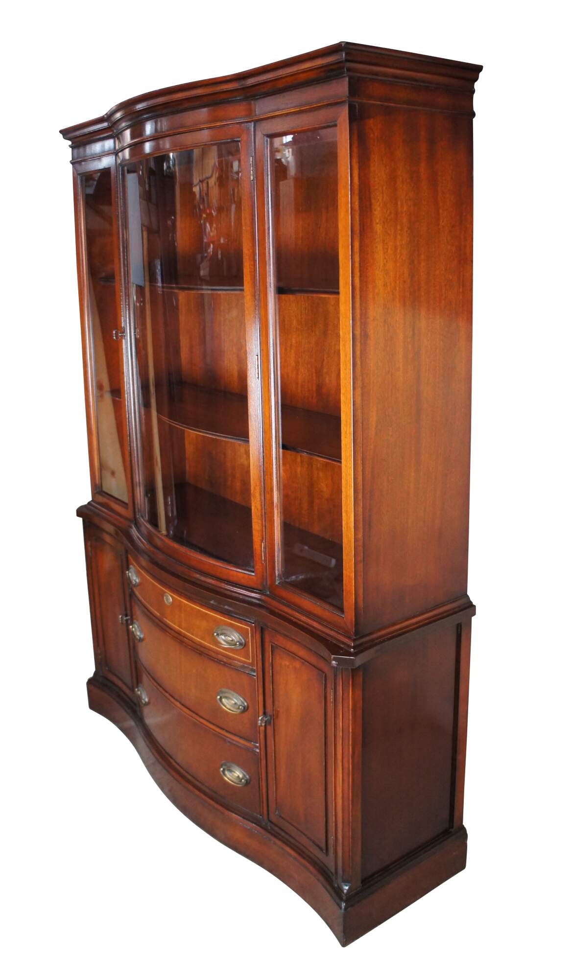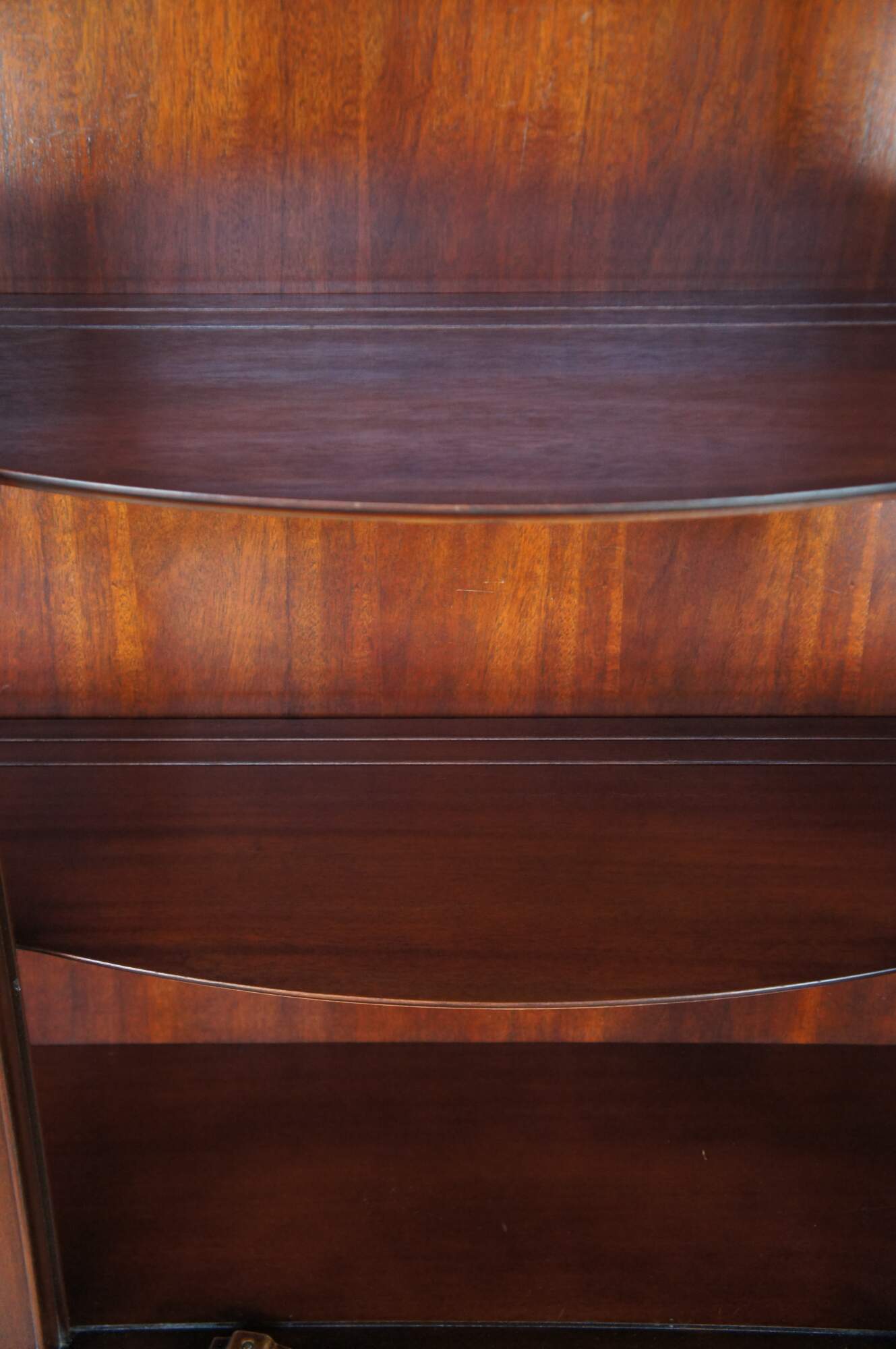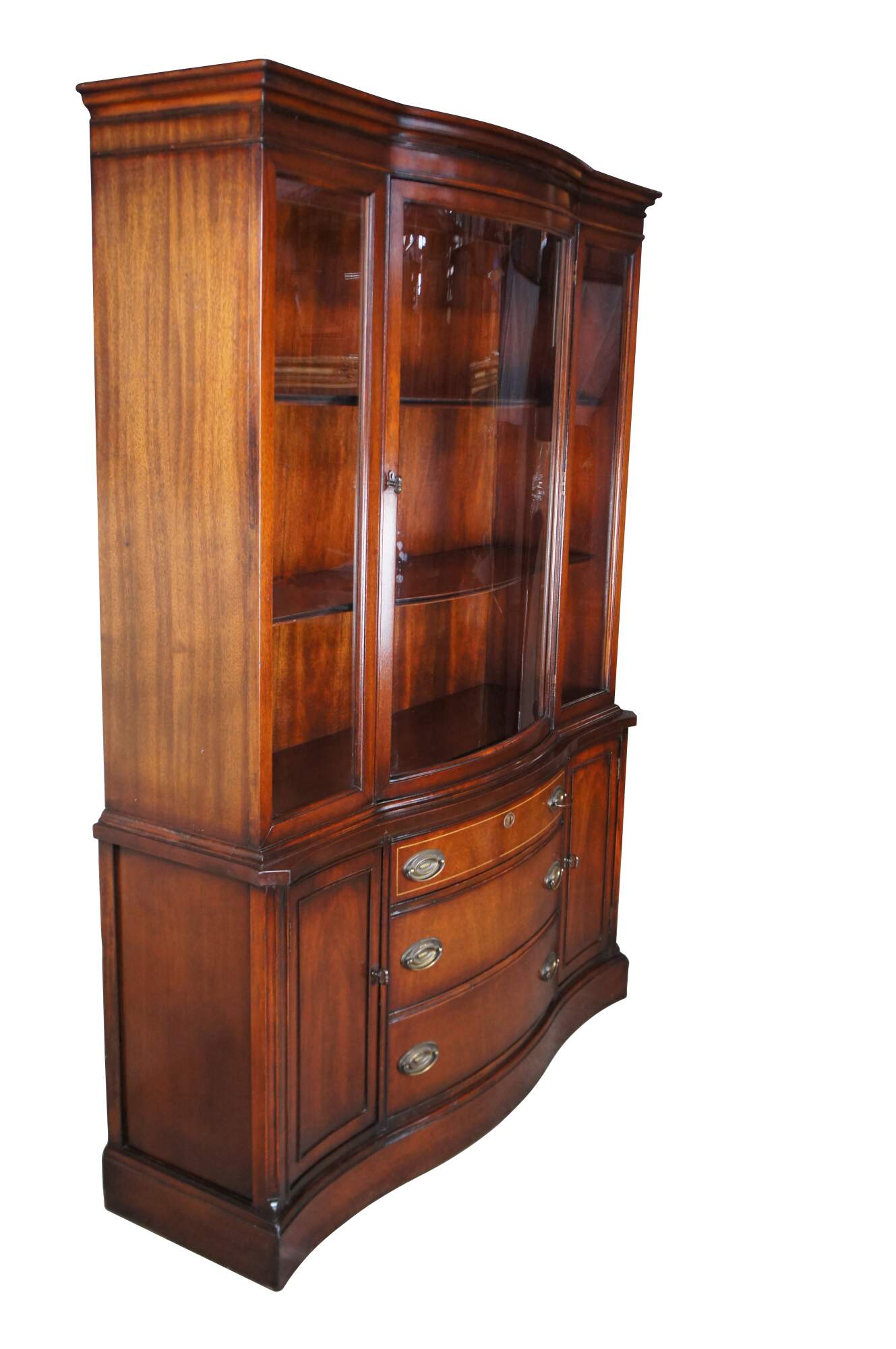 Vintage mid-century bow front china cabinet, made by Bassett Furniture in the 1950s as part of their Monticello collection. Featuring richly-hued mahogany and a curved glass door which matches the curved drawer fronts. This piece was constructed with quality in mind, and features plenty of storage.
